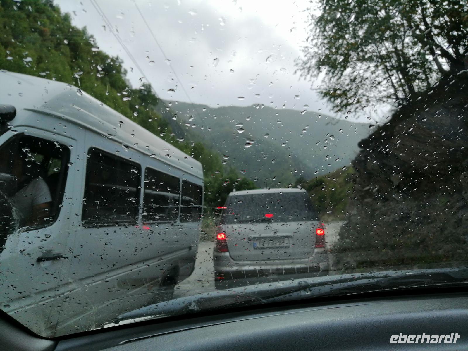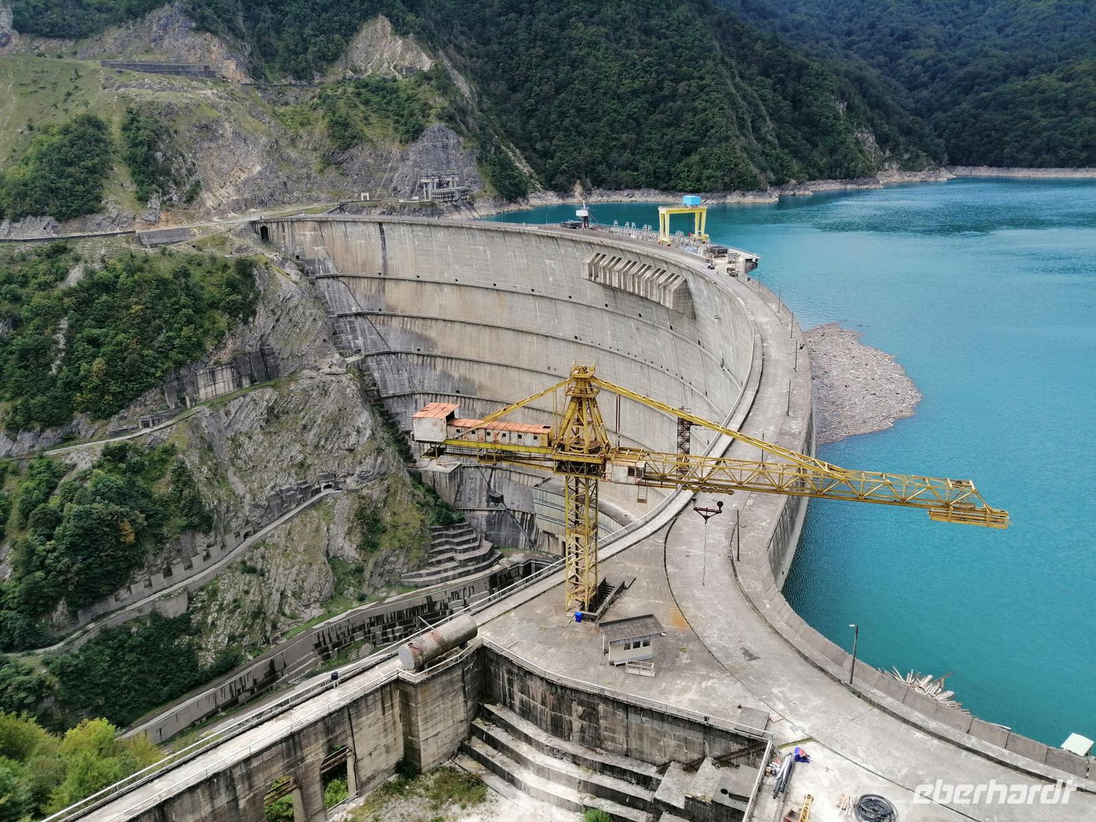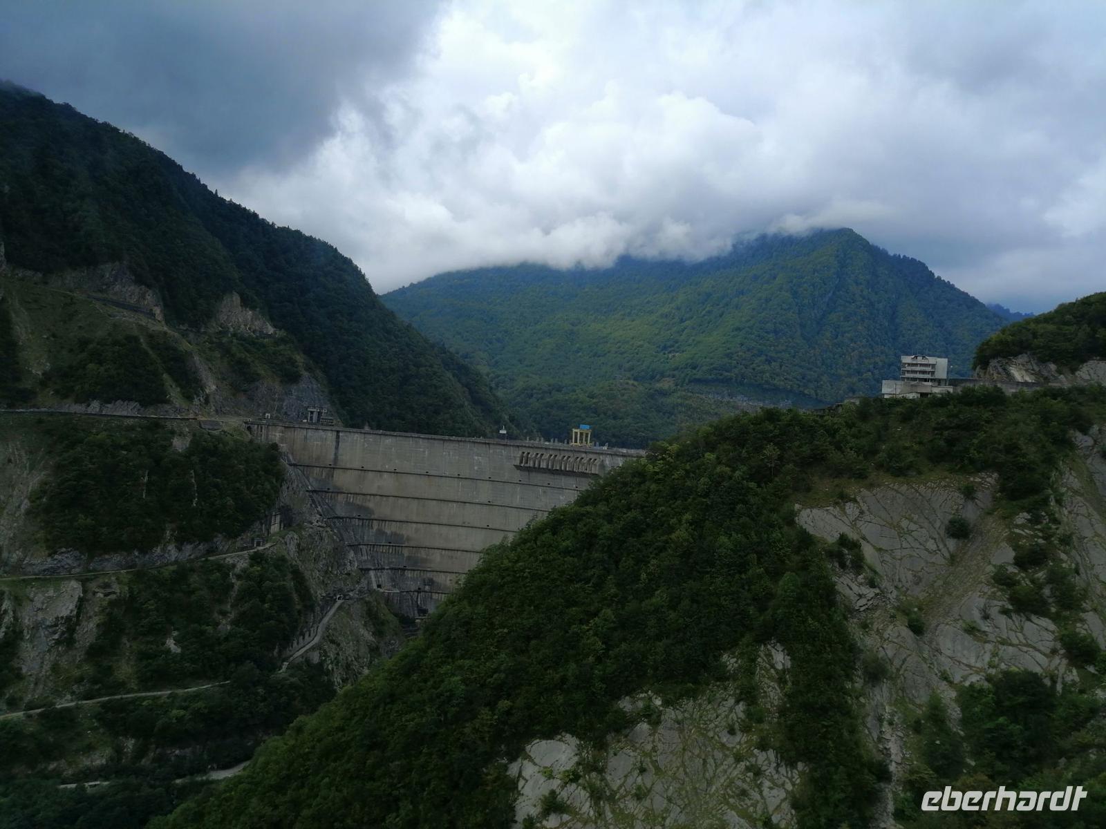 Aus Zugdidi fuhren wir zunächst über Jvari zu Füßen der swanischen Berge. Dort besichtigten wir die große Staumauer des Enguri-Stausee. Die Staumauer zählt mit 272 Metern Höhe zu den höchsten Staudämmen der Welt. Interessant war für uns zu erfahren, dass der Stausee sich auf von der Zentralregierung kontrolliertem georgischen und das Kraftwerk aber auf abchasischem Gebiet befinden.