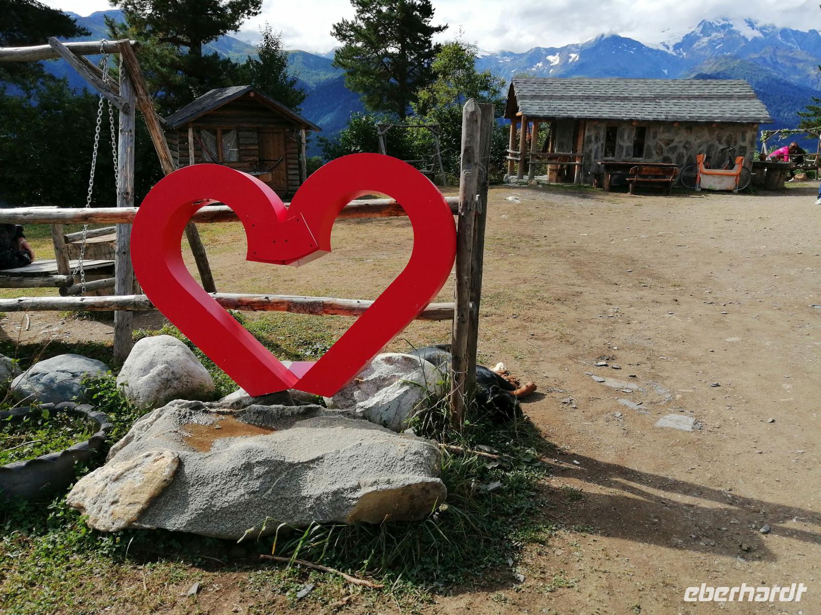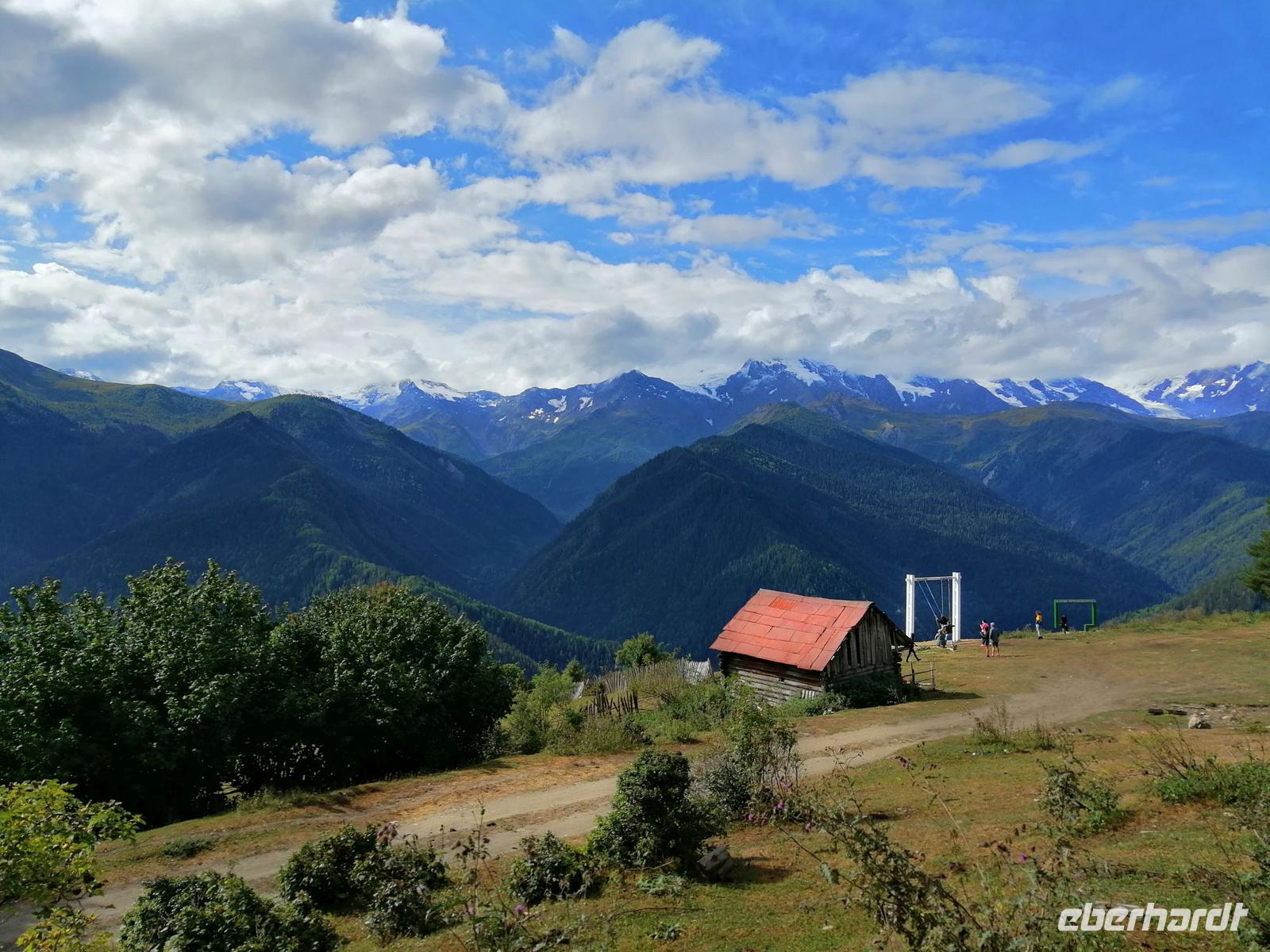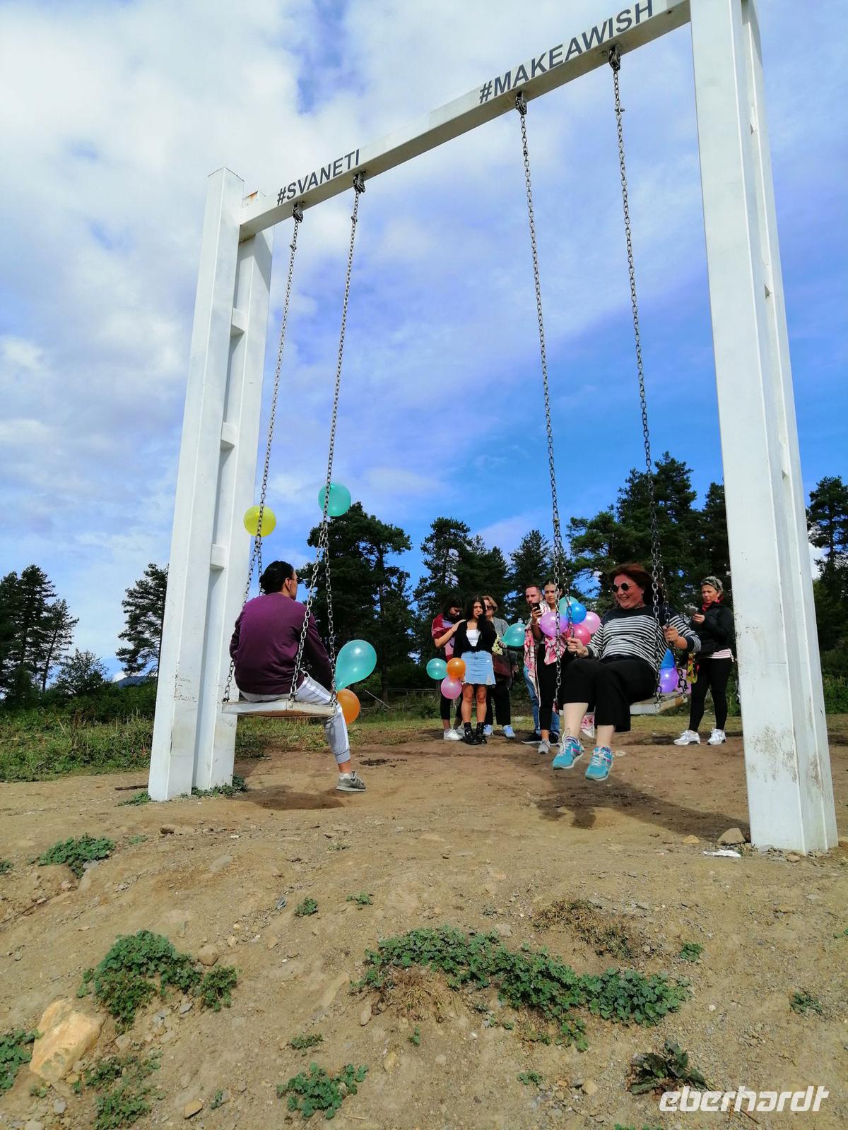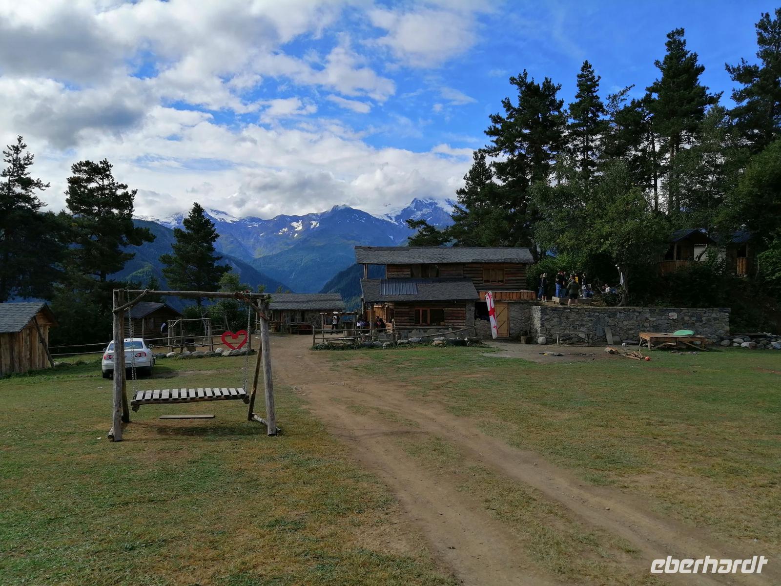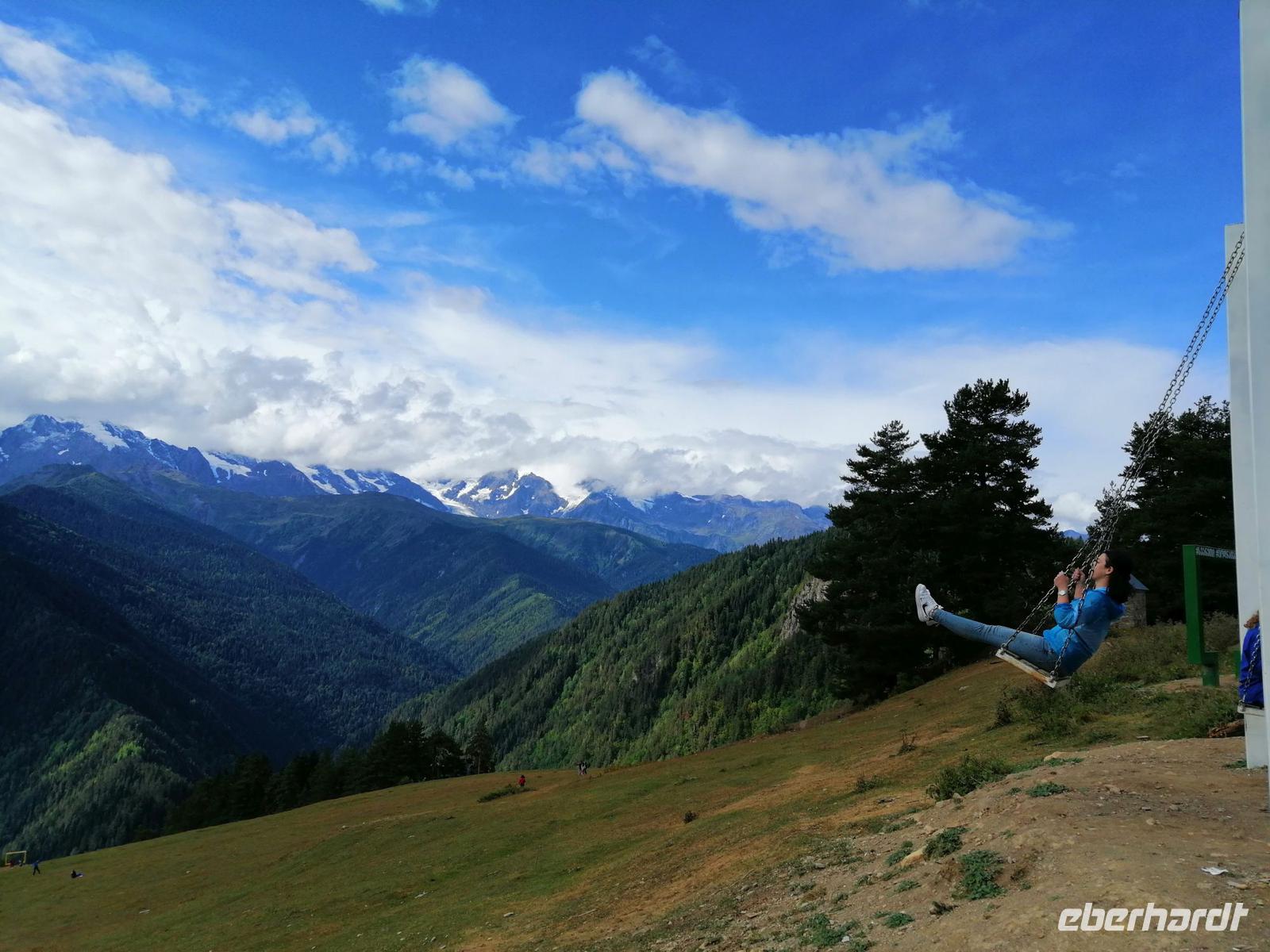 Nach dem typisch swanischen Frühstück im Hotel starteten wir heute unsere Stadterkundung von Mestia gegen 9 Uhr. Den Tag wollten wir mit der tollen Aussicht auf Mestia und den Großen Kaukasus von Zuruldi in 2.348 Metern Höhe starten. Allerdings aufgrund der Wartungsarbeiten mussten wir die geplante Fahrt mit dem Sessellift umändern und fuhren mit unserem Bus bis zur Zwischenstation des Sesselliftes (1.868 m). Dort entdeckten wir eine etwas versteckte Ferienanlage "Heshkili Huts" mit einer grandiosen Aussicht auf die Berge und mit einer "Himmel-Schaukel"!