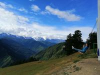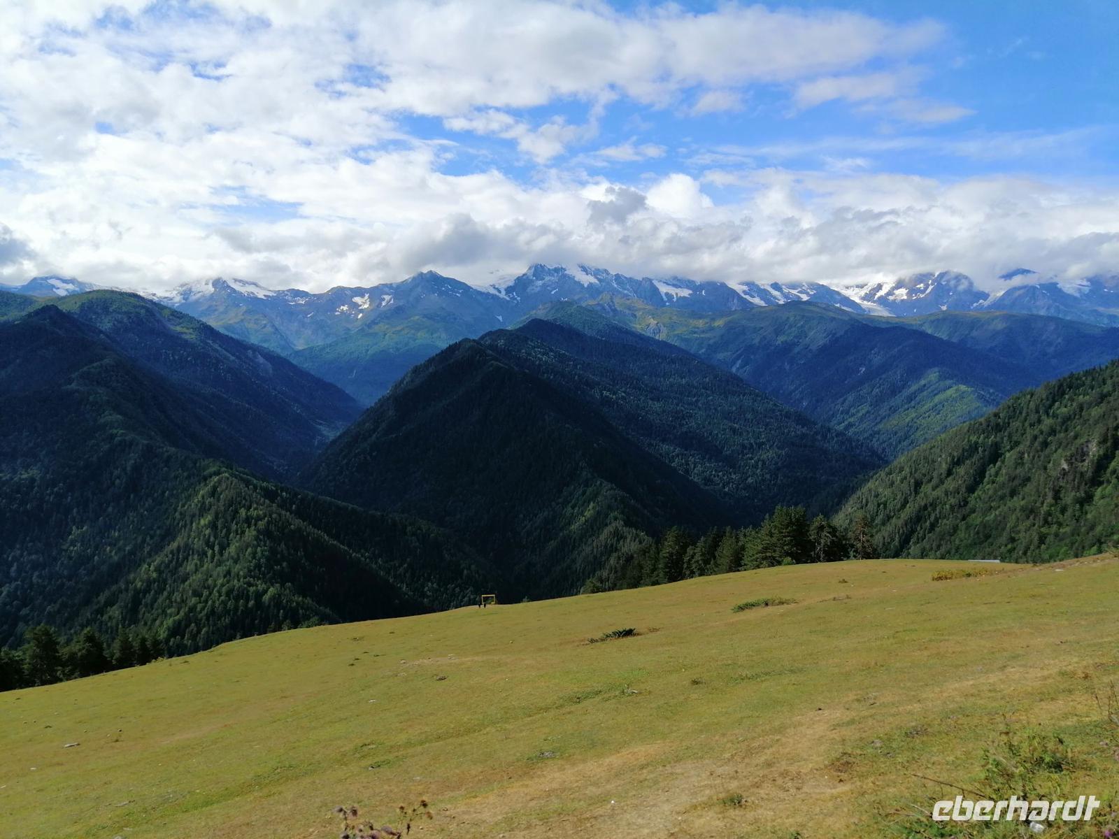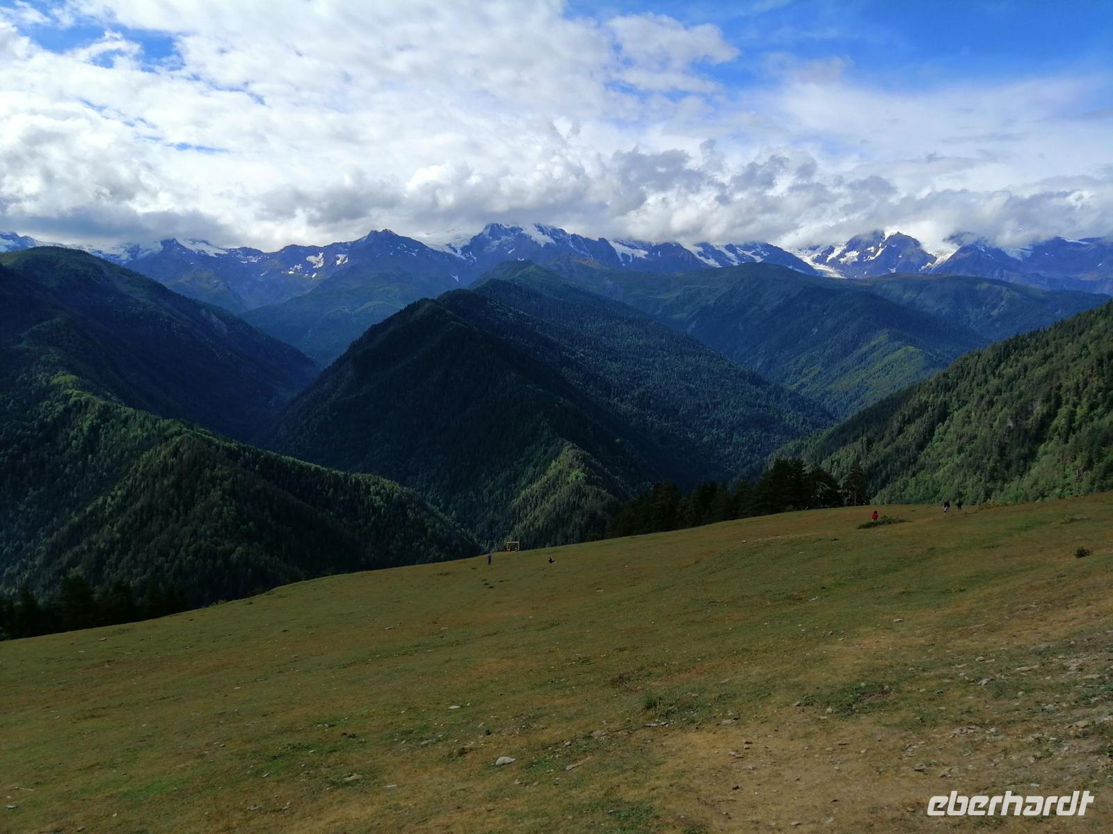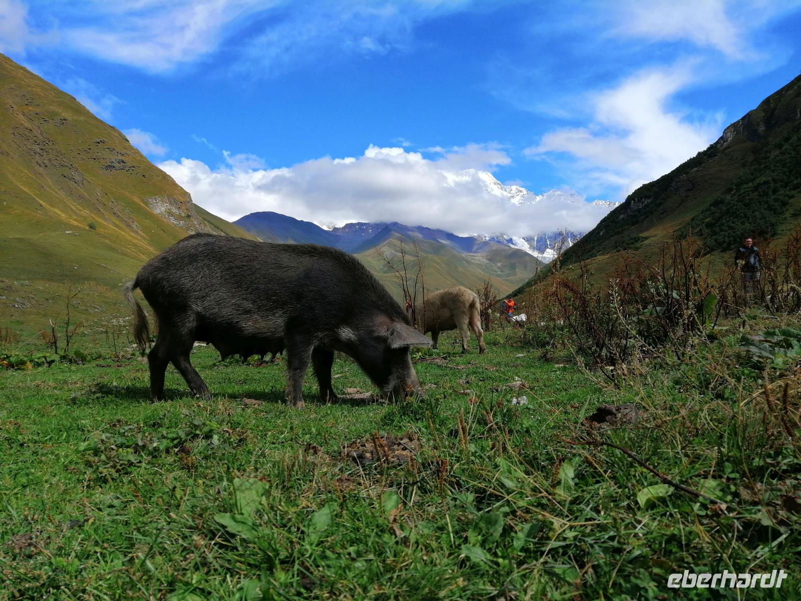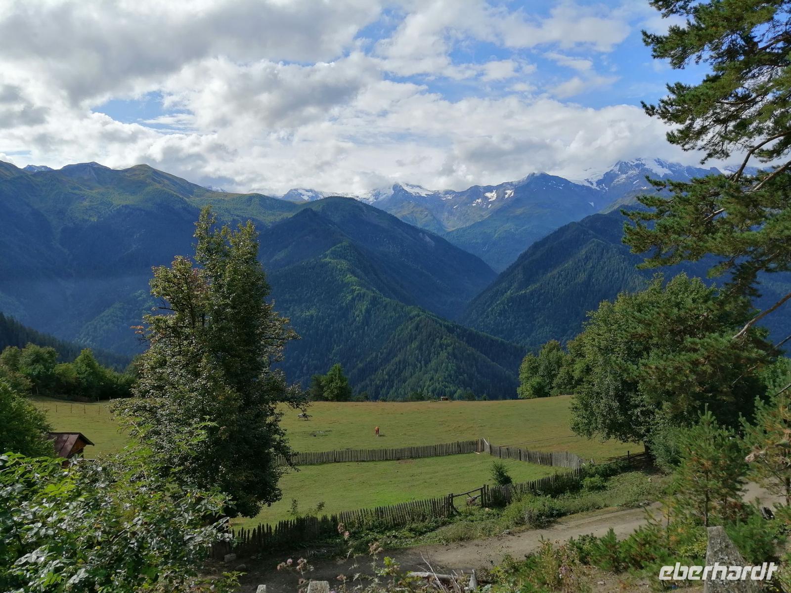 Nach dem typisch swanischen Frühstück im Hotel starteten wir heute unsere Stadterkundung von Mestia gegen 9 Uhr. Den Tag wollten wir mit der tollen Aussicht auf Mestia und den Großen Kaukasus von Zuruldi in 2.348 Metern Höhe starten. Allerdings aufgrund der Wartungsarbeiten mussten wir die geplante Fahrt mit dem Sessellift umändern und fuhren mit unserem Bus bis zur Zwischenstation des Sesselliftes (1.868 m). Dort entdeckten wir eine etwas versteckte Ferienanlage "Heshkili Huts" mit einer grandiosen Aussicht auf die Berge und mit einer "Himmel-Schaukel"!