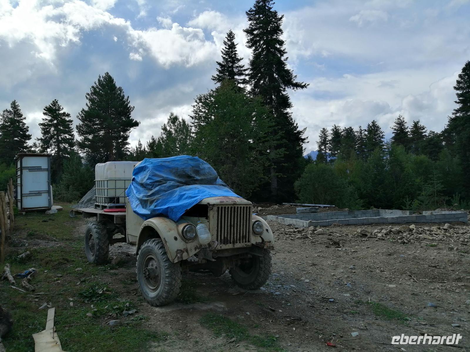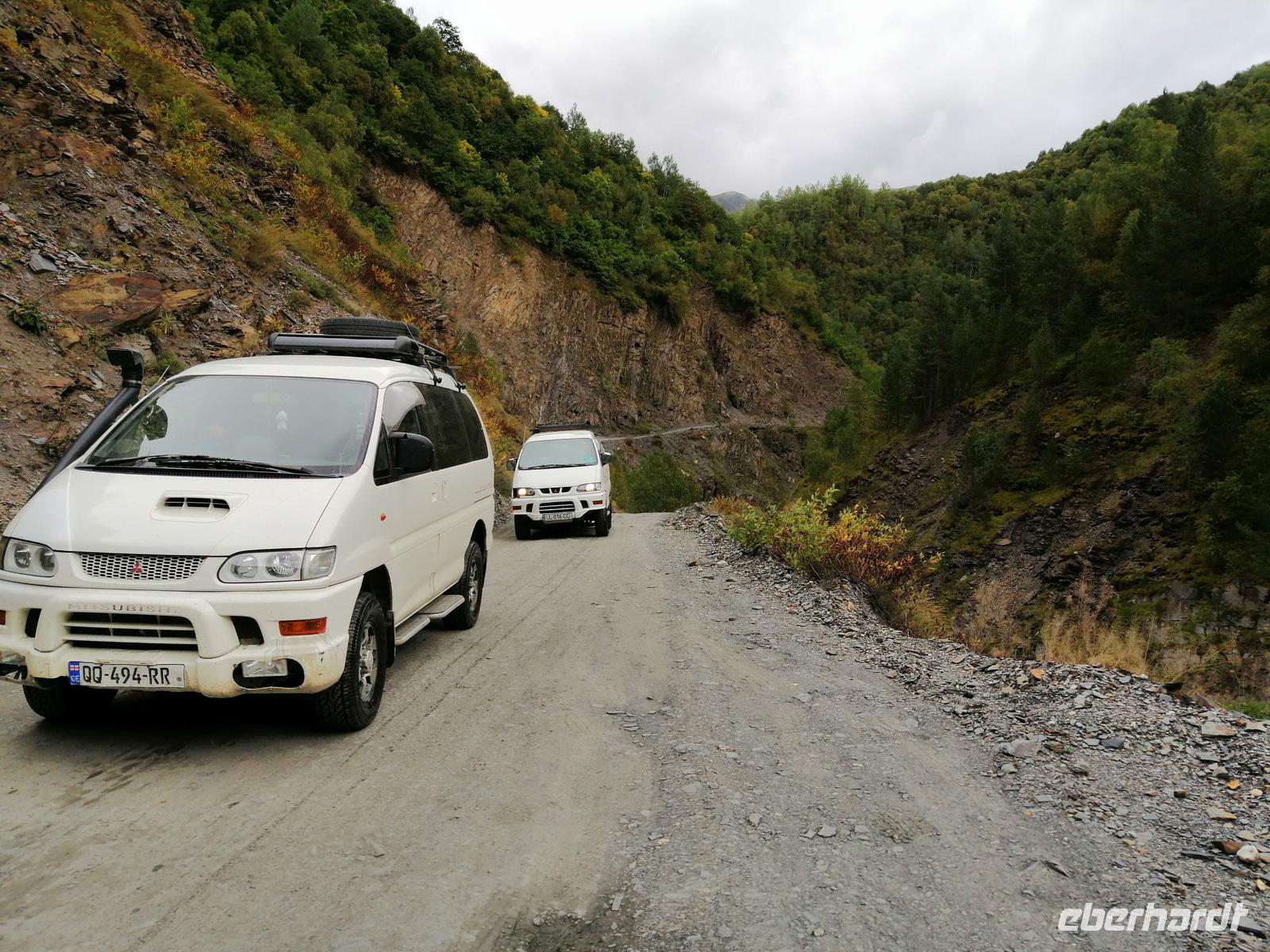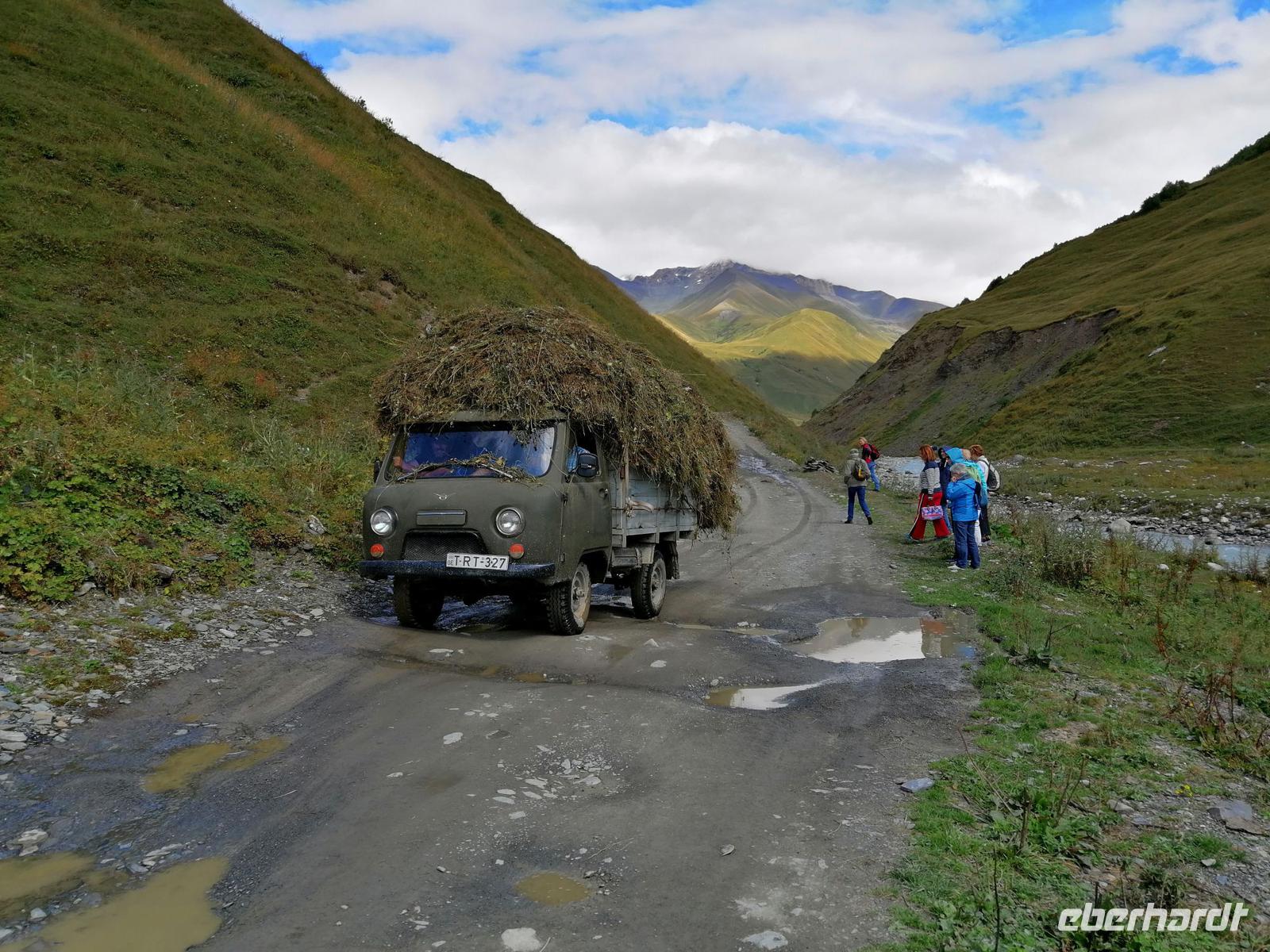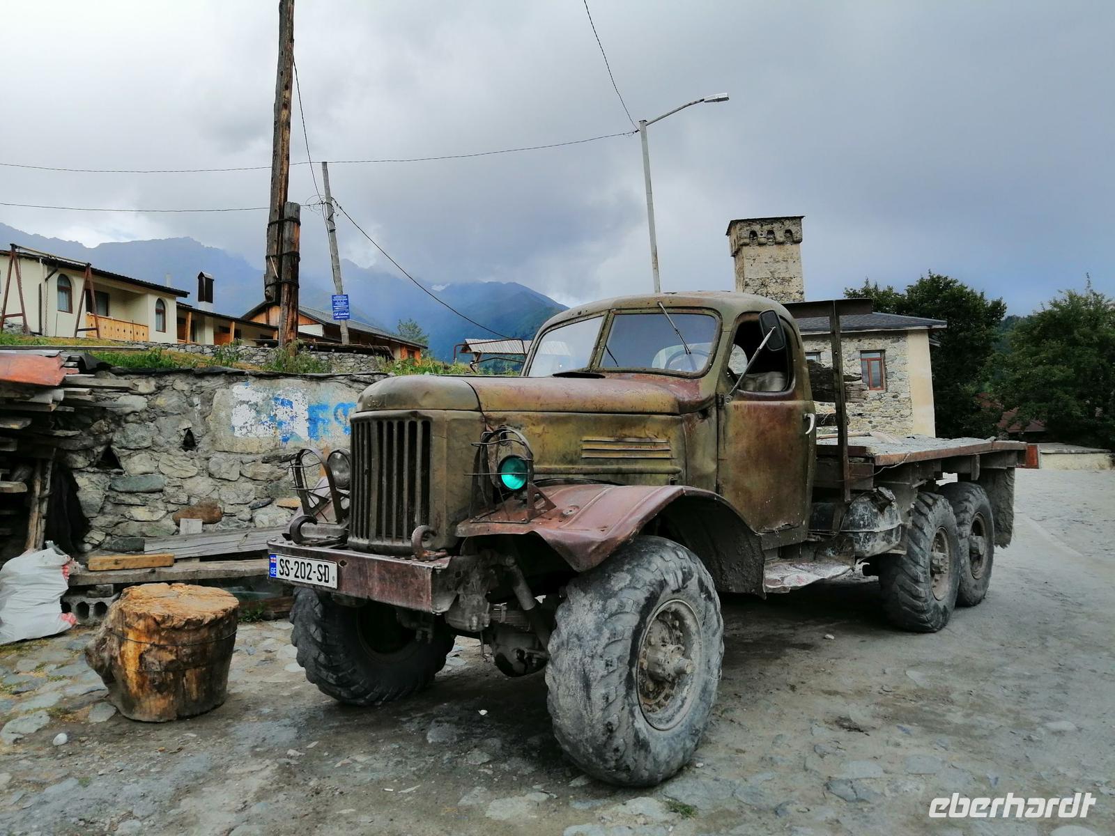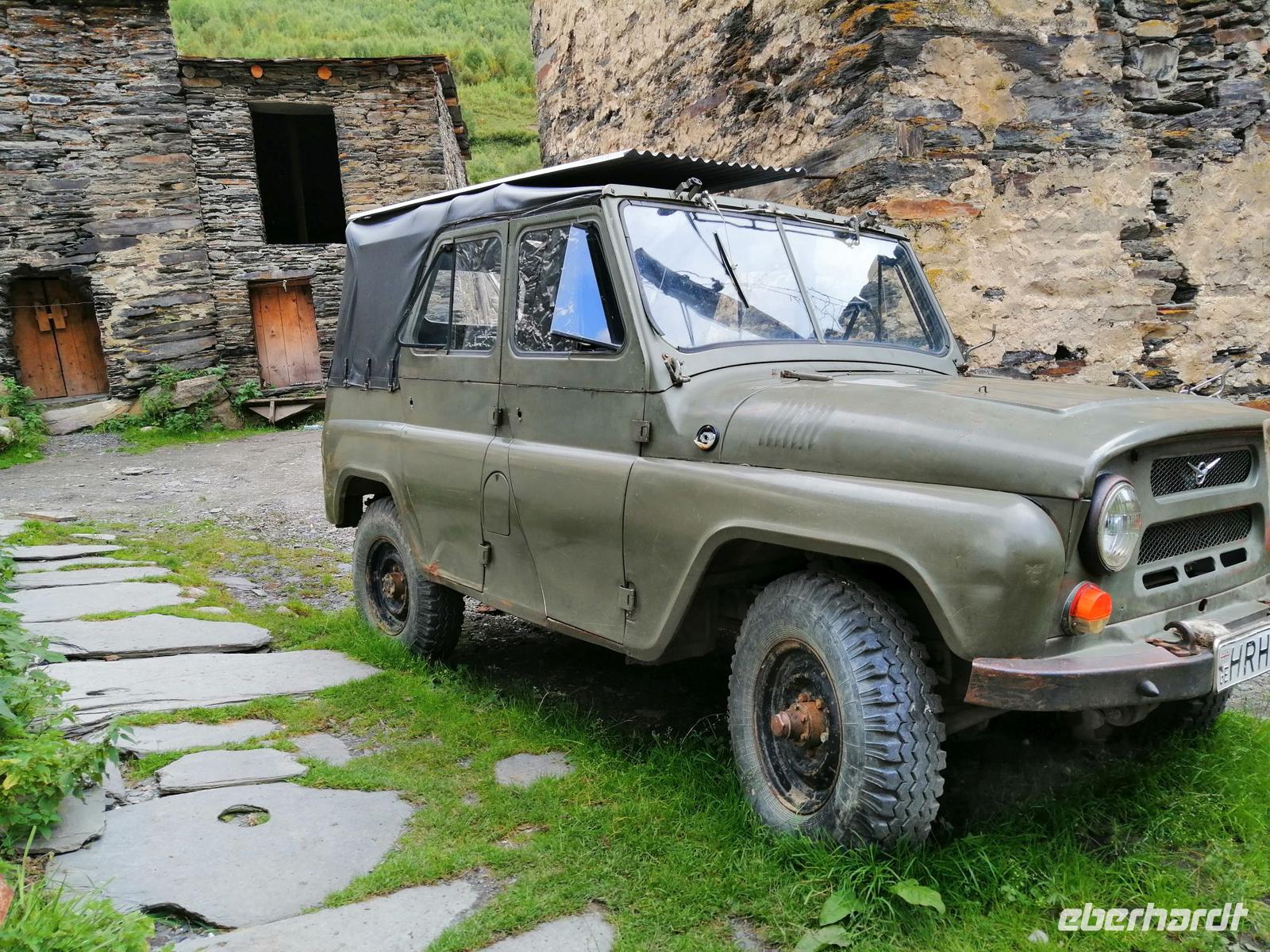 Heute haben wir was ganz Besonderes vor: wir fahren zum größten Teil über unbefestigte Straße in das höchste bewohnbare Dorf Europas, das sich ca. 45 km von Mestia befindet. Dafür standen kurz nach 9 Uhr drei Gälendewagen vor unserem Hotel bereit: legendäre Mitsubishi Delica. Ushguli liegt auf 2.200 Metern Höhe, am Berg Schchara, dem mit 5.201 m höchsten Berg Georgiens, an den Quellen des Enguri und Kwischri. Ushguli besteht aus mehreren Ortsteilen und der Name selbst bedeutet "furchtloses Herz".