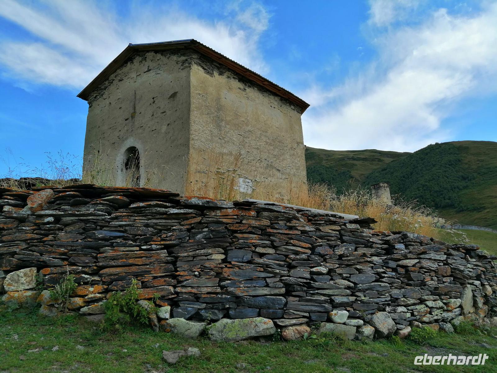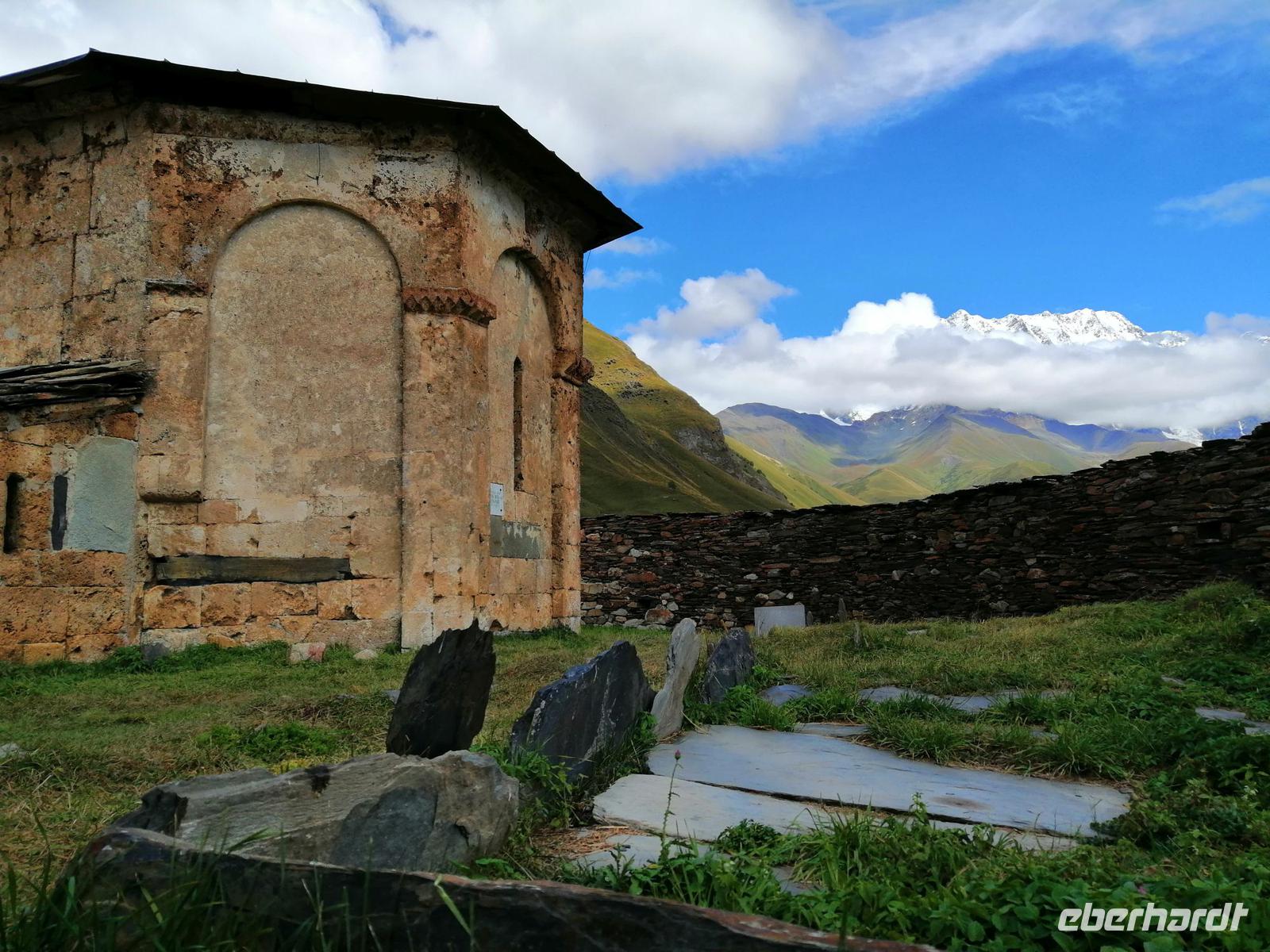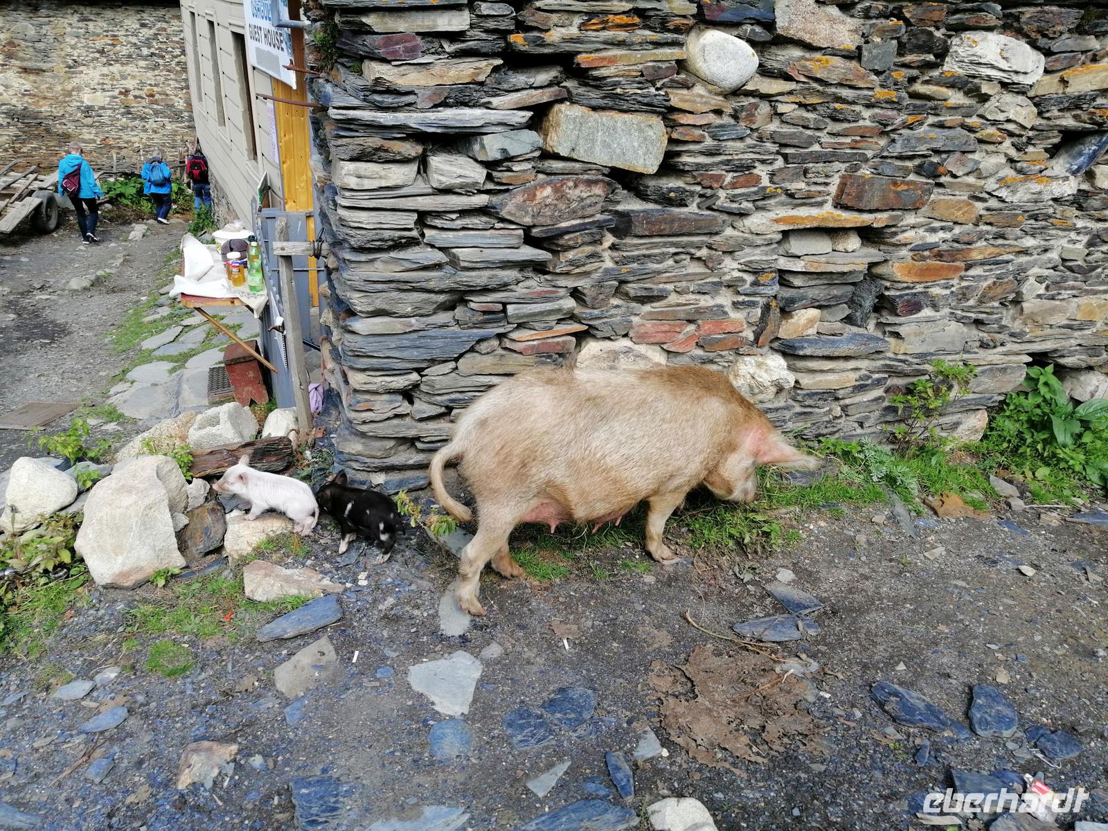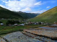 In Ushguli besichtigten wir die kleine Lamaria-Kirche aus dem 12. Jh. Das Wetter ist sehr schön und Sopo schlägt vor, eine kurze Wanderung zu machen. Ihr Vorschlag kommt sehr gut an. Nach der Wanderung trafen wir uns alle in der Gaststätte "Ushguli-Maspinndzeli", in der Nela die Chefin ist und liesen uns von der leckeren swanischen Küche verwöhnen.