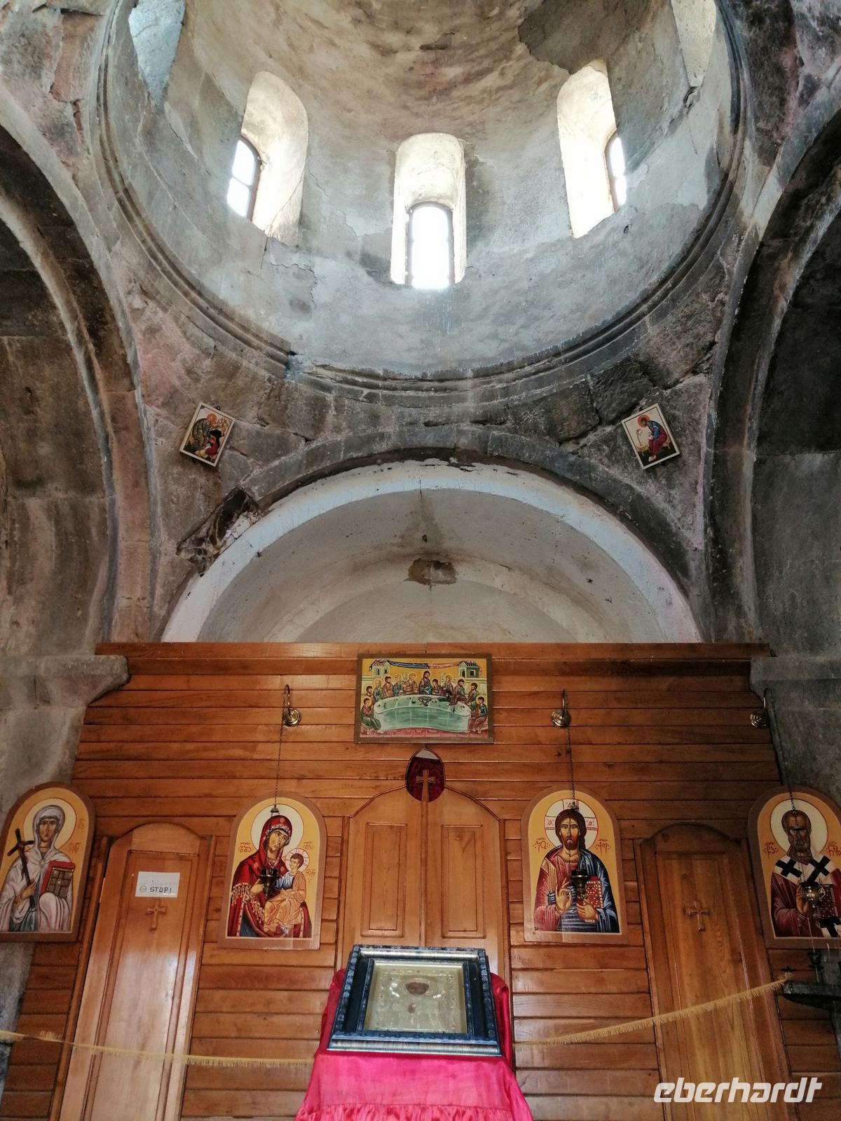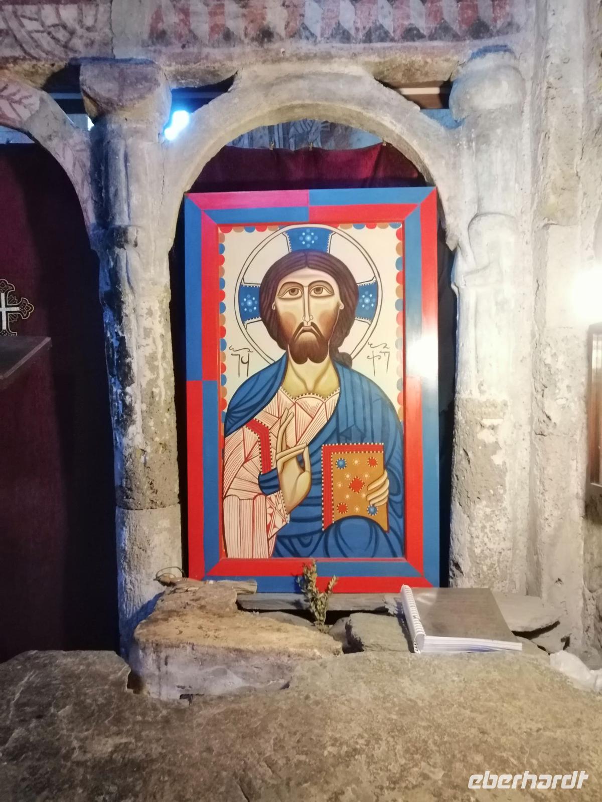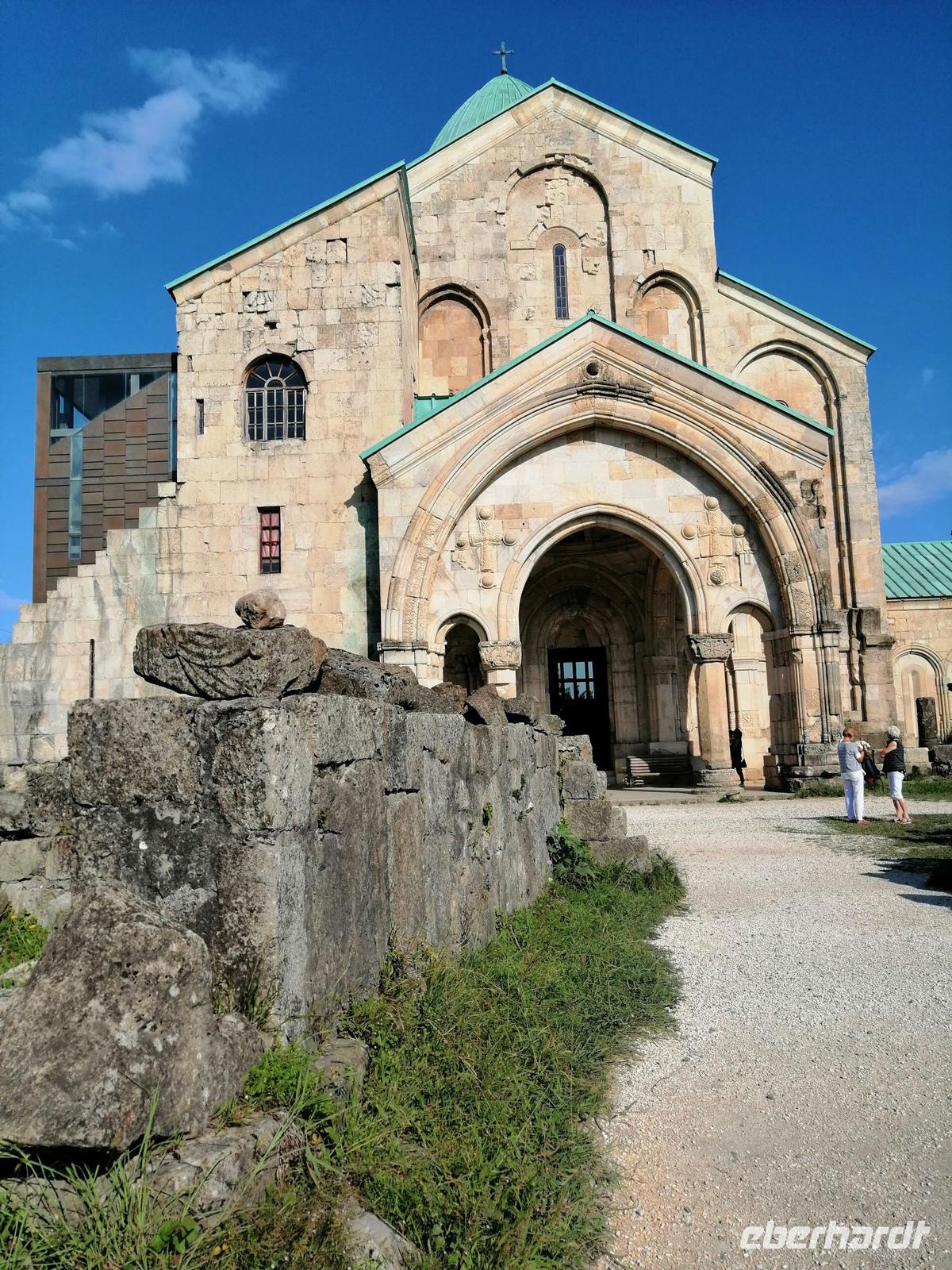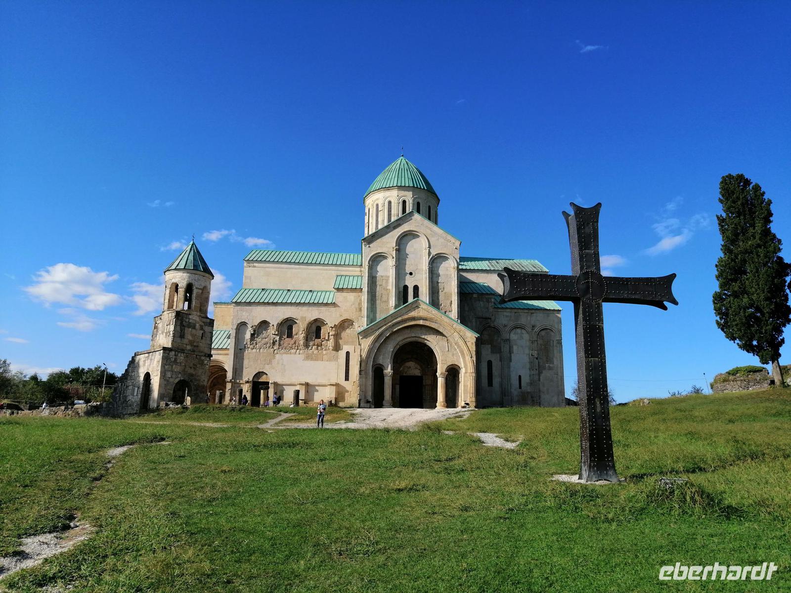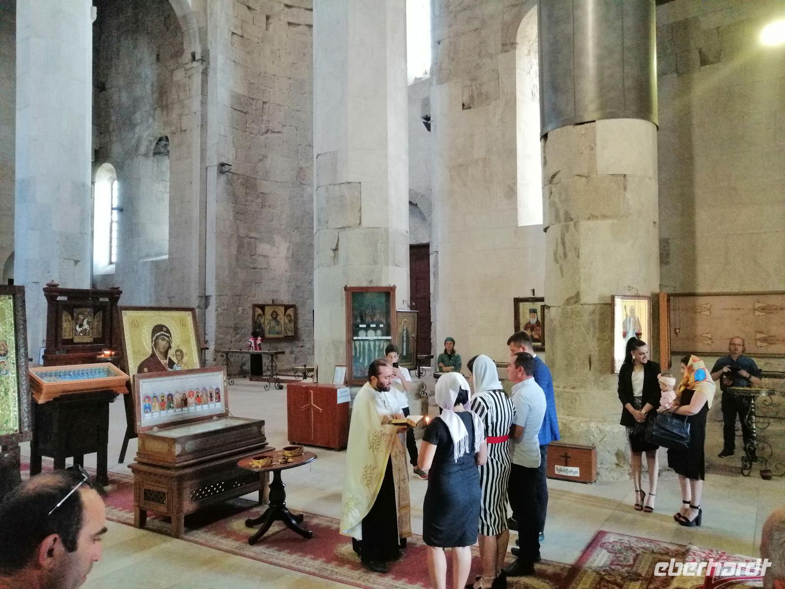 Als wir in Kutaisi kurz nach 16 Uhr angekommen sind, hatten wir noch genügend Zeit um die berühmte Kathedrale "Maria Entschlafen" zu besuchen. Diese eindrucksvolle Sehenswürdigkeit von Kutaisi aus dem 11 Jh. thront weithin sichtbar, auf einer Anhöhe, westwärts des Ukimerioni-Hügel über dem Fluß Rioni. Diese Kathedrale wurde unter der Herrschaft des Königs Bagrat erbaut und wird deshalb auch Bagrati-Kathedrale genannt. Bis vor kurzem zählte diese Anlage noch zum UNESCO Weltkulturerbe. Durch den im Rahmen der Restauration angebauten modernen Lift, der die Harmonie der gesamten Anlage erheblich stört, verlor die Kathedrale die UNESCO-Einstufung. Der Innenraum der Bagrati-Kathedrale präsentierte sich in stolzer Feierlichkeit.