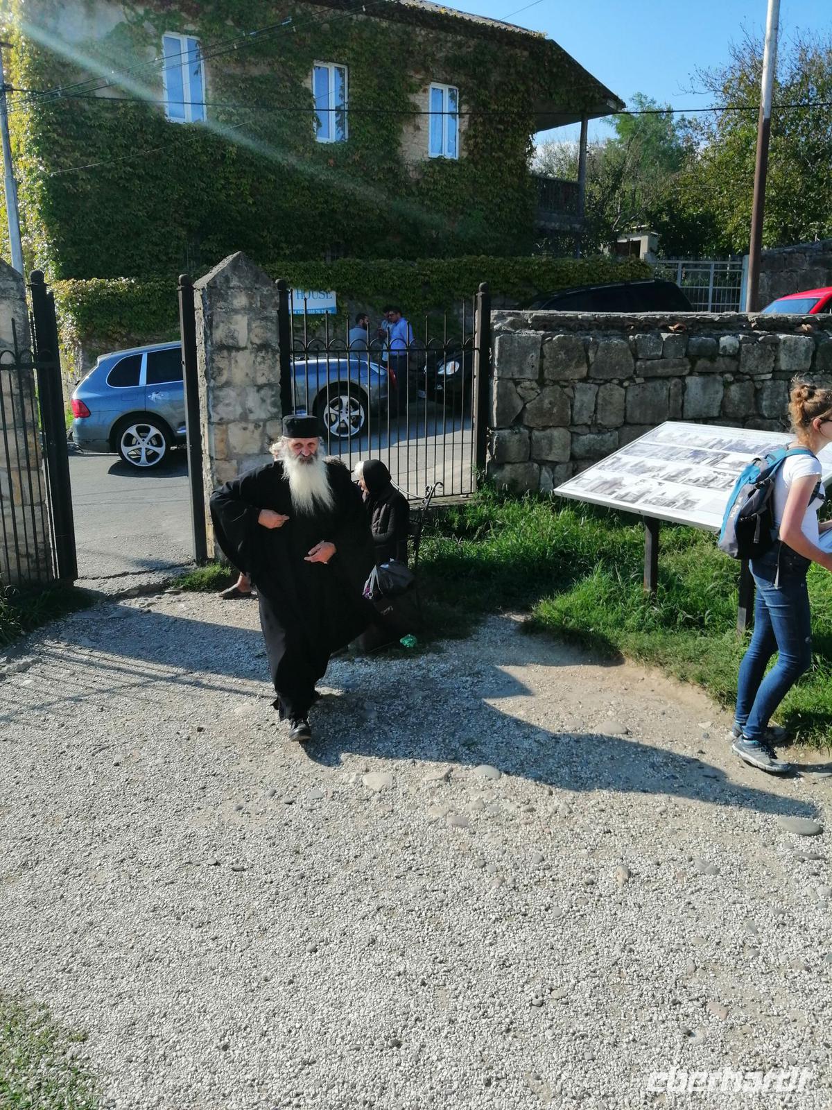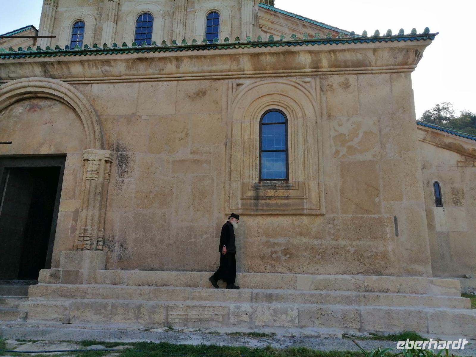 Danach fuhren wir in die Altstadt von Mzcheta und besuchten die Sweti-Zchoweli-Kathedrale aus dem 11. Jh. Das Areal der Kathedrale ist eingefasst von einer übermannshohen Mauer. Entlang dieser Mauer ziehen sich breite Wege, ist ein gepflegte Rasen angelegt, stehen einzelne Bäume. Sweti-Zchoweli bedeutet übersetzt: lebenspendende Säule. Von hier aus nahm das georgische Christentum seinen Lauf. Es ist wohl für jeden Georgier üblich, dass er wenigstens einmal im Leben hier in der Sweti-Zchoweli- Kathedrale gewesen ist.
