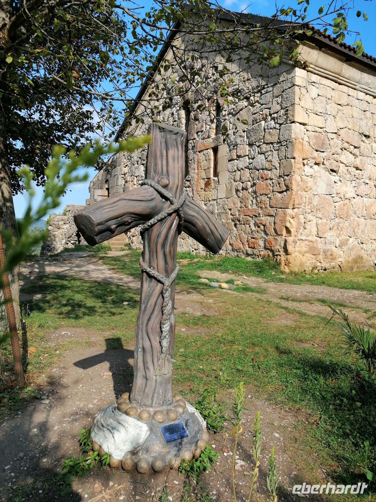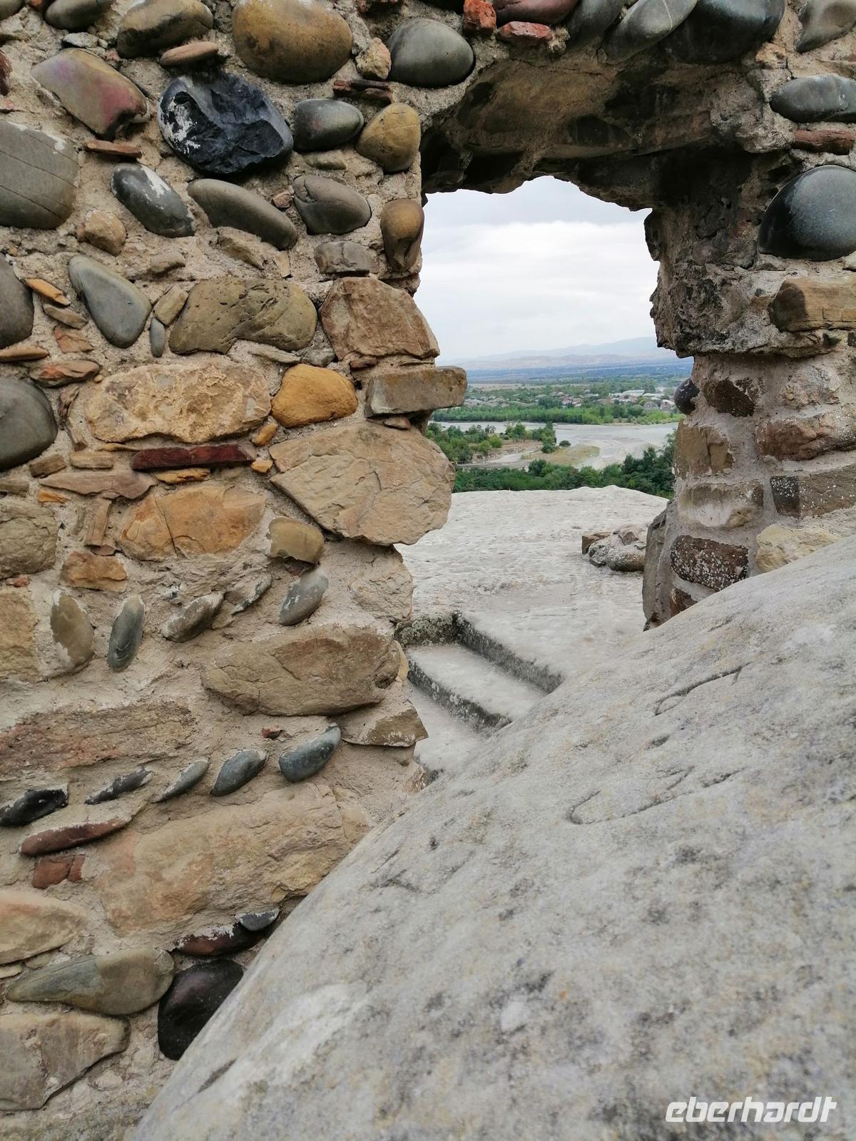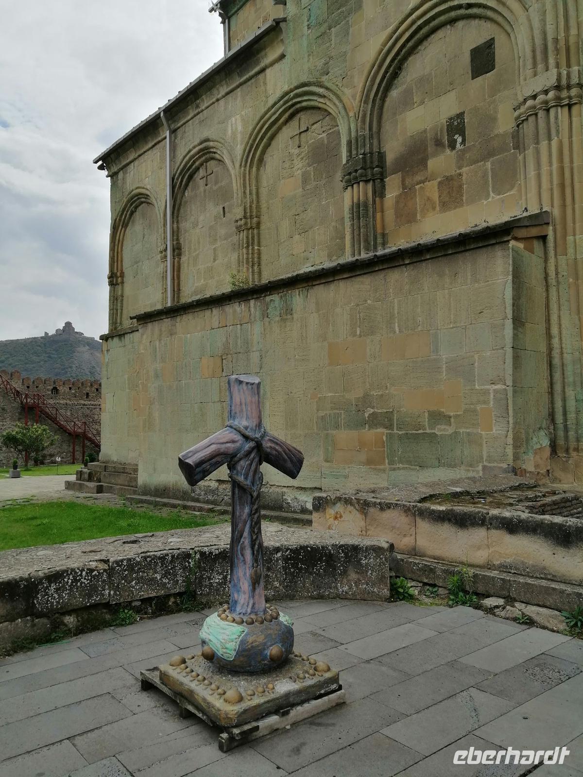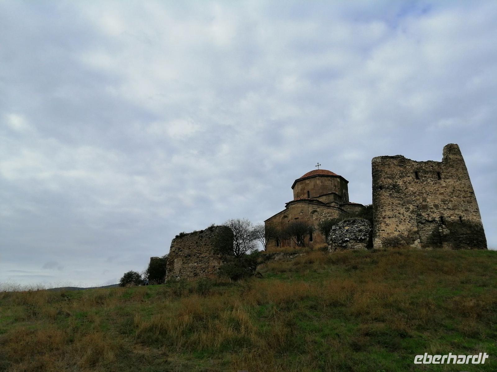 Eine der historischen Seehnswürdigkeiten der Region ist die berühmte Dschwari-Kirche aus dem 7 Jh. Übersetzt bedeutet es: Kirche zum Heiligen Kreuz. Sopo erzählte uns die Legende über die heilige Nino, die das Christentum nach Georgien gebracht haben soll. Bereits im 4 Jh. ließ sie an der heutigen Stelle der Kirche ein Kreuz errichten. Die Kirche wurde dann um dieses Kreuz herum gebaut, wobei die Baumeister versuchten, es mittig ins Zentrum der neuen Kirche zu bekommen. In der Dschwari-Kirche entfaltet sich über dem Eingang zur Kirche ein Lebensbaum. Der Lebensbaum ist in seiner Ornamentik ein Ausdruck dessen, dass Christus als ein Lebensquell gesehen wird.