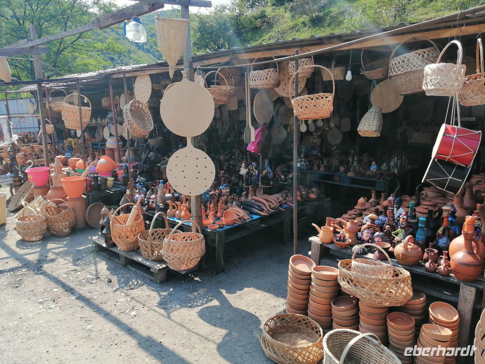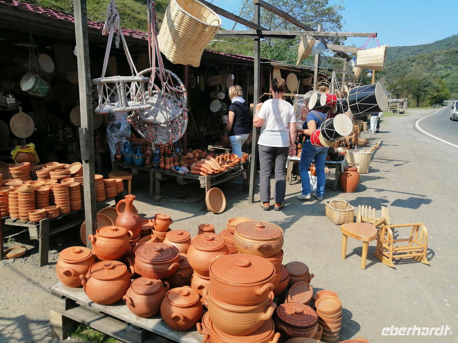 Anschließend fuhren wir über den Rikoti-Pass in Richtung Gori. Dieser Pass bildet die natürliche Grenze zwischen West- und Ostgeorgien und ist gleichzeitig die Wasserscheide zwischen den beiden Flüßen: Rioni im Westen und Mtkravi im Osten. Uterwegs machten wir eine kurze Pause an einem der traditionellen Töpfermärkte (beim Dorf Schroscha). Händler aus den umliegenden Dörfern bieten am Straßenrand Töpferwaren aus rostrotem Ton und andere Waren an. Auch das für diese Region typische Süßbrot haben wir gekostet.