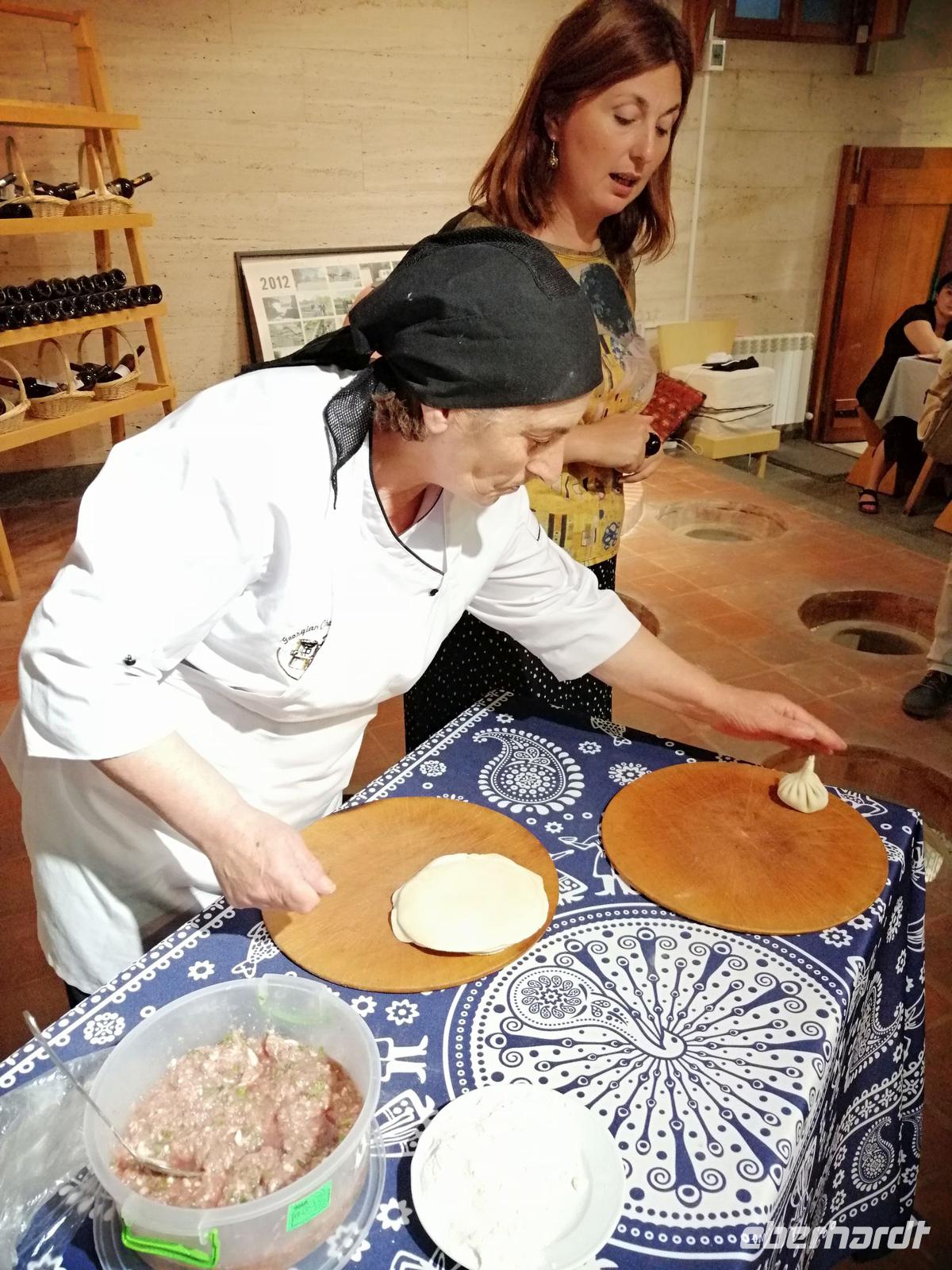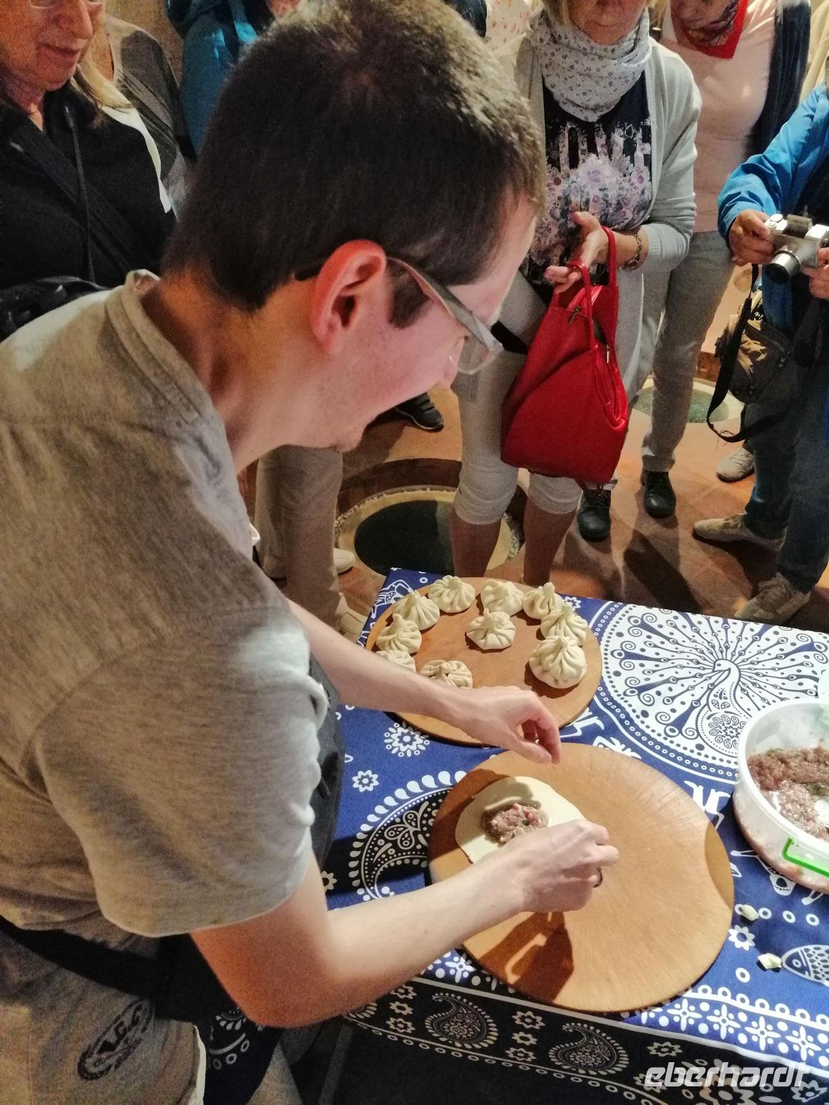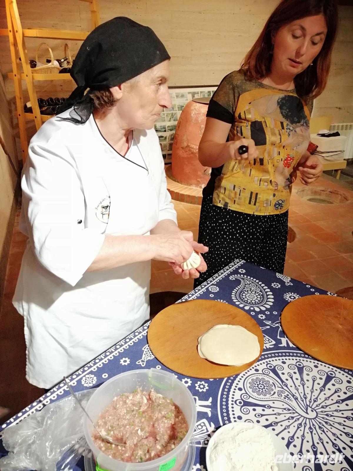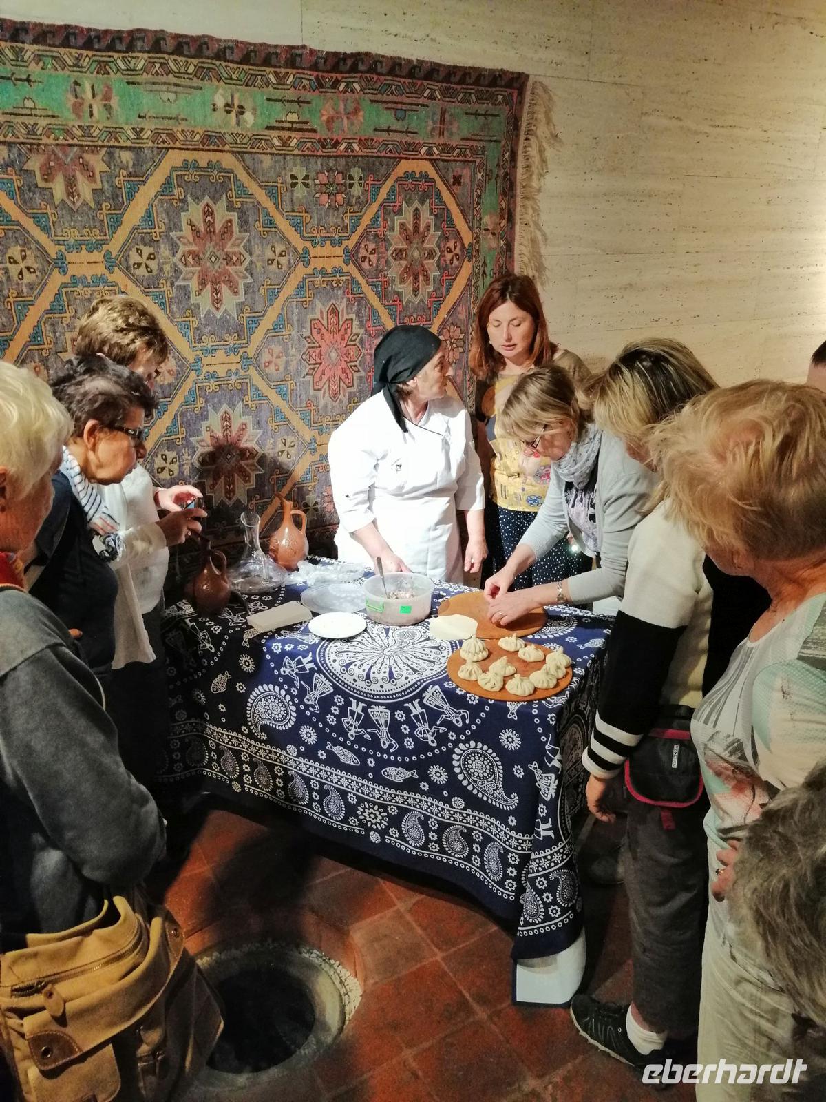 Danach fuhren wir zum Weingut Chateau Muchrani und erlebten dort eine lang erwartete Weinverkostung. Außerdem bestand die Möglichkeit beim Vorbereiten der georgischen Spezialität Chinkali mitzumachen aber auch beim Brotbacken. Zum Abendessen wurden uns unter anderem auch unsere selbst hergestellten Chinkali serviert. Ein tolles Tänzerpaar präsentierte uns während des Abendessen ihr Können und wie genossen die landestypische Folklore.