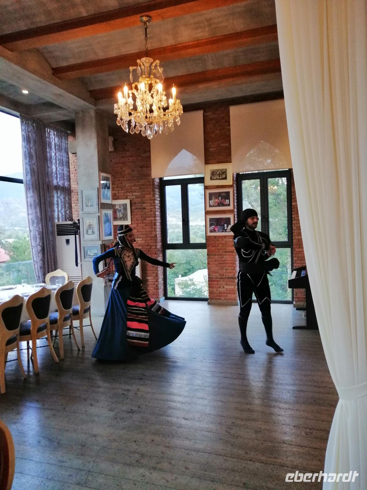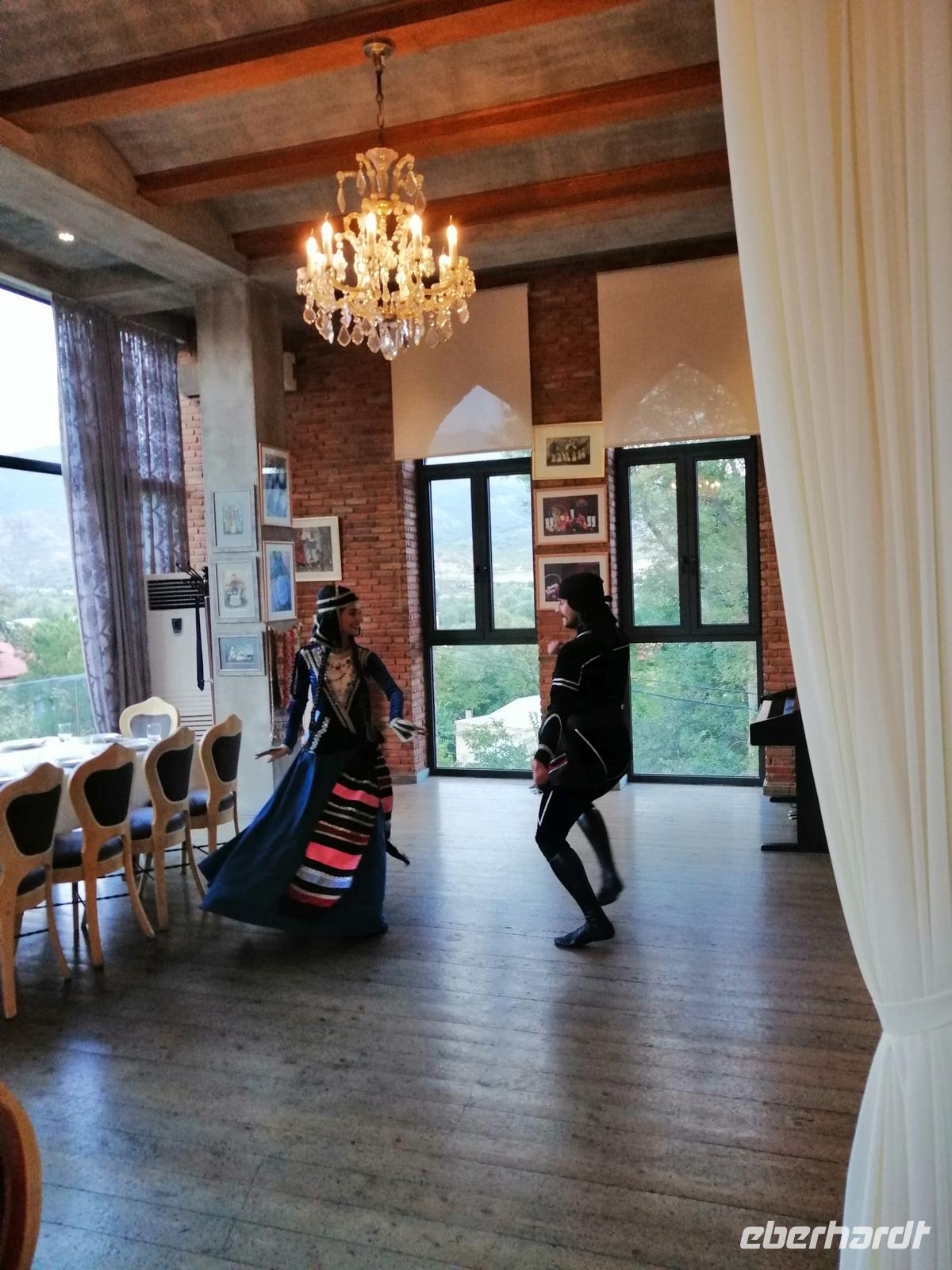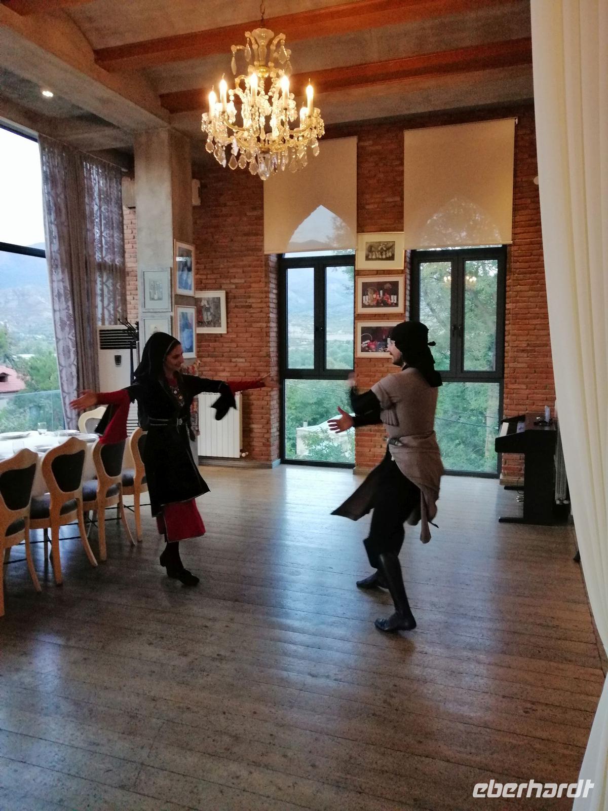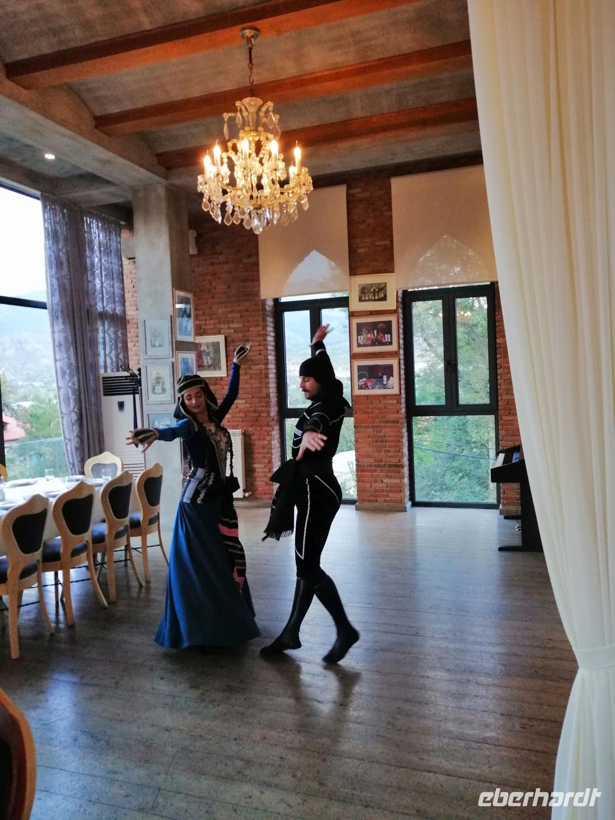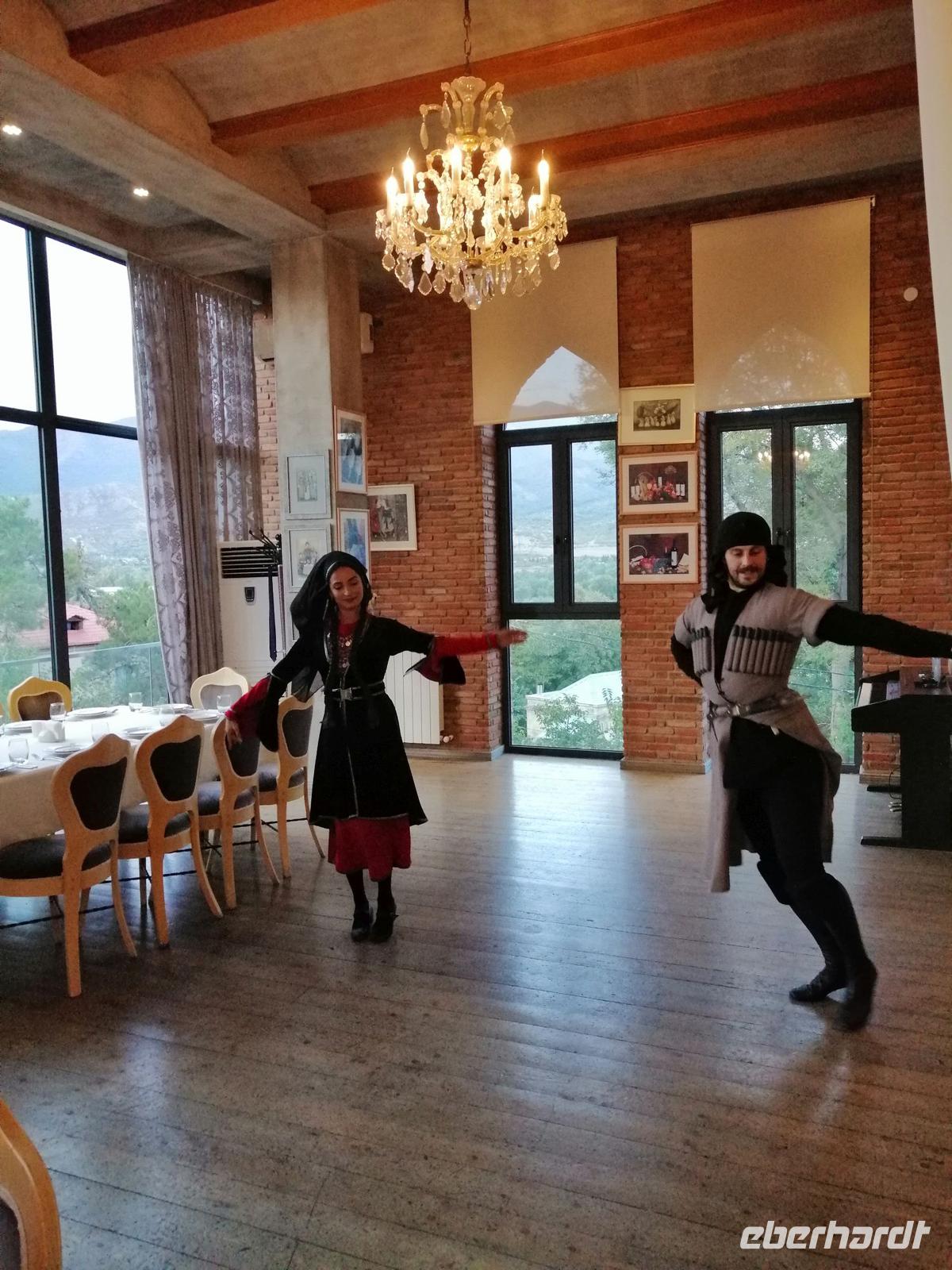 Danach fuhren wir zum Weingut Chateau Muchrani und erlebten dort eine lang erwartete Weinverkostung. Außerdem bestand die Möglichkeit beim Vorbereiten der georgischen Spezialität Chinkali mitzumachen aber auch beim Brotbacken. Zum Abendessen wurden uns unter anderem auch unsere selbst hergestellten Chinkali serviert. Ein tolles Tänzerpaar präsentierte uns während des Abendessen ihr Können und wie genossen die landestypische Folklore.
