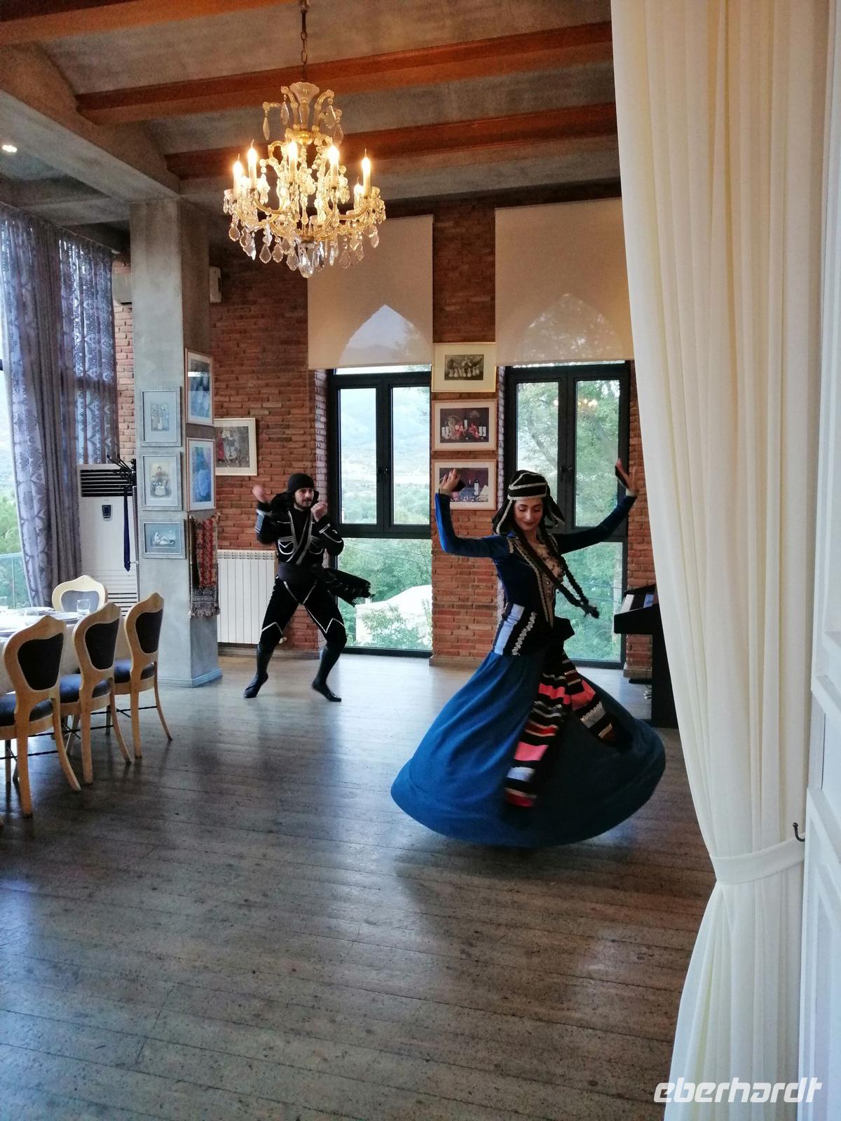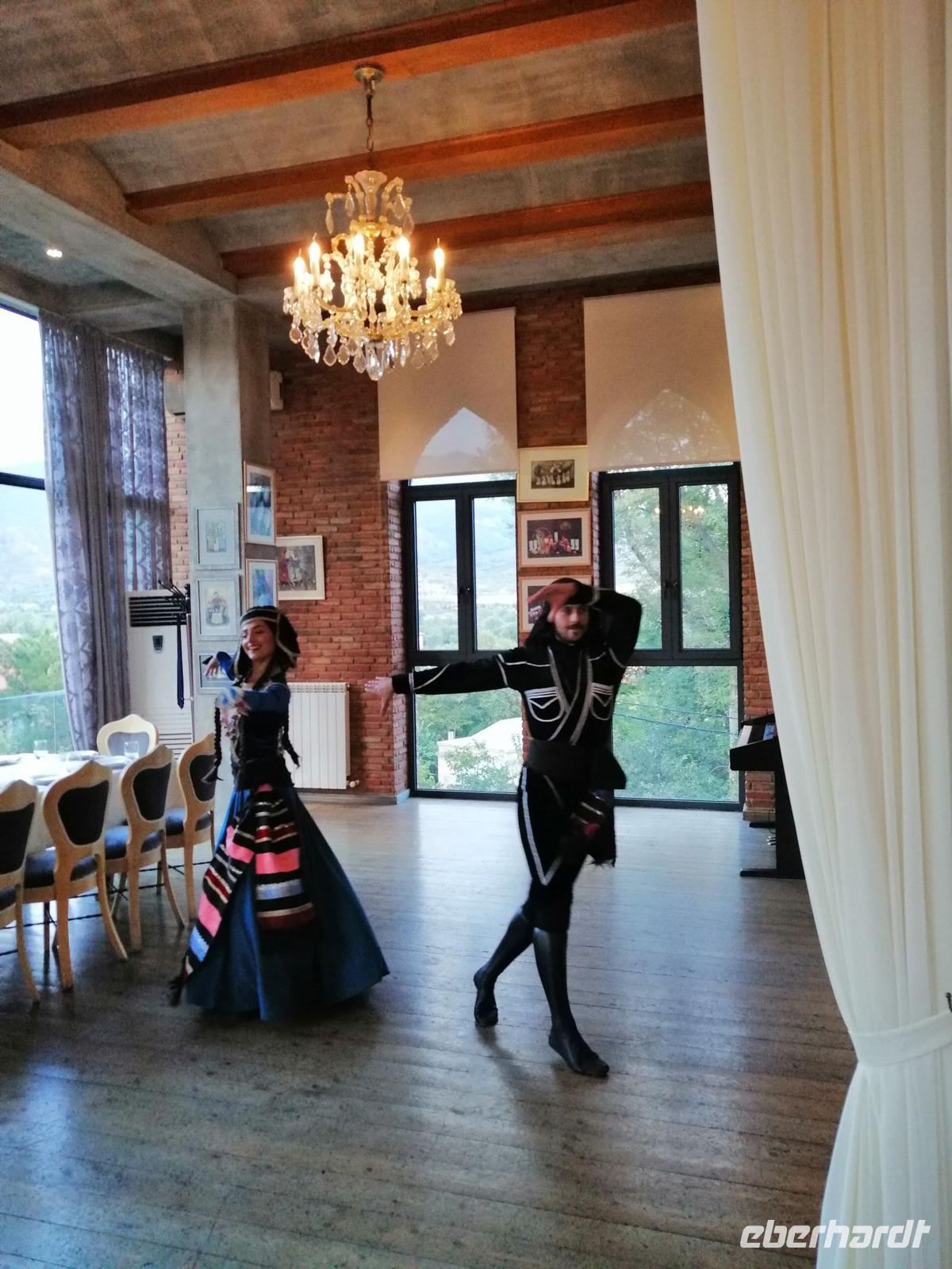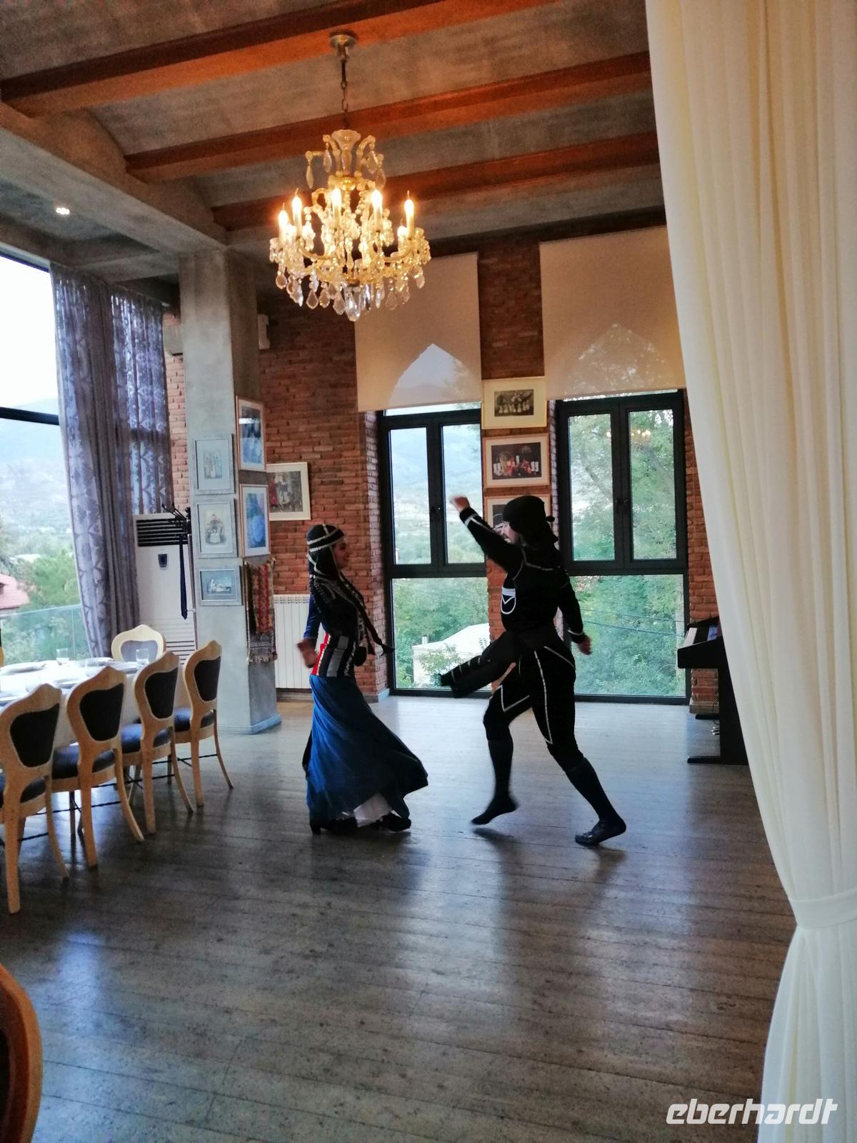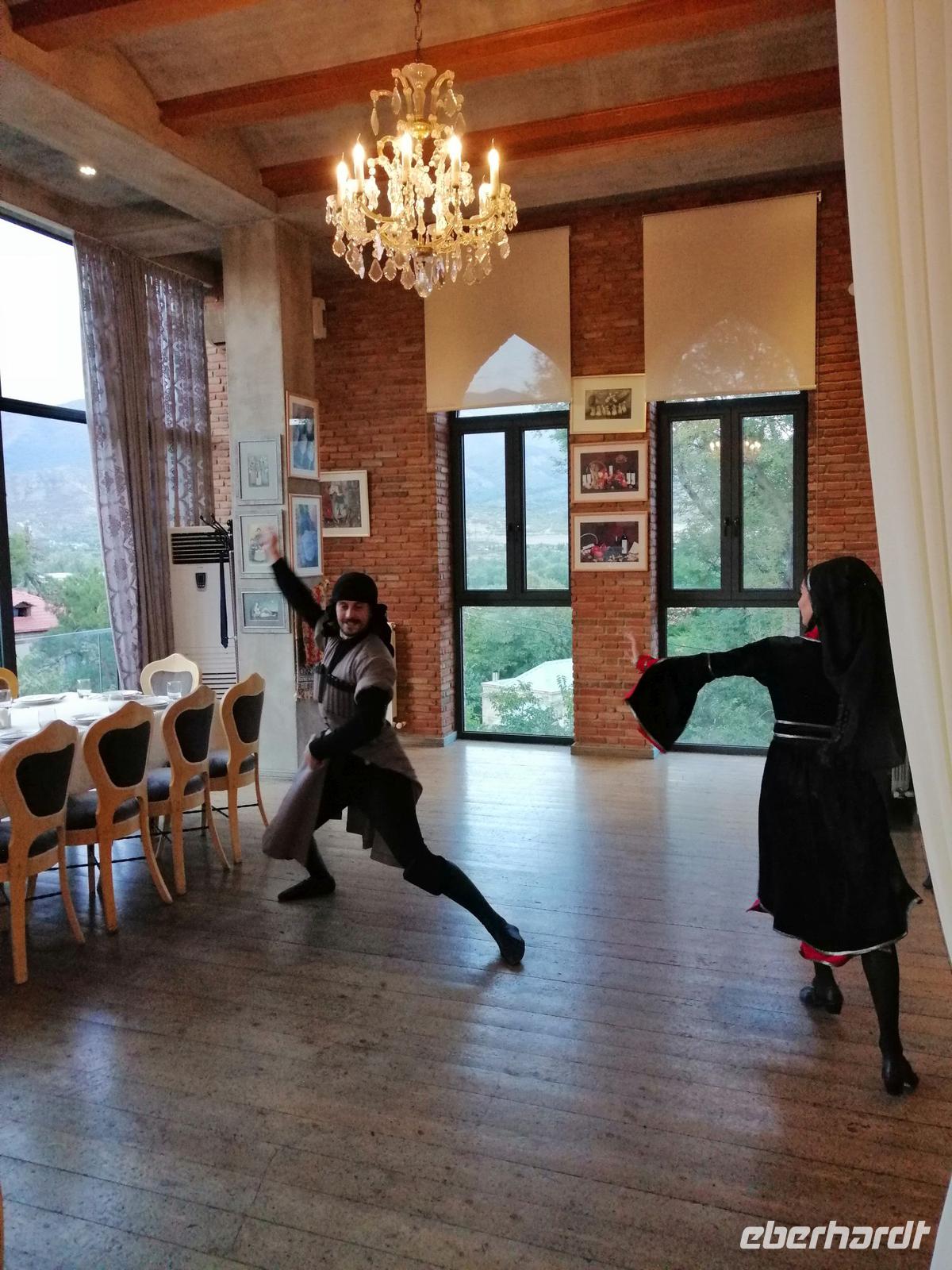 Danach fuhren wir zum Weingut Chateau Muchrani und erlebten dort eine lang erwartete Weinverkostung. Außerdem bestand die Möglichkeit beim Vorbereiten der georgischen Spezialität Chinkali mitzumachen aber auch beim Brotbacken. Zum Abendessen wurden uns unter anderem auch unsere selbst hergestellten Chinkali serviert. Ein tolles Tänzerpaar präsentierte uns während des Abendessen ihr Können und wie genossen die landestypische Folklore.