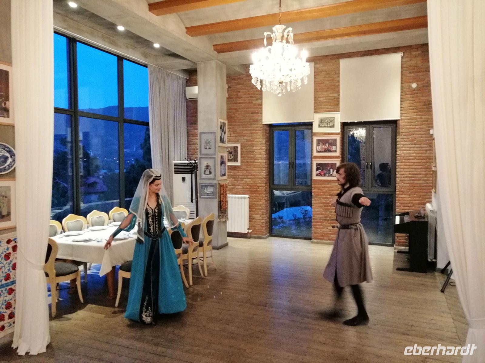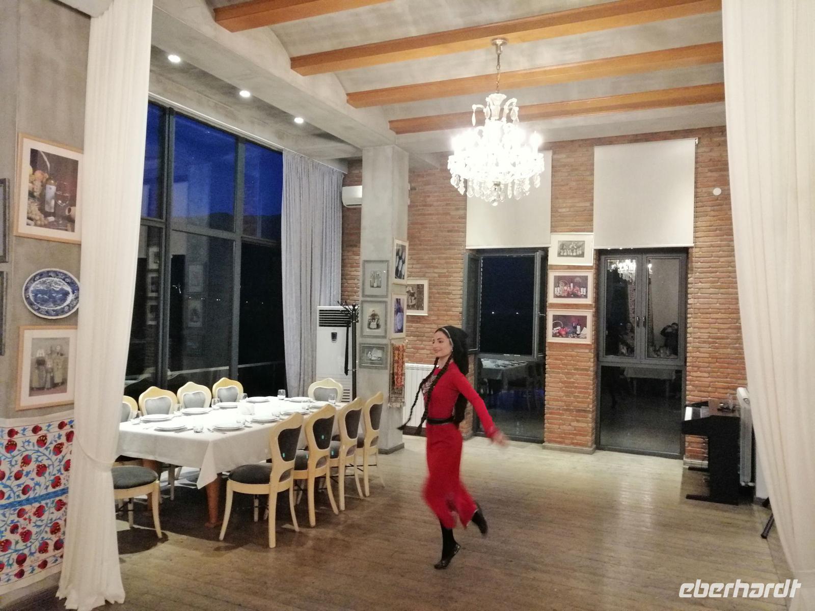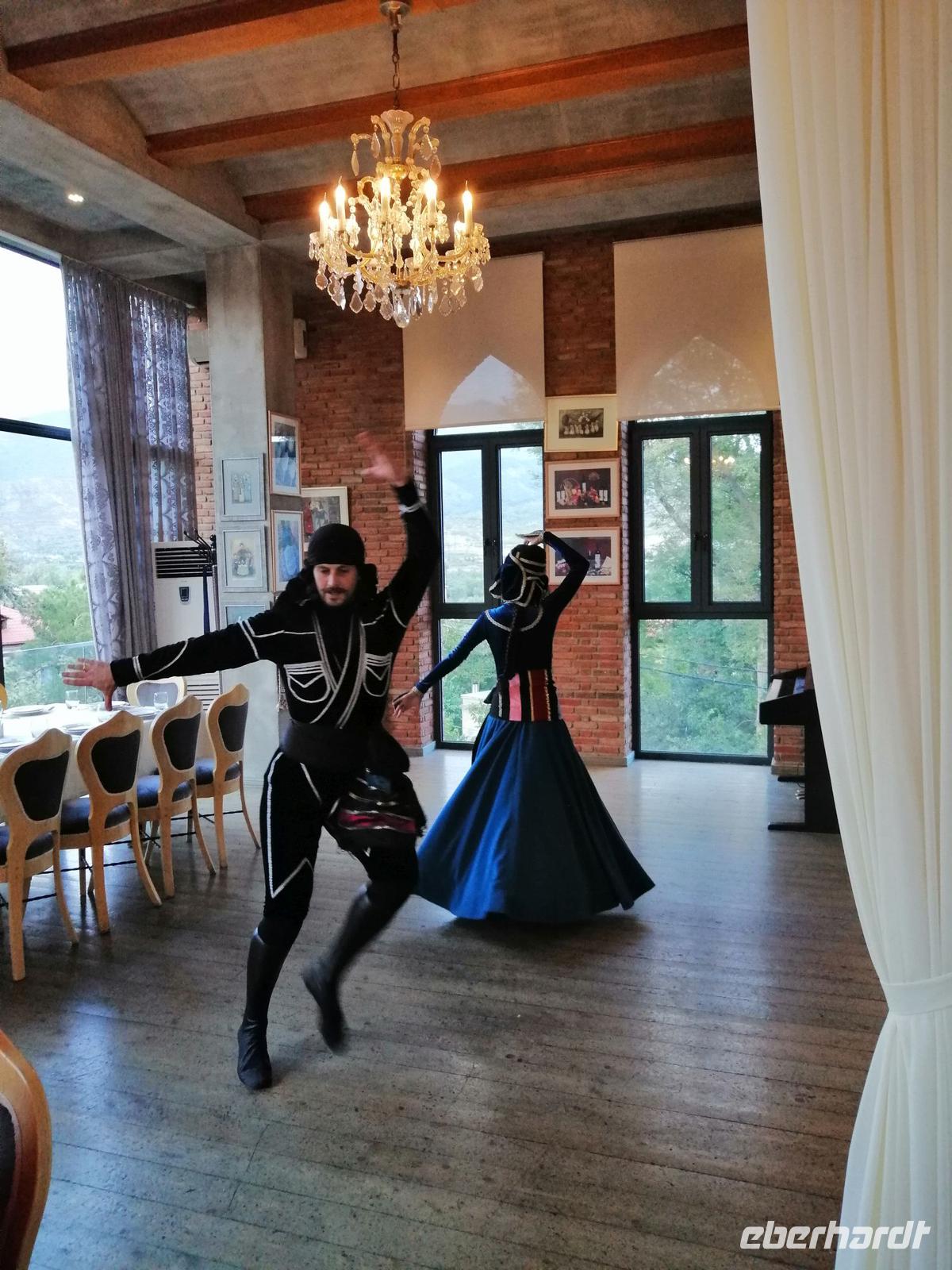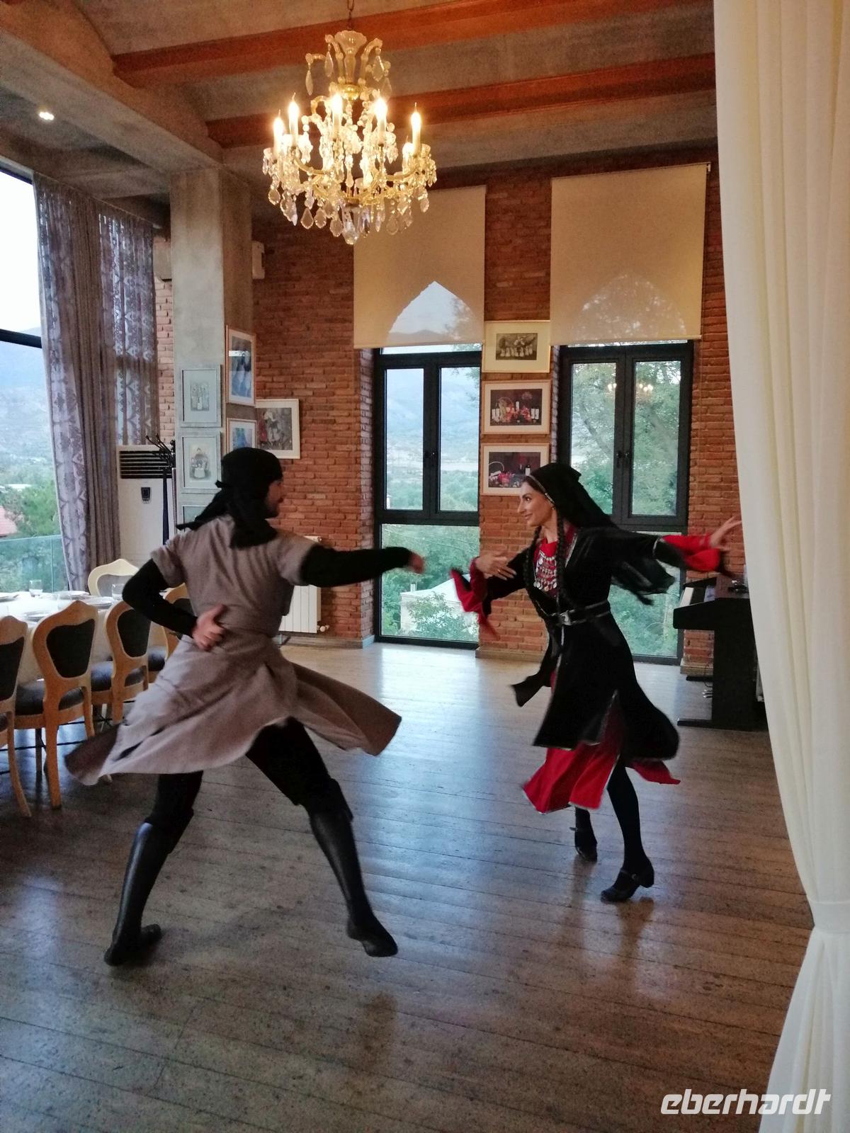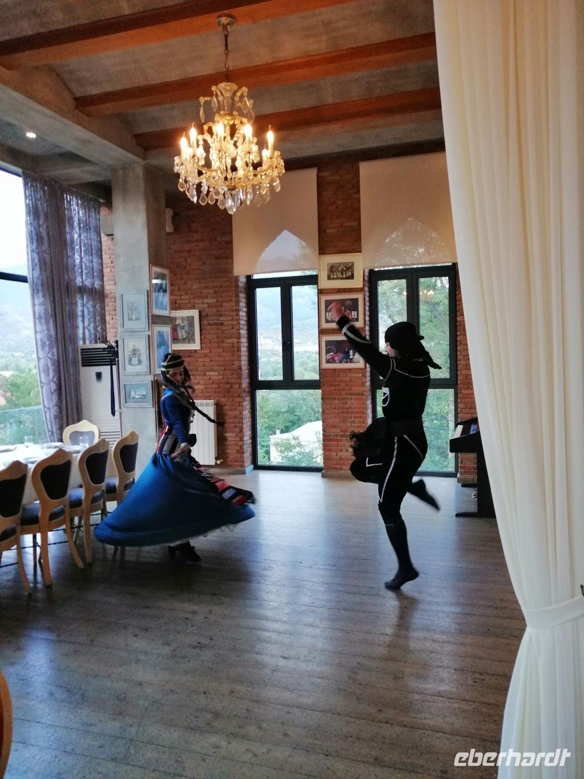 Danach fuhren wir zum Weingut Chateau Muchrani und erlebten dort eine lang erwartete Weinverkostung. Außerdem bestand die Möglichkeit beim Vorbereiten der georgischen Spezialität Chinkali mitzumachen aber auch beim Brotbacken. Zum Abendessen wurden uns unter anderem auch unsere selbst hergestellten Chinkali serviert. Ein tolles Tänzerpaar präsentierte uns während des Abendessen ihr Können und wie genossen die landestypische Folklore.