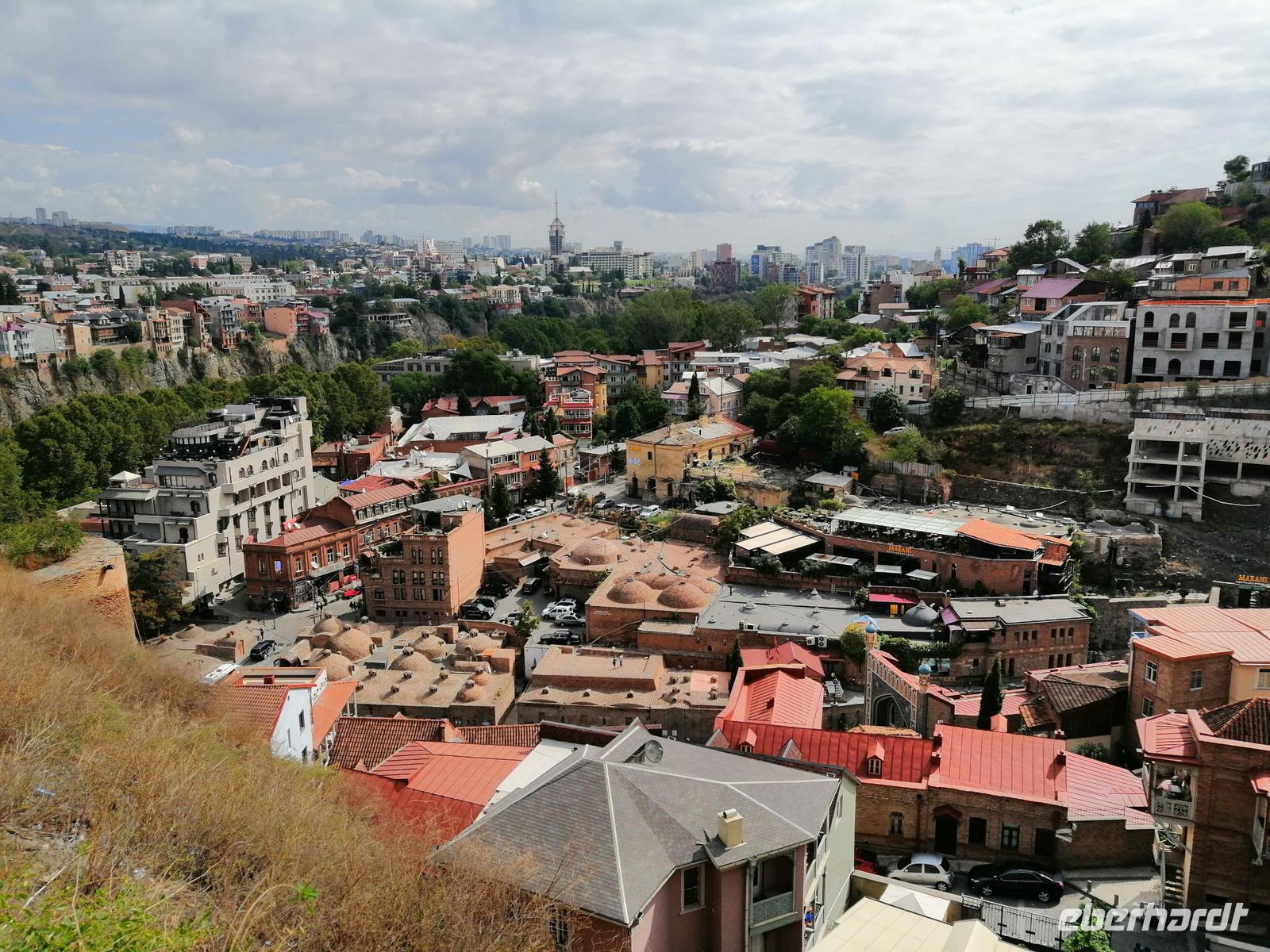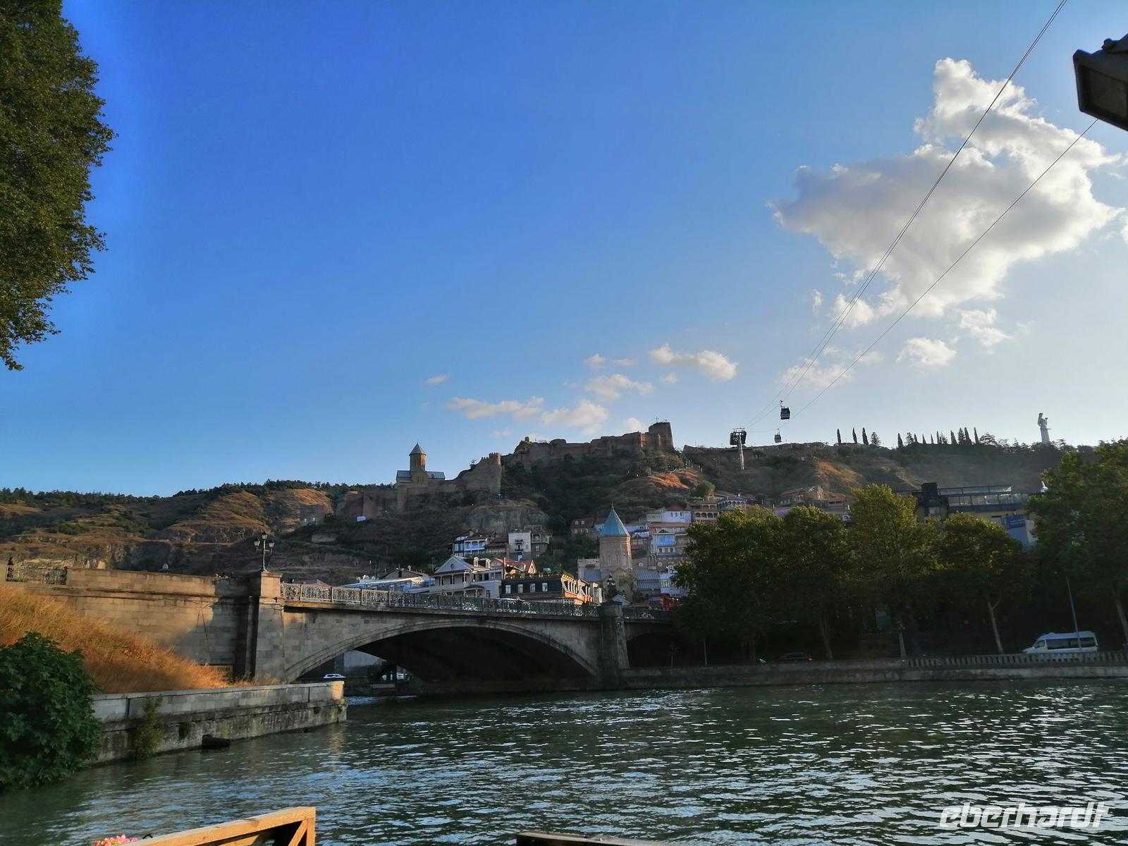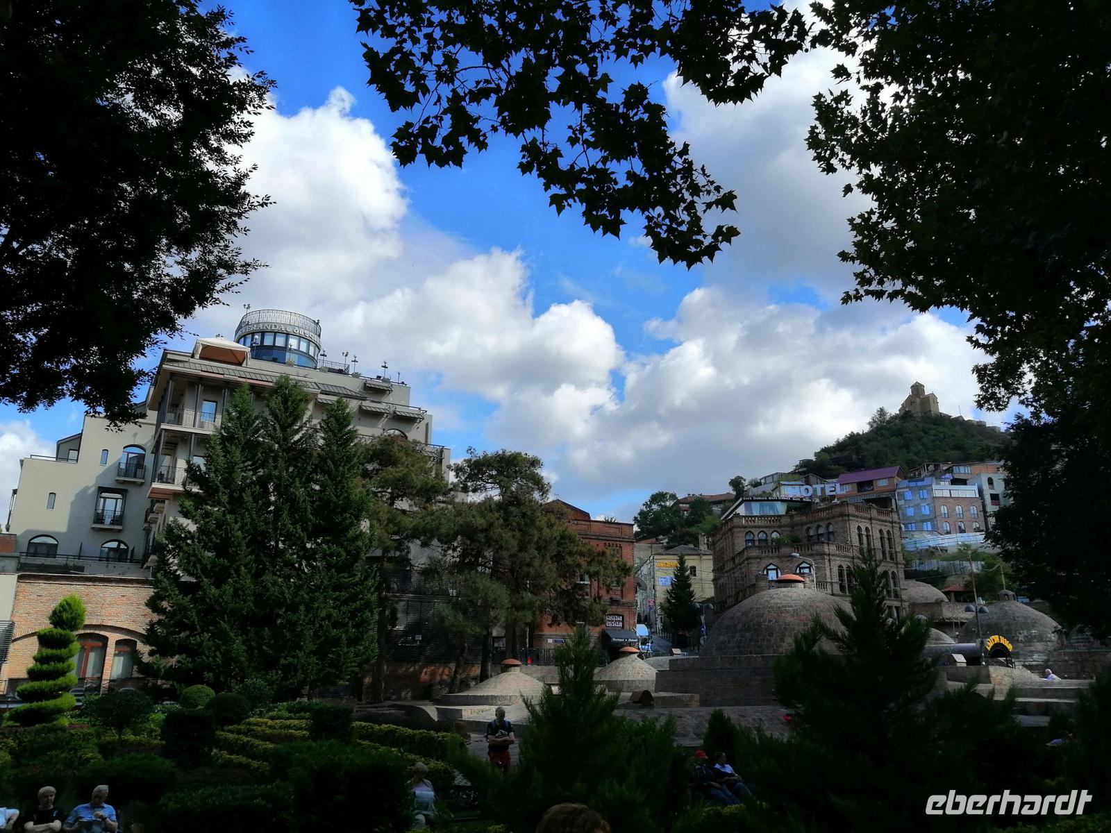 Unsere Erkundung der Hauptstadt von Georgien geht heute weiter. Wir fuhren mit der Stadtseilbahn zur Narikala-Festung, blickten von der Aussichtsplattform in den botanischen Garten, der sich südwestlich von Narikala ersteckte und spazieren zu Fuß wieder runter, zum Bäderviertel Abanotubani (Schwefelbäder). Die Gründung der Stadt bezieht sich auf die Thermalquellen, die an verschiedenen Orten aus dem Boden sprudeln. Die meisten der warmen Quellen (24 bis 45 Grad) enthalten ein Gemisch aus Eisen und Schwefel. Hinter den Schwefelbädern befand sich ein Wasserfall, den wir auch besichtigt haben.