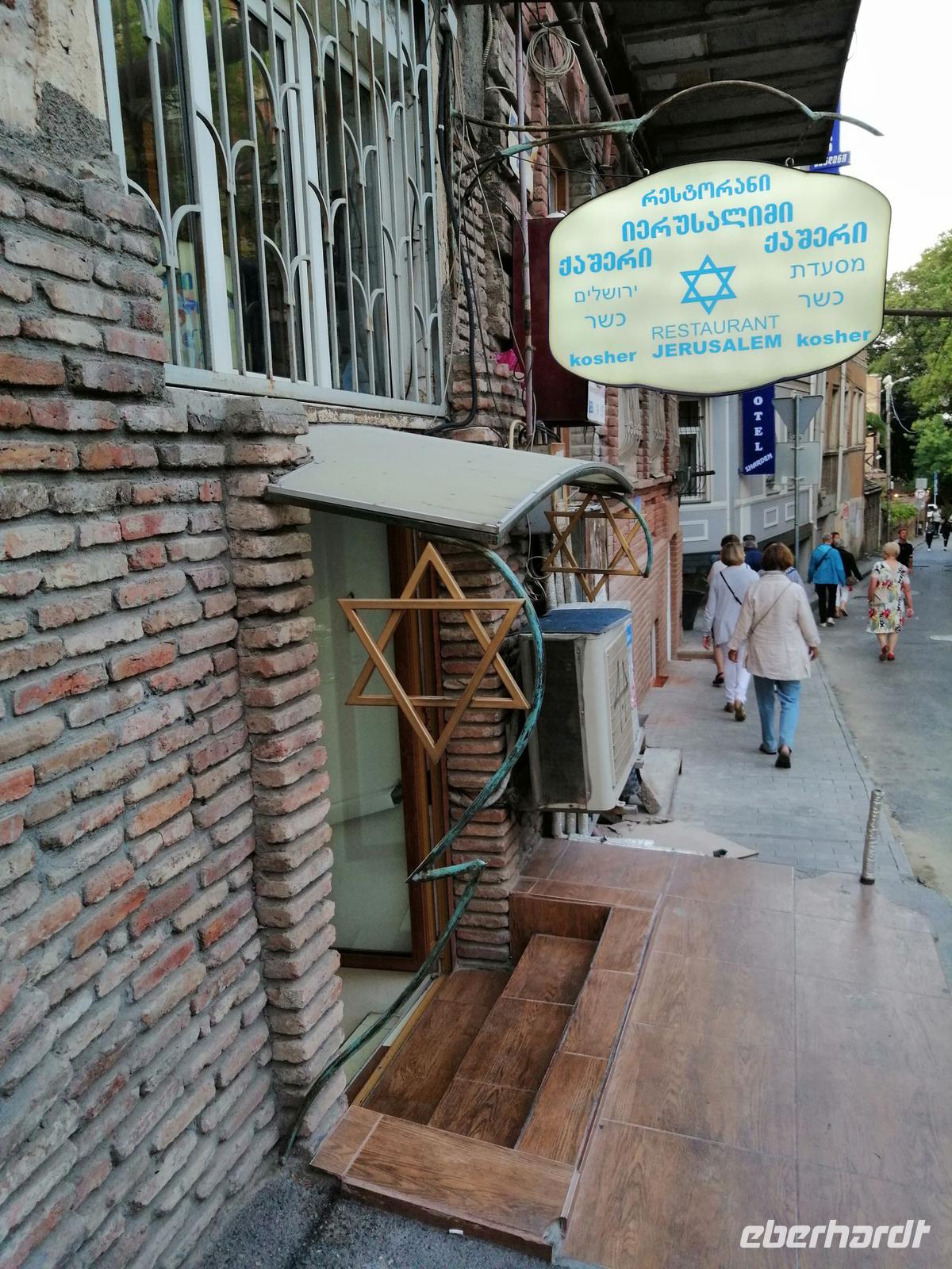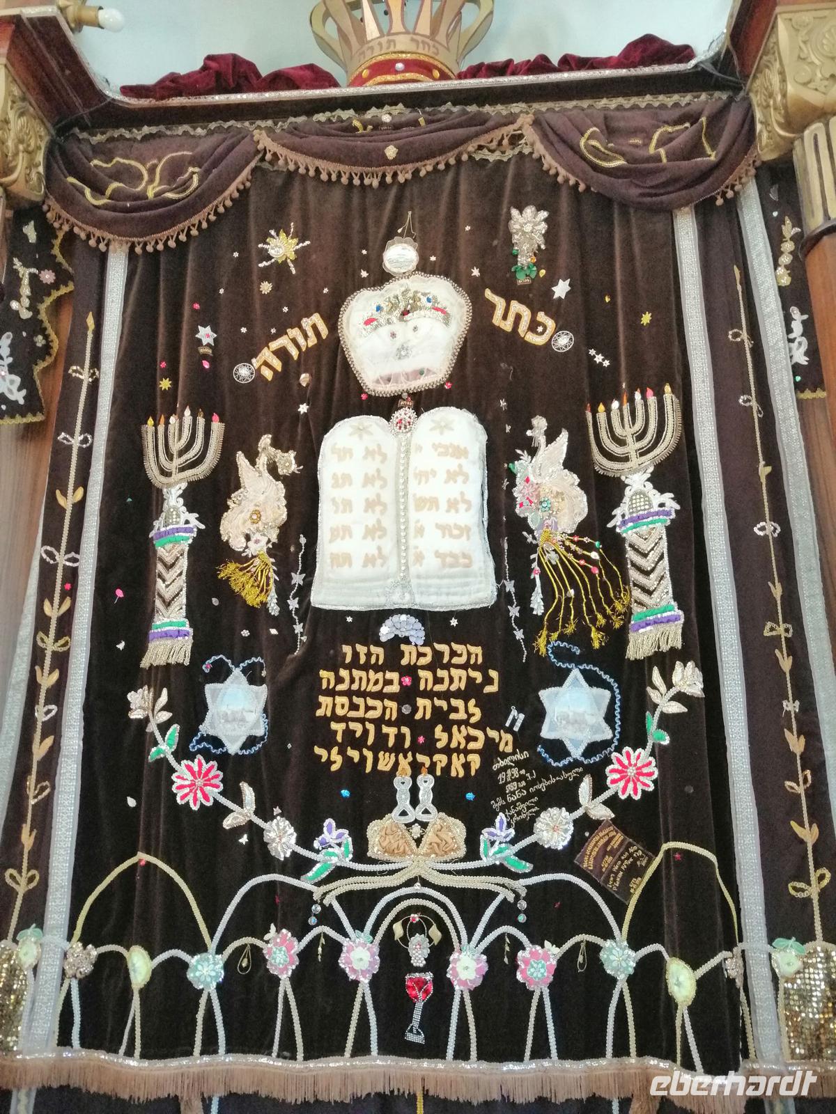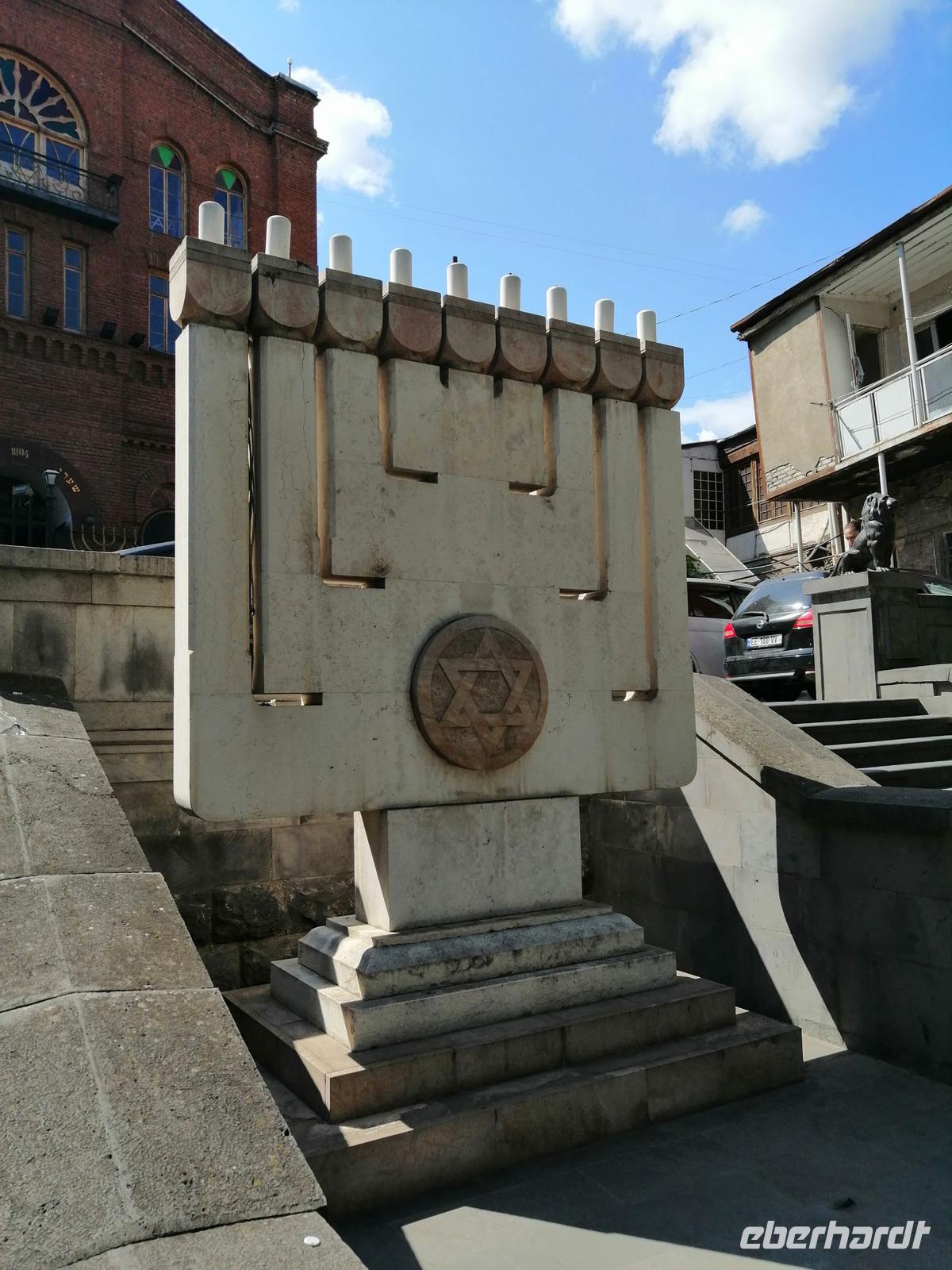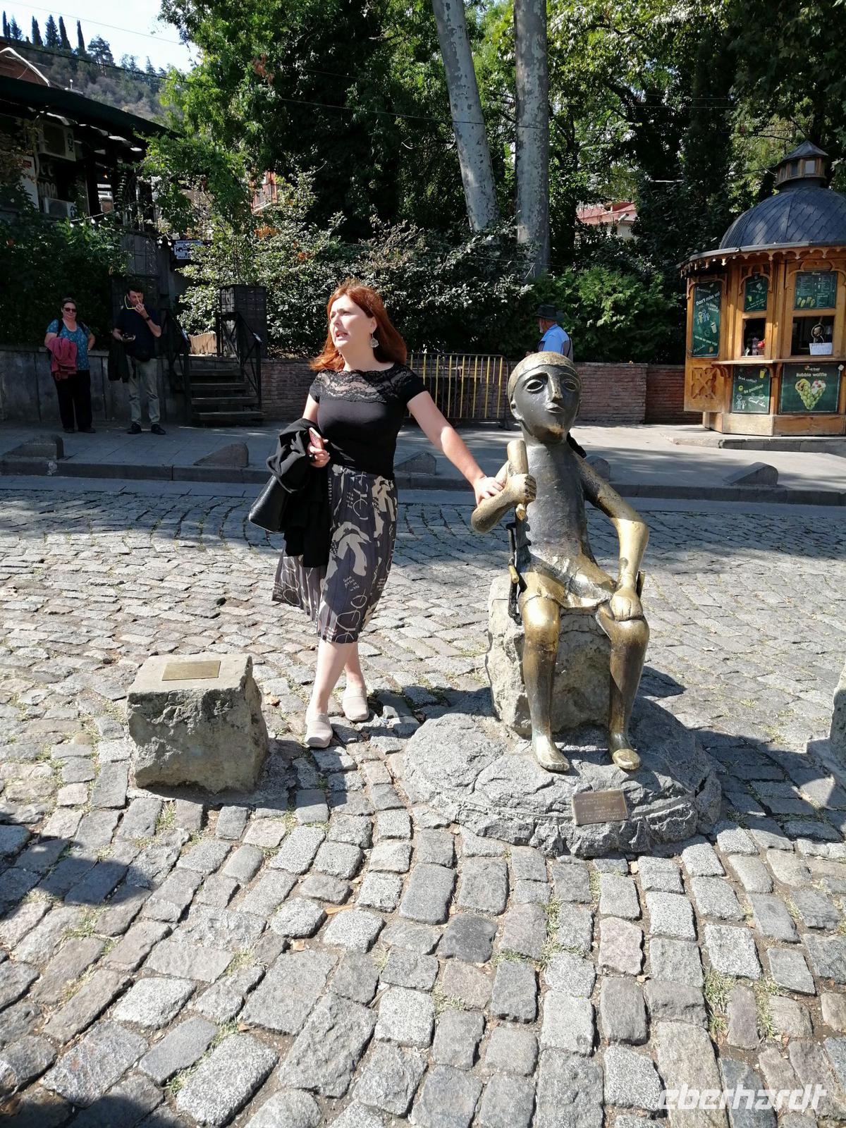 Nun ging es durch die schmalen Gassen der Altstadt, zur Tamada-Skulptur, Karawan-Saraj-Zentrum (Ausstellungszentrum mit Souvenirs-Verkauf) und zur Synagoge. Wir durften sogar in die Synagoge rein und schauten uns mit Interesse die beiden Stockwerke an. Anschließend besuchten wir die Sioni-Kirche aus dem 6. Jh. Ihren Namen hat die Kirche vom Berg Sion (Zion) in Jerusalem. Wir bummelten durch das traditionsreichste und älteste Viertel von Tbilisi mit vielen ausgestellten Bildern und traditionellen georgischen Souveniers bis zum Marionetten-Theater von Reso Gabriadze, dem georgischen Meister des Puppentheaters und bekannten Künstler.