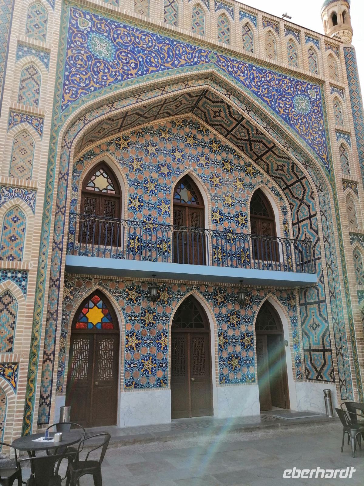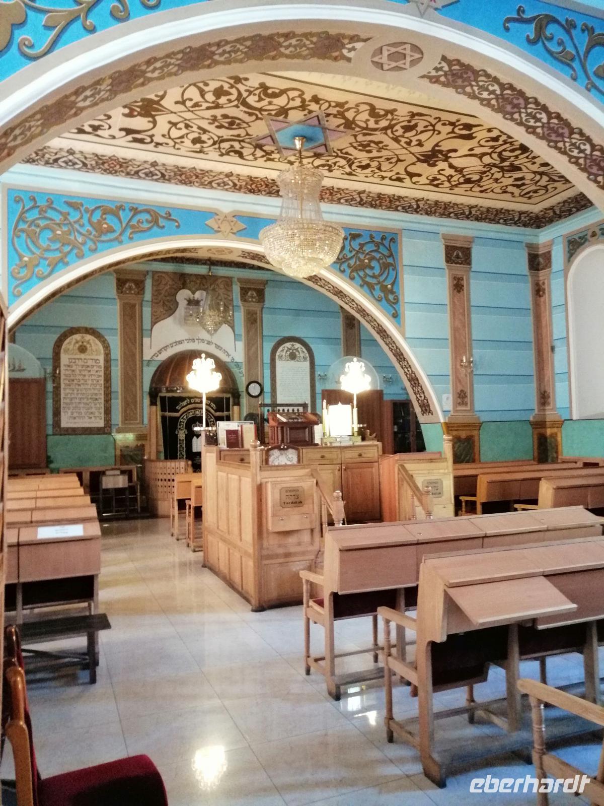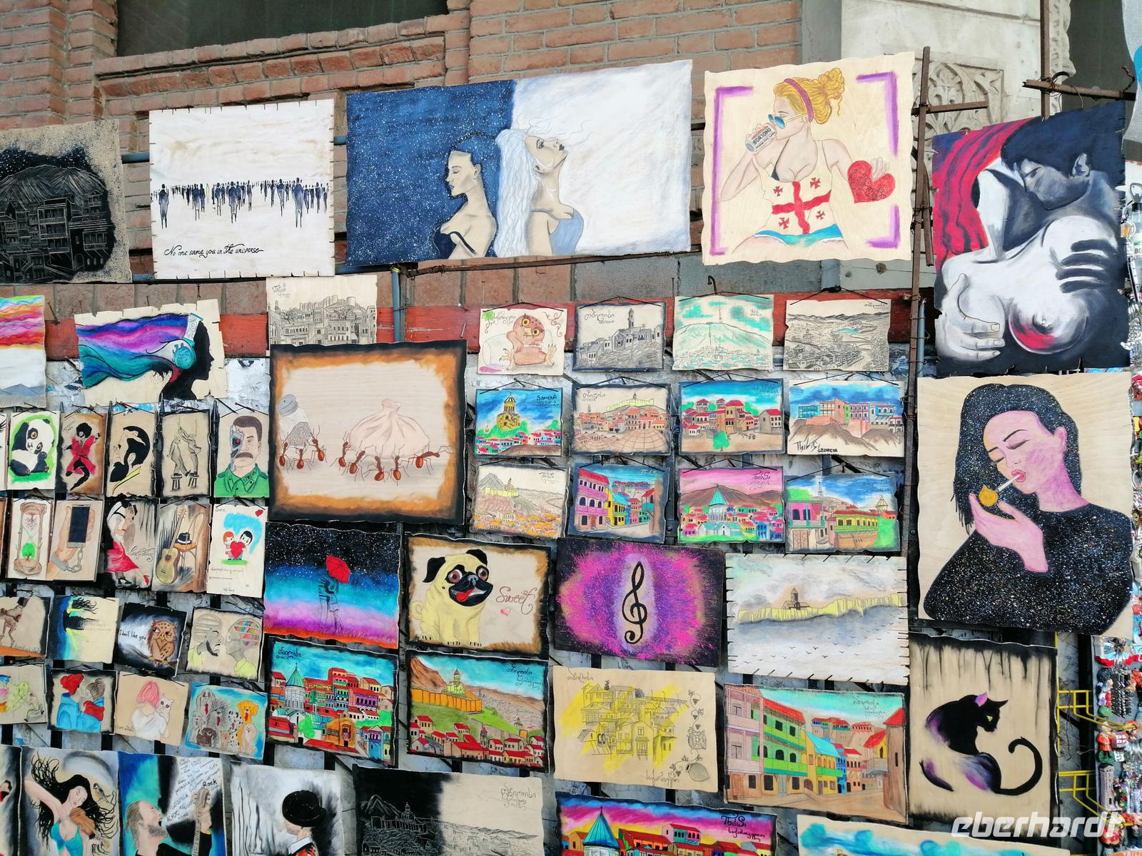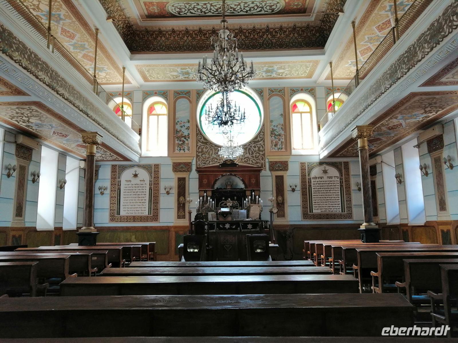 Nun ging es durch die schmalen Gassen der Altstadt, zur Tamada-Skulptur, Karawan-Saraj-Zentrum (Ausstellungszentrum mit Souvenirs-Verkauf) und zur Synagoge. Wir durften sogar in die Synagoge rein und schauten uns mit Interesse die beiden Stockwerke an. Anschließend besuchten wir die Sioni-Kirche aus dem 6. Jh. Ihren Namen hat die Kirche vom Berg Sion (Zion) in Jerusalem. Wir bummelten durch das traditionsreichste und älteste Viertel von Tbilisi mit vielen ausgestellten Bildern und traditionellen georgischen Souveniers bis zum Marionetten-Theater von Reso Gabriadze, dem georgischen Meister des Puppentheaters und bekannten Künstler.
