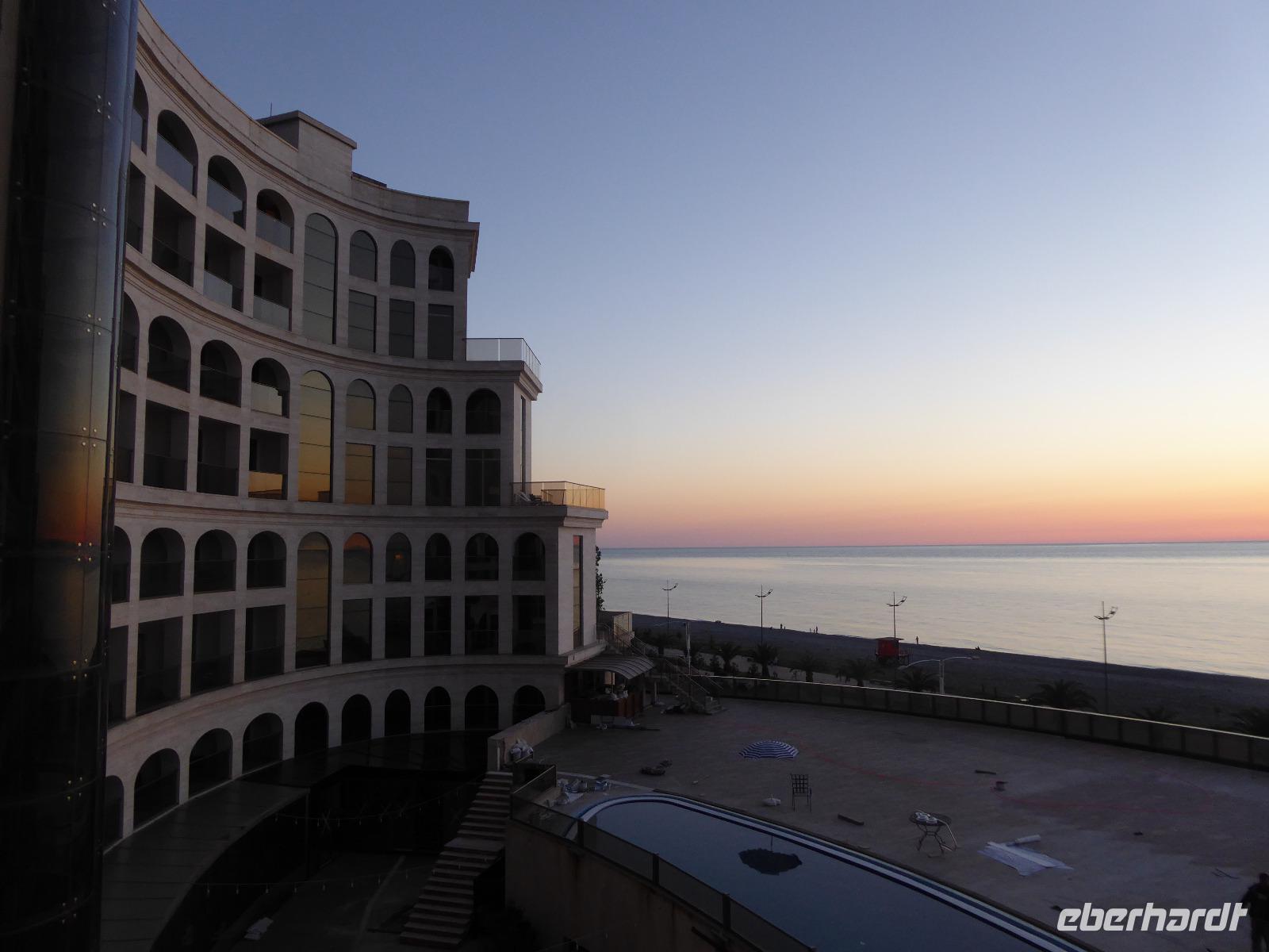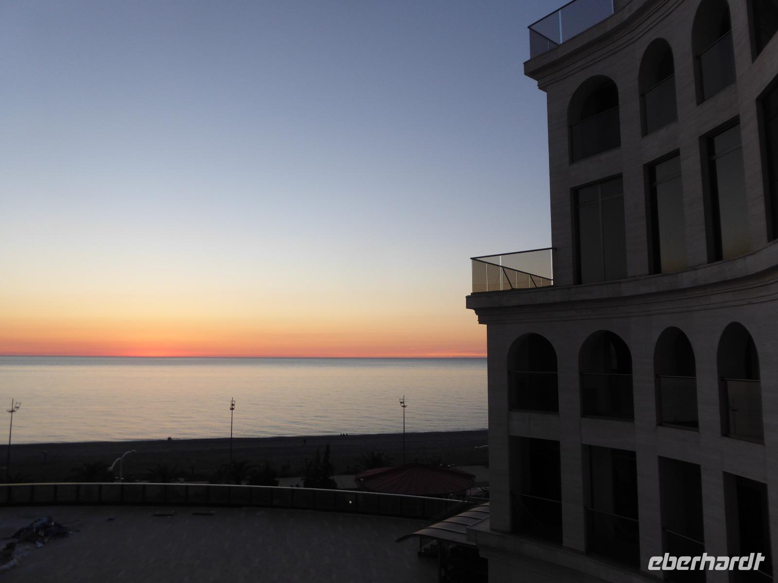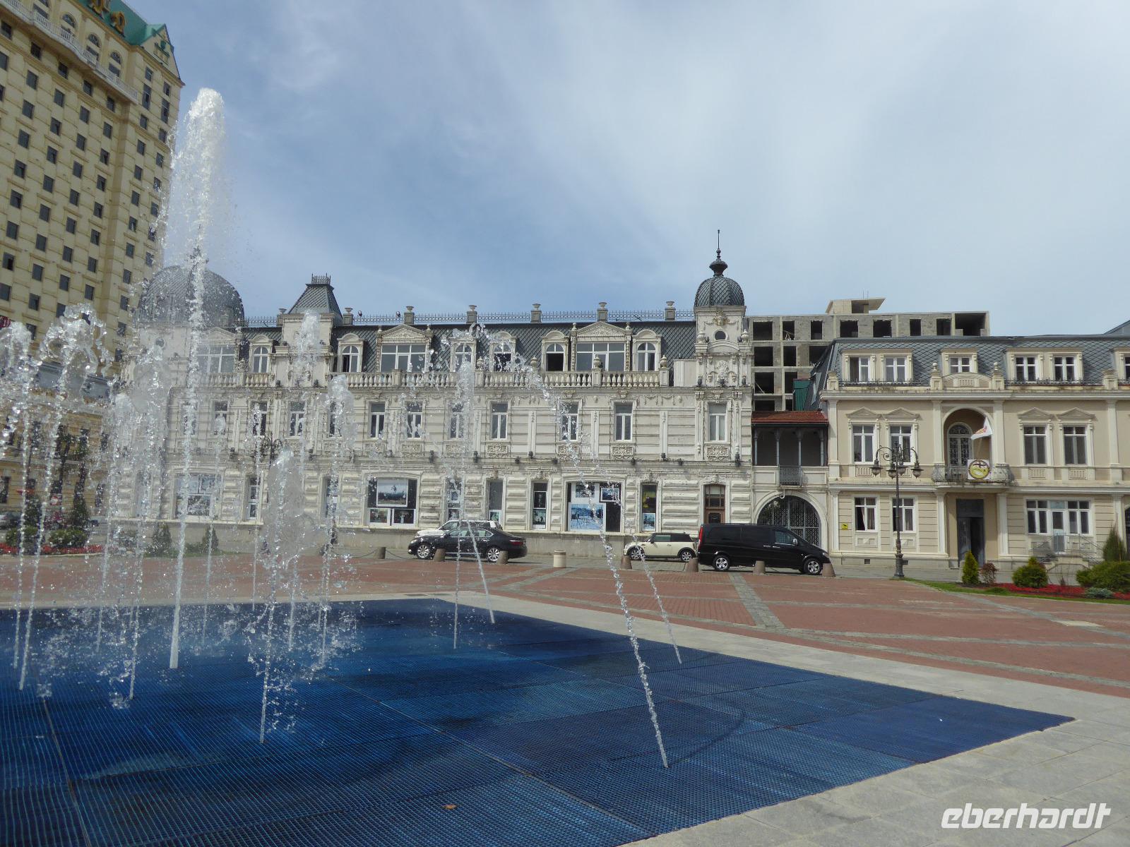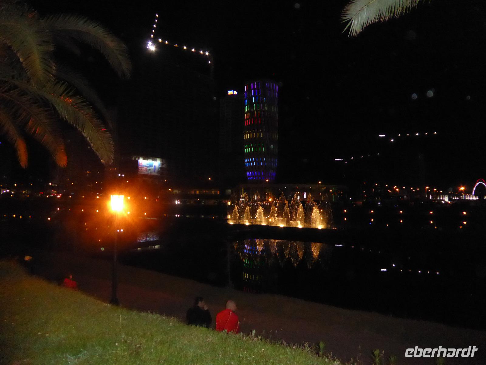 Die Flugzeiten sind freundlich. Am späten Vormittag fliegen wir von Berlin, Leipzig und Stuttgart nach Istanbul (Flugzeit: 2 Stunden 50 Minuten). Dort treffen wir uns am Abfluggate nach Batumi. Nochmal knapp zwei Stunden Flug und wir landen bei schönstem Sonnenschein und blauem Himmel in Georgien. Schade, dass mein Koffer nicht ankommt. Nachdem alles protokolliert ist, steigen wir mit Natia, unserer örtlichen Reiseleiterin, in unseren Bus und fahren ins Hotel Colosseum Marina. Die Rezeptionisten sind ein wenig durcheinander, was daran liegt, dass Paare nicht immer den gleichen Familiennamen haben und sie deshalb irgendwie die Zimmer nicht richtig zu sortieren können. Aber auch das ist irgendwann geklärt. Zweimal fällt währenddessen der Strom aus, so dass wir zum Restaurant in der zweiten Etage lieber die Treppe nehmen. Leider erwischen wir das falsche Treppenhaus, hier ist die Tür zum Restaurant zu. Also, hoch in die dritte Etage, den ganzen Flur entlang und wieder eine Etage tiefer. Im Restaurant erwartet uns ein leckeres Buffet. Es gibt verschiedene Salate, saure Gurken und eingelegtes Gemüse, mehrere warme Speisen, zum Beispiel den ersten Chachapuri, Fisch, Reis und zum Nachtisch Obst oder Kuchen. Nach dem Abendessen beschließen wir, einen Spaziergang zu unternehmen. Eine halbe Stunde flanieren wir die Strandpromenade entlang und erhalten einen ersten Eindruck von Batumi. Die Promenade ist gut in Schuss. Es gibt einen Weg für Fußgänger und einen für Radfahrer. Wir kommen am bunt illuminierten Justizpalast vorbei und erfreuen uns an den tanzenden Fontänen im Ardagan-See. Gegenüber von Meer, Steinstrand und Strandpromenade wachsen riesige Häusertürme in den Himmel. Die Luft ist lau und riecht nach Meer. Ein gelungener Auftakt für eine spannende Reise.