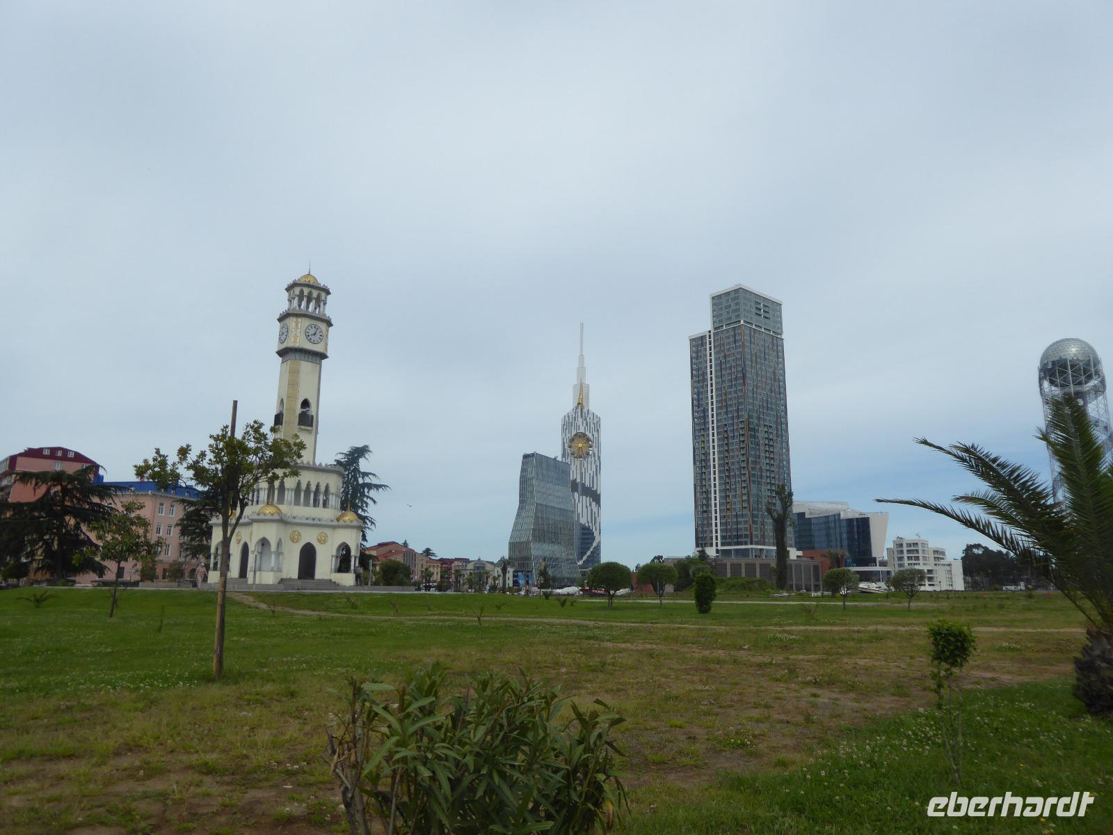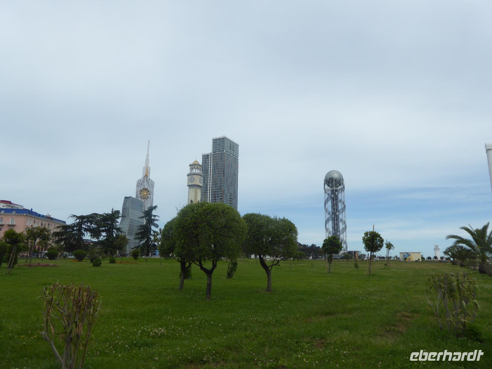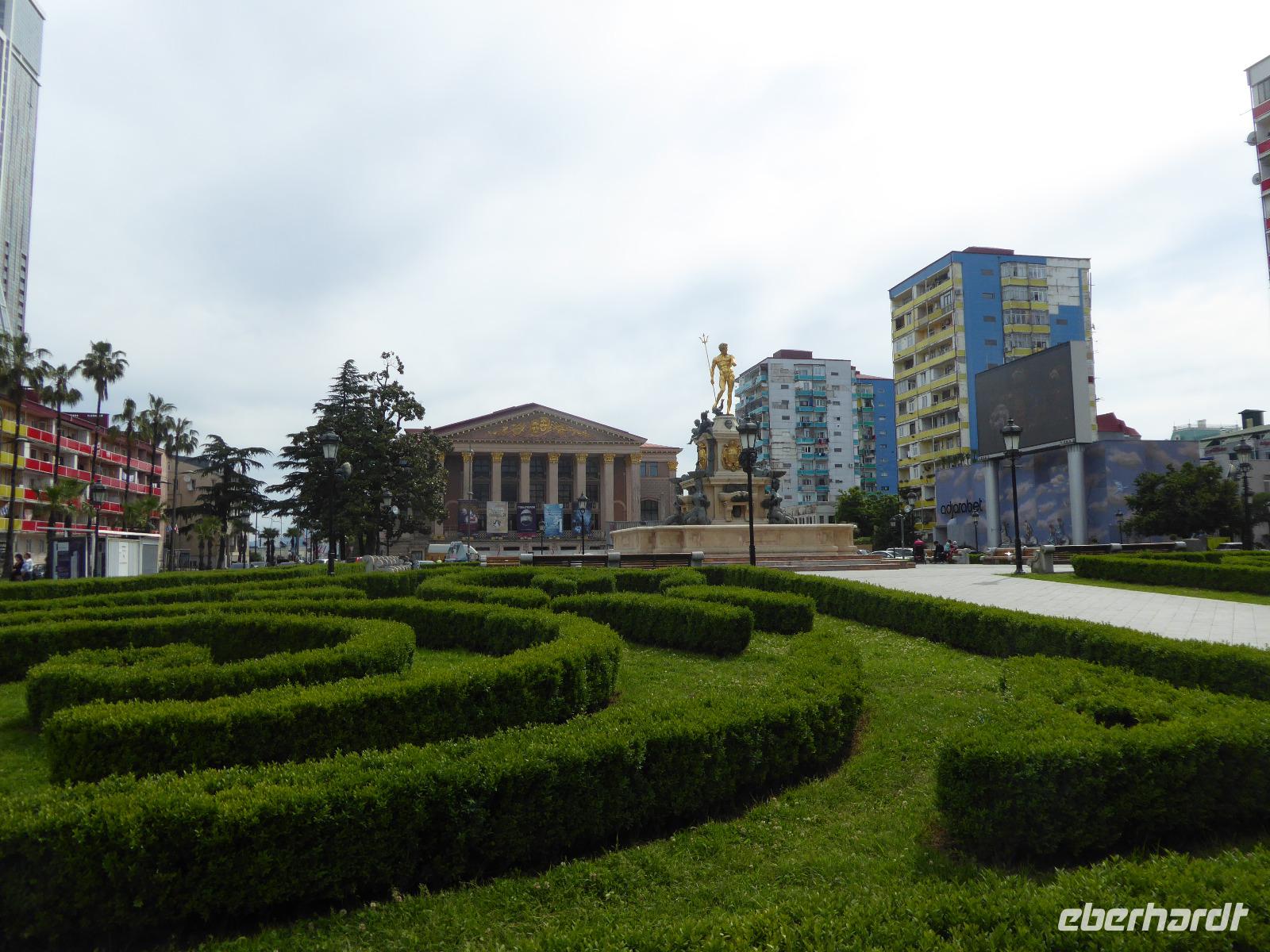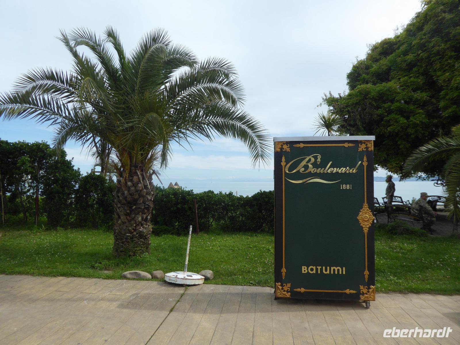 Die Flugzeiten sind freundlich. Am späten Vormittag fliegen wir von Berlin, Leipzig und Stuttgart nach Istanbul (Flugzeit: 2 Stunden 50 Minuten). Dort treffen wir uns am Abfluggate nach Batumi. Nochmal knapp zwei Stunden Flug und wir landen bei schönstem Sonnenschein und blauem Himmel in Georgien. Schade, dass mein Koffer nicht ankommt. Nachdem alles protokolliert ist, steigen wir mit Natia, unserer örtlichen Reiseleiterin, in unseren Bus und fahren ins Hotel Colosseum Marina. Die Rezeptionisten sind ein wenig durcheinander, was daran liegt, dass Paare nicht immer den gleichen Familiennamen haben und sie deshalb irgendwie die Zimmer nicht richtig zu sortieren können. Aber auch das ist irgendwann geklärt. Zweimal fällt währenddessen der Strom aus, so dass wir zum Restaurant in der zweiten Etage lieber die Treppe nehmen. Leider erwischen wir das falsche Treppenhaus, hier ist die Tür zum Restaurant zu. Also, hoch in die dritte Etage, den ganzen Flur entlang und wieder eine Etage tiefer. Im Restaurant erwartet uns ein leckeres Buffet. Es gibt verschiedene Salate, saure Gurken und eingelegtes Gemüse, mehrere warme Speisen, zum Beispiel den ersten Chachapuri, Fisch, Reis und zum Nachtisch Obst oder Kuchen. Nach dem Abendessen beschließen wir, einen Spaziergang zu unternehmen. Eine halbe Stunde flanieren wir die Strandpromenade entlang und erhalten einen ersten Eindruck von Batumi. Die Promenade ist gut in Schuss. Es gibt einen Weg für Fußgänger und einen für Radfahrer. Wir kommen am bunt illuminierten Justizpalast vorbei und erfreuen uns an den tanzenden Fontänen im Ardagan-See. Gegenüber von Meer, Steinstrand und Strandpromenade wachsen riesige Häusertürme in den Himmel. Die Luft ist lau und riecht nach Meer. Ein gelungener Auftakt für eine spannende Reise.
