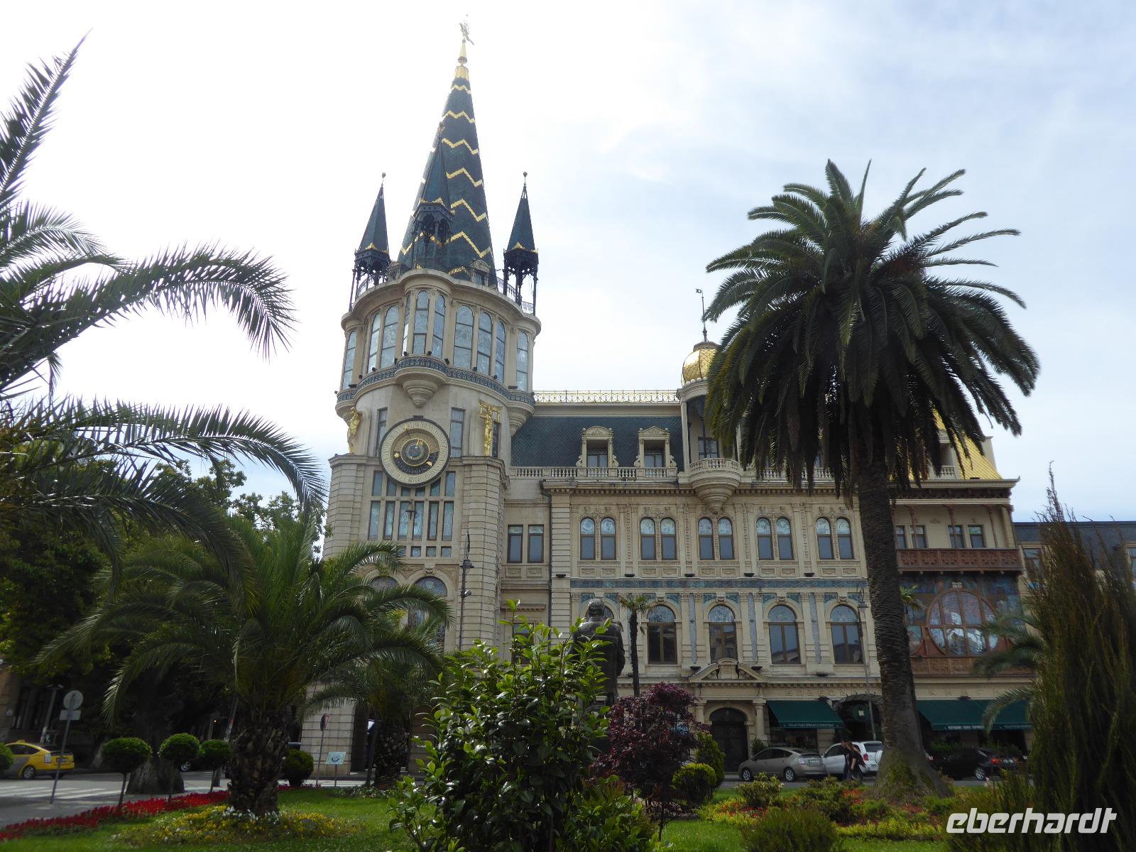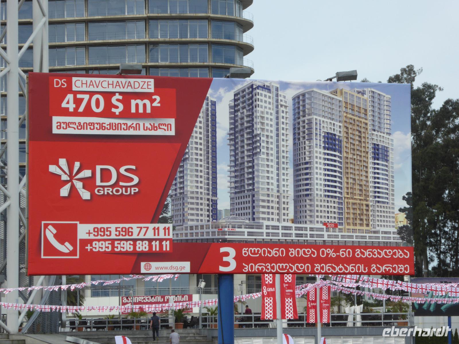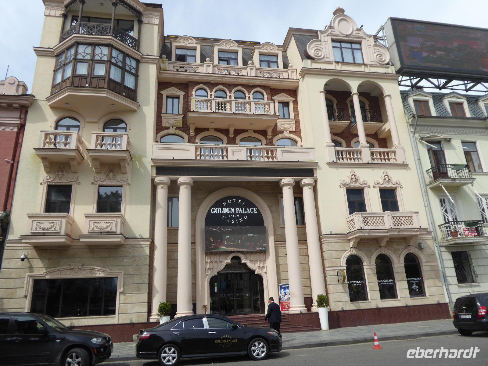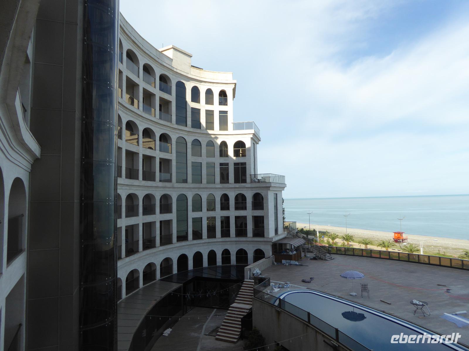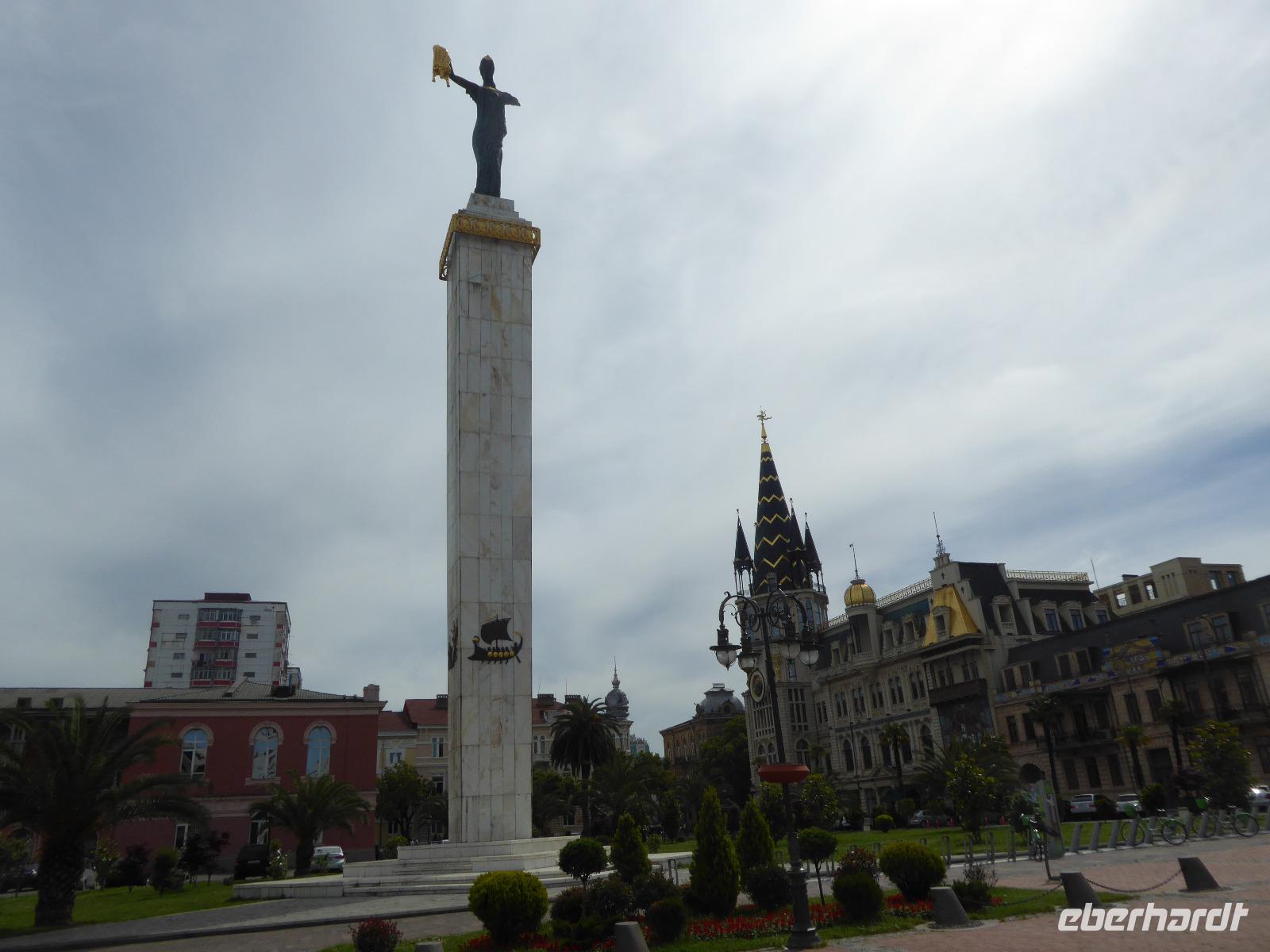 Die Flugzeiten sind freundlich. Am späten Vormittag fliegen wir von Berlin, Leipzig und Stuttgart nach Istanbul (Flugzeit: 2 Stunden 50 Minuten). Dort treffen wir uns am Abfluggate nach Batumi. Nochmal knapp zwei Stunden Flug und wir landen bei schönstem Sonnenschein und blauem Himmel in Georgien. Schade, dass mein Koffer nicht ankommt. Nachdem alles protokolliert ist, steigen wir mit Natia, unserer örtlichen Reiseleiterin, in unseren Bus und fahren ins Hotel Colosseum Marina. Die Rezeptionisten sind ein wenig durcheinander, was daran liegt, dass Paare nicht immer den gleichen Familiennamen haben und sie deshalb irgendwie die Zimmer nicht richtig zu sortieren können. Aber auch das ist irgendwann geklärt. Zweimal fällt währenddessen der Strom aus, so dass wir zum Restaurant in der zweiten Etage lieber die Treppe nehmen. Leider erwischen wir das falsche Treppenhaus, hier ist die Tür zum Restaurant zu. Also, hoch in die dritte Etage, den ganzen Flur entlang und wieder eine Etage tiefer. Im Restaurant erwartet uns ein leckeres Buffet. Es gibt verschiedene Salate, saure Gurken und eingelegtes Gemüse, mehrere warme Speisen, zum Beispiel den ersten Chachapuri, Fisch, Reis und zum Nachtisch Obst oder Kuchen. Nach dem Abendessen beschließen wir, einen Spaziergang zu unternehmen. Eine halbe Stunde flanieren wir die Strandpromenade entlang und erhalten einen ersten Eindruck von Batumi. Die Promenade ist gut in Schuss. Es gibt einen Weg für Fußgänger und einen für Radfahrer. Wir kommen am bunt illuminierten Justizpalast vorbei und erfreuen uns an den tanzenden Fontänen im Ardagan-See. Gegenüber von Meer, Steinstrand und Strandpromenade wachsen riesige Häusertürme in den Himmel. Die Luft ist lau und riecht nach Meer. Ein gelungener Auftakt für eine spannende Reise.