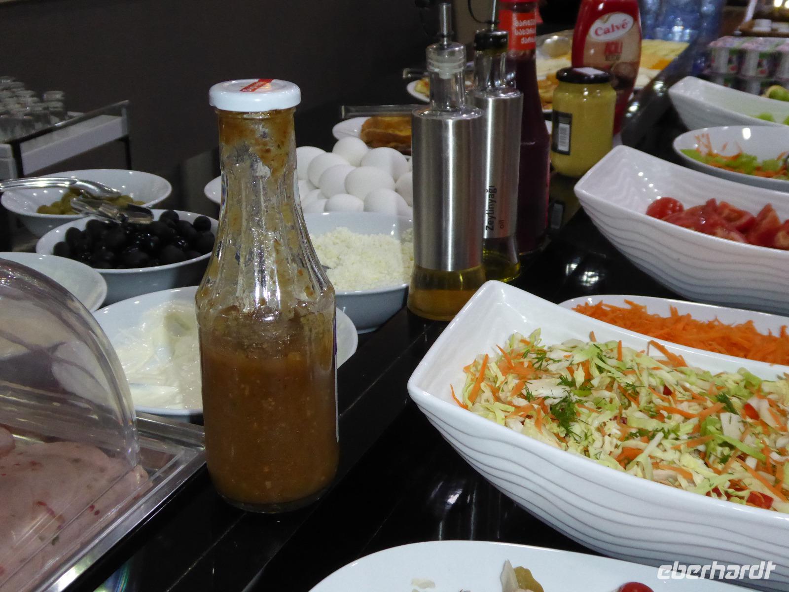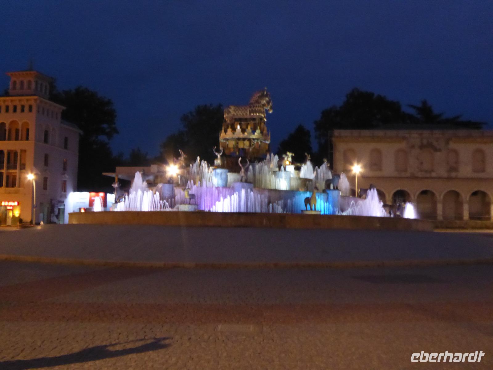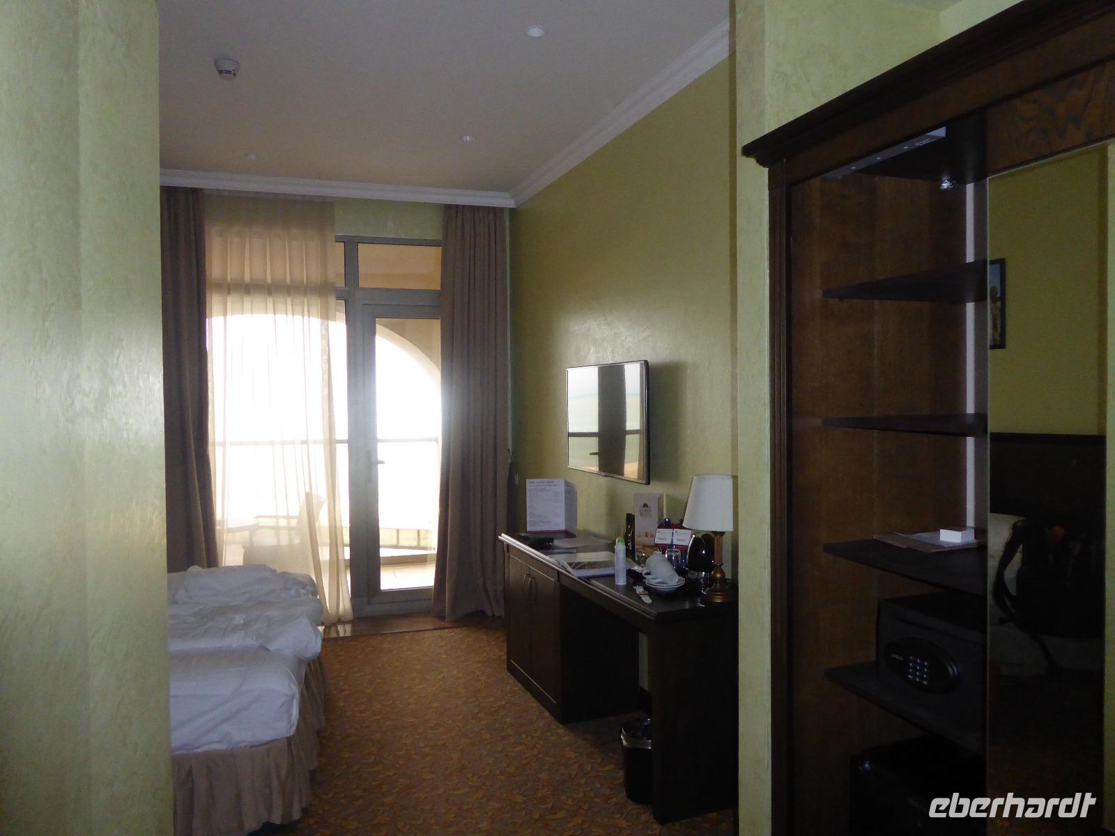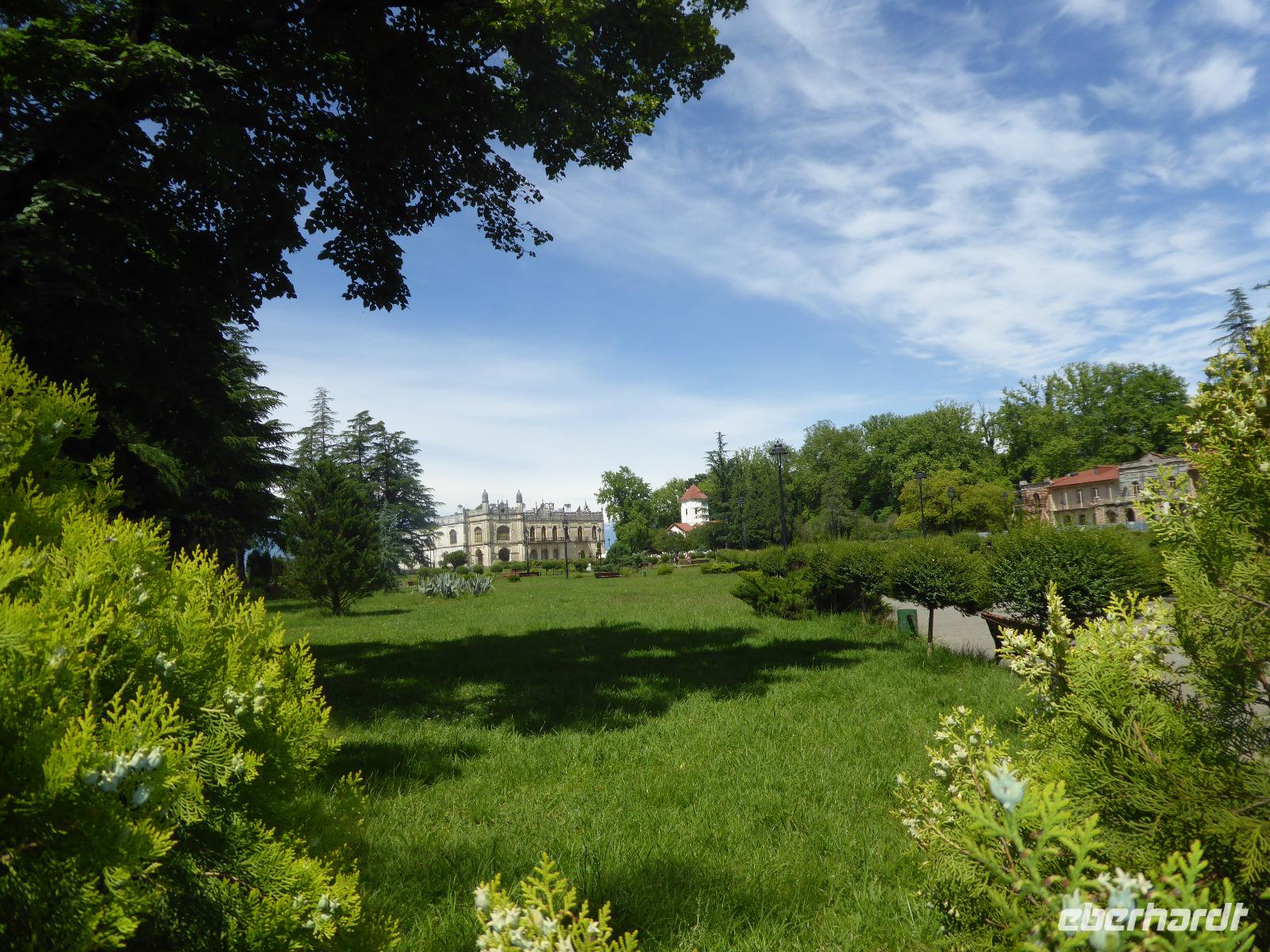 Die Flugzeiten sind freundlich. Am späten Vormittag fliegen wir von Berlin, Leipzig und Stuttgart nach Istanbul (Flugzeit: 2 Stunden 50 Minuten). Dort treffen wir uns am Abfluggate nach Batumi. Nochmal knapp zwei Stunden Flug und wir landen bei schönstem Sonnenschein und blauem Himmel in Georgien. Schade, dass mein Koffer nicht ankommt. Nachdem alles protokolliert ist, steigen wir mit Natia, unserer örtlichen Reiseleiterin, in unseren Bus und fahren ins Hotel Colosseum Marina. Die Rezeptionisten sind ein wenig durcheinander, was daran liegt, dass Paare nicht immer den gleichen Familiennamen haben und sie deshalb irgendwie die Zimmer nicht richtig zu sortieren können. Aber auch das ist irgendwann geklärt. Zweimal fällt währenddessen der Strom aus, so dass wir zum Restaurant in der zweiten Etage lieber die Treppe nehmen. Leider erwischen wir das falsche Treppenhaus, hier ist die Tür zum Restaurant zu. Also, hoch in die dritte Etage, den ganzen Flur entlang und wieder eine Etage tiefer. Im Restaurant erwartet uns ein leckeres Buffet. Es gibt verschiedene Salate, saure Gurken und eingelegtes Gemüse, mehrere warme Speisen, zum Beispiel den ersten Chachapuri, Fisch, Reis und zum Nachtisch Obst oder Kuchen. Nach dem Abendessen beschließen wir, einen Spaziergang zu unternehmen. Eine halbe Stunde flanieren wir die Strandpromenade entlang und erhalten einen ersten Eindruck von Batumi. Die Promenade ist gut in Schuss. Es gibt einen Weg für Fußgänger und einen für Radfahrer. Wir kommen am bunt illuminierten Justizpalast vorbei und erfreuen uns an den tanzenden Fontänen im Ardagan-See. Gegenüber von Meer, Steinstrand und Strandpromenade wachsen riesige Häusertürme in den Himmel. Die Luft ist lau und riecht nach Meer. Ein gelungener Auftakt für eine spannende Reise.