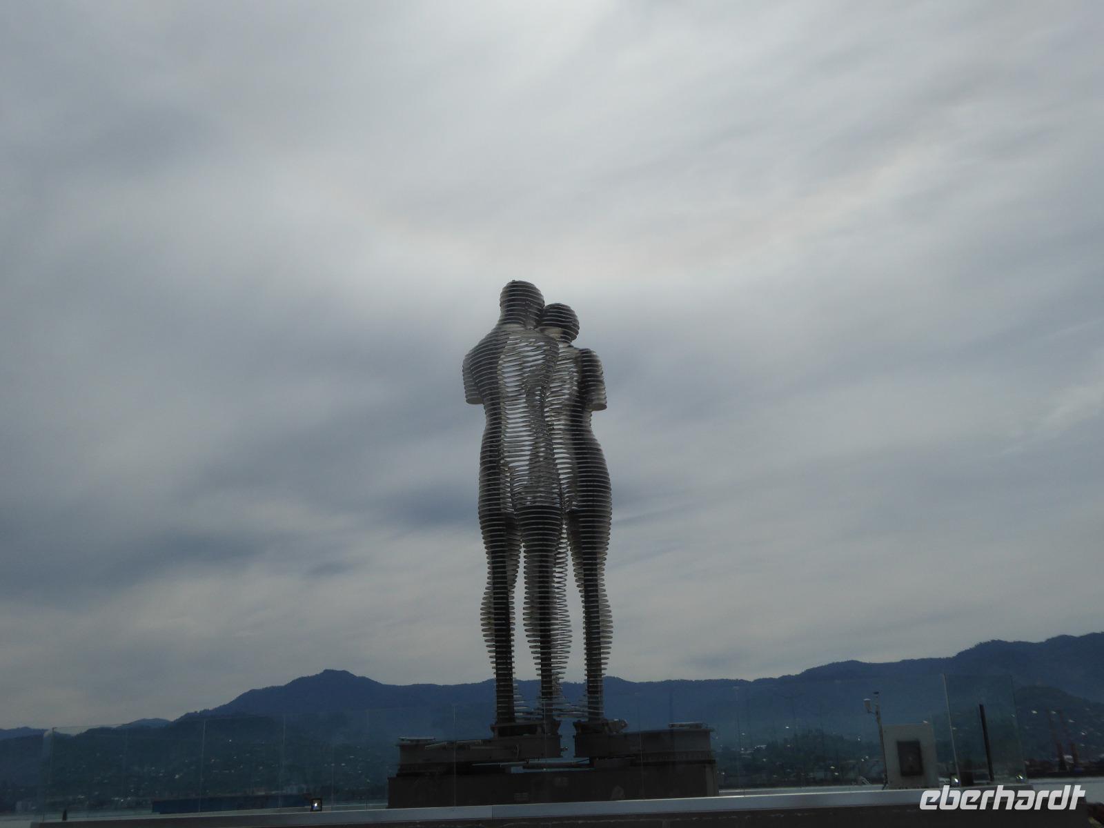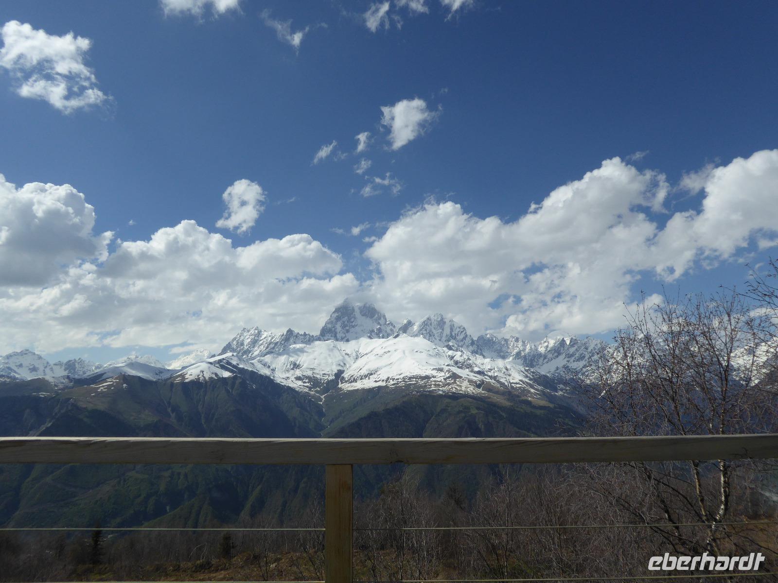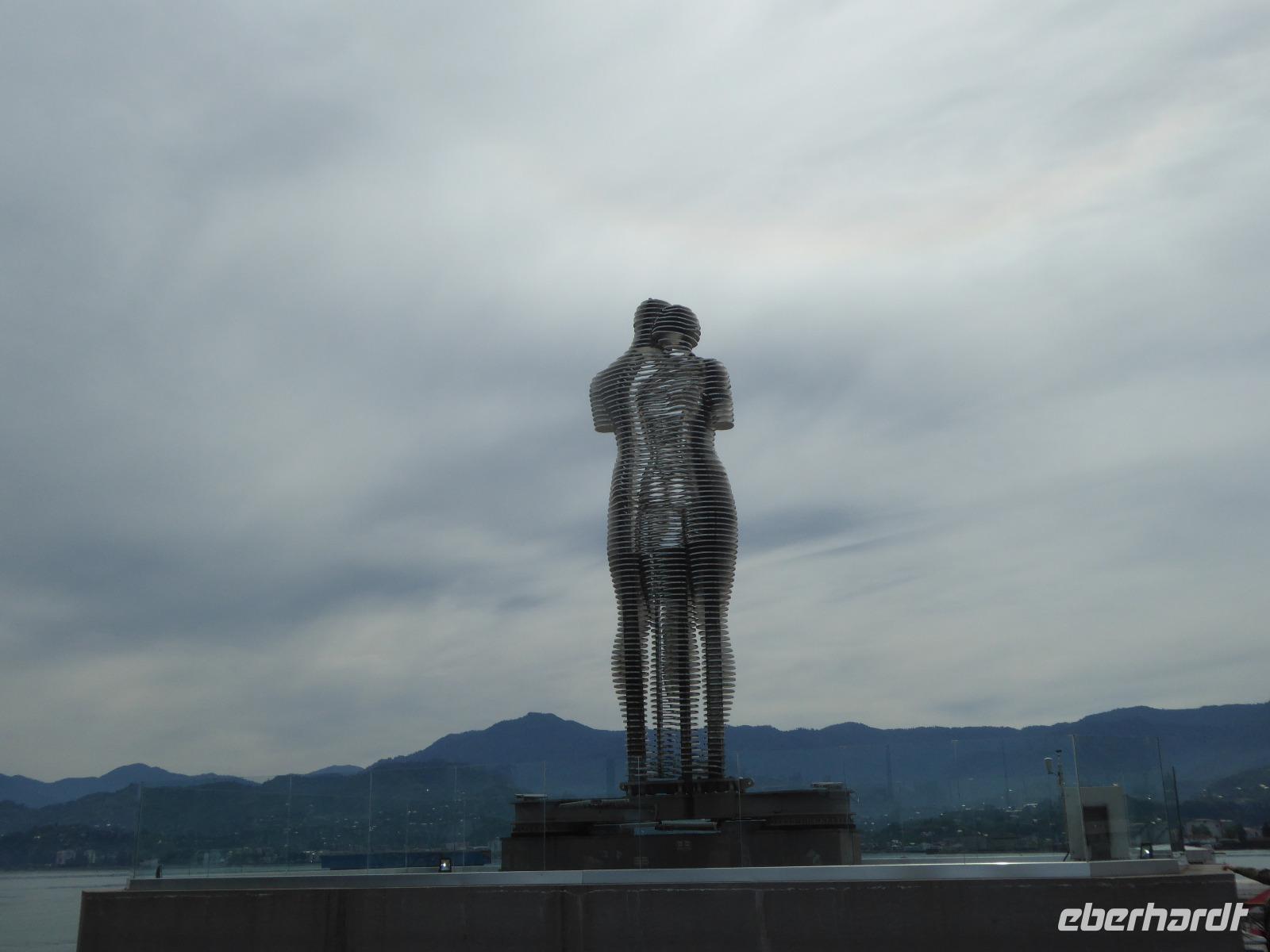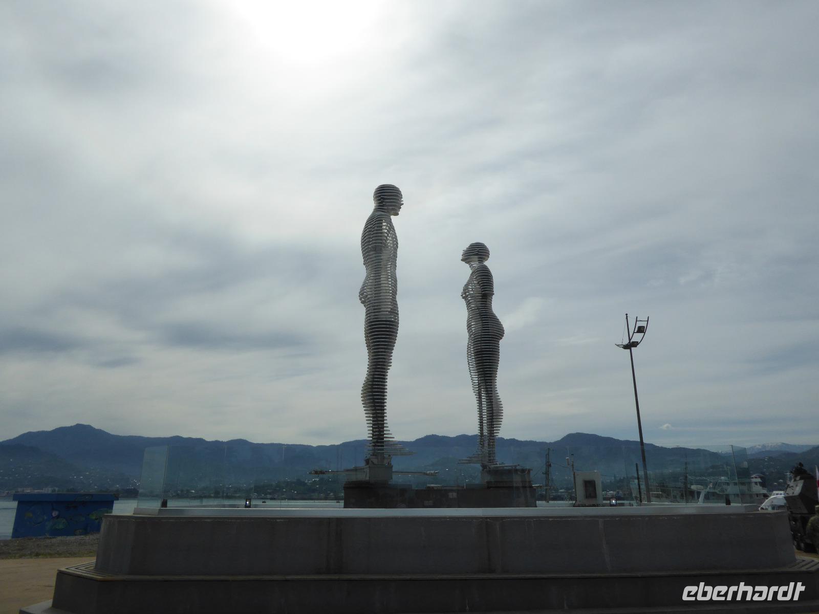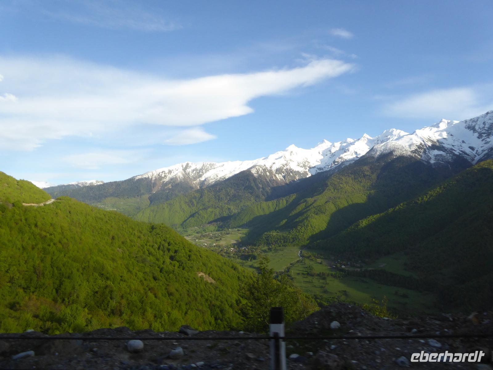 Der Tag beginnt mit einem Blick aufs Schwarze Meer. Die Sonne scheint. Nach dem Frühstück fahren wir ins Zentrum von Batumi. Heute ist der Nationalfeiertag der Georgier, an dem sie ihre Unabhängigkeit feiern. Dafür haben sie ihre Panzer und Militärfahrzeuge aufgebaut. Wir betrachten dies skeptisch. Interessant für uns sind die Figuren von Ali und Nino, die sich, als wir kommen, den Rücken zudrehen. Was ist geschehen? Gab es einen Streit? Aber nur Minuten später, sind sie, dank einer ausgefeilten Mechanik, einander wiederzugewandt, küssen sich und verschmelzen ineinander. Ali und Nino sind die Hautpersonen einer Liebesgeschichte zwischen einer georgischen Christin und einem aserbaidschanischen Moslem. Wir spazieren durch die Altstadt Batumis. Staunend betrachten wir den Gegensatz zwischen den riesigen hoch gebauten Hotels und teilweise nicht mal genutzten anderen Hochhäusern, wie die Universität, und dem, was vom alten Batumi noch übrig ist. Das sind zum Teil recht verfallene Wohnblöcke oder Hinterhöfe, auf denen es noch zugeht wie annodunnemals. Dennoch ist die Stadt bezaubernd. Du gehst an einer uralten Häuserzeile entlang und plötzlich: BÄM! Ein großes gläsernes Schaufenster mit supermoderner Reklame für Mode oder Frisur oder ähnliches. Völlig unpassend, aber eben doch gegenwärtig. Wir besuchen die Kirche des Heiligen Nikolaus und anschließend den Maidan-Platz. Hier befindet sich die Statue der Medea, die in ihren Händen das Goldenen Vlies hält. Bewundernswert ist auch das Eckgebäude am Platz mit einer großen astronomischen Uhr. Wir schlendern über die Piazza Moedani, bevor wir wieder zum Bus kommen und Richtung Zugdidi aufbrechen. Gegen 14 Uhr kommen wir dort an. Natia sucht uns eine kleine Imbiss-Stube, wo wir Chachapuri und Getränke verköstigen. Anschließend besuchen wir den Dadiani- Fürstenpalast. Wir weißen zwar nicht warum, aber alles ist aus Frankreich und schön verschmuckt :-), wisst Ihr noch? Ab hier sind es noch 136 Kilometer bis Mestia, aber nur eine halbe Stunde bis zum Enguri-Staudamm, wo wir zu einem Fotostopp halten. Die Staumauer ist 750 Meter breit und 271,5 Meter hoch. Sie ist die höchste Bogenstaumauer der Welt und das gewaltigste Bauwerk Georgiens. Weiter geht es durch den großen Kaukasus. Nach jeder Kurve tut sich ein neues prachtvolles Bild auf. Der Schnee glitzert auf den Bergen, die von der Sonne angestrahlt werden. Es ist einfach großartig. An einer Stelle fließen der Enguri und der Chuberi zusammen und bilden den schnellsten Fluss des Kaukasus. Gegen 20 Uhr kommen wir im Zentrum von Mestia an. Schon von Weitem ist Musik zu hören. Wollt Ihr aussteigen? fragt Natia. Na und ob! Auf dem Marktplatz von Mestia ist die Dorfjugend versammelt und feiert ein Rockkonzert. Ein bisschen zu laut für uns, aber naja - so ist das eben. Wenigstens kann ich mir für ein paar lumpige Euro ein (Figur schmeichelndes :-)) T-Shirt, das ich dann doch nicht tragen werde, und andere dringend notwendige Sachen kaufen. Dann verlassen wir schnell diesen, heute überaus lauten, Ort und fahren in unser lauschiges Hotel Banguriani. Da wir zu spät kommen, ist das Essen kalt, trotzdem muss keiner hungern. Und der trockene rote Hauswein, auf den wir eingeladen sind, schmeckt ausgezeichnet :-), da hat sich Eberhardt mal wieder nicht lumpen lassen. Kurz vor dem Schlafen gehen, bekomme ich noch einen Kamm geschenkt und es trifft eine Kleiderspende ein. Danke, Ihr Lieben! Was mit meinem Koffer ist, weiß ich immer noch nicht. Aber, dass den einer nach Svanetien bringt, wage ich doch sehr zu bezweifeln. Schauen wir mal, morgen ist auch noch ein Tag. Gute Nacht!