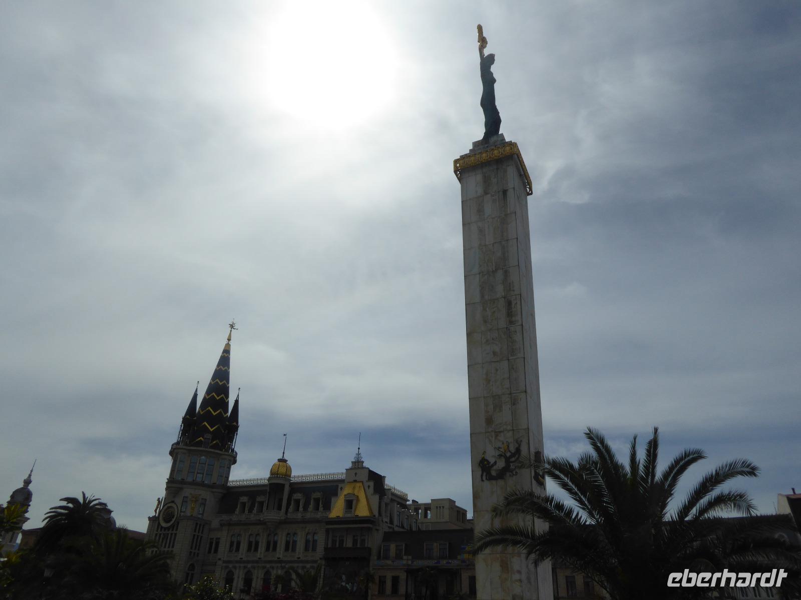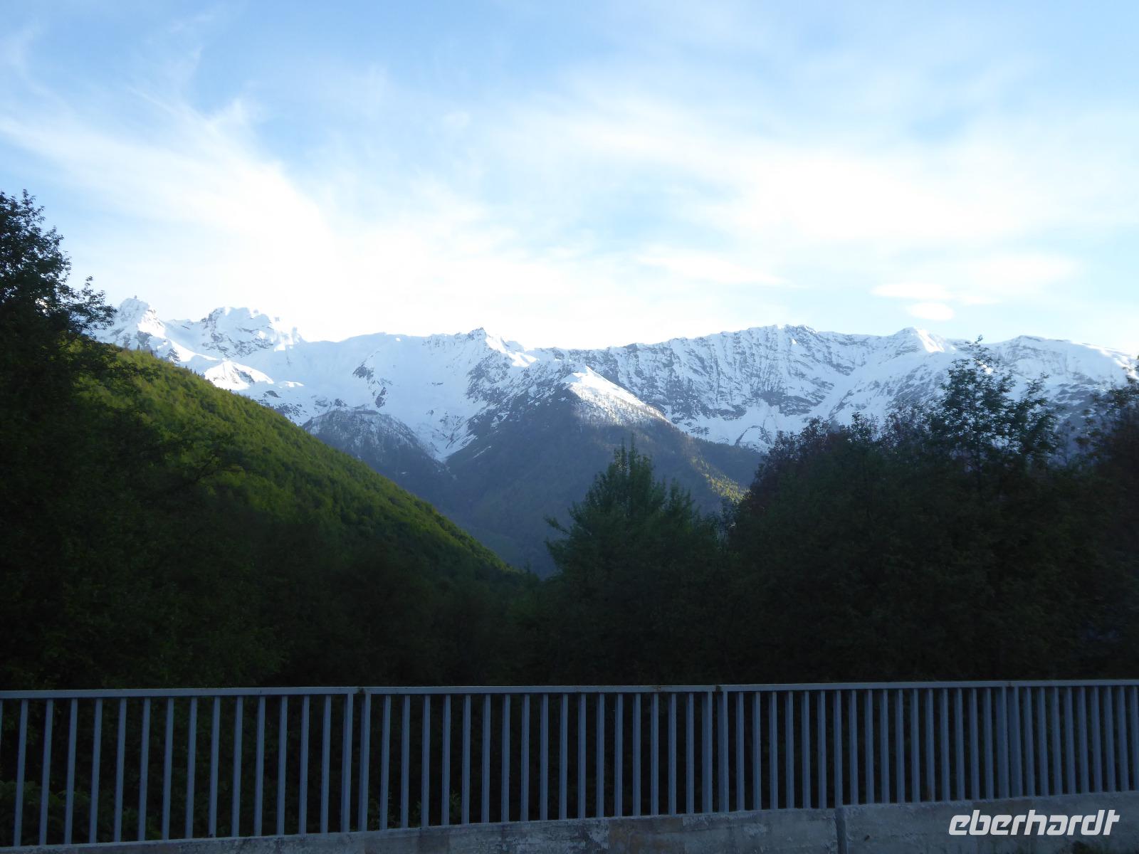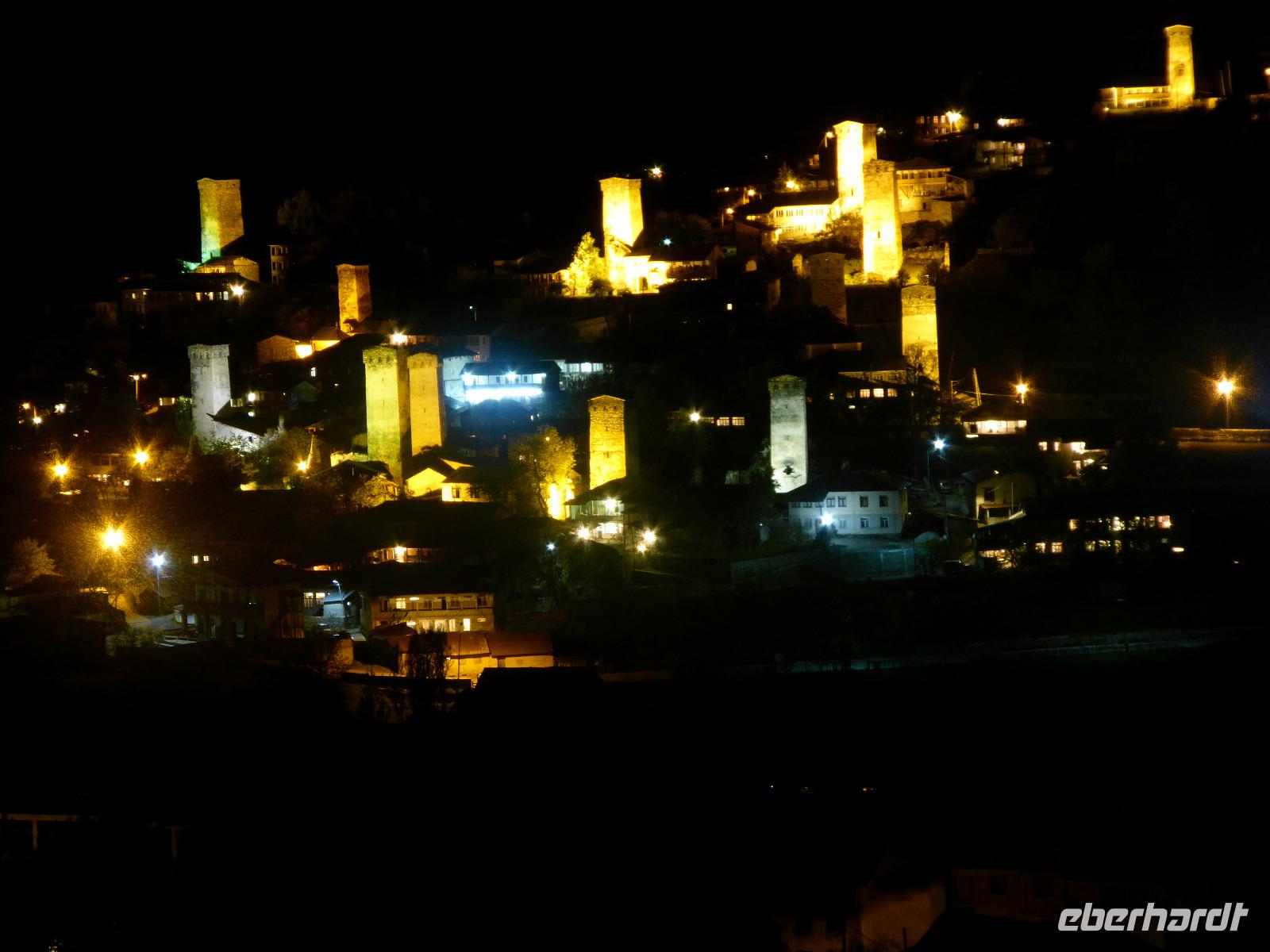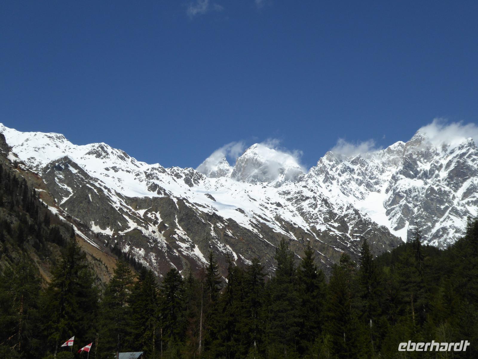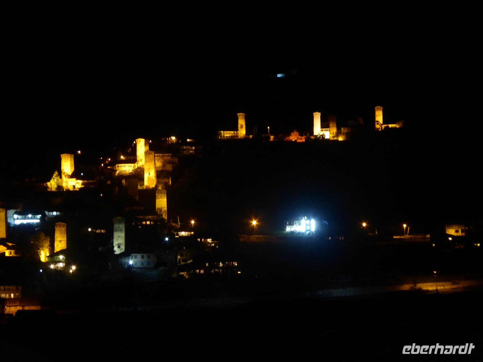 Der Tag beginnt mit einem Blick aufs Schwarze Meer. Die Sonne scheint. Nach dem Frühstück fahren wir ins Zentrum von Batumi. Heute ist der Nationalfeiertag der Georgier, an dem sie ihre Unabhängigkeit feiern. Dafür haben sie ihre Panzer und Militärfahrzeuge aufgebaut. Wir betrachten dies skeptisch. Interessant für uns sind die Figuren von Ali und Nino, die sich, als wir kommen, den Rücken zudrehen. Was ist geschehen? Gab es einen Streit? Aber nur Minuten später, sind sie, dank einer ausgefeilten Mechanik, einander wiederzugewandt, küssen sich und verschmelzen ineinander. Ali und Nino sind die Hautpersonen einer Liebesgeschichte zwischen einer georgischen Christin und einem aserbaidschanischen Moslem. Wir spazieren durch die Altstadt Batumis. Staunend betrachten wir den Gegensatz zwischen den riesigen hoch gebauten Hotels und teilweise nicht mal genutzten anderen Hochhäusern, wie die Universität, und dem, was vom alten Batumi noch übrig ist. Das sind zum Teil recht verfallene Wohnblöcke oder Hinterhöfe, auf denen es noch zugeht wie annodunnemals. Dennoch ist die Stadt bezaubernd. Du gehst an einer uralten Häuserzeile entlang und plötzlich: BÄM! Ein großes gläsernes Schaufenster mit supermoderner Reklame für Mode oder Frisur oder ähnliches. Völlig unpassend, aber eben doch gegenwärtig. Wir besuchen die Kirche des Heiligen Nikolaus und anschließend den Maidan-Platz. Hier befindet sich die Statue der Medea, die in ihren Händen das Goldenen Vlies hält. Bewundernswert ist auch das Eckgebäude am Platz mit einer großen astronomischen Uhr. Wir schlendern über die Piazza Moedani, bevor wir wieder zum Bus kommen und Richtung Zugdidi aufbrechen. Gegen 14 Uhr kommen wir dort an. Natia sucht uns eine kleine Imbiss-Stube, wo wir Chachapuri und Getränke verköstigen. Anschließend besuchen wir den Dadiani- Fürstenpalast. Wir weißen zwar nicht warum, aber alles ist aus Frankreich und schön verschmuckt :-), wisst Ihr noch? Ab hier sind es noch 136 Kilometer bis Mestia, aber nur eine halbe Stunde bis zum Enguri-Staudamm, wo wir zu einem Fotostopp halten. Die Staumauer ist 750 Meter breit und 271,5 Meter hoch. Sie ist die höchste Bogenstaumauer der Welt und das gewaltigste Bauwerk Georgiens. Weiter geht es durch den großen Kaukasus. Nach jeder Kurve tut sich ein neues prachtvolles Bild auf. Der Schnee glitzert auf den Bergen, die von der Sonne angestrahlt werden. Es ist einfach großartig. An einer Stelle fließen der Enguri und der Chuberi zusammen und bilden den schnellsten Fluss des Kaukasus. Gegen 20 Uhr kommen wir im Zentrum von Mestia an. Schon von Weitem ist Musik zu hören. Wollt Ihr aussteigen? fragt Natia. Na und ob! Auf dem Marktplatz von Mestia ist die Dorfjugend versammelt und feiert ein Rockkonzert. Ein bisschen zu laut für uns, aber naja - so ist das eben. Wenigstens kann ich mir für ein paar lumpige Euro ein (Figur schmeichelndes :-)) T-Shirt, das ich dann doch nicht tragen werde, und andere dringend notwendige Sachen kaufen. Dann verlassen wir schnell diesen, heute überaus lauten, Ort und fahren in unser lauschiges Hotel Banguriani. Da wir zu spät kommen, ist das Essen kalt, trotzdem muss keiner hungern. Und der trockene rote Hauswein, auf den wir eingeladen sind, schmeckt ausgezeichnet :-), da hat sich Eberhardt mal wieder nicht lumpen lassen. Kurz vor dem Schlafen gehen, bekomme ich noch einen Kamm geschenkt und es trifft eine Kleiderspende ein. Danke, Ihr Lieben! Was mit meinem Koffer ist, weiß ich immer noch nicht. Aber, dass den einer nach Svanetien bringt, wage ich doch sehr zu bezweifeln. Schauen wir mal, morgen ist auch noch ein Tag. Gute Nacht!