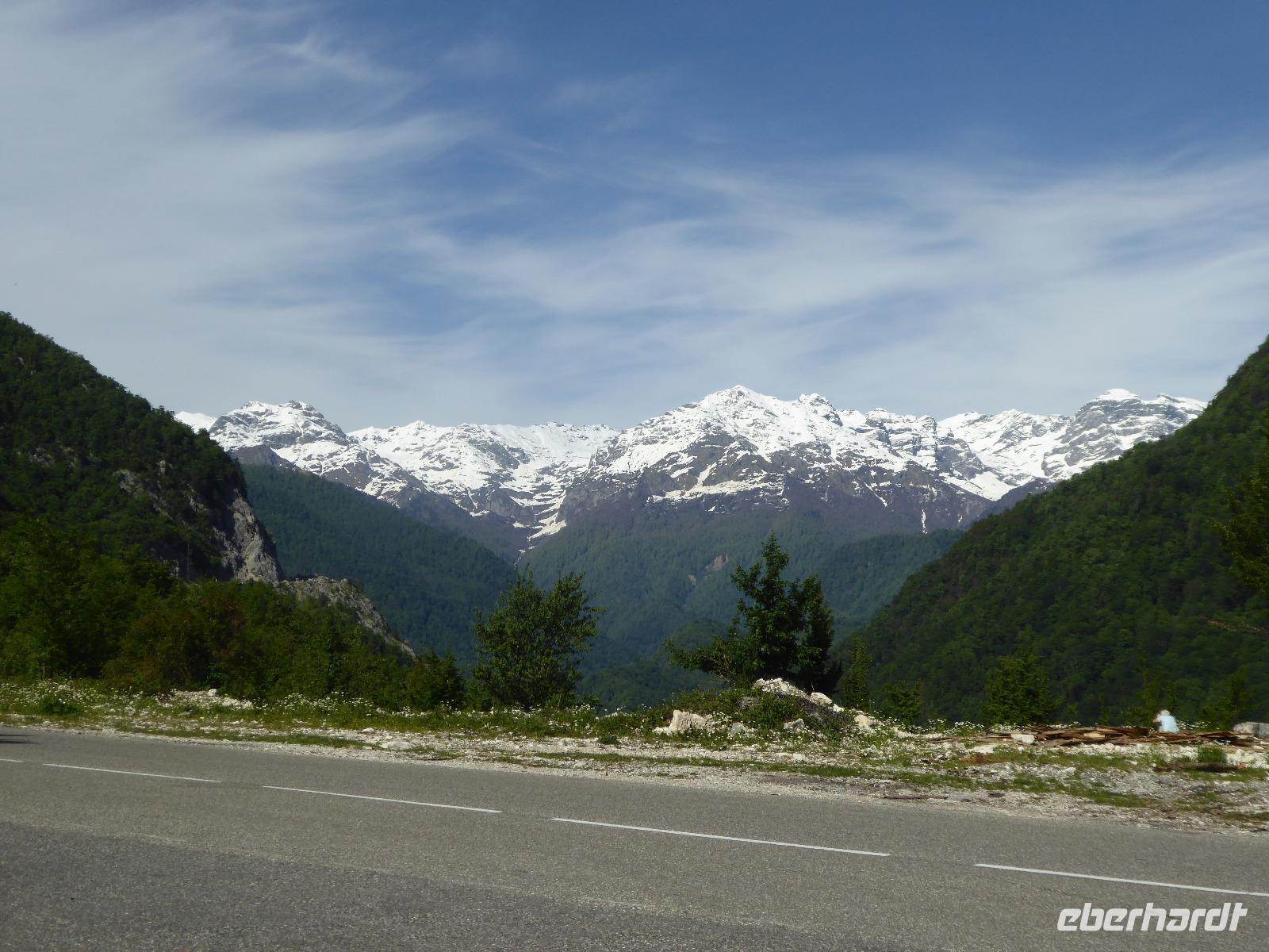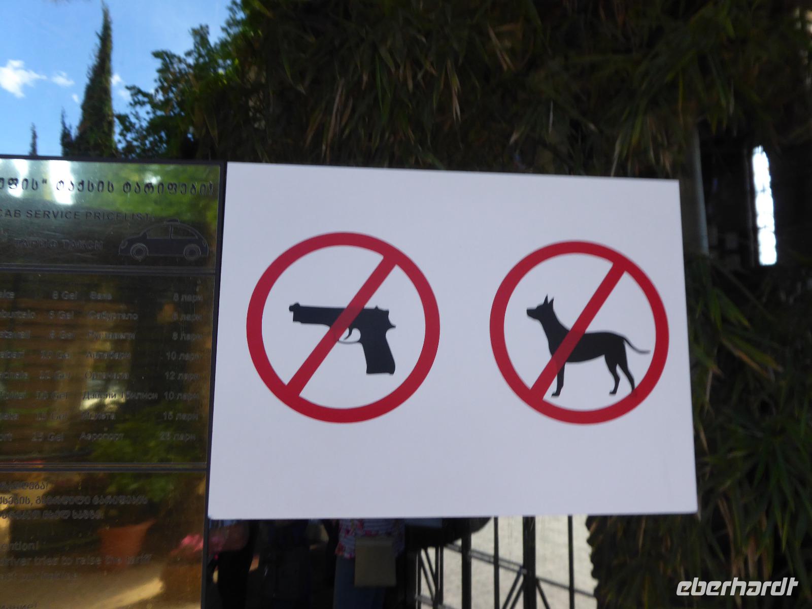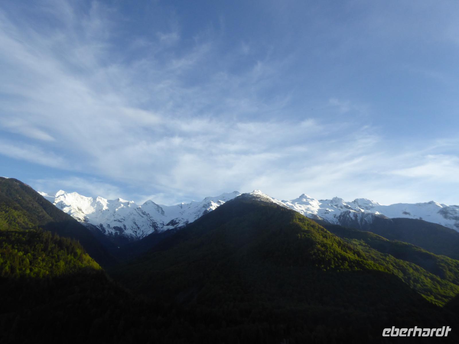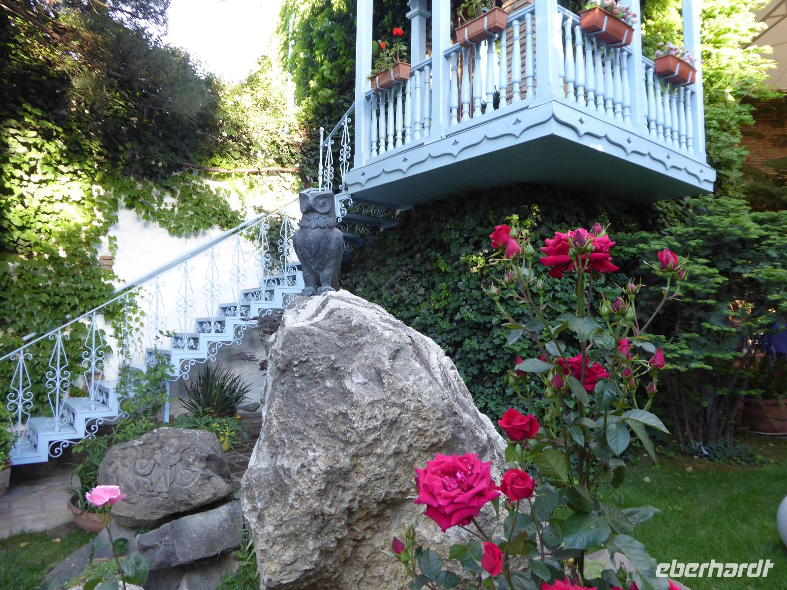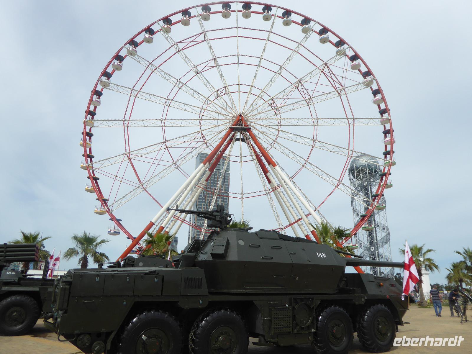 Der Tag beginnt mit einem Blick aufs Schwarze Meer. Die Sonne scheint. Nach dem Frühstück fahren wir ins Zentrum von Batumi. Heute ist der Nationalfeiertag der Georgier, an dem sie ihre Unabhängigkeit feiern. Dafür haben sie ihre Panzer und Militärfahrzeuge aufgebaut. Wir betrachten dies skeptisch. Interessant für uns sind die Figuren von Ali und Nino, die sich, als wir kommen, den Rücken zudrehen. Was ist geschehen? Gab es einen Streit? Aber nur Minuten später, sind sie, dank einer ausgefeilten Mechanik, einander wiederzugewandt, küssen sich und verschmelzen ineinander. Ali und Nino sind die Hautpersonen einer Liebesgeschichte zwischen einer georgischen Christin und einem aserbaidschanischen Moslem. Wir spazieren durch die Altstadt Batumis. Staunend betrachten wir den Gegensatz zwischen den riesigen hoch gebauten Hotels und teilweise nicht mal genutzten anderen Hochhäusern, wie die Universität, und dem, was vom alten Batumi noch übrig ist. Das sind zum Teil recht verfallene Wohnblöcke oder Hinterhöfe, auf denen es noch zugeht wie annodunnemals. Dennoch ist die Stadt bezaubernd. Du gehst an einer uralten Häuserzeile entlang und plötzlich: BÄM! Ein großes gläsernes Schaufenster mit supermoderner Reklame für Mode oder Frisur oder ähnliches. Völlig unpassend, aber eben doch gegenwärtig. Wir besuchen die Kirche des Heiligen Nikolaus und anschließend den Maidan-Platz. Hier befindet sich die Statue der Medea, die in ihren Händen das Goldenen Vlies hält. Bewundernswert ist auch das Eckgebäude am Platz mit einer großen astronomischen Uhr. Wir schlendern über die Piazza Moedani, bevor wir wieder zum Bus kommen und Richtung Zugdidi aufbrechen. Gegen 14 Uhr kommen wir dort an. Natia sucht uns eine kleine Imbiss-Stube, wo wir Chachapuri und Getränke verköstigen. Anschließend besuchen wir den Dadiani- Fürstenpalast. Wir weißen zwar nicht warum, aber alles ist aus Frankreich und schön verschmuckt :-), wisst Ihr noch? Ab hier sind es noch 136 Kilometer bis Mestia, aber nur eine halbe Stunde bis zum Enguri-Staudamm, wo wir zu einem Fotostopp halten. Die Staumauer ist 750 Meter breit und 271,5 Meter hoch. Sie ist die höchste Bogenstaumauer der Welt und das gewaltigste Bauwerk Georgiens. Weiter geht es durch den großen Kaukasus. Nach jeder Kurve tut sich ein neues prachtvolles Bild auf. Der Schnee glitzert auf den Bergen, die von der Sonne angestrahlt werden. Es ist einfach großartig. An einer Stelle fließen der Enguri und der Chuberi zusammen und bilden den schnellsten Fluss des Kaukasus. Gegen 20 Uhr kommen wir im Zentrum von Mestia an. Schon von Weitem ist Musik zu hören. Wollt Ihr aussteigen? fragt Natia. Na und ob! Auf dem Marktplatz von Mestia ist die Dorfjugend versammelt und feiert ein Rockkonzert. Ein bisschen zu laut für uns, aber naja - so ist das eben. Wenigstens kann ich mir für ein paar lumpige Euro ein (Figur schmeichelndes :-)) T-Shirt, das ich dann doch nicht tragen werde, und andere dringend notwendige Sachen kaufen. Dann verlassen wir schnell diesen, heute überaus lauten, Ort und fahren in unser lauschiges Hotel Banguriani. Da wir zu spät kommen, ist das Essen kalt, trotzdem muss keiner hungern. Und der trockene rote Hauswein, auf den wir eingeladen sind, schmeckt ausgezeichnet :-), da hat sich Eberhardt mal wieder nicht lumpen lassen. Kurz vor dem Schlafen gehen, bekomme ich noch einen Kamm geschenkt und es trifft eine Kleiderspende ein. Danke, Ihr Lieben! Was mit meinem Koffer ist, weiß ich immer noch nicht. Aber, dass den einer nach Svanetien bringt, wage ich doch sehr zu bezweifeln. Schauen wir mal, morgen ist auch noch ein Tag. Gute Nacht!