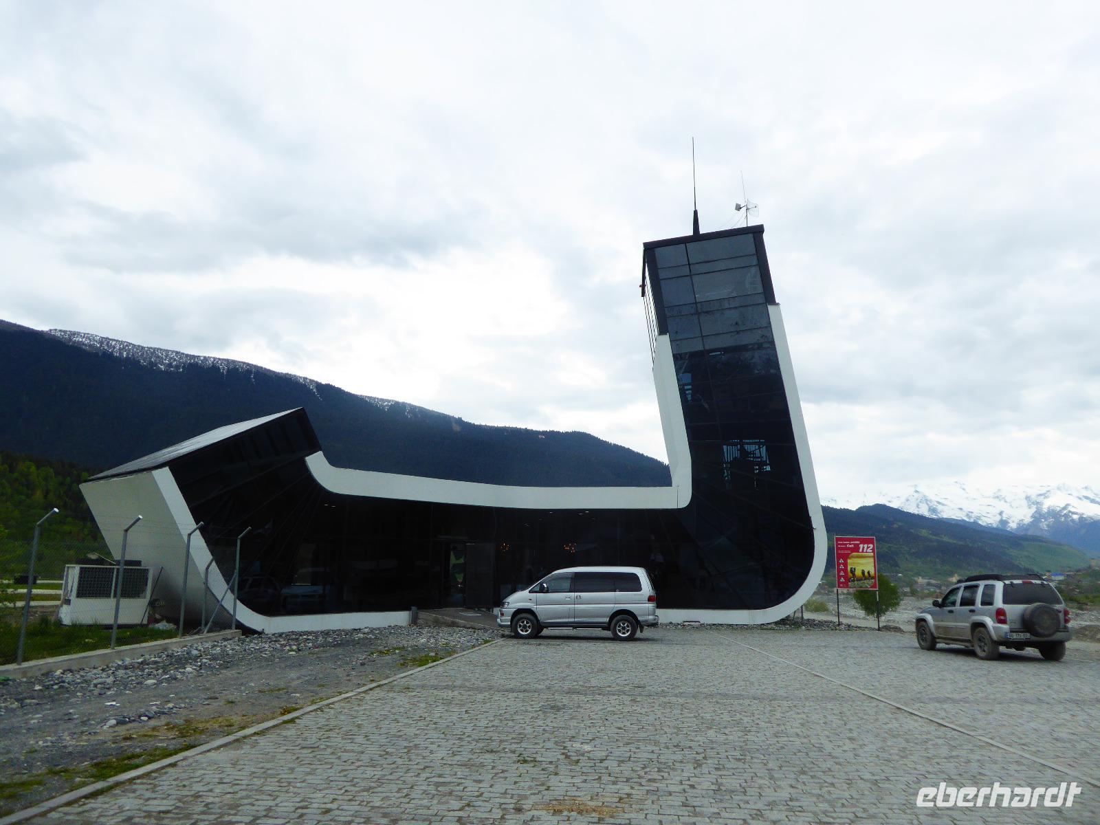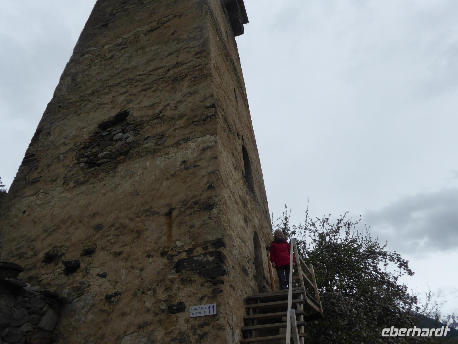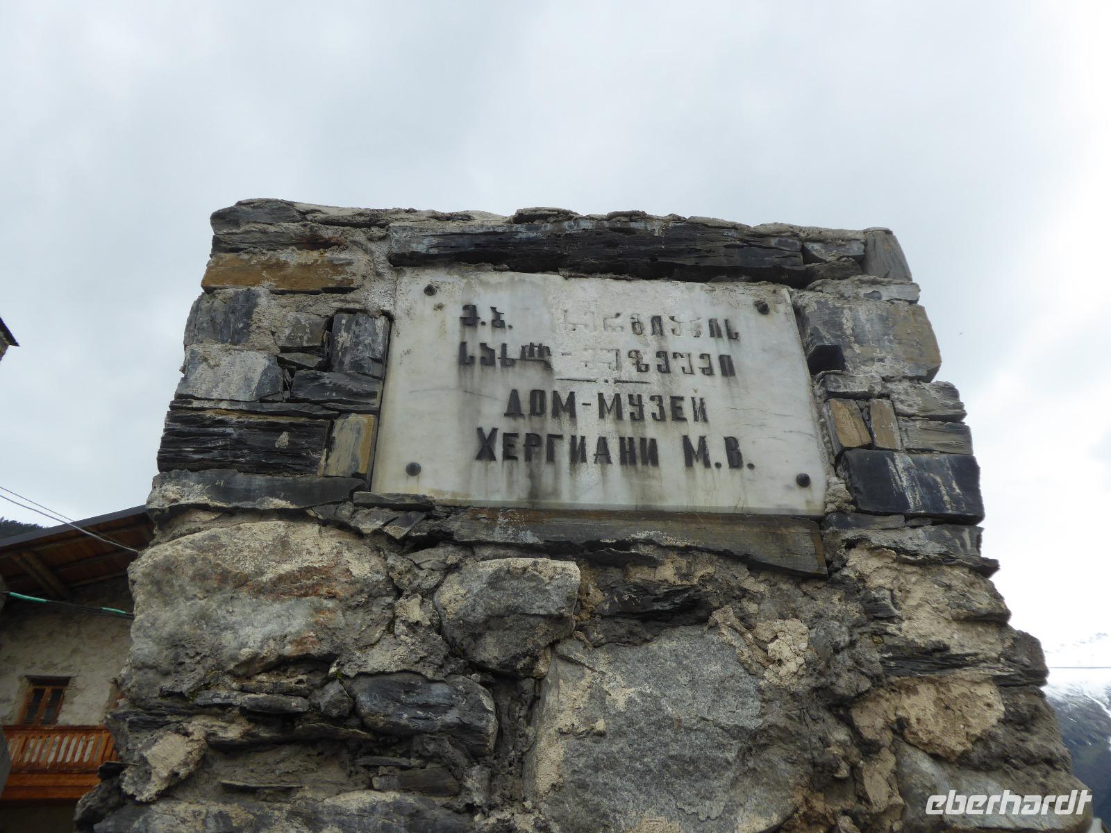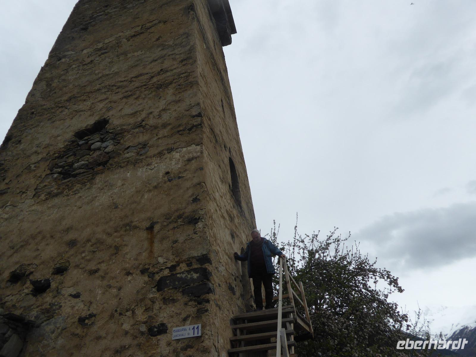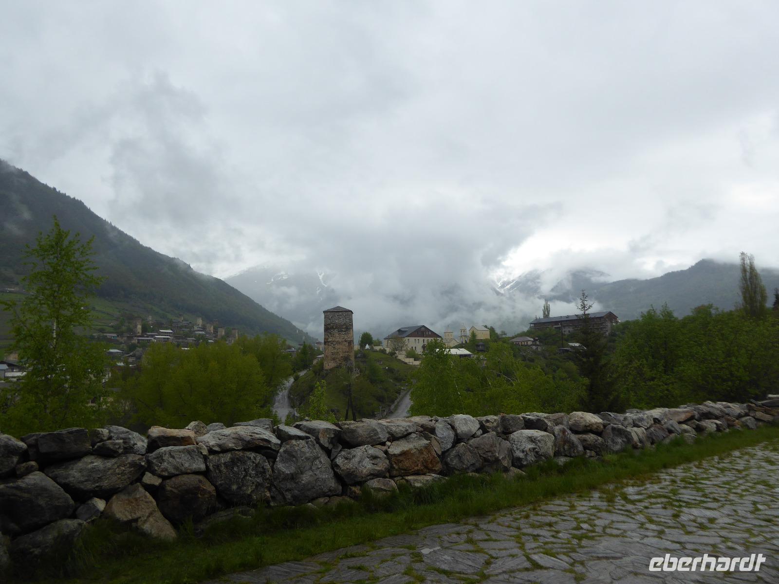 Nach dem Frühstück fahren wir zum Queen-Tamar Flughafen. Das futuristische Flughafengebäude passt so gar nicht zu den mittelalterlichen Türmen, die die Region prägen. Oder doch? Das Projekt stammt von einem Berliner Architekten namens Jürgen Mayer und wurde 2010 gebaut. Anschließend fahren wir zum Museum, das an das Leben, den Ruhm und den Tod des Bergsteigers Chergiani erinnert. Außer uns ist hier eine Gruppe einheimischer Jugendlicher unterwegs, die auf den Spuren ihrer georgischen Geschichte wandeln. Nach ihnen dürfen wir hinein. Im ersten Raum befinden sich einige Glasvitrinen, die das Leben des berühmten, 1968 verunglückten, Bergsteigers Chergiani schildern. Geführt werden wir erst von Natja und dann von einem Georgier. Moment mal, den kenne ich doch. Das ist doch der Neffe vom Chergiani. Dieses Mal traue ich mich, zu fragen, ob er sich mit mir fotografieren lässt. Wow :-), das gefällt mir. Nun fahren wir zum Matschubi-Museum. Ich erinnere mich, dass es auf dem Weg eine kleine Bude gibt, wo wir svanetisches Kräutersalz kaufen können. Dem ist auch so. Ein steiler Weg führt hierher und bis zum Museum. Ein Matschubi ist ein (ur-) altes svanisches Wohnhaus. In der Mitte befindet sich eine Feuerstelle. An dieser gibt es eine Art Thron, ein Holzsessel, auf dem nur der Familienälteste Platz nehmen durfte. Ringsherum sind Holzgestelle, in deren unteren Teil das Vieh untergebracht war und im oberen Teil die Menschen schliefen. Im gleichen Raum wurde auch gekocht und gegessen und sonst noch was. Mehrere Monate im Winter verbrachten die Familien hier. Wir gehen auch noch in den Keller, wo Vorräte sowie Wein und Honig gelagert wurden. Hier ist es dunkel und kalt. Nachdem wir das Matschubi verlassen haben, wartet ein weiteres Abenteuer auf uns. Wir besteigen einen Wehrturm. Drinnen ist es stockduster und man muss mehrere Barrieren überwinden, ehe man von einer Etage auf die andere kommt. So konnten sich die Svanen vor Angreifern schützen. Für uns ist es eine abenteuerliche Kletterpartie. Nun ist der Vormittag vorbei und wir wollen mit dem Sessellift auf den Zuruldi-Berg fahren, um dort die schöne Aussicht zu genießen und etwas zum Mittag zu essen. Es beginnt zu regnen. Noch sind wir optimistisch und fest entschlossen, unseren Plan umzusetzen. Wir fahren acht Kilometer nach Hatsvali. Inzwischen regnet es schon mehr. Natia und ich erkunden die Lage. Keine Chance. Es ist nicht erlaubt und wäre auch unvernünftig, jetzt mit dem Sessellift zu fahren. Also kehren wir um. Wir fahren ins Zentrum von Mestia und kehren im Café Laila ein. Wir probieren verschiedene georgische Gerichte, wie Suppen und fleischgefüllte Teigtaschen. Es ist gemütlich hier. Es regnet immer noch. Der Tag ist noch jung und wir fahren nun ins Historische Museum von Mestia. Hier sind neben alten Münzen und Speerspitzen, wertvolle Ikonen und Bücher zu bewundern. Es ist 15 Uhr. Immer noch zu früh, ins Hotel zu fahren. Natia macht eine Kirche ausfindig, in der es wertvolle Fresken zu sehen gibt. Es ist die Prophet Jonah Kirche in einem Ort vor Mestia (Lapatli). Vor dem Kirchlein haben sich ein paar tief schwarz gekleidete Frauen getroffen und bereiten ein Mahl vor. Diesen traurigen Grund möchten wir lieber nicht wissen. Das Kirchlein ist ziemlich mitgenommen, von den wertvollen Wandmalereien ist kaum etwas zu sehen. Außerdem sieht sie irgendwie verräuchert aus. Auf Nachfrage erfahren wir, dass hier Fleisch zubereitet wurde. Nun ja, auch alle Gläubigen müssen irgendwann etwas essen. Endlich hat es aufgehört zu regnen. Wir fahren zurück nach Mestia und verbringen dort eine Stunde Freizeit. Hätten wir gewusst, dass es erst 20 Uhr Abendessen gibt, hätten wir auch noch länger bleiben können.