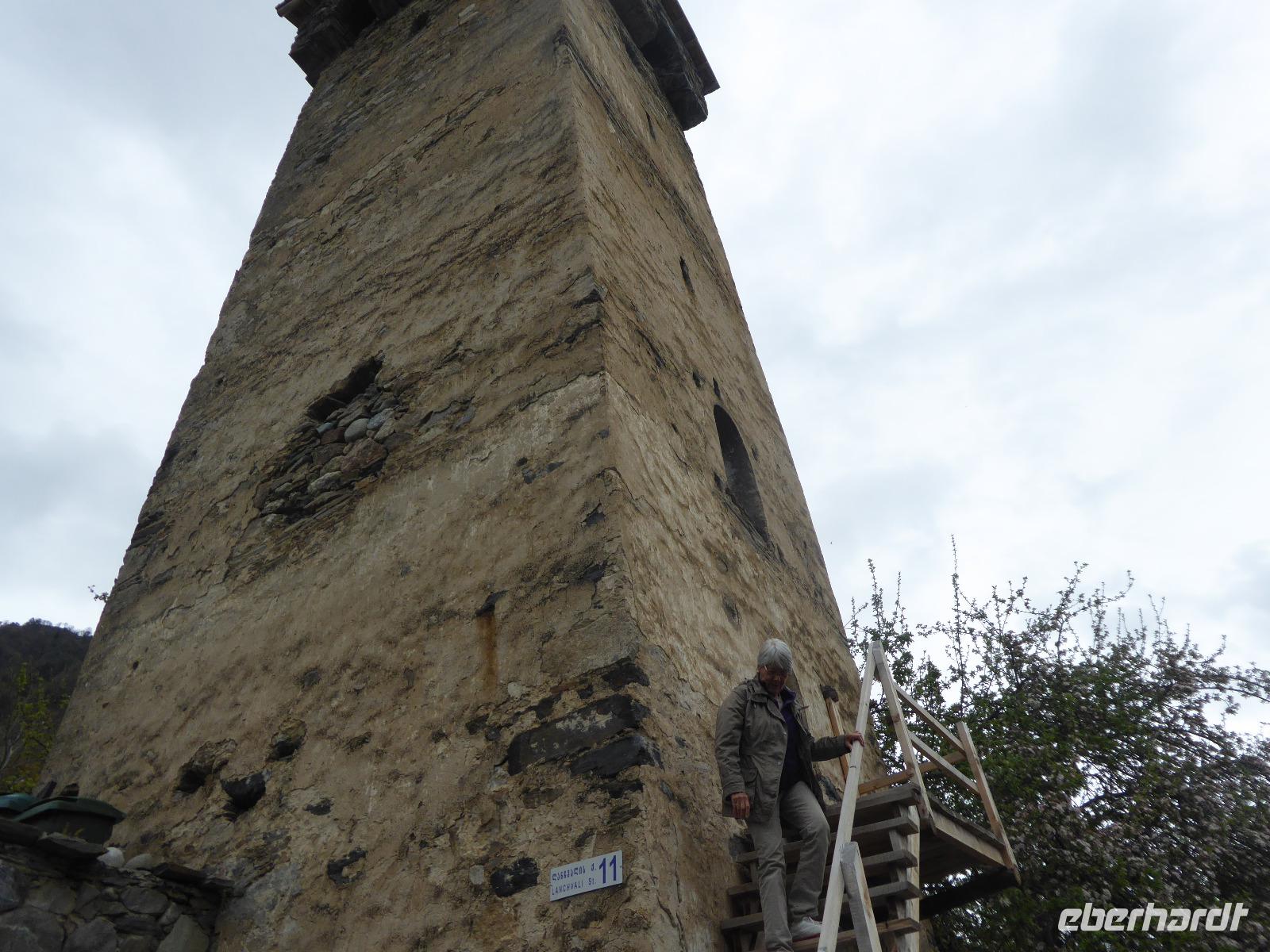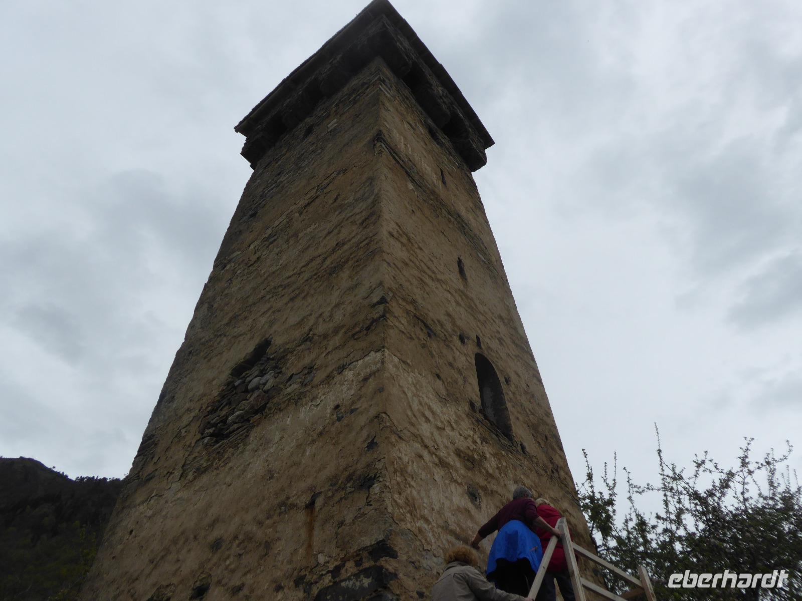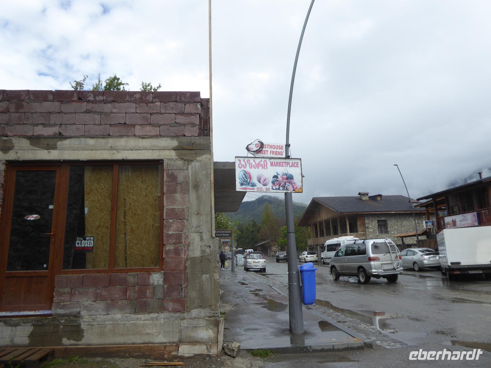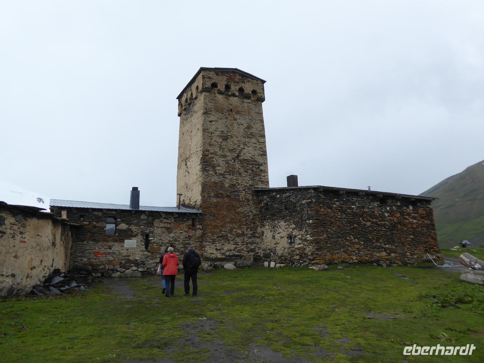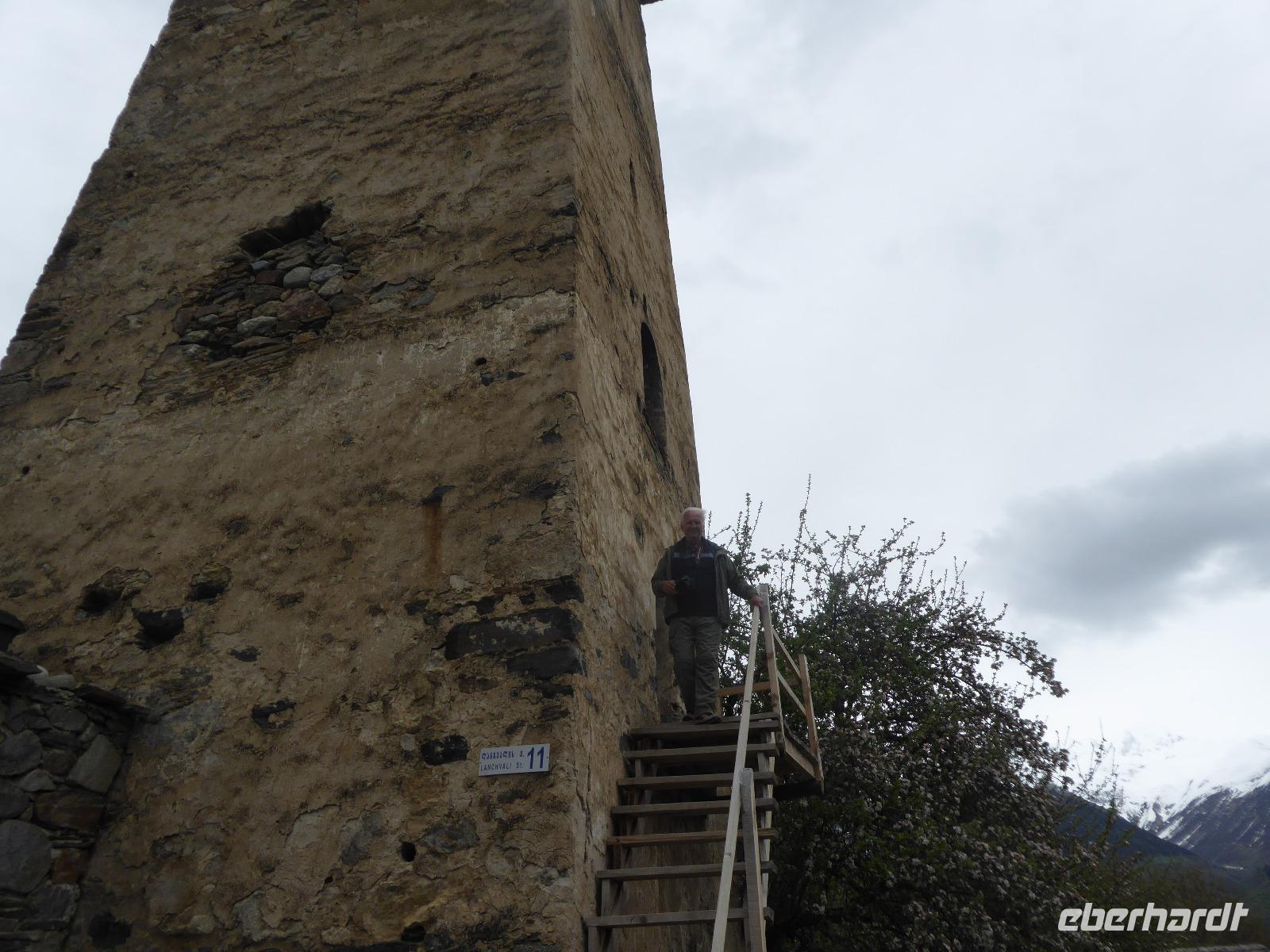 Nach dem Frühstück fahren wir zum Queen-Tamar Flughafen. Das futuristische Flughafengebäude passt so gar nicht zu den mittelalterlichen Türmen, die die Region prägen. Oder doch? Das Projekt stammt von einem Berliner Architekten namens Jürgen Mayer und wurde 2010 gebaut. Anschließend fahren wir zum Museum, das an das Leben, den Ruhm und den Tod des Bergsteigers Chergiani erinnert. Außer uns ist hier eine Gruppe einheimischer Jugendlicher unterwegs, die auf den Spuren ihrer georgischen Geschichte wandeln. Nach ihnen dürfen wir hinein. Im ersten Raum befinden sich einige Glasvitrinen, die das Leben des berühmten, 1968 verunglückten, Bergsteigers Chergiani schildern. Geführt werden wir erst von Natja und dann von einem Georgier. Moment mal, den kenne ich doch. Das ist doch der Neffe vom Chergiani. Dieses Mal traue ich mich, zu fragen, ob er sich mit mir fotografieren lässt. Wow :-), das gefällt mir. Nun fahren wir zum Matschubi-Museum. Ich erinnere mich, dass es auf dem Weg eine kleine Bude gibt, wo wir svanetisches Kräutersalz kaufen können. Dem ist auch so. Ein steiler Weg führt hierher und bis zum Museum. Ein Matschubi ist ein (ur-) altes svanisches Wohnhaus. In der Mitte befindet sich eine Feuerstelle. An dieser gibt es eine Art Thron, ein Holzsessel, auf dem nur der Familienälteste Platz nehmen durfte. Ringsherum sind Holzgestelle, in deren unteren Teil das Vieh untergebracht war und im oberen Teil die Menschen schliefen. Im gleichen Raum wurde auch gekocht und gegessen und sonst noch was. Mehrere Monate im Winter verbrachten die Familien hier. Wir gehen auch noch in den Keller, wo Vorräte sowie Wein und Honig gelagert wurden. Hier ist es dunkel und kalt. Nachdem wir das Matschubi verlassen haben, wartet ein weiteres Abenteuer auf uns. Wir besteigen einen Wehrturm. Drinnen ist es stockduster und man muss mehrere Barrieren überwinden, ehe man von einer Etage auf die andere kommt. So konnten sich die Svanen vor Angreifern schützen. Für uns ist es eine abenteuerliche Kletterpartie. Nun ist der Vormittag vorbei und wir wollen mit dem Sessellift auf den Zuruldi-Berg fahren, um dort die schöne Aussicht zu genießen und etwas zum Mittag zu essen. Es beginnt zu regnen. Noch sind wir optimistisch und fest entschlossen, unseren Plan umzusetzen. Wir fahren acht Kilometer nach Hatsvali. Inzwischen regnet es schon mehr. Natia und ich erkunden die Lage. Keine Chance. Es ist nicht erlaubt und wäre auch unvernünftig, jetzt mit dem Sessellift zu fahren. Also kehren wir um. Wir fahren ins Zentrum von Mestia und kehren im Café Laila ein. Wir probieren verschiedene georgische Gerichte, wie Suppen und fleischgefüllte Teigtaschen. Es ist gemütlich hier. Es regnet immer noch. Der Tag ist noch jung und wir fahren nun ins Historische Museum von Mestia. Hier sind neben alten Münzen und Speerspitzen, wertvolle Ikonen und Bücher zu bewundern. Es ist 15 Uhr. Immer noch zu früh, ins Hotel zu fahren. Natia macht eine Kirche ausfindig, in der es wertvolle Fresken zu sehen gibt. Es ist die Prophet Jonah Kirche in einem Ort vor Mestia (Lapatli). Vor dem Kirchlein haben sich ein paar tief schwarz gekleidete Frauen getroffen und bereiten ein Mahl vor. Diesen traurigen Grund möchten wir lieber nicht wissen. Das Kirchlein ist ziemlich mitgenommen, von den wertvollen Wandmalereien ist kaum etwas zu sehen. Außerdem sieht sie irgendwie verräuchert aus. Auf Nachfrage erfahren wir, dass hier Fleisch zubereitet wurde. Nun ja, auch alle Gläubigen müssen irgendwann etwas essen. Endlich hat es aufgehört zu regnen. Wir fahren zurück nach Mestia und verbringen dort eine Stunde Freizeit. Hätten wir gewusst, dass es erst 20 Uhr Abendessen gibt, hätten wir auch noch länger bleiben können.