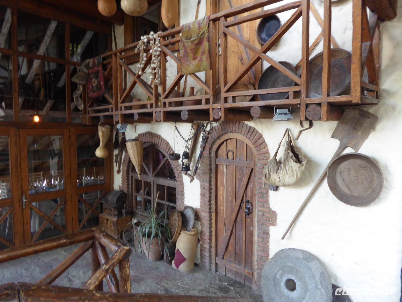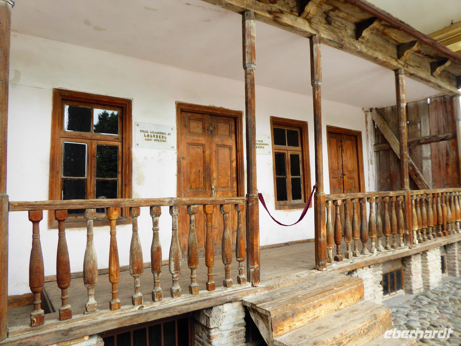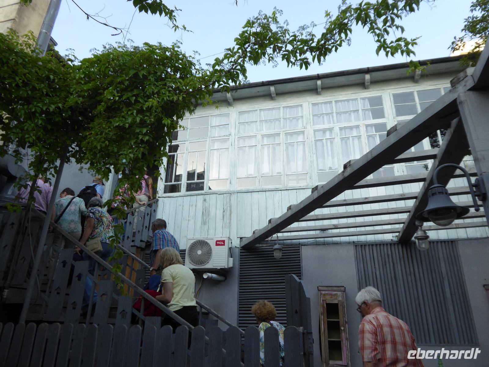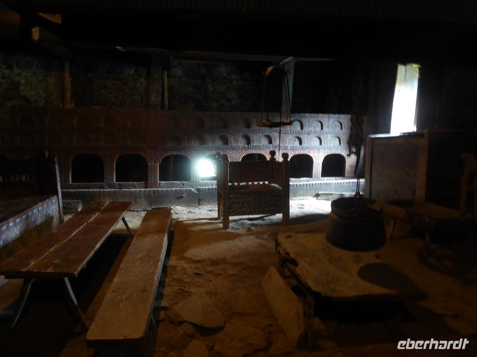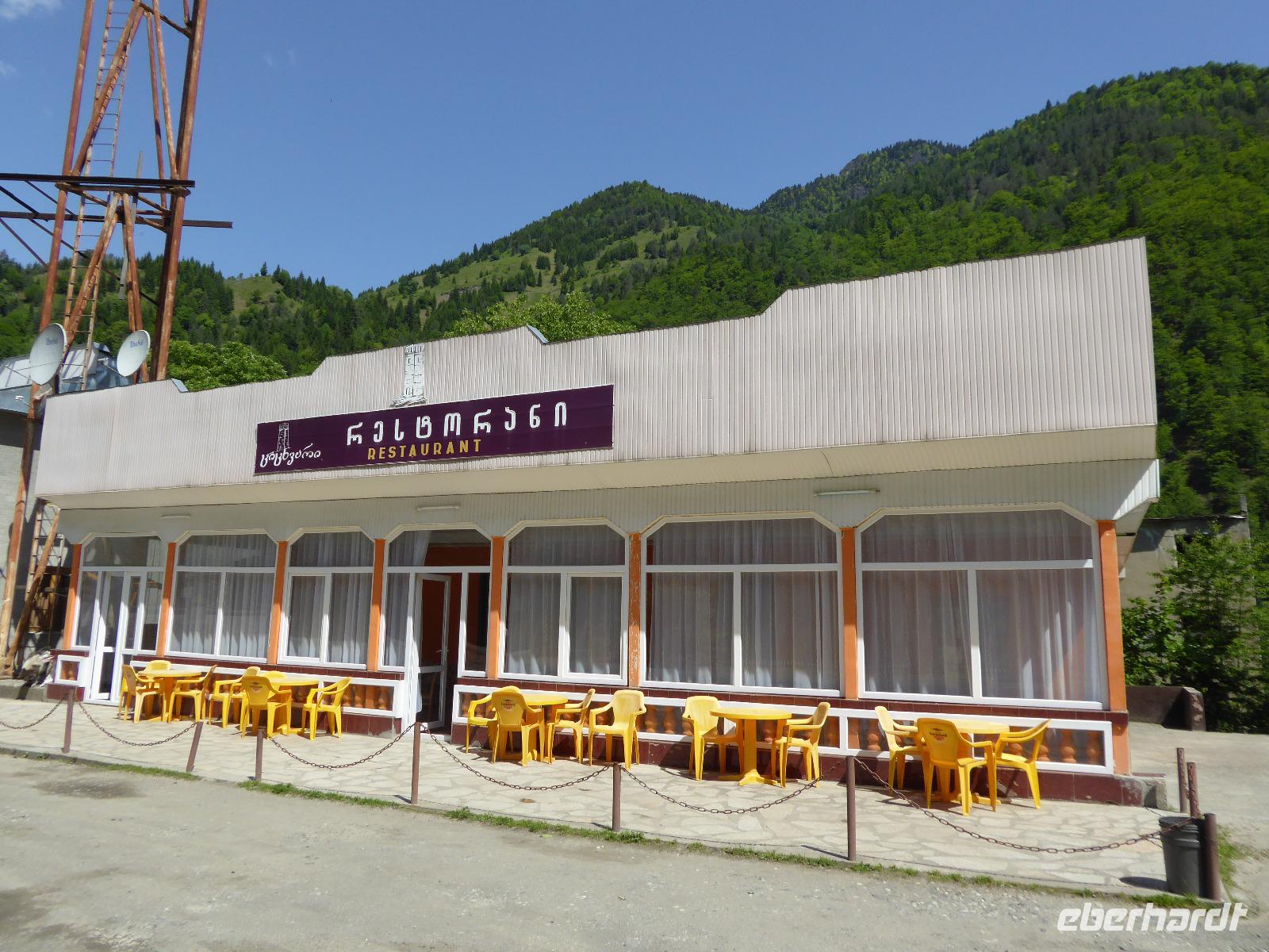 Nach dem Frühstück fahren wir zum Queen-Tamar Flughafen. Das futuristische Flughafengebäude passt so gar nicht zu den mittelalterlichen Türmen, die die Region prägen. Oder doch? Das Projekt stammt von einem Berliner Architekten namens Jürgen Mayer und wurde 2010 gebaut. Anschließend fahren wir zum Museum, das an das Leben, den Ruhm und den Tod des Bergsteigers Chergiani erinnert. Außer uns ist hier eine Gruppe einheimischer Jugendlicher unterwegs, die auf den Spuren ihrer georgischen Geschichte wandeln. Nach ihnen dürfen wir hinein. Im ersten Raum befinden sich einige Glasvitrinen, die das Leben des berühmten, 1968 verunglückten, Bergsteigers Chergiani schildern. Geführt werden wir erst von Natja und dann von einem Georgier. Moment mal, den kenne ich doch. Das ist doch der Neffe vom Chergiani. Dieses Mal traue ich mich, zu fragen, ob er sich mit mir fotografieren lässt. Wow :-), das gefällt mir. Nun fahren wir zum Matschubi-Museum. Ich erinnere mich, dass es auf dem Weg eine kleine Bude gibt, wo wir svanetisches Kräutersalz kaufen können. Dem ist auch so. Ein steiler Weg führt hierher und bis zum Museum. Ein Matschubi ist ein (ur-) altes svanisches Wohnhaus. In der Mitte befindet sich eine Feuerstelle. An dieser gibt es eine Art Thron, ein Holzsessel, auf dem nur der Familienälteste Platz nehmen durfte. Ringsherum sind Holzgestelle, in deren unteren Teil das Vieh untergebracht war und im oberen Teil die Menschen schliefen. Im gleichen Raum wurde auch gekocht und gegessen und sonst noch was. Mehrere Monate im Winter verbrachten die Familien hier. Wir gehen auch noch in den Keller, wo Vorräte sowie Wein und Honig gelagert wurden. Hier ist es dunkel und kalt. Nachdem wir das Matschubi verlassen haben, wartet ein weiteres Abenteuer auf uns. Wir besteigen einen Wehrturm. Drinnen ist es stockduster und man muss mehrere Barrieren überwinden, ehe man von einer Etage auf die andere kommt. So konnten sich die Svanen vor Angreifern schützen. Für uns ist es eine abenteuerliche Kletterpartie. Nun ist der Vormittag vorbei und wir wollen mit dem Sessellift auf den Zuruldi-Berg fahren, um dort die schöne Aussicht zu genießen und etwas zum Mittag zu essen. Es beginnt zu regnen. Noch sind wir optimistisch und fest entschlossen, unseren Plan umzusetzen. Wir fahren acht Kilometer nach Hatsvali. Inzwischen regnet es schon mehr. Natia und ich erkunden die Lage. Keine Chance. Es ist nicht erlaubt und wäre auch unvernünftig, jetzt mit dem Sessellift zu fahren. Also kehren wir um. Wir fahren ins Zentrum von Mestia und kehren im Café Laila ein. Wir probieren verschiedene georgische Gerichte, wie Suppen und fleischgefüllte Teigtaschen. Es ist gemütlich hier. Es regnet immer noch. Der Tag ist noch jung und wir fahren nun ins Historische Museum von Mestia. Hier sind neben alten Münzen und Speerspitzen, wertvolle Ikonen und Bücher zu bewundern. Es ist 15 Uhr. Immer noch zu früh, ins Hotel zu fahren. Natia macht eine Kirche ausfindig, in der es wertvolle Fresken zu sehen gibt. Es ist die Prophet Jonah Kirche in einem Ort vor Mestia (Lapatli). Vor dem Kirchlein haben sich ein paar tief schwarz gekleidete Frauen getroffen und bereiten ein Mahl vor. Diesen traurigen Grund möchten wir lieber nicht wissen. Das Kirchlein ist ziemlich mitgenommen, von den wertvollen Wandmalereien ist kaum etwas zu sehen. Außerdem sieht sie irgendwie verräuchert aus. Auf Nachfrage erfahren wir, dass hier Fleisch zubereitet wurde. Nun ja, auch alle Gläubigen müssen irgendwann etwas essen. Endlich hat es aufgehört zu regnen. Wir fahren zurück nach Mestia und verbringen dort eine Stunde Freizeit. Hätten wir gewusst, dass es erst 20 Uhr Abendessen gibt, hätten wir auch noch länger bleiben können.