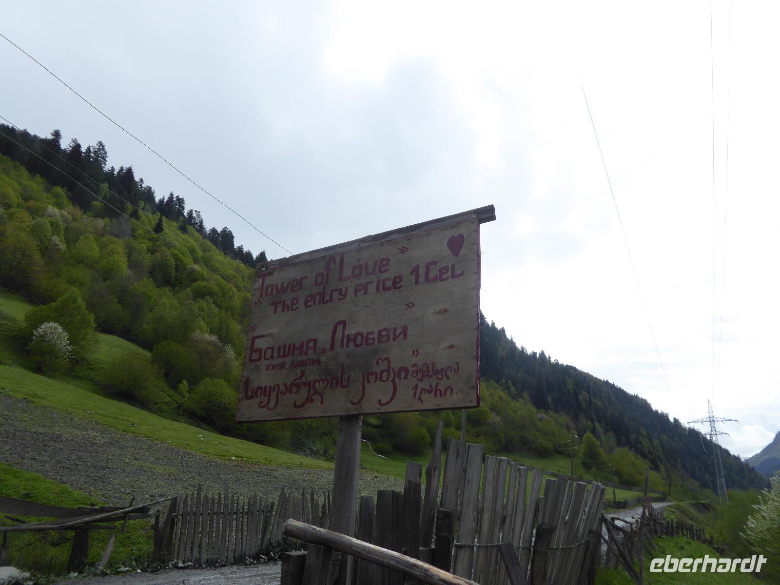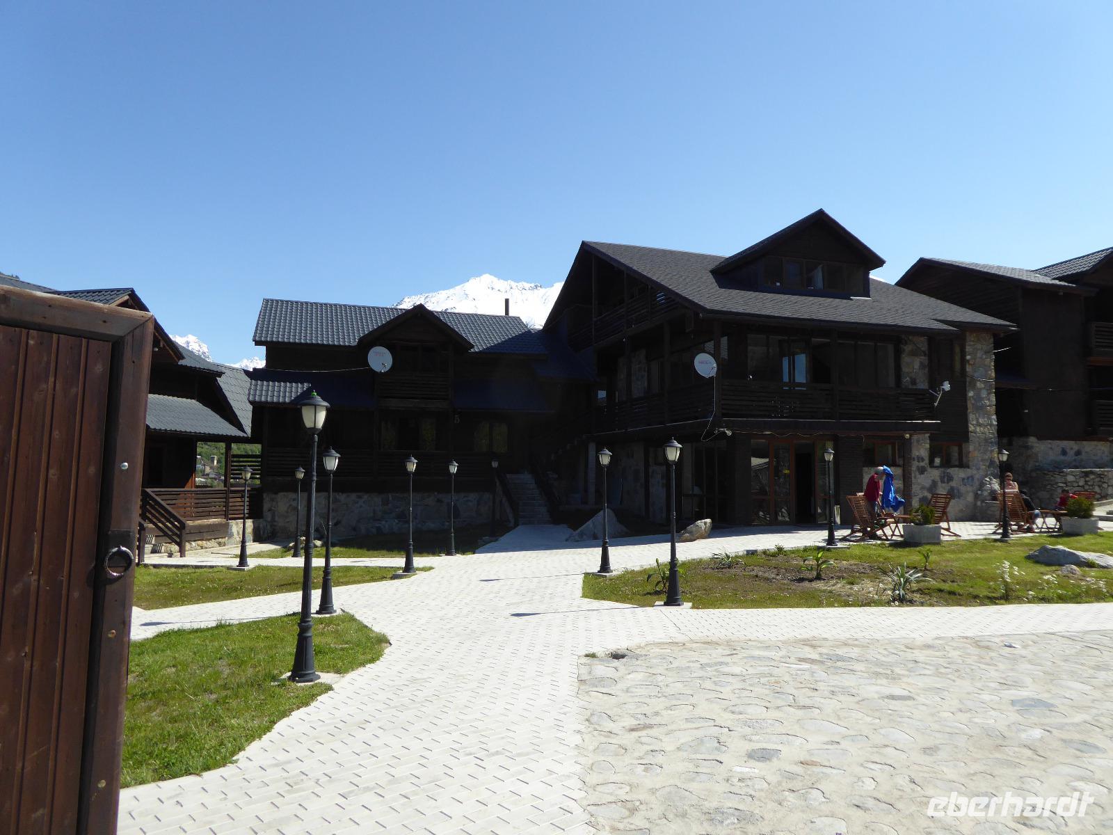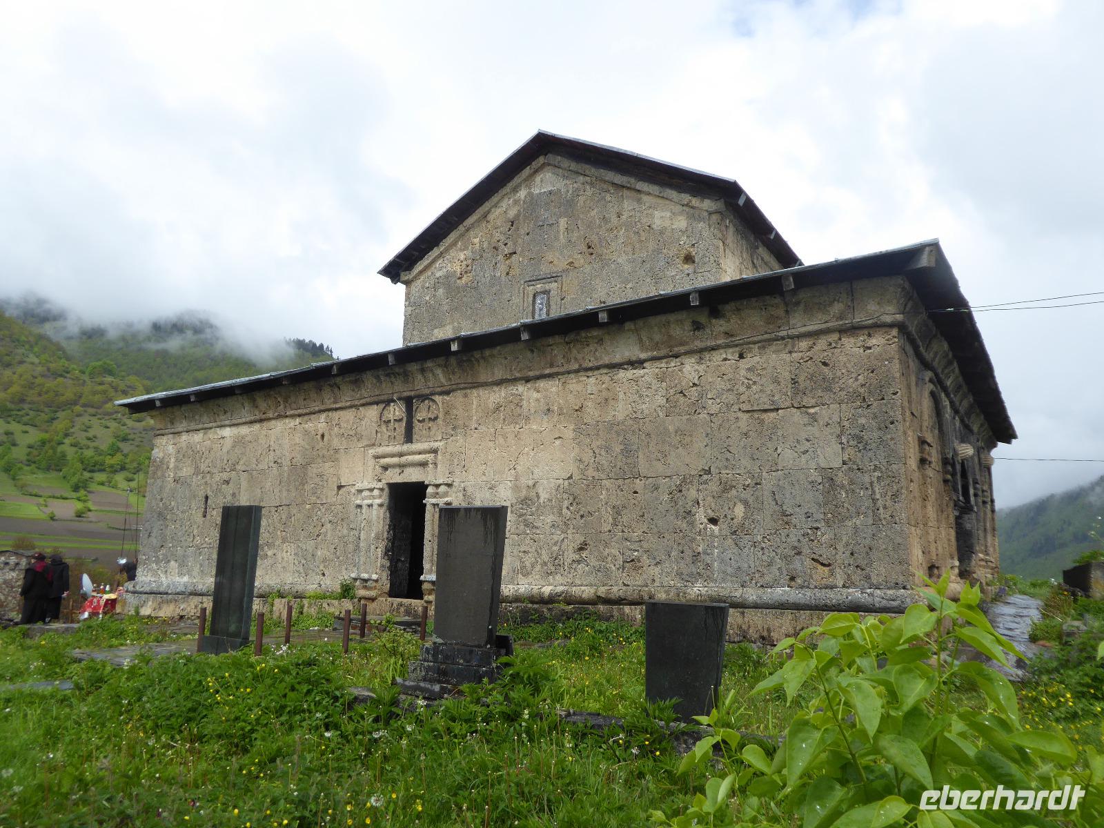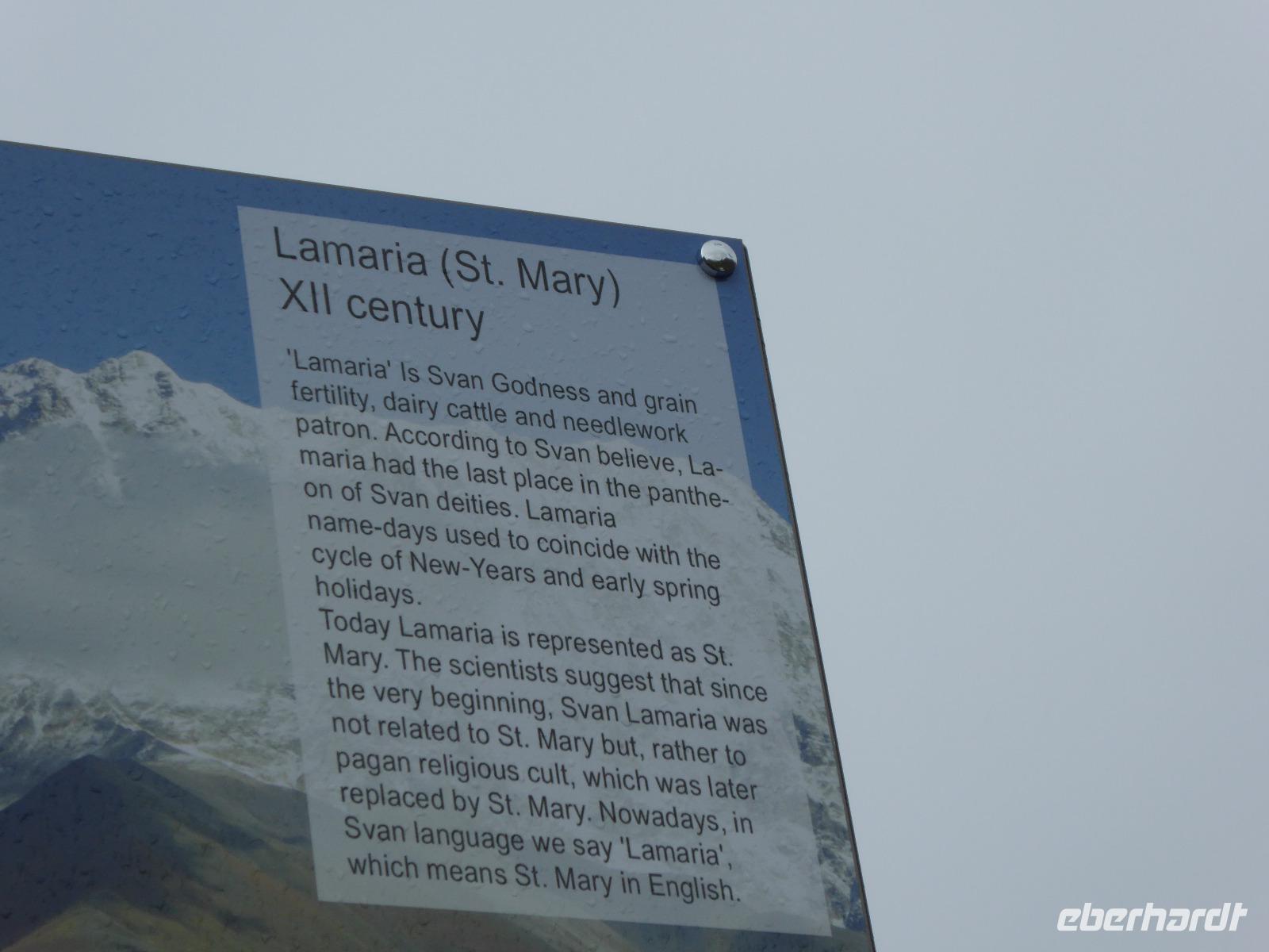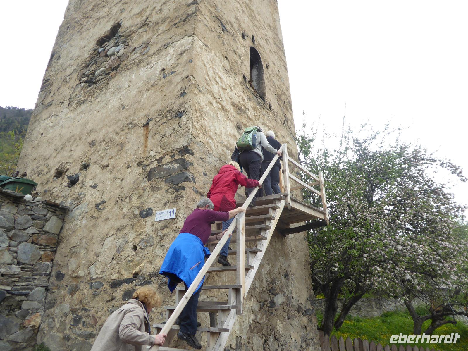 Nach dem Frühstück fahren wir zum Queen-Tamar Flughafen. Das futuristische Flughafengebäude passt so gar nicht zu den mittelalterlichen Türmen, die die Region prägen. Oder doch? Das Projekt stammt von einem Berliner Architekten namens Jürgen Mayer und wurde 2010 gebaut. Anschließend fahren wir zum Museum, das an das Leben, den Ruhm und den Tod des Bergsteigers Chergiani erinnert. Außer uns ist hier eine Gruppe einheimischer Jugendlicher unterwegs, die auf den Spuren ihrer georgischen Geschichte wandeln. Nach ihnen dürfen wir hinein. Im ersten Raum befinden sich einige Glasvitrinen, die das Leben des berühmten, 1968 verunglückten, Bergsteigers Chergiani schildern. Geführt werden wir erst von Natja und dann von einem Georgier. Moment mal, den kenne ich doch. Das ist doch der Neffe vom Chergiani. Dieses Mal traue ich mich, zu fragen, ob er sich mit mir fotografieren lässt. Wow :-), das gefällt mir. Nun fahren wir zum Matschubi-Museum. Ich erinnere mich, dass es auf dem Weg eine kleine Bude gibt, wo wir svanetisches Kräutersalz kaufen können. Dem ist auch so. Ein steiler Weg führt hierher und bis zum Museum. Ein Matschubi ist ein (ur-) altes svanisches Wohnhaus. In der Mitte befindet sich eine Feuerstelle. An dieser gibt es eine Art Thron, ein Holzsessel, auf dem nur der Familienälteste Platz nehmen durfte. Ringsherum sind Holzgestelle, in deren unteren Teil das Vieh untergebracht war und im oberen Teil die Menschen schliefen. Im gleichen Raum wurde auch gekocht und gegessen und sonst noch was. Mehrere Monate im Winter verbrachten die Familien hier. Wir gehen auch noch in den Keller, wo Vorräte sowie Wein und Honig gelagert wurden. Hier ist es dunkel und kalt. Nachdem wir das Matschubi verlassen haben, wartet ein weiteres Abenteuer auf uns. Wir besteigen einen Wehrturm. Drinnen ist es stockduster und man muss mehrere Barrieren überwinden, ehe man von einer Etage auf die andere kommt. So konnten sich die Svanen vor Angreifern schützen. Für uns ist es eine abenteuerliche Kletterpartie. Nun ist der Vormittag vorbei und wir wollen mit dem Sessellift auf den Zuruldi-Berg fahren, um dort die schöne Aussicht zu genießen und etwas zum Mittag zu essen. Es beginnt zu regnen. Noch sind wir optimistisch und fest entschlossen, unseren Plan umzusetzen. Wir fahren acht Kilometer nach Hatsvali. Inzwischen regnet es schon mehr. Natia und ich erkunden die Lage. Keine Chance. Es ist nicht erlaubt und wäre auch unvernünftig, jetzt mit dem Sessellift zu fahren. Also kehren wir um. Wir fahren ins Zentrum von Mestia und kehren im Café Laila ein. Wir probieren verschiedene georgische Gerichte, wie Suppen und fleischgefüllte Teigtaschen. Es ist gemütlich hier. Es regnet immer noch. Der Tag ist noch jung und wir fahren nun ins Historische Museum von Mestia. Hier sind neben alten Münzen und Speerspitzen, wertvolle Ikonen und Bücher zu bewundern. Es ist 15 Uhr. Immer noch zu früh, ins Hotel zu fahren. Natia macht eine Kirche ausfindig, in der es wertvolle Fresken zu sehen gibt. Es ist die Prophet Jonah Kirche in einem Ort vor Mestia (Lapatli). Vor dem Kirchlein haben sich ein paar tief schwarz gekleidete Frauen getroffen und bereiten ein Mahl vor. Diesen traurigen Grund möchten wir lieber nicht wissen. Das Kirchlein ist ziemlich mitgenommen, von den wertvollen Wandmalereien ist kaum etwas zu sehen. Außerdem sieht sie irgendwie verräuchert aus. Auf Nachfrage erfahren wir, dass hier Fleisch zubereitet wurde. Nun ja, auch alle Gläubigen müssen irgendwann etwas essen. Endlich hat es aufgehört zu regnen. Wir fahren zurück nach Mestia und verbringen dort eine Stunde Freizeit. Hätten wir gewusst, dass es erst 20 Uhr Abendessen gibt, hätten wir auch noch länger bleiben können.