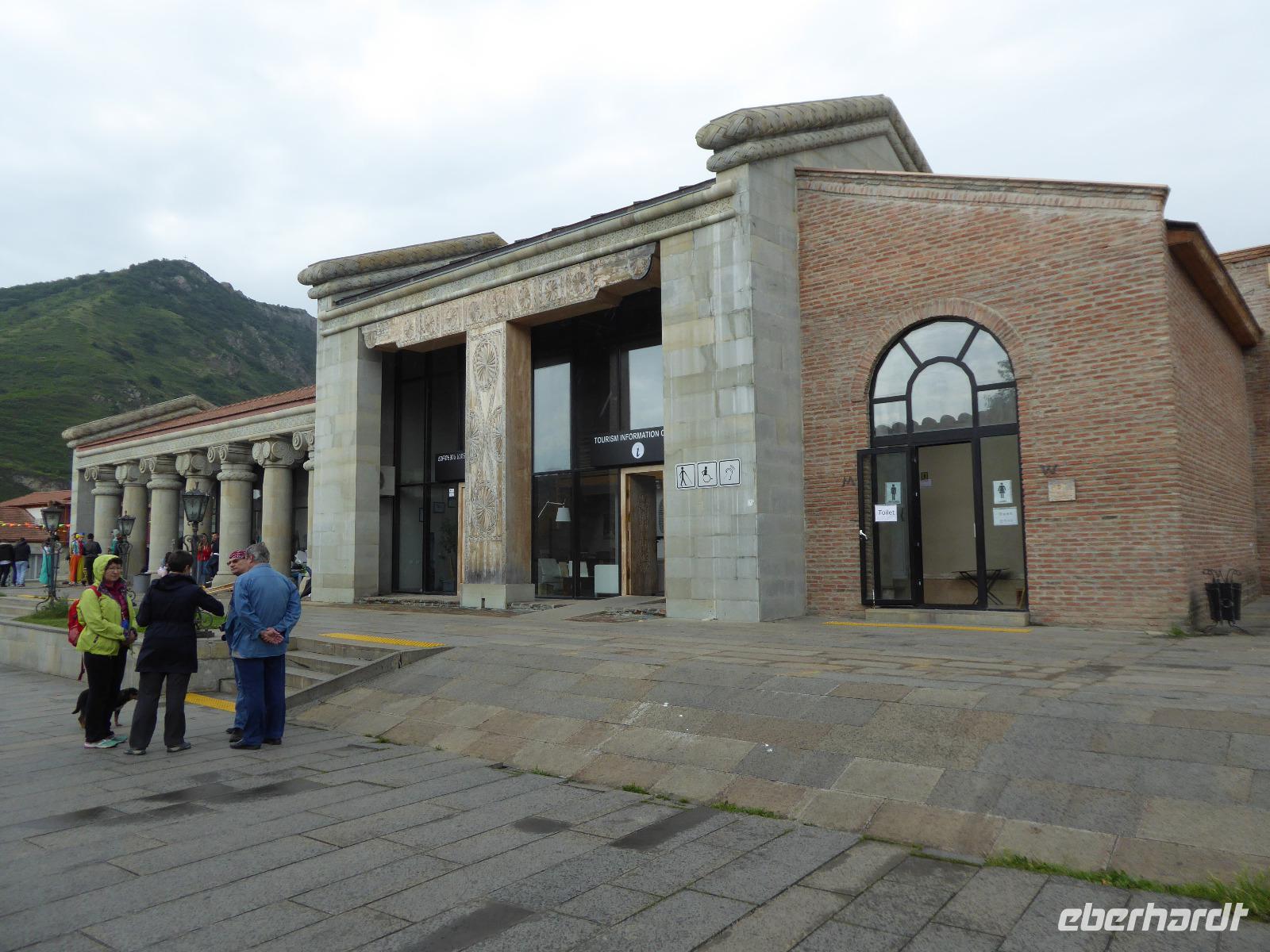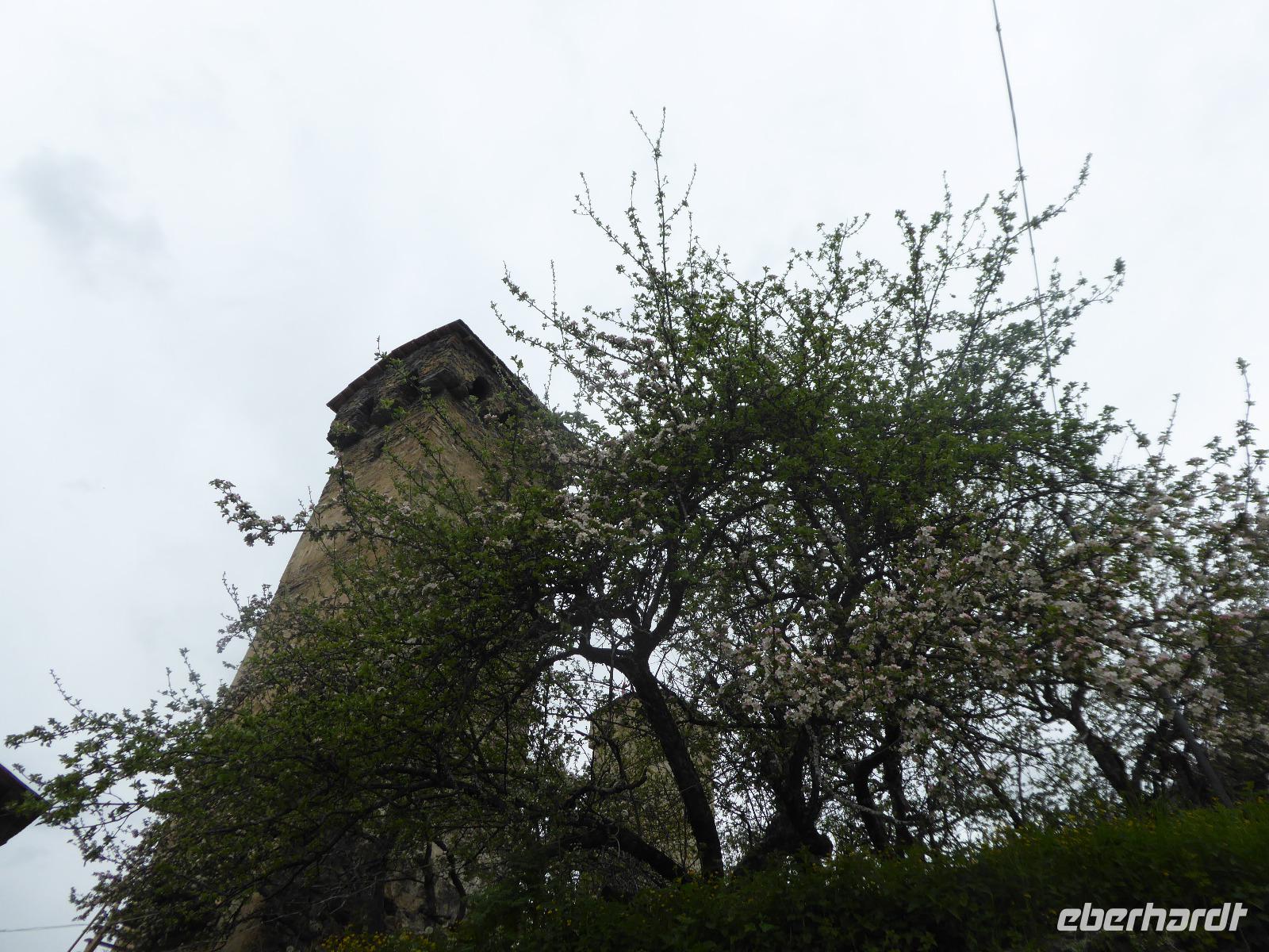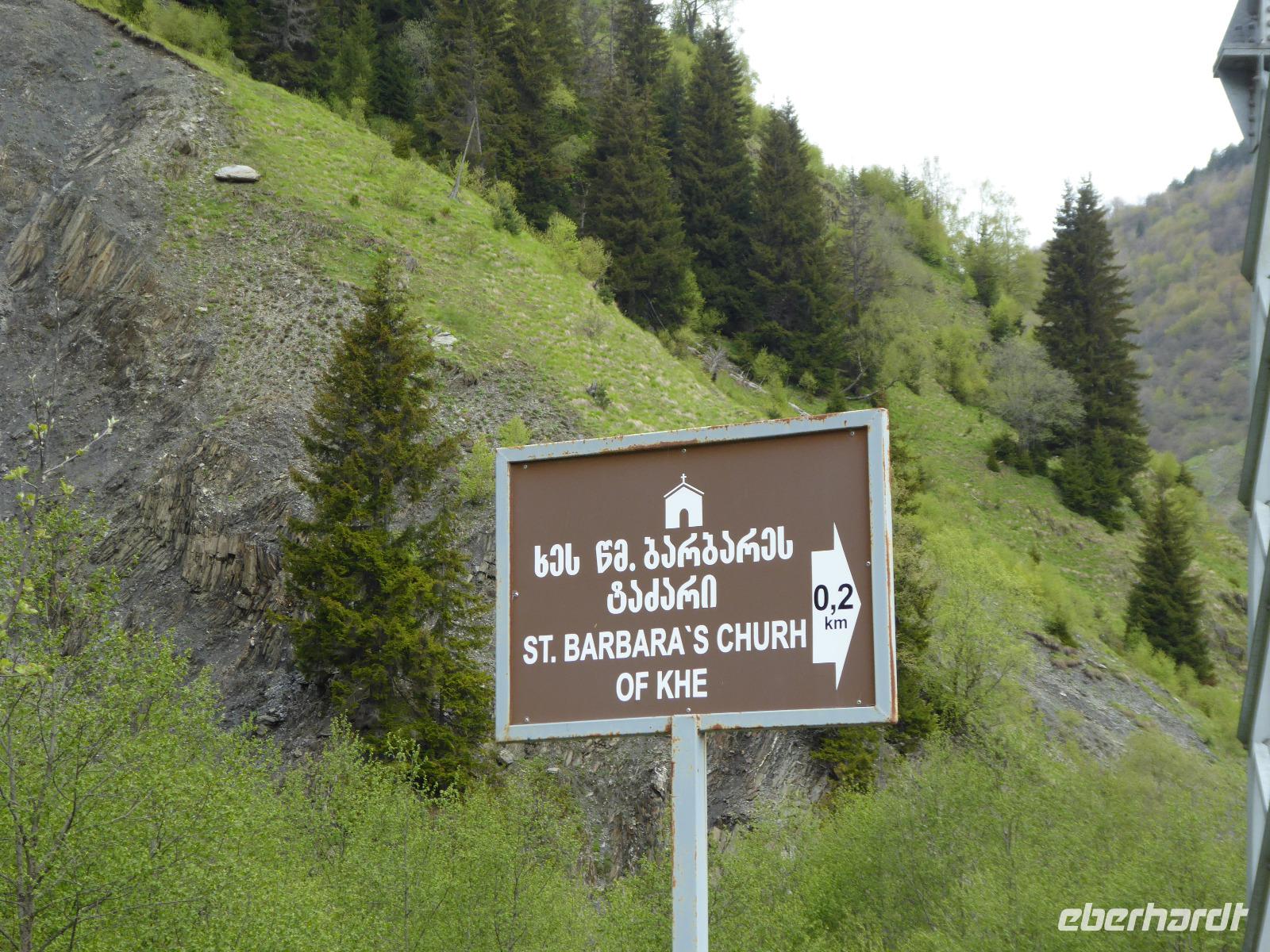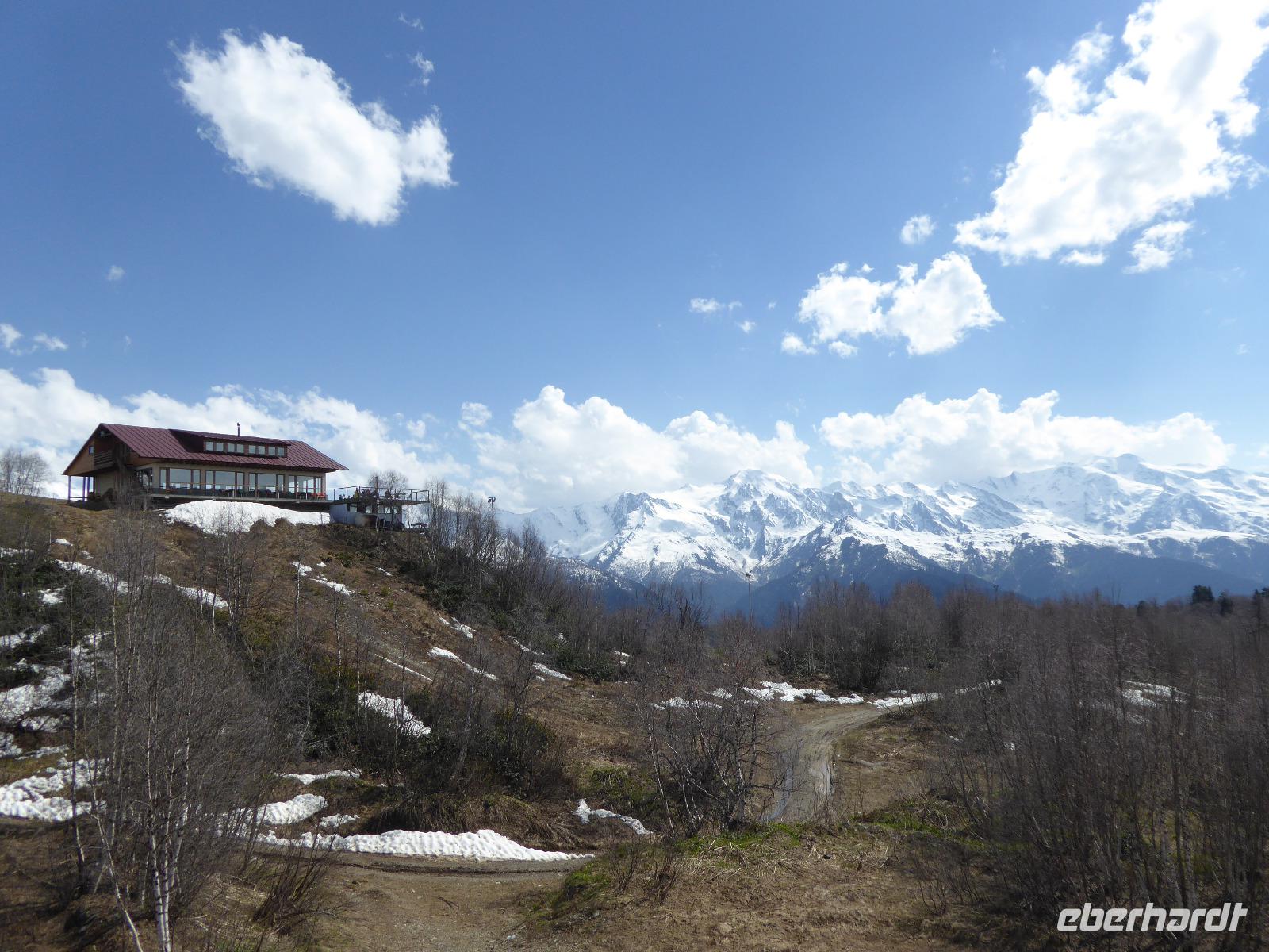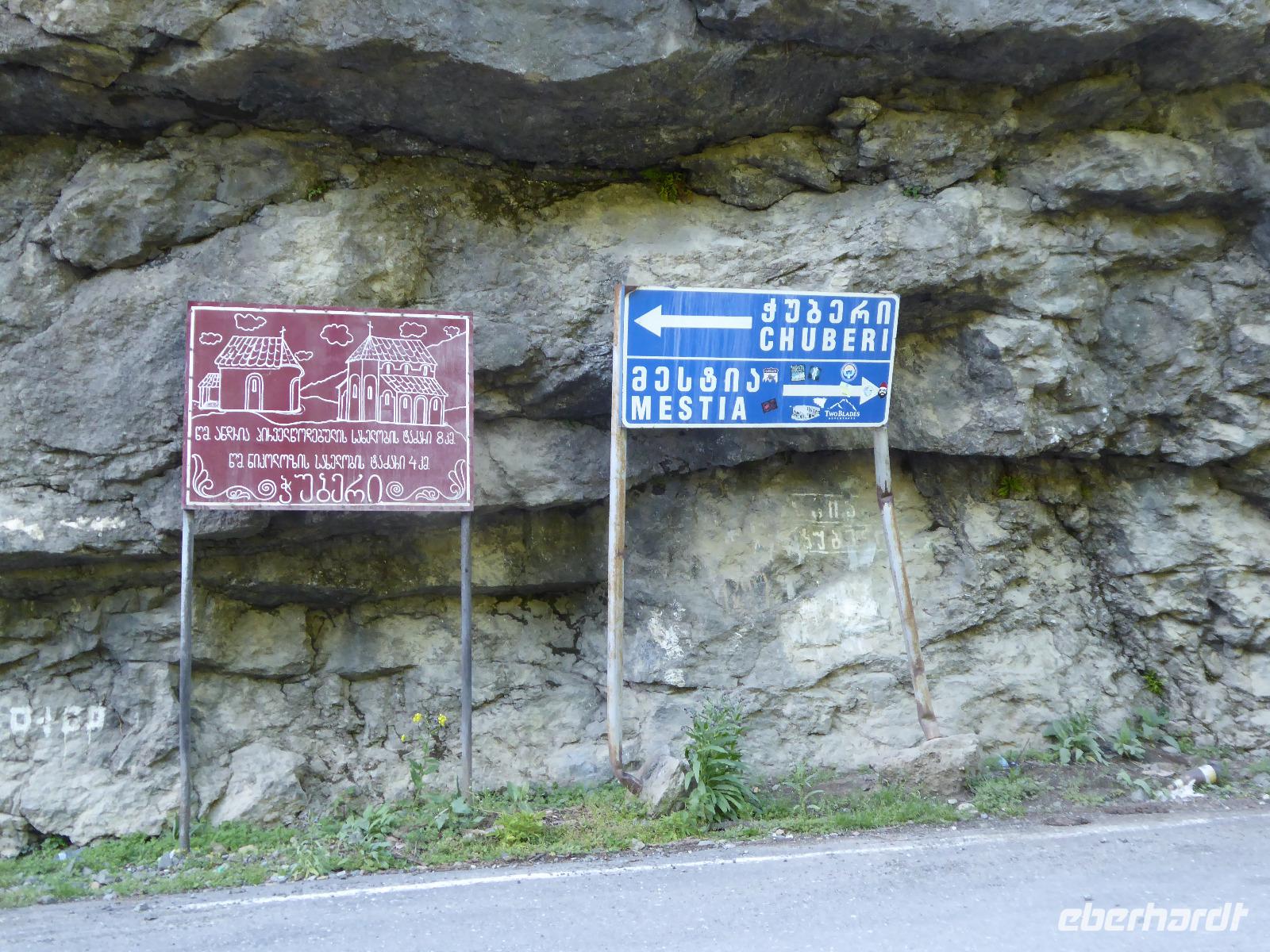 Nach dem Frühstück fahren wir zum Queen-Tamar Flughafen. Das futuristische Flughafengebäude passt so gar nicht zu den mittelalterlichen Türmen, die die Region prägen. Oder doch? Das Projekt stammt von einem Berliner Architekten namens Jürgen Mayer und wurde 2010 gebaut. Anschließend fahren wir zum Museum, das an das Leben, den Ruhm und den Tod des Bergsteigers Chergiani erinnert. Außer uns ist hier eine Gruppe einheimischer Jugendlicher unterwegs, die auf den Spuren ihrer georgischen Geschichte wandeln. Nach ihnen dürfen wir hinein. Im ersten Raum befinden sich einige Glasvitrinen, die das Leben des berühmten, 1968 verunglückten, Bergsteigers Chergiani schildern. Geführt werden wir erst von Natja und dann von einem Georgier. Moment mal, den kenne ich doch. Das ist doch der Neffe vom Chergiani. Dieses Mal traue ich mich, zu fragen, ob er sich mit mir fotografieren lässt. Wow :-), das gefällt mir. Nun fahren wir zum Matschubi-Museum. Ich erinnere mich, dass es auf dem Weg eine kleine Bude gibt, wo wir svanetisches Kräutersalz kaufen können. Dem ist auch so. Ein steiler Weg führt hierher und bis zum Museum. Ein Matschubi ist ein (ur-) altes svanisches Wohnhaus. In der Mitte befindet sich eine Feuerstelle. An dieser gibt es eine Art Thron, ein Holzsessel, auf dem nur der Familienälteste Platz nehmen durfte. Ringsherum sind Holzgestelle, in deren unteren Teil das Vieh untergebracht war und im oberen Teil die Menschen schliefen. Im gleichen Raum wurde auch gekocht und gegessen und sonst noch was. Mehrere Monate im Winter verbrachten die Familien hier. Wir gehen auch noch in den Keller, wo Vorräte sowie Wein und Honig gelagert wurden. Hier ist es dunkel und kalt. Nachdem wir das Matschubi verlassen haben, wartet ein weiteres Abenteuer auf uns. Wir besteigen einen Wehrturm. Drinnen ist es stockduster und man muss mehrere Barrieren überwinden, ehe man von einer Etage auf die andere kommt. So konnten sich die Svanen vor Angreifern schützen. Für uns ist es eine abenteuerliche Kletterpartie. Nun ist der Vormittag vorbei und wir wollen mit dem Sessellift auf den Zuruldi-Berg fahren, um dort die schöne Aussicht zu genießen und etwas zum Mittag zu essen. Es beginnt zu regnen. Noch sind wir optimistisch und fest entschlossen, unseren Plan umzusetzen. Wir fahren acht Kilometer nach Hatsvali. Inzwischen regnet es schon mehr. Natia und ich erkunden die Lage. Keine Chance. Es ist nicht erlaubt und wäre auch unvernünftig, jetzt mit dem Sessellift zu fahren. Also kehren wir um. Wir fahren ins Zentrum von Mestia und kehren im Café Laila ein. Wir probieren verschiedene georgische Gerichte, wie Suppen und fleischgefüllte Teigtaschen. Es ist gemütlich hier. Es regnet immer noch. Der Tag ist noch jung und wir fahren nun ins Historische Museum von Mestia. Hier sind neben alten Münzen und Speerspitzen, wertvolle Ikonen und Bücher zu bewundern. Es ist 15 Uhr. Immer noch zu früh, ins Hotel zu fahren. Natia macht eine Kirche ausfindig, in der es wertvolle Fresken zu sehen gibt. Es ist die Prophet Jonah Kirche in einem Ort vor Mestia (Lapatli). Vor dem Kirchlein haben sich ein paar tief schwarz gekleidete Frauen getroffen und bereiten ein Mahl vor. Diesen traurigen Grund möchten wir lieber nicht wissen. Das Kirchlein ist ziemlich mitgenommen, von den wertvollen Wandmalereien ist kaum etwas zu sehen. Außerdem sieht sie irgendwie verräuchert aus. Auf Nachfrage erfahren wir, dass hier Fleisch zubereitet wurde. Nun ja, auch alle Gläubigen müssen irgendwann etwas essen. Endlich hat es aufgehört zu regnen. Wir fahren zurück nach Mestia und verbringen dort eine Stunde Freizeit. Hätten wir gewusst, dass es erst 20 Uhr Abendessen gibt, hätten wir auch noch länger bleiben können.
