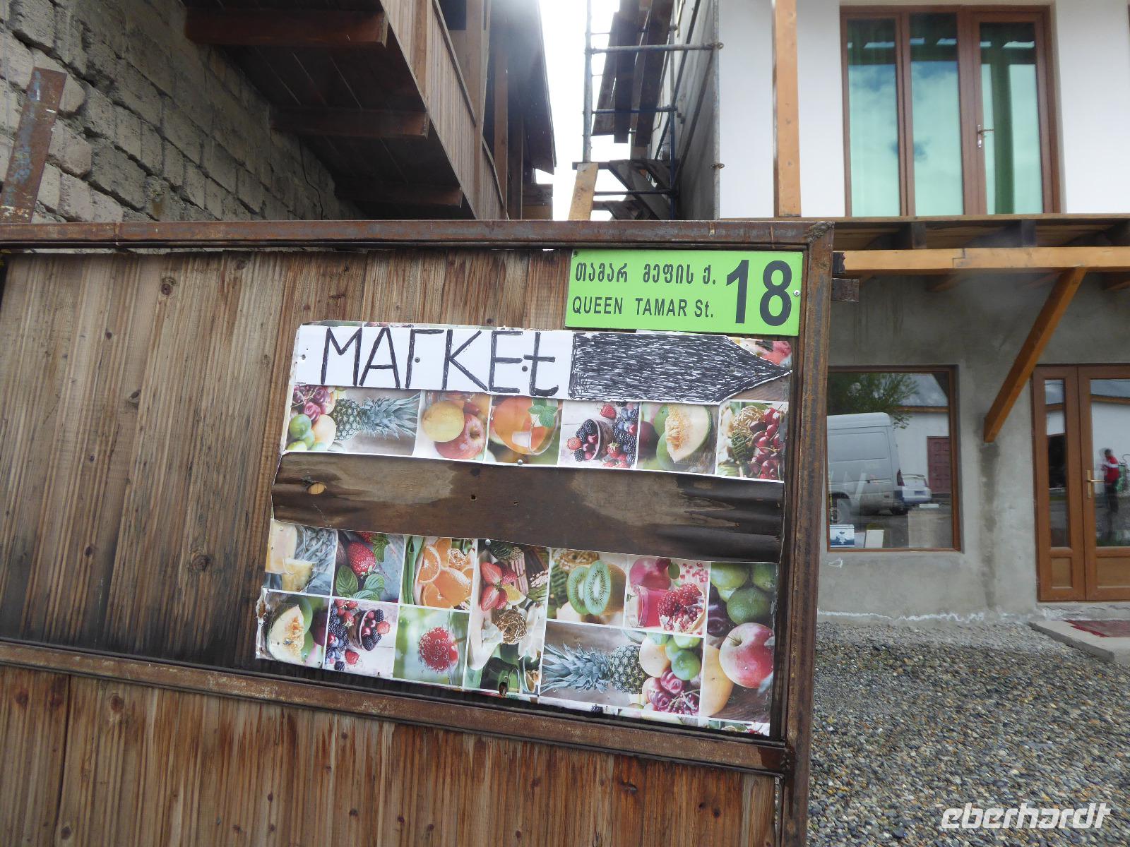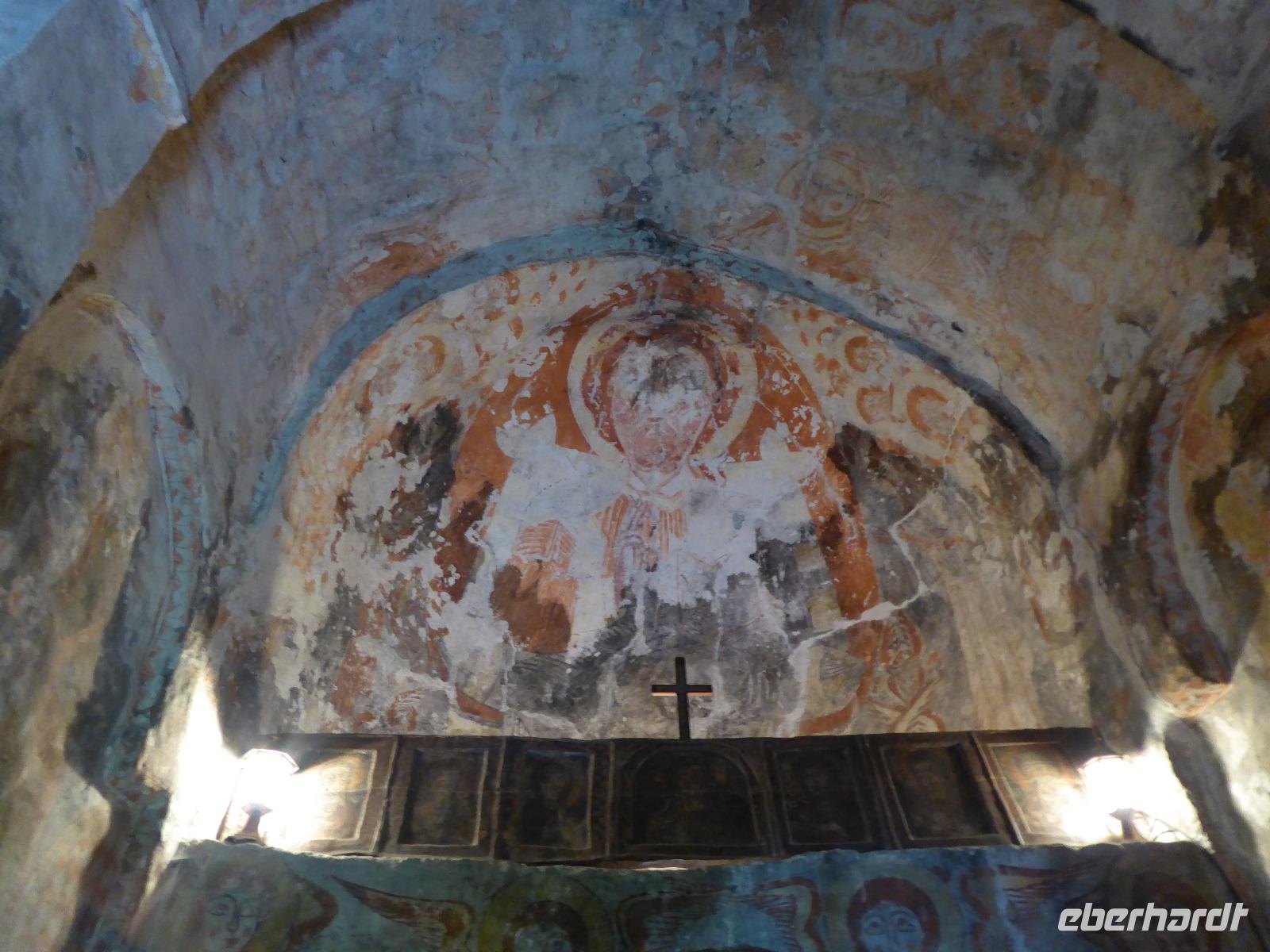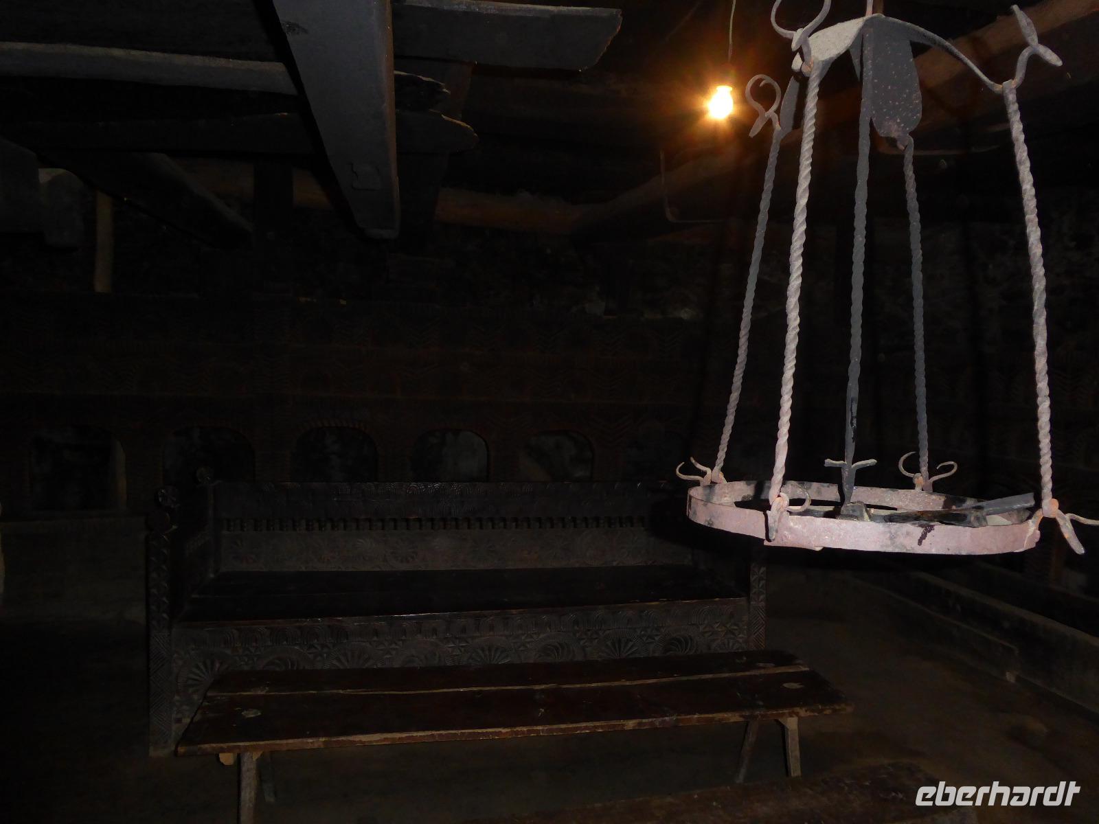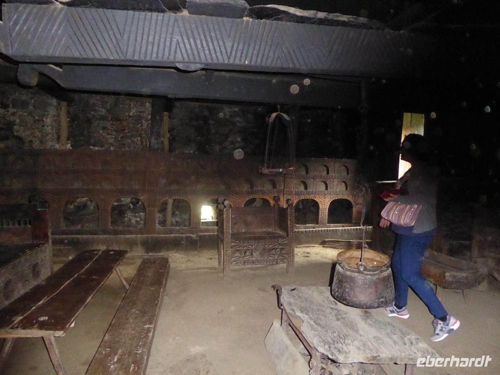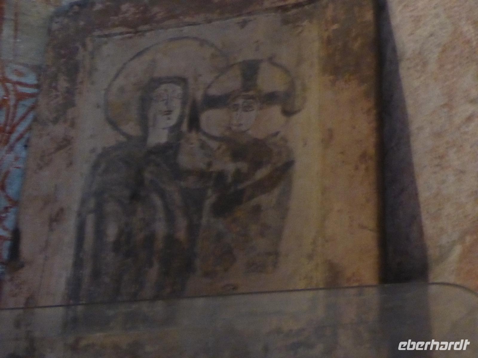 Nach dem Frühstück fahren wir zum Queen-Tamar Flughafen. Das futuristische Flughafengebäude passt so gar nicht zu den mittelalterlichen Türmen, die die Region prägen. Oder doch? Das Projekt stammt von einem Berliner Architekten namens Jürgen Mayer und wurde 2010 gebaut. Anschließend fahren wir zum Museum, das an das Leben, den Ruhm und den Tod des Bergsteigers Chergiani erinnert. Außer uns ist hier eine Gruppe einheimischer Jugendlicher unterwegs, die auf den Spuren ihrer georgischen Geschichte wandeln. Nach ihnen dürfen wir hinein. Im ersten Raum befinden sich einige Glasvitrinen, die das Leben des berühmten, 1968 verunglückten, Bergsteigers Chergiani schildern. Geführt werden wir erst von Natja und dann von einem Georgier. Moment mal, den kenne ich doch. Das ist doch der Neffe vom Chergiani. Dieses Mal traue ich mich, zu fragen, ob er sich mit mir fotografieren lässt. Wow :-), das gefällt mir. Nun fahren wir zum Matschubi-Museum. Ich erinnere mich, dass es auf dem Weg eine kleine Bude gibt, wo wir svanetisches Kräutersalz kaufen können. Dem ist auch so. Ein steiler Weg führt hierher und bis zum Museum. Ein Matschubi ist ein (ur-) altes svanisches Wohnhaus. In der Mitte befindet sich eine Feuerstelle. An dieser gibt es eine Art Thron, ein Holzsessel, auf dem nur der Familienälteste Platz nehmen durfte. Ringsherum sind Holzgestelle, in deren unteren Teil das Vieh untergebracht war und im oberen Teil die Menschen schliefen. Im gleichen Raum wurde auch gekocht und gegessen und sonst noch was. Mehrere Monate im Winter verbrachten die Familien hier. Wir gehen auch noch in den Keller, wo Vorräte sowie Wein und Honig gelagert wurden. Hier ist es dunkel und kalt. Nachdem wir das Matschubi verlassen haben, wartet ein weiteres Abenteuer auf uns. Wir besteigen einen Wehrturm. Drinnen ist es stockduster und man muss mehrere Barrieren überwinden, ehe man von einer Etage auf die andere kommt. So konnten sich die Svanen vor Angreifern schützen. Für uns ist es eine abenteuerliche Kletterpartie. Nun ist der Vormittag vorbei und wir wollen mit dem Sessellift auf den Zuruldi-Berg fahren, um dort die schöne Aussicht zu genießen und etwas zum Mittag zu essen. Es beginnt zu regnen. Noch sind wir optimistisch und fest entschlossen, unseren Plan umzusetzen. Wir fahren acht Kilometer nach Hatsvali. Inzwischen regnet es schon mehr. Natia und ich erkunden die Lage. Keine Chance. Es ist nicht erlaubt und wäre auch unvernünftig, jetzt mit dem Sessellift zu fahren. Also kehren wir um. Wir fahren ins Zentrum von Mestia und kehren im Café Laila ein. Wir probieren verschiedene georgische Gerichte, wie Suppen und fleischgefüllte Teigtaschen. Es ist gemütlich hier. Es regnet immer noch. Der Tag ist noch jung und wir fahren nun ins Historische Museum von Mestia. Hier sind neben alten Münzen und Speerspitzen, wertvolle Ikonen und Bücher zu bewundern. Es ist 15 Uhr. Immer noch zu früh, ins Hotel zu fahren. Natia macht eine Kirche ausfindig, in der es wertvolle Fresken zu sehen gibt. Es ist die Prophet Jonah Kirche in einem Ort vor Mestia (Lapatli). Vor dem Kirchlein haben sich ein paar tief schwarz gekleidete Frauen getroffen und bereiten ein Mahl vor. Diesen traurigen Grund möchten wir lieber nicht wissen. Das Kirchlein ist ziemlich mitgenommen, von den wertvollen Wandmalereien ist kaum etwas zu sehen. Außerdem sieht sie irgendwie verräuchert aus. Auf Nachfrage erfahren wir, dass hier Fleisch zubereitet wurde. Nun ja, auch alle Gläubigen müssen irgendwann etwas essen. Endlich hat es aufgehört zu regnen. Wir fahren zurück nach Mestia und verbringen dort eine Stunde Freizeit. Hätten wir gewusst, dass es erst 20 Uhr Abendessen gibt, hätten wir auch noch länger bleiben können.