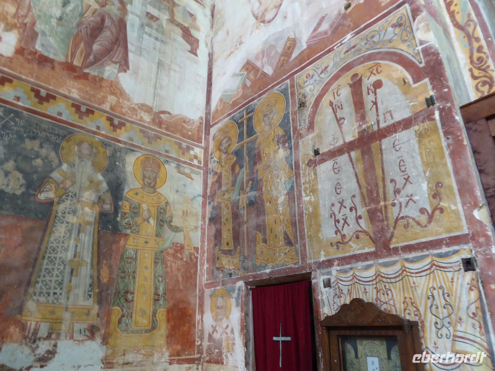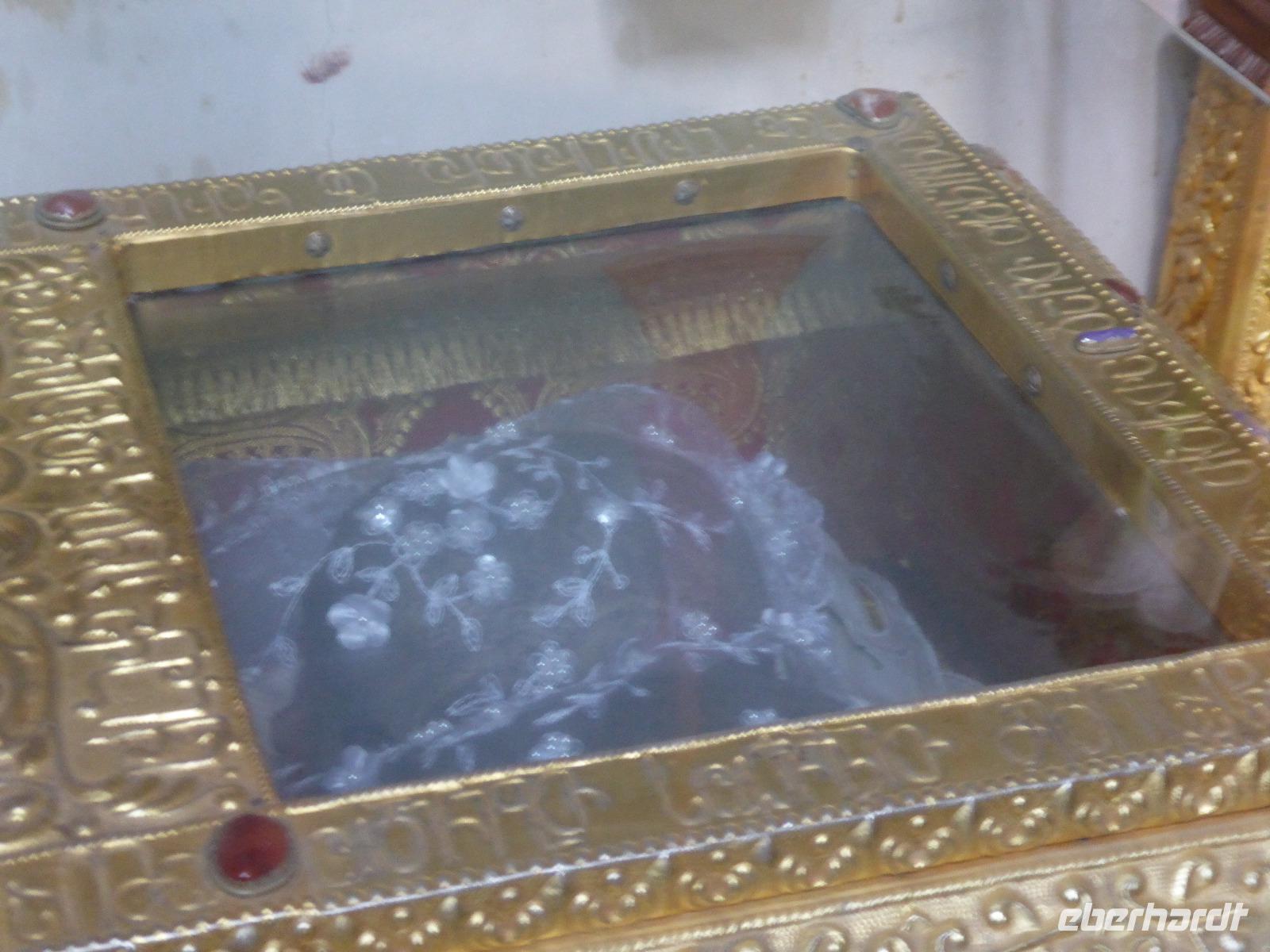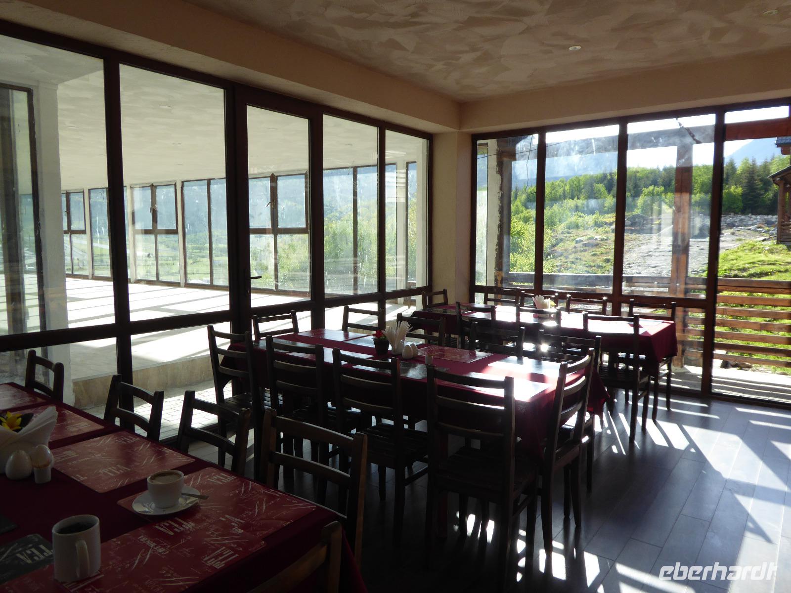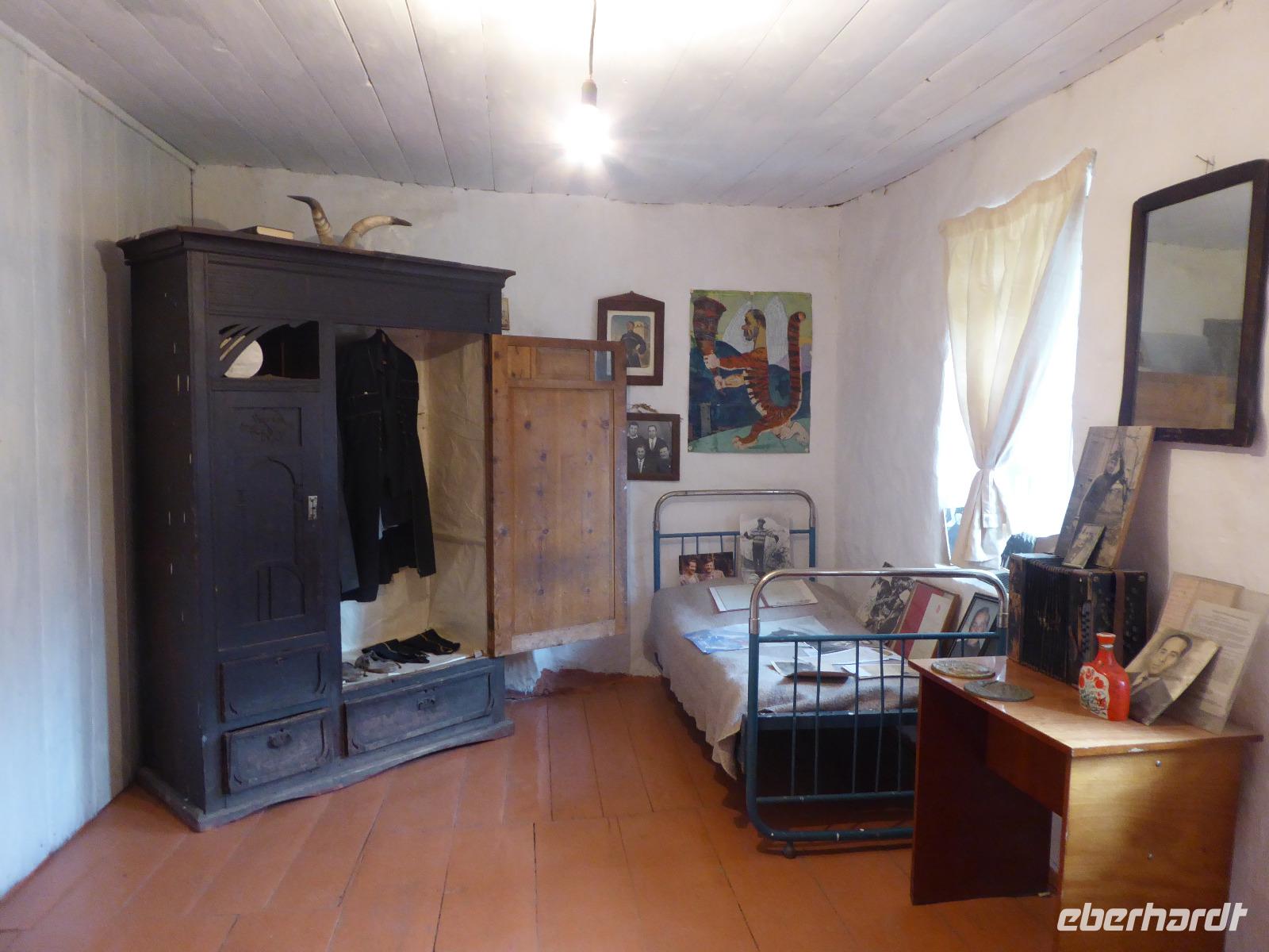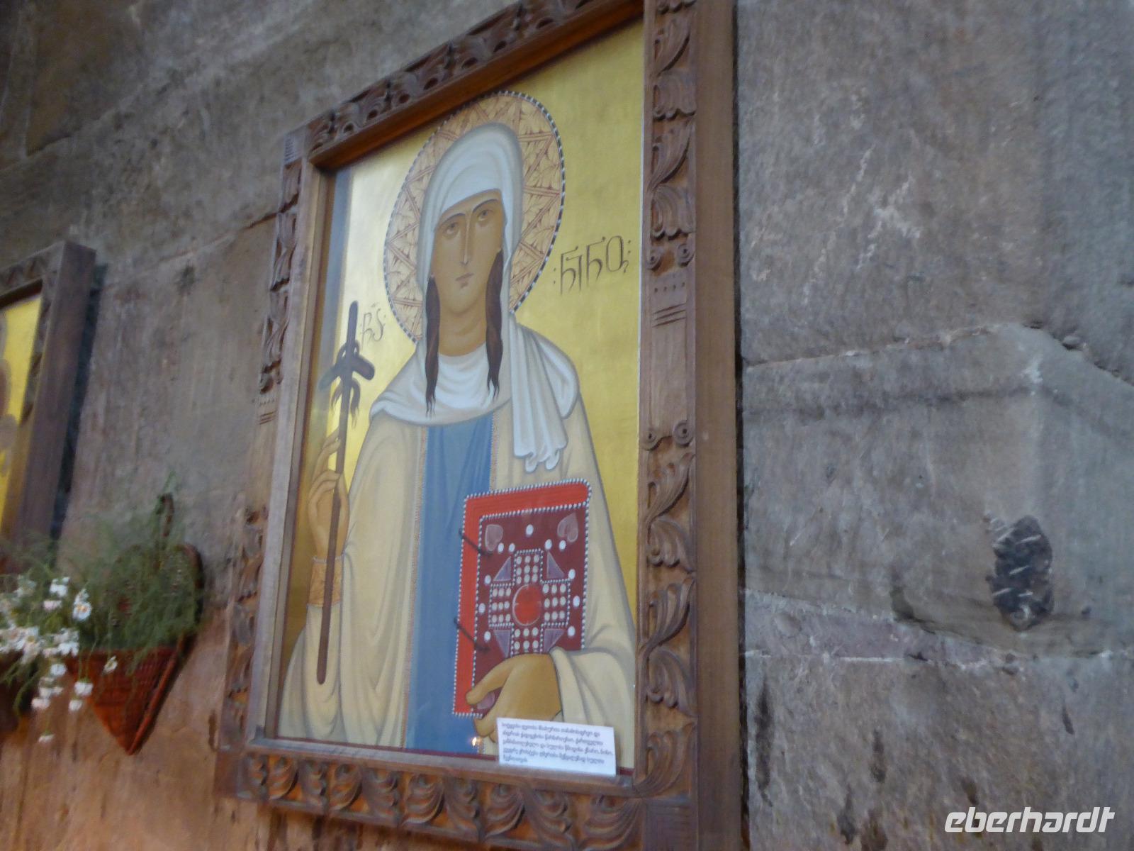 Nach dem Frühstück fahren wir zum Queen-Tamar Flughafen. Das futuristische Flughafengebäude passt so gar nicht zu den mittelalterlichen Türmen, die die Region prägen. Oder doch? Das Projekt stammt von einem Berliner Architekten namens Jürgen Mayer und wurde 2010 gebaut. Anschließend fahren wir zum Museum, das an das Leben, den Ruhm und den Tod des Bergsteigers Chergiani erinnert. Außer uns ist hier eine Gruppe einheimischer Jugendlicher unterwegs, die auf den Spuren ihrer georgischen Geschichte wandeln. Nach ihnen dürfen wir hinein. Im ersten Raum befinden sich einige Glasvitrinen, die das Leben des berühmten, 1968 verunglückten, Bergsteigers Chergiani schildern. Geführt werden wir erst von Natja und dann von einem Georgier. Moment mal, den kenne ich doch. Das ist doch der Neffe vom Chergiani. Dieses Mal traue ich mich, zu fragen, ob er sich mit mir fotografieren lässt. Wow :-), das gefällt mir. Nun fahren wir zum Matschubi-Museum. Ich erinnere mich, dass es auf dem Weg eine kleine Bude gibt, wo wir svanetisches Kräutersalz kaufen können. Dem ist auch so. Ein steiler Weg führt hierher und bis zum Museum. Ein Matschubi ist ein (ur-) altes svanisches Wohnhaus. In der Mitte befindet sich eine Feuerstelle. An dieser gibt es eine Art Thron, ein Holzsessel, auf dem nur der Familienälteste Platz nehmen durfte. Ringsherum sind Holzgestelle, in deren unteren Teil das Vieh untergebracht war und im oberen Teil die Menschen schliefen. Im gleichen Raum wurde auch gekocht und gegessen und sonst noch was. Mehrere Monate im Winter verbrachten die Familien hier. Wir gehen auch noch in den Keller, wo Vorräte sowie Wein und Honig gelagert wurden. Hier ist es dunkel und kalt. Nachdem wir das Matschubi verlassen haben, wartet ein weiteres Abenteuer auf uns. Wir besteigen einen Wehrturm. Drinnen ist es stockduster und man muss mehrere Barrieren überwinden, ehe man von einer Etage auf die andere kommt. So konnten sich die Svanen vor Angreifern schützen. Für uns ist es eine abenteuerliche Kletterpartie. Nun ist der Vormittag vorbei und wir wollen mit dem Sessellift auf den Zuruldi-Berg fahren, um dort die schöne Aussicht zu genießen und etwas zum Mittag zu essen. Es beginnt zu regnen. Noch sind wir optimistisch und fest entschlossen, unseren Plan umzusetzen. Wir fahren acht Kilometer nach Hatsvali. Inzwischen regnet es schon mehr. Natia und ich erkunden die Lage. Keine Chance. Es ist nicht erlaubt und wäre auch unvernünftig, jetzt mit dem Sessellift zu fahren. Also kehren wir um. Wir fahren ins Zentrum von Mestia und kehren im Café Laila ein. Wir probieren verschiedene georgische Gerichte, wie Suppen und fleischgefüllte Teigtaschen. Es ist gemütlich hier. Es regnet immer noch. Der Tag ist noch jung und wir fahren nun ins Historische Museum von Mestia. Hier sind neben alten Münzen und Speerspitzen, wertvolle Ikonen und Bücher zu bewundern. Es ist 15 Uhr. Immer noch zu früh, ins Hotel zu fahren. Natia macht eine Kirche ausfindig, in der es wertvolle Fresken zu sehen gibt. Es ist die Prophet Jonah Kirche in einem Ort vor Mestia (Lapatli). Vor dem Kirchlein haben sich ein paar tief schwarz gekleidete Frauen getroffen und bereiten ein Mahl vor. Diesen traurigen Grund möchten wir lieber nicht wissen. Das Kirchlein ist ziemlich mitgenommen, von den wertvollen Wandmalereien ist kaum etwas zu sehen. Außerdem sieht sie irgendwie verräuchert aus. Auf Nachfrage erfahren wir, dass hier Fleisch zubereitet wurde. Nun ja, auch alle Gläubigen müssen irgendwann etwas essen. Endlich hat es aufgehört zu regnen. Wir fahren zurück nach Mestia und verbringen dort eine Stunde Freizeit. Hätten wir gewusst, dass es erst 20 Uhr Abendessen gibt, hätten wir auch noch länger bleiben können.