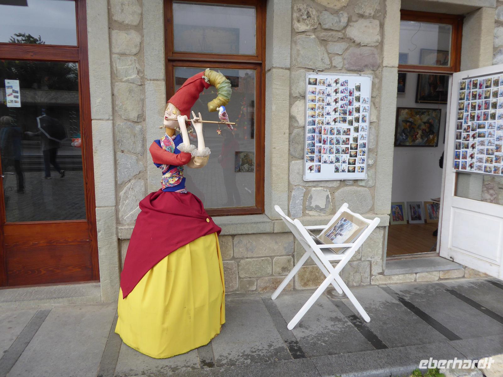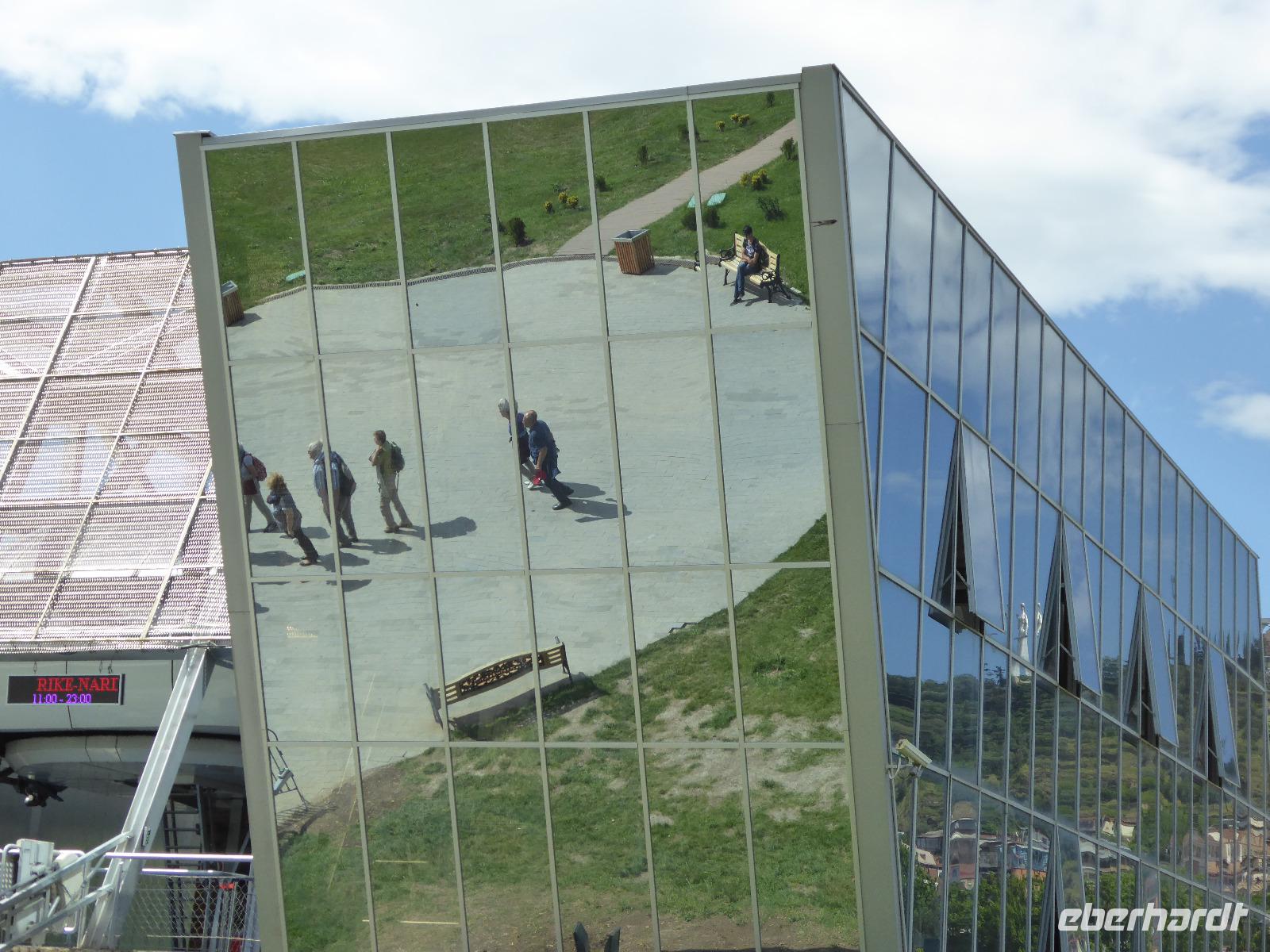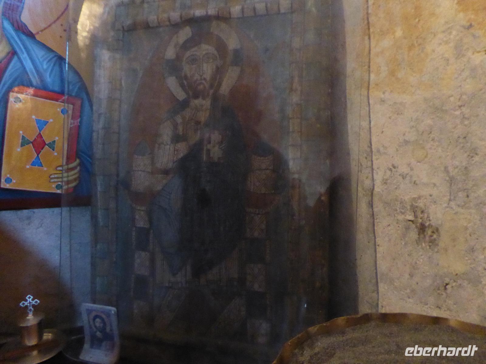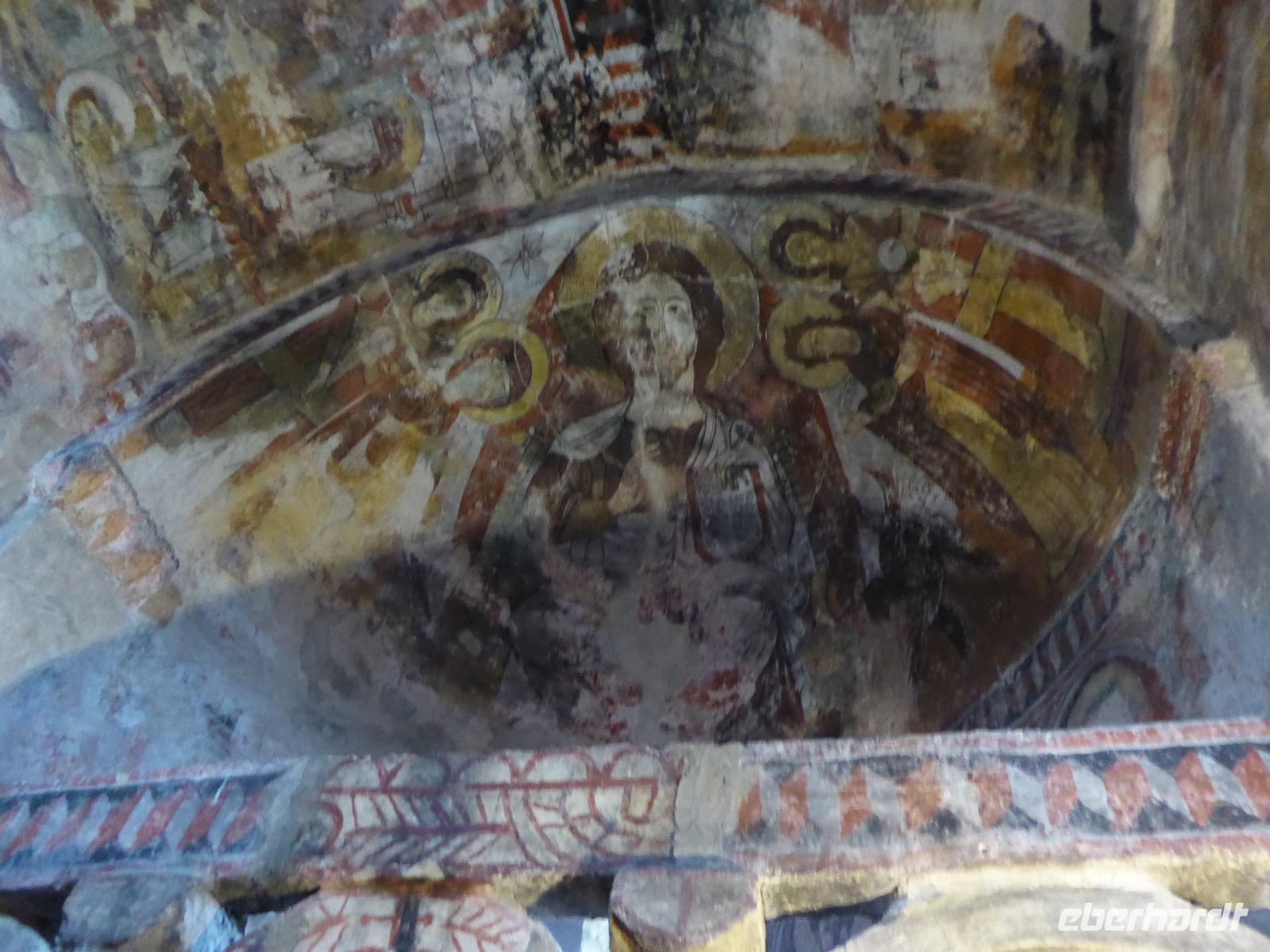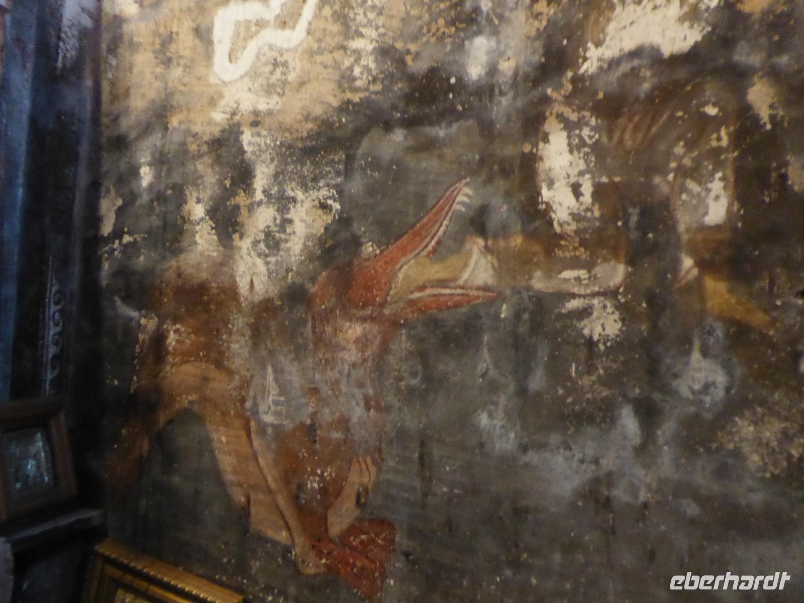 Nach dem Frühstück fahren wir zum Queen-Tamar Flughafen. Das futuristische Flughafengebäude passt so gar nicht zu den mittelalterlichen Türmen, die die Region prägen. Oder doch? Das Projekt stammt von einem Berliner Architekten namens Jürgen Mayer und wurde 2010 gebaut. Anschließend fahren wir zum Museum, das an das Leben, den Ruhm und den Tod des Bergsteigers Chergiani erinnert. Außer uns ist hier eine Gruppe einheimischer Jugendlicher unterwegs, die auf den Spuren ihrer georgischen Geschichte wandeln. Nach ihnen dürfen wir hinein. Im ersten Raum befinden sich einige Glasvitrinen, die das Leben des berühmten, 1968 verunglückten, Bergsteigers Chergiani schildern. Geführt werden wir erst von Natja und dann von einem Georgier. Moment mal, den kenne ich doch. Das ist doch der Neffe vom Chergiani. Dieses Mal traue ich mich, zu fragen, ob er sich mit mir fotografieren lässt. Wow :-), das gefällt mir. Nun fahren wir zum Matschubi-Museum. Ich erinnere mich, dass es auf dem Weg eine kleine Bude gibt, wo wir svanetisches Kräutersalz kaufen können. Dem ist auch so. Ein steiler Weg führt hierher und bis zum Museum. Ein Matschubi ist ein (ur-) altes svanisches Wohnhaus. In der Mitte befindet sich eine Feuerstelle. An dieser gibt es eine Art Thron, ein Holzsessel, auf dem nur der Familienälteste Platz nehmen durfte. Ringsherum sind Holzgestelle, in deren unteren Teil das Vieh untergebracht war und im oberen Teil die Menschen schliefen. Im gleichen Raum wurde auch gekocht und gegessen und sonst noch was. Mehrere Monate im Winter verbrachten die Familien hier. Wir gehen auch noch in den Keller, wo Vorräte sowie Wein und Honig gelagert wurden. Hier ist es dunkel und kalt. Nachdem wir das Matschubi verlassen haben, wartet ein weiteres Abenteuer auf uns. Wir besteigen einen Wehrturm. Drinnen ist es stockduster und man muss mehrere Barrieren überwinden, ehe man von einer Etage auf die andere kommt. So konnten sich die Svanen vor Angreifern schützen. Für uns ist es eine abenteuerliche Kletterpartie. Nun ist der Vormittag vorbei und wir wollen mit dem Sessellift auf den Zuruldi-Berg fahren, um dort die schöne Aussicht zu genießen und etwas zum Mittag zu essen. Es beginnt zu regnen. Noch sind wir optimistisch und fest entschlossen, unseren Plan umzusetzen. Wir fahren acht Kilometer nach Hatsvali. Inzwischen regnet es schon mehr. Natia und ich erkunden die Lage. Keine Chance. Es ist nicht erlaubt und wäre auch unvernünftig, jetzt mit dem Sessellift zu fahren. Also kehren wir um. Wir fahren ins Zentrum von Mestia und kehren im Café Laila ein. Wir probieren verschiedene georgische Gerichte, wie Suppen und fleischgefüllte Teigtaschen. Es ist gemütlich hier. Es regnet immer noch. Der Tag ist noch jung und wir fahren nun ins Historische Museum von Mestia. Hier sind neben alten Münzen und Speerspitzen, wertvolle Ikonen und Bücher zu bewundern. Es ist 15 Uhr. Immer noch zu früh, ins Hotel zu fahren. Natia macht eine Kirche ausfindig, in der es wertvolle Fresken zu sehen gibt. Es ist die Prophet Jonah Kirche in einem Ort vor Mestia (Lapatli). Vor dem Kirchlein haben sich ein paar tief schwarz gekleidete Frauen getroffen und bereiten ein Mahl vor. Diesen traurigen Grund möchten wir lieber nicht wissen. Das Kirchlein ist ziemlich mitgenommen, von den wertvollen Wandmalereien ist kaum etwas zu sehen. Außerdem sieht sie irgendwie verräuchert aus. Auf Nachfrage erfahren wir, dass hier Fleisch zubereitet wurde. Nun ja, auch alle Gläubigen müssen irgendwann etwas essen. Endlich hat es aufgehört zu regnen. Wir fahren zurück nach Mestia und verbringen dort eine Stunde Freizeit. Hätten wir gewusst, dass es erst 20 Uhr Abendessen gibt, hätten wir auch noch länger bleiben können.