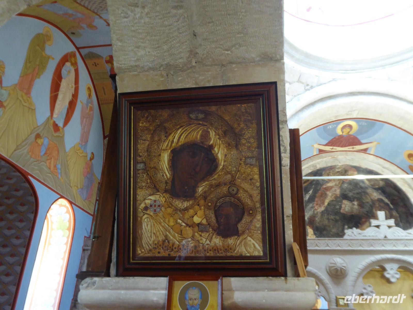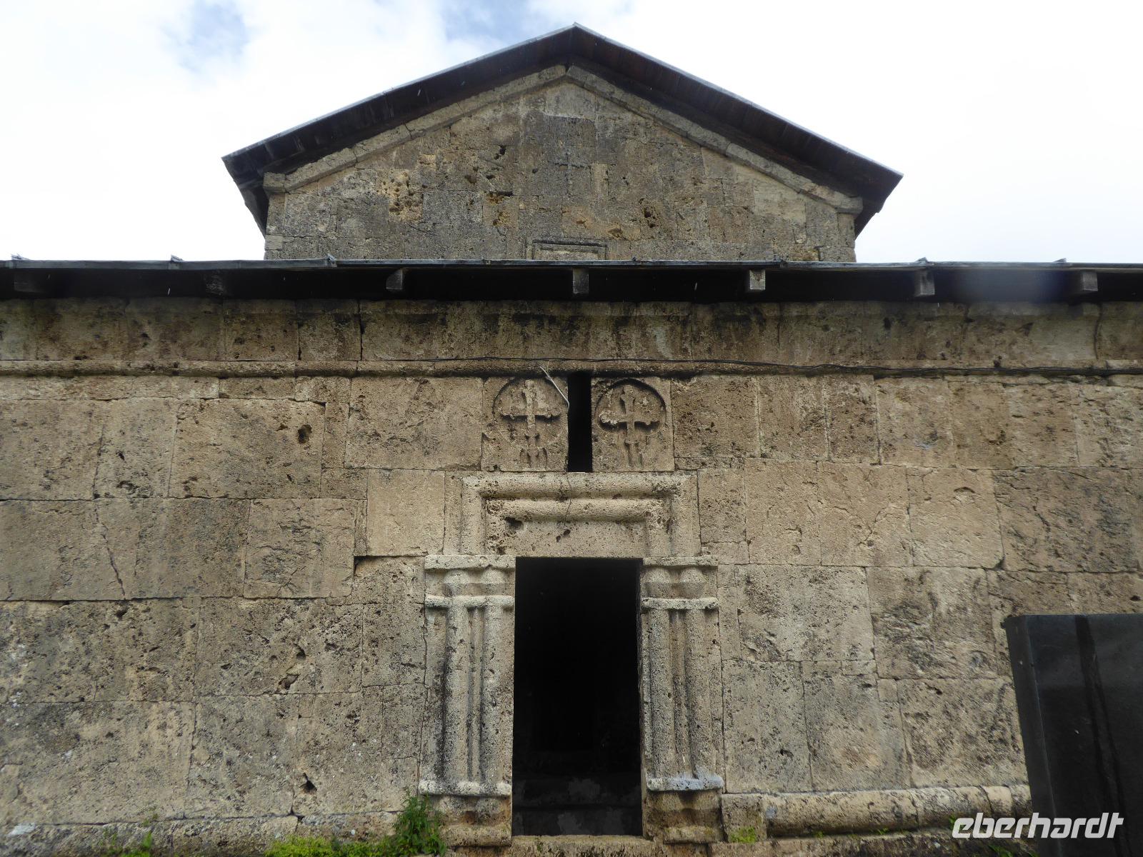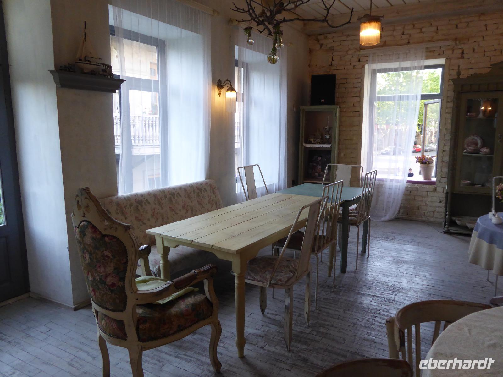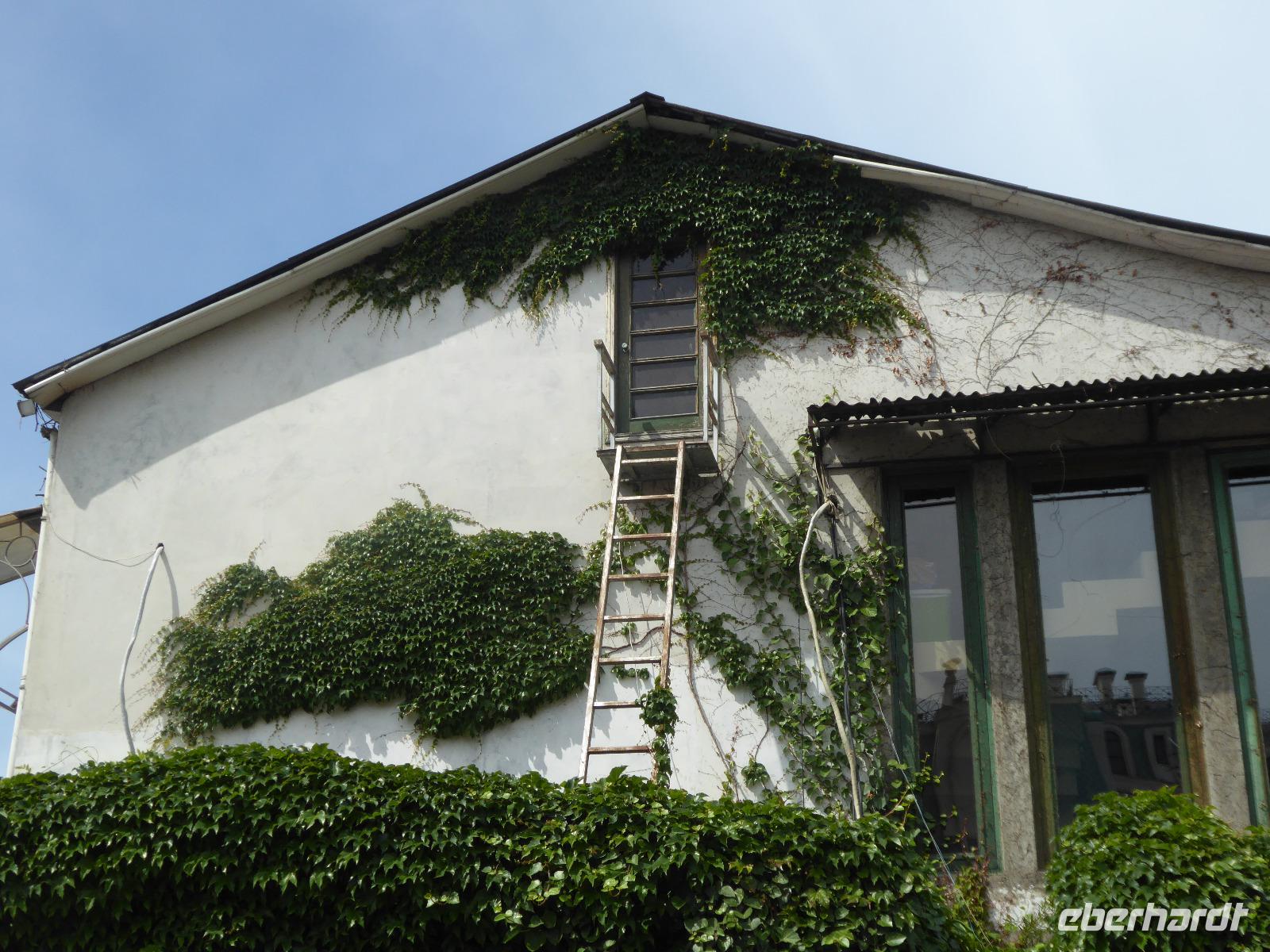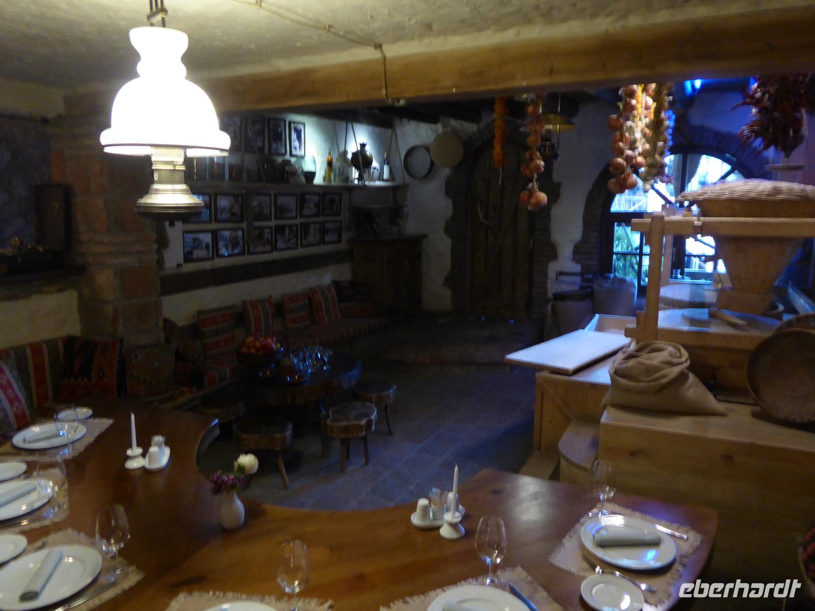Nach dem Frühstück fahren wir zum Queen-Tamar Flughafen. Das futuristische Flughafengebäude passt so gar nicht zu den mittelalterlichen Türmen, die die Region prägen. Oder doch? Das Projekt stammt von einem Berliner Architekten namens Jürgen Mayer und wurde 2010 gebaut. Anschließend fahren wir zum Museum, das an das Leben, den Ruhm und den Tod des Bergsteigers Chergiani erinnert. Außer uns ist hier eine Gruppe einheimischer Jugendlicher unterwegs, die auf den Spuren ihrer georgischen Geschichte wandeln. Nach ihnen dürfen wir hinein. Im ersten Raum befinden sich einige Glasvitrinen, die das Leben des berühmten, 1968 verunglückten, Bergsteigers Chergiani schildern. Geführt werden wir erst von Natja und dann von einem Georgier. Moment mal, den kenne ich doch. Das ist doch der Neffe vom Chergiani. Dieses Mal traue ich mich, zu fragen, ob er sich mit mir fotografieren lässt. Wow :-), das gefällt mir. Nun fahren wir zum Matschubi-Museum. Ich erinnere mich, dass es auf dem Weg eine kleine Bude gibt, wo wir svanetisches Kräutersalz kaufen können. Dem ist auch so. Ein steiler Weg führt hierher und bis zum Museum. Ein Matschubi ist ein (ur-) altes svanisches Wohnhaus. In der Mitte befindet sich eine Feuerstelle. An dieser gibt es eine Art Thron, ein Holzsessel, auf dem nur der Familienälteste Platz nehmen durfte. Ringsherum sind Holzgestelle, in deren unteren Teil das Vieh untergebracht war und im oberen Teil die Menschen schliefen. Im gleichen Raum wurde auch gekocht und gegessen und sonst noch was. Mehrere Monate im Winter verbrachten die Familien hier. Wir gehen auch noch in den Keller, wo Vorräte sowie Wein und Honig gelagert wurden. Hier ist es dunkel und kalt. Nachdem wir das Matschubi verlassen haben, wartet ein weiteres Abenteuer auf uns. Wir besteigen einen Wehrturm. Drinnen ist es stockduster und man muss mehrere Barrieren überwinden, ehe man von einer Etage auf die andere kommt. So konnten sich die Svanen vor Angreifern schützen. Für uns ist es eine abenteuerliche Kletterpartie. Nun ist der Vormittag vorbei und wir wollen mit dem Sessellift auf den Zuruldi-Berg fahren, um dort die schöne Aussicht zu genießen und etwas zum Mittag zu essen. Es beginnt zu regnen. Noch sind wir optimistisch und fest entschlossen, unseren Plan umzusetzen. Wir fahren acht Kilometer nach Hatsvali. Inzwischen regnet es schon mehr. Natia und ich erkunden die Lage. Keine Chance. Es ist nicht erlaubt und wäre auch unvernünftig, jetzt mit dem Sessellift zu fahren. Also kehren wir um. Wir fahren ins Zentrum von Mestia und kehren im Café Laila ein. Wir probieren verschiedene georgische Gerichte, wie Suppen und fleischgefüllte Teigtaschen. Es ist gemütlich hier. Es regnet immer noch. Der Tag ist noch jung und wir fahren nun ins Historische Museum von Mestia. Hier sind neben alten Münzen und Speerspitzen, wertvolle Ikonen und Bücher zu bewundern. Es ist 15 Uhr. Immer noch zu früh, ins Hotel zu fahren. Natia macht eine Kirche ausfindig, in der es wertvolle Fresken zu sehen gibt. Es ist die Prophet Jonah Kirche in einem Ort vor Mestia (Lapatli). Vor dem Kirchlein haben sich ein paar tief schwarz gekleidete Frauen getroffen und bereiten ein Mahl vor. Diesen traurigen Grund möchten wir lieber nicht wissen. Das Kirchlein ist ziemlich mitgenommen, von den wertvollen Wandmalereien ist kaum etwas zu sehen. Außerdem sieht sie irgendwie verräuchert aus. Auf Nachfrage erfahren wir, dass hier Fleisch zubereitet wurde. Nun ja, auch alle Gläubigen müssen irgendwann etwas essen. Endlich hat es aufgehört zu regnen. Wir fahren zurück nach Mestia und verbringen dort eine Stunde Freizeit. Hätten wir gewusst, dass es erst 20 Uhr Abendessen gibt, hätten wir auch noch länger bleiben können.