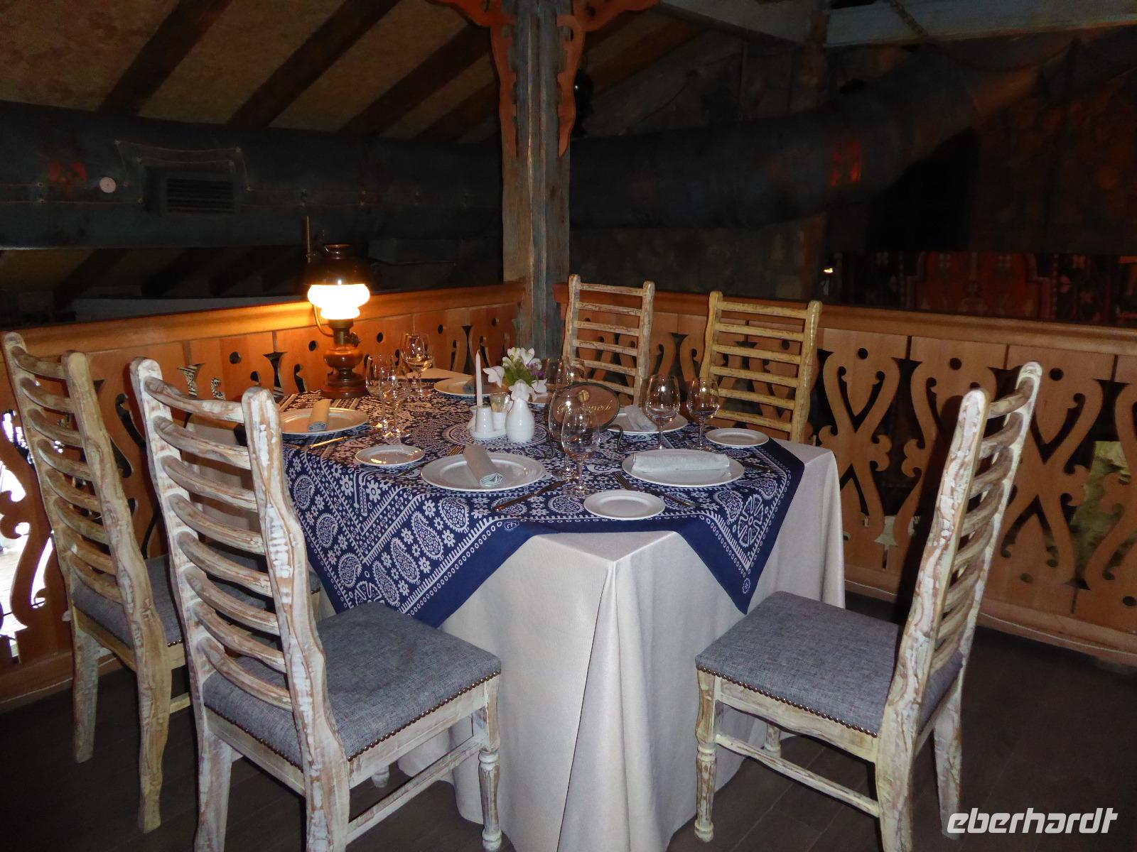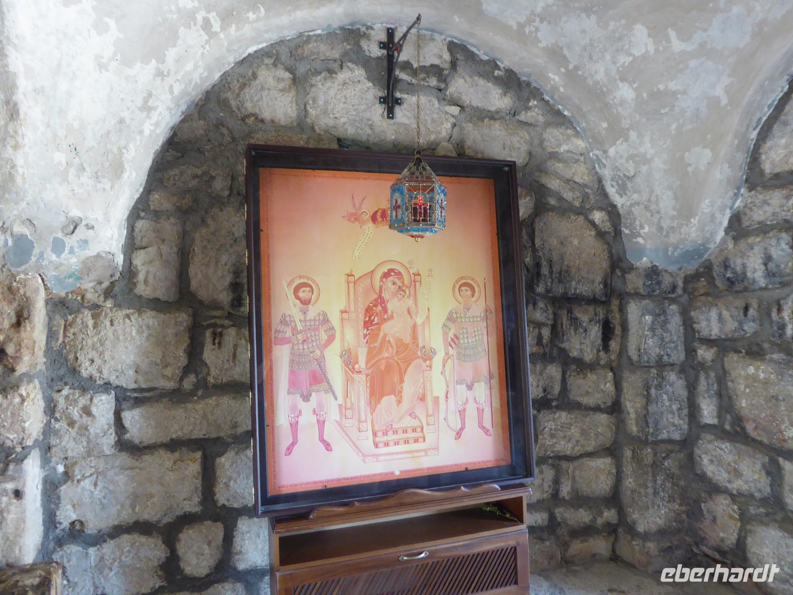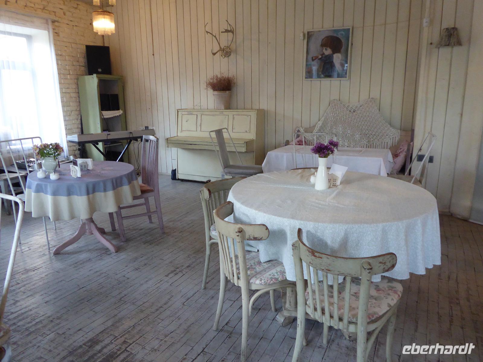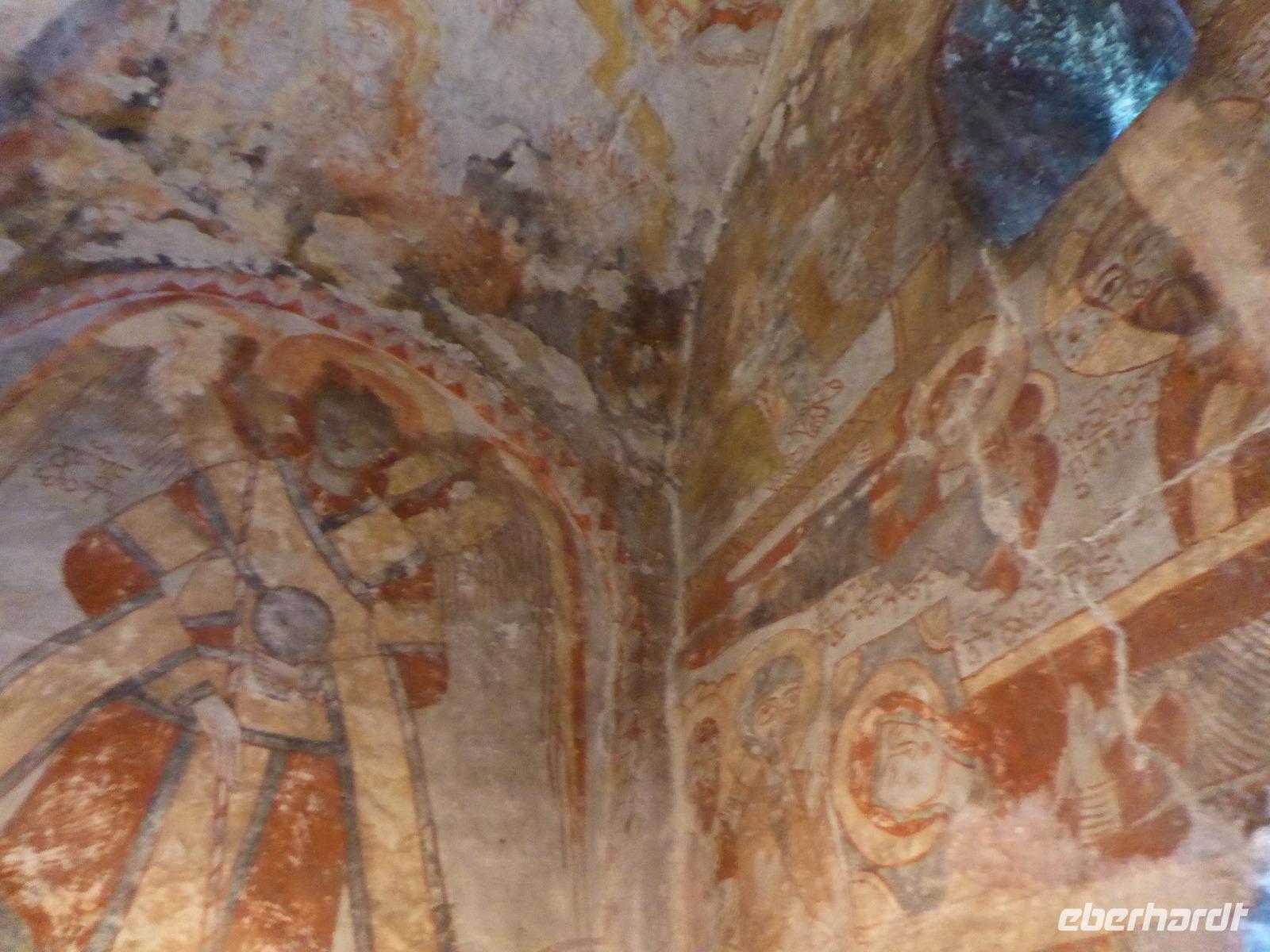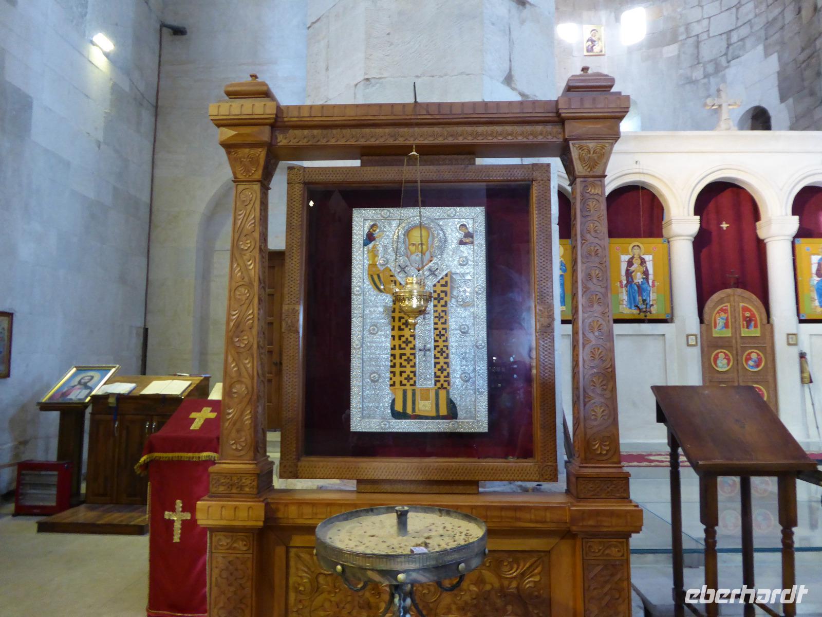 Nach dem Frühstück fahren wir zum Queen-Tamar Flughafen. Das futuristische Flughafengebäude passt so gar nicht zu den mittelalterlichen Türmen, die die Region prägen. Oder doch? Das Projekt stammt von einem Berliner Architekten namens Jürgen Mayer und wurde 2010 gebaut. Anschließend fahren wir zum Museum, das an das Leben, den Ruhm und den Tod des Bergsteigers Chergiani erinnert. Außer uns ist hier eine Gruppe einheimischer Jugendlicher unterwegs, die auf den Spuren ihrer georgischen Geschichte wandeln. Nach ihnen dürfen wir hinein. Im ersten Raum befinden sich einige Glasvitrinen, die das Leben des berühmten, 1968 verunglückten, Bergsteigers Chergiani schildern. Geführt werden wir erst von Natja und dann von einem Georgier. Moment mal, den kenne ich doch. Das ist doch der Neffe vom Chergiani. Dieses Mal traue ich mich, zu fragen, ob er sich mit mir fotografieren lässt. Wow :-), das gefällt mir. Nun fahren wir zum Matschubi-Museum. Ich erinnere mich, dass es auf dem Weg eine kleine Bude gibt, wo wir svanetisches Kräutersalz kaufen können. Dem ist auch so. Ein steiler Weg führt hierher und bis zum Museum. Ein Matschubi ist ein (ur-) altes svanisches Wohnhaus. In der Mitte befindet sich eine Feuerstelle. An dieser gibt es eine Art Thron, ein Holzsessel, auf dem nur der Familienälteste Platz nehmen durfte. Ringsherum sind Holzgestelle, in deren unteren Teil das Vieh untergebracht war und im oberen Teil die Menschen schliefen. Im gleichen Raum wurde auch gekocht und gegessen und sonst noch was. Mehrere Monate im Winter verbrachten die Familien hier. Wir gehen auch noch in den Keller, wo Vorräte sowie Wein und Honig gelagert wurden. Hier ist es dunkel und kalt. Nachdem wir das Matschubi verlassen haben, wartet ein weiteres Abenteuer auf uns. Wir besteigen einen Wehrturm. Drinnen ist es stockduster und man muss mehrere Barrieren überwinden, ehe man von einer Etage auf die andere kommt. So konnten sich die Svanen vor Angreifern schützen. Für uns ist es eine abenteuerliche Kletterpartie. Nun ist der Vormittag vorbei und wir wollen mit dem Sessellift auf den Zuruldi-Berg fahren, um dort die schöne Aussicht zu genießen und etwas zum Mittag zu essen. Es beginnt zu regnen. Noch sind wir optimistisch und fest entschlossen, unseren Plan umzusetzen. Wir fahren acht Kilometer nach Hatsvali. Inzwischen regnet es schon mehr. Natia und ich erkunden die Lage. Keine Chance. Es ist nicht erlaubt und wäre auch unvernünftig, jetzt mit dem Sessellift zu fahren. Also kehren wir um. Wir fahren ins Zentrum von Mestia und kehren im Café Laila ein. Wir probieren verschiedene georgische Gerichte, wie Suppen und fleischgefüllte Teigtaschen. Es ist gemütlich hier. Es regnet immer noch. Der Tag ist noch jung und wir fahren nun ins Historische Museum von Mestia. Hier sind neben alten Münzen und Speerspitzen, wertvolle Ikonen und Bücher zu bewundern. Es ist 15 Uhr. Immer noch zu früh, ins Hotel zu fahren. Natia macht eine Kirche ausfindig, in der es wertvolle Fresken zu sehen gibt. Es ist die Prophet Jonah Kirche in einem Ort vor Mestia (Lapatli). Vor dem Kirchlein haben sich ein paar tief schwarz gekleidete Frauen getroffen und bereiten ein Mahl vor. Diesen traurigen Grund möchten wir lieber nicht wissen. Das Kirchlein ist ziemlich mitgenommen, von den wertvollen Wandmalereien ist kaum etwas zu sehen. Außerdem sieht sie irgendwie verräuchert aus. Auf Nachfrage erfahren wir, dass hier Fleisch zubereitet wurde. Nun ja, auch alle Gläubigen müssen irgendwann etwas essen. Endlich hat es aufgehört zu regnen. Wir fahren zurück nach Mestia und verbringen dort eine Stunde Freizeit. Hätten wir gewusst, dass es erst 20 Uhr Abendessen gibt, hätten wir auch noch länger bleiben können.