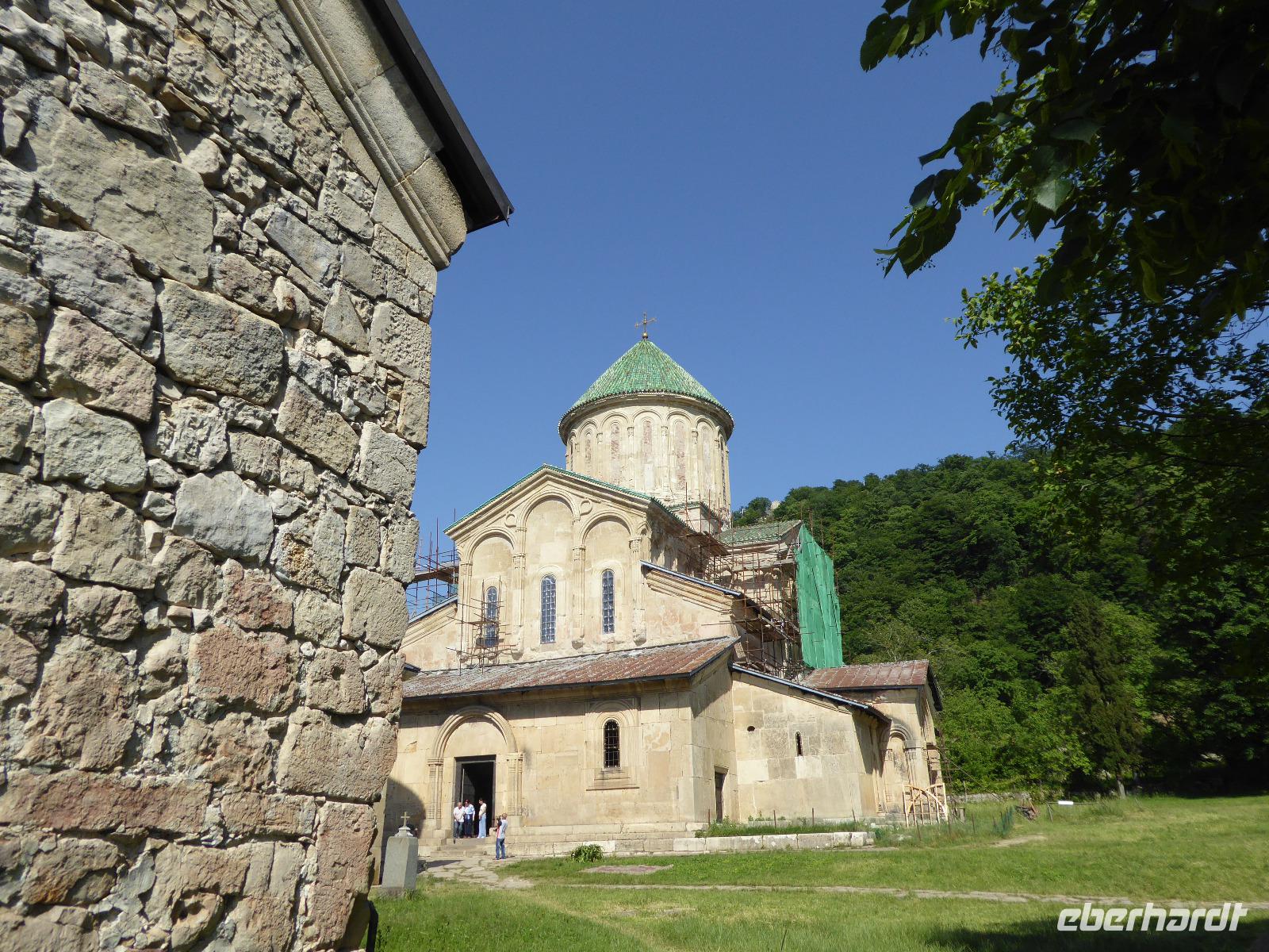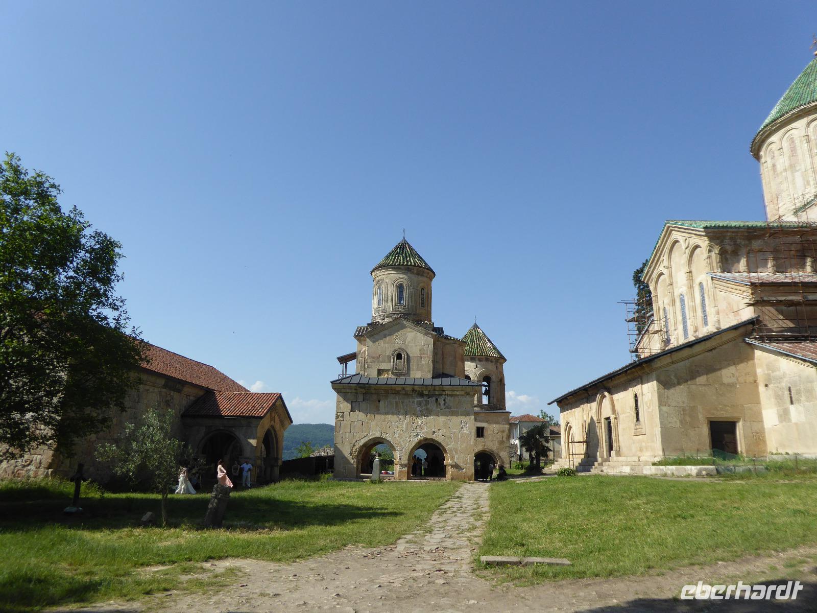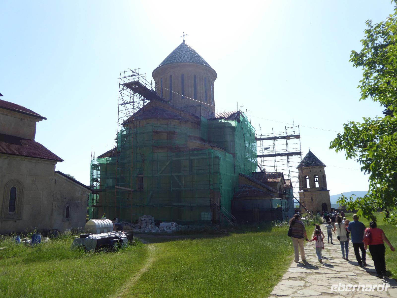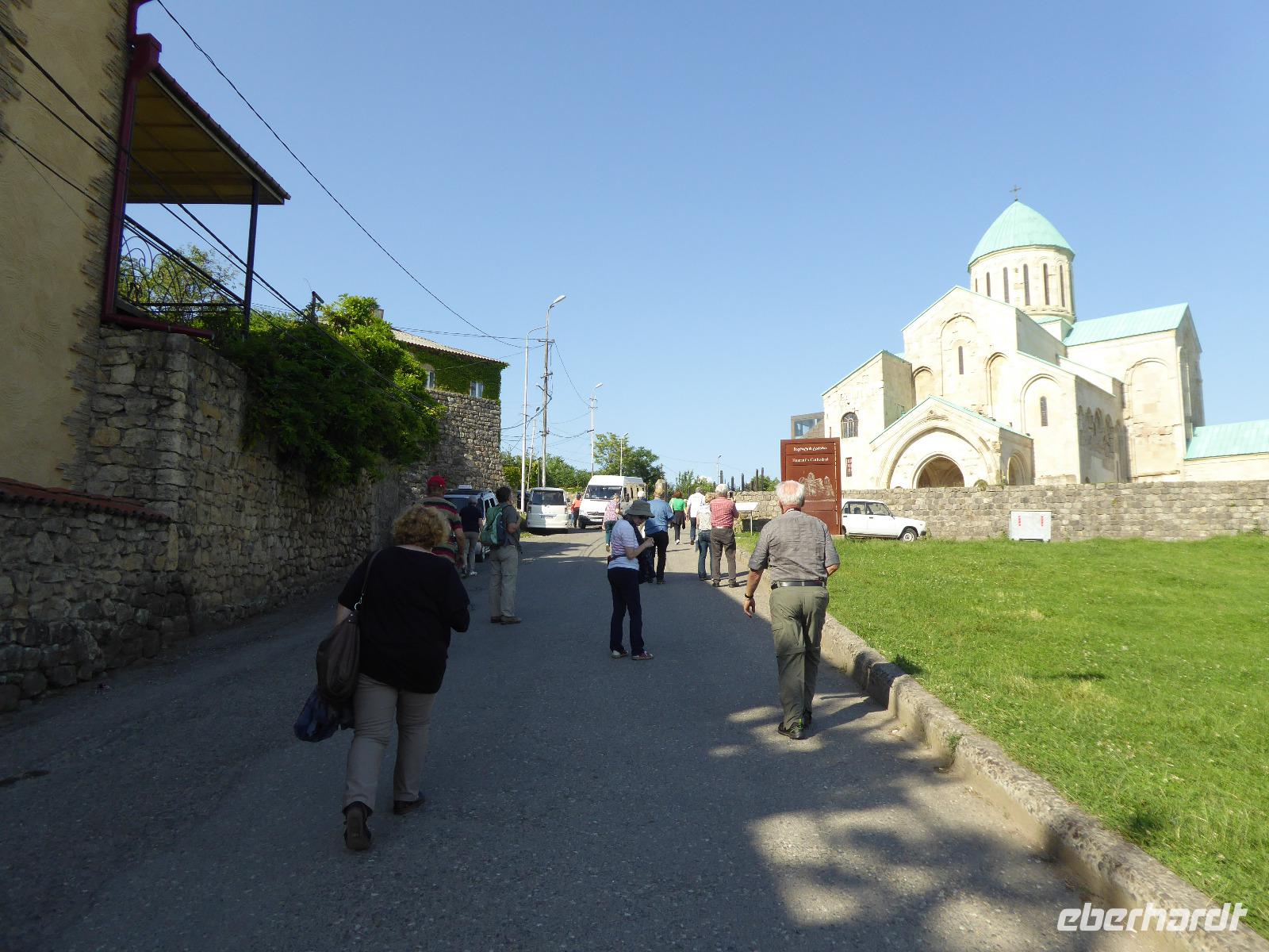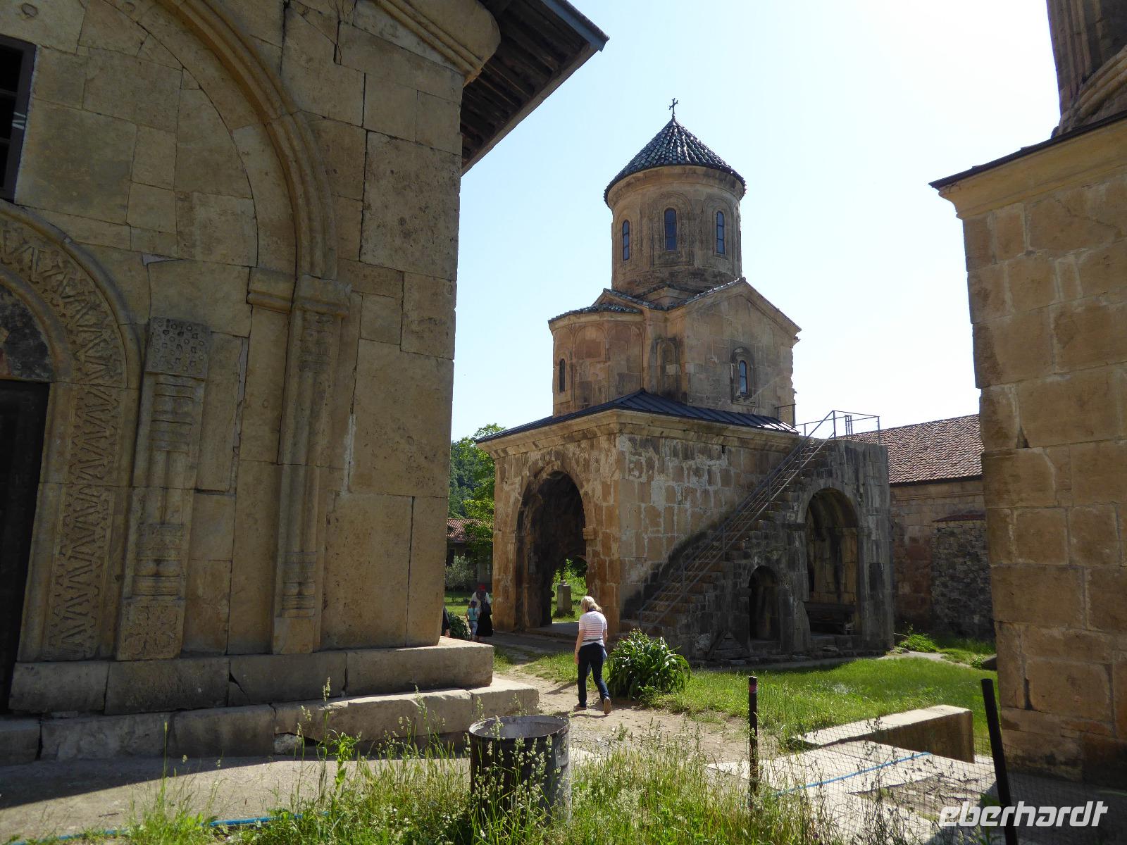 Der Tag sollte mit einem Lied beginnen. Und so bekommen unsere Geburtstagskinder ihr Ständchen. Heute verlassen wir Mestia, den Kaukasus und Svanetien. Fünf lange Fahrstunden liegen vor uns. Die fantastischen Aussichten lassen die Zeit jedoch (fast) wie im Flug vergehen. Zum Mittagessen kehren wir im Restaurant Host ein, wo uns unsere Geburtstagskinder auf ein Glas Rotwein und eine Khinkali-Verkostung einladen. Gar nicht so einfach, die Dinger auszuzutscheln, was? Aber es schmeckt! Dankeschön :-)! Noch knapp hundert Kilometer bis Zugdidi. Die Stadt ist in einem erbarmungswürdigen Zustand. Wir fahren nach Motsmeta, der Märtyrerstätte. Hier liegen die sterblichen Überreste zweier Fürstensöhne, die im 11. Jahrhundert gegen die Araber gekämpft und verloren haben. Sie wurden gefoltert, getötet und ihre Leichen in den Fluss geworfen. Dorfbewohner holten die Körper der Geschundenen aus dem Fluss und versteckten diese. Später wurde die Kirche gebaut, in der ein gläserner Sarg steht, in dem sich die Gebeine befinden. Heute tragen sie dazu bei, Wünsche zu erfüllen. Nicht nur Kinder glauben daran. Auch Erwachsene kriechen unter dem gläsernen Sarg hindurch, um ihre Wünsche wahr werden zu lassen. Unser nächstes Ziel ist das Gelati-Kloster. Hier sind David der Erbauer und andere Könige sowie Königinnen Georgiens begraben. Gelati war bekannt für Gold- und Silberschmiedekunst. Außerdem gab es hier eine Akademie, an der berühmte Professoren lehrten. Alles ist lange her. Heute treten sich hier die Touristen gegenseitig auf die Füße und rastlose Restauratoren versuchen, die Anlage instand zu halten. Unser letztes Ziel heute ist die Bagrati-Kathedrale. Anfang des 11. Jahrhunderts erbaut, wurde sie fünfhundert Jahre später von osmanischen Feinden in die Luft gesprengt. Erst 1952 begannen die ersten Wiederaufbauarbeiten. Seit 2012 sind diese weitestgehend fertig gestellt. Uns zieht es jetzt ins Hotel. Endlich ein bisschen frisch machen. Dann fahren wir zum Restaurant Palata. Heute werden sich die Tische unter den Speisen biegen. Was für ein Mahl. Wir haben gemeinsam protokolliert, was es alles zu essen gab: Gurken- Tomatensalat, Geflügel in Walnuss-Soße mit Safran, Spinatbällchen (mit Koriander), Salat mit gebratenem Hähnchen, Weißbrot; Chachapuri, Schaschlik, Pommes Frites, Bohnensalat, Peperonisalat, Mirabellensoße, eingelegte Pilze; Kaffee und Tee, große Obstteller. Dick und rund gefuttert, spazieren wir zum Hotel zurück. Ein weiterer schöner Tag in Georgien geht zu Ende. Gute Nacht, Ihr Lieben.