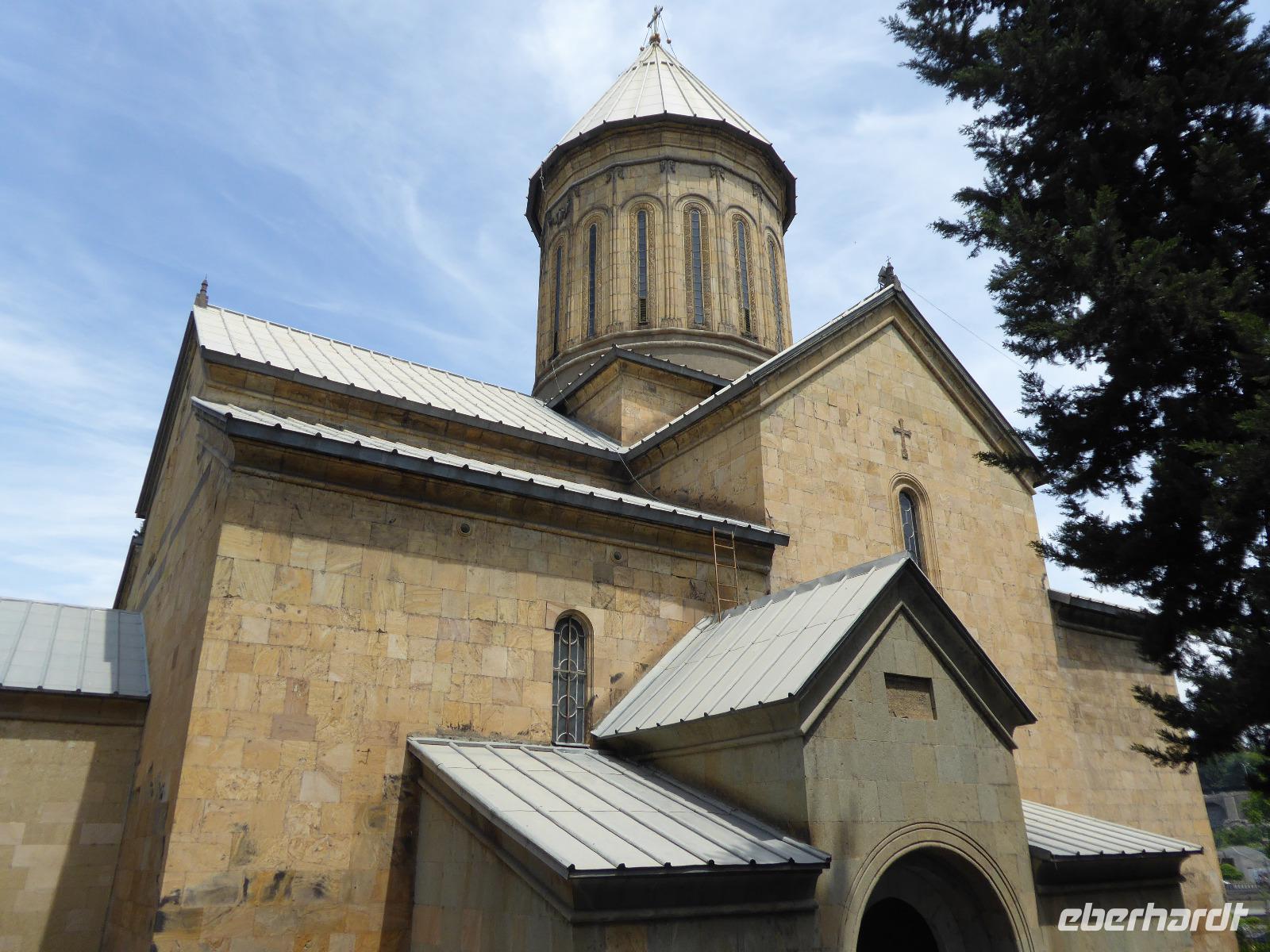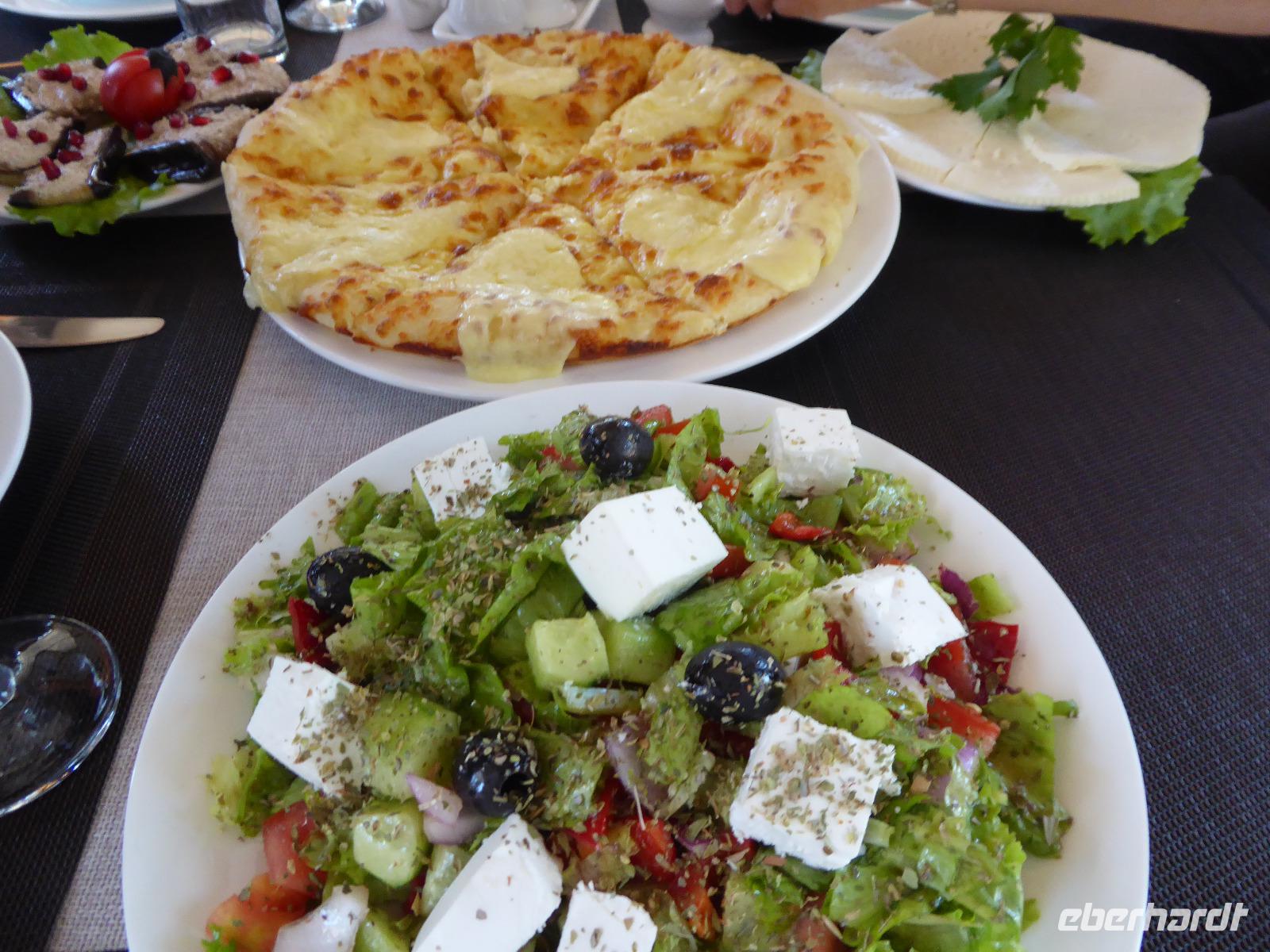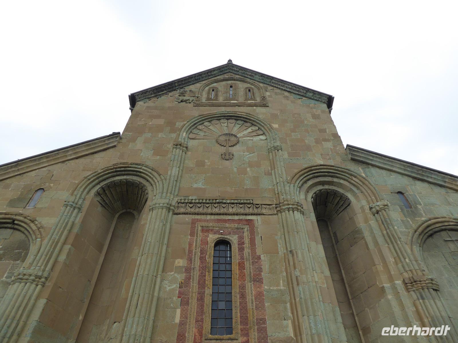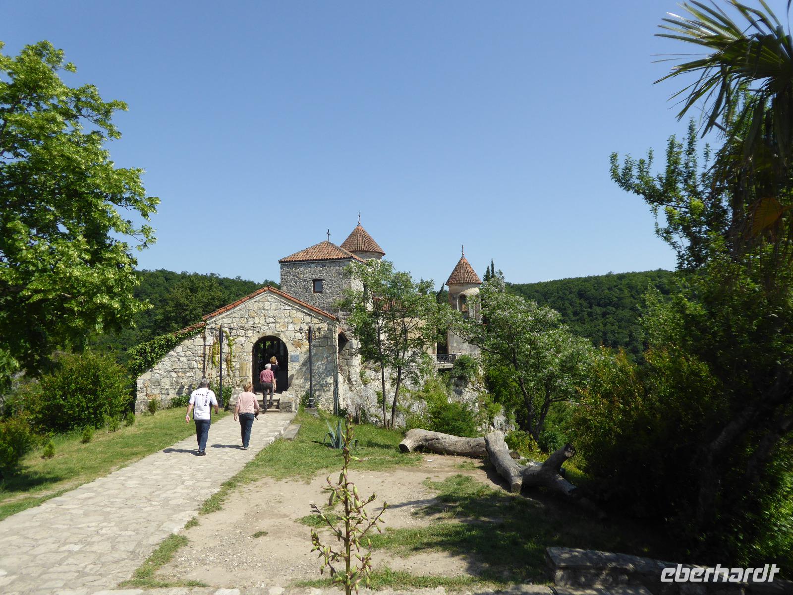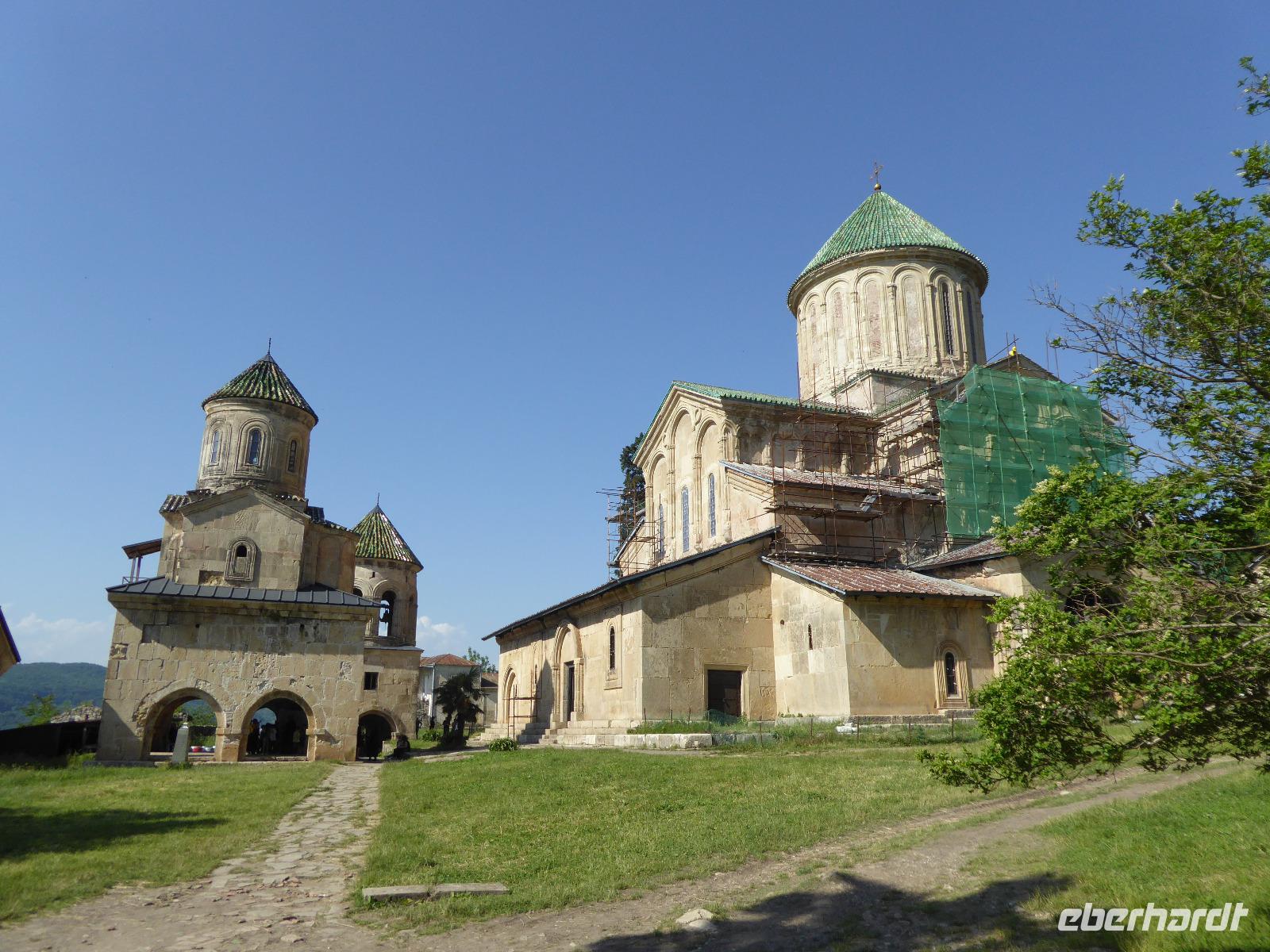 Der Tag sollte mit einem Lied beginnen. Und so bekommen unsere Geburtstagskinder ihr Ständchen. Heute verlassen wir Mestia, den Kaukasus und Svanetien. Fünf lange Fahrstunden liegen vor uns. Die fantastischen Aussichten lassen die Zeit jedoch (fast) wie im Flug vergehen. Zum Mittagessen kehren wir im Restaurant Host ein, wo uns unsere Geburtstagskinder auf ein Glas Rotwein und eine Khinkali-Verkostung einladen. Gar nicht so einfach, die Dinger auszuzutscheln, was? Aber es schmeckt! Dankeschön :-)! Noch knapp hundert Kilometer bis Zugdidi. Die Stadt ist in einem erbarmungswürdigen Zustand. Wir fahren nach Motsmeta, der Märtyrerstätte. Hier liegen die sterblichen Überreste zweier Fürstensöhne, die im 11. Jahrhundert gegen die Araber gekämpft und verloren haben. Sie wurden gefoltert, getötet und ihre Leichen in den Fluss geworfen. Dorfbewohner holten die Körper der Geschundenen aus dem Fluss und versteckten diese. Später wurde die Kirche gebaut, in der ein gläserner Sarg steht, in dem sich die Gebeine befinden. Heute tragen sie dazu bei, Wünsche zu erfüllen. Nicht nur Kinder glauben daran. Auch Erwachsene kriechen unter dem gläsernen Sarg hindurch, um ihre Wünsche wahr werden zu lassen. Unser nächstes Ziel ist das Gelati-Kloster. Hier sind David der Erbauer und andere Könige sowie Königinnen Georgiens begraben. Gelati war bekannt für Gold- und Silberschmiedekunst. Außerdem gab es hier eine Akademie, an der berühmte Professoren lehrten. Alles ist lange her. Heute treten sich hier die Touristen gegenseitig auf die Füße und rastlose Restauratoren versuchen, die Anlage instand zu halten. Unser letztes Ziel heute ist die Bagrati-Kathedrale. Anfang des 11. Jahrhunderts erbaut, wurde sie fünfhundert Jahre später von osmanischen Feinden in die Luft gesprengt. Erst 1952 begannen die ersten Wiederaufbauarbeiten. Seit 2012 sind diese weitestgehend fertig gestellt. Uns zieht es jetzt ins Hotel. Endlich ein bisschen frisch machen. Dann fahren wir zum Restaurant Palata. Heute werden sich die Tische unter den Speisen biegen. Was für ein Mahl. Wir haben gemeinsam protokolliert, was es alles zu essen gab: Gurken- Tomatensalat, Geflügel in Walnuss-Soße mit Safran, Spinatbällchen (mit Koriander), Salat mit gebratenem Hähnchen, Weißbrot; Chachapuri, Schaschlik, Pommes Frites, Bohnensalat, Peperonisalat, Mirabellensoße, eingelegte Pilze; Kaffee und Tee, große Obstteller. Dick und rund gefuttert, spazieren wir zum Hotel zurück. Ein weiterer schöner Tag in Georgien geht zu Ende. Gute Nacht, Ihr Lieben.