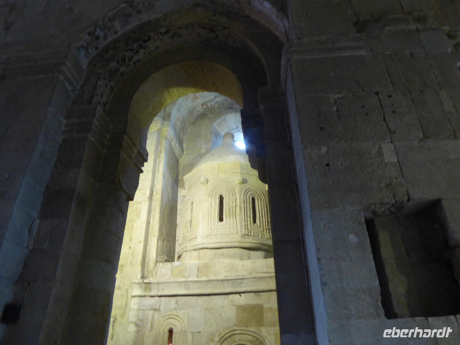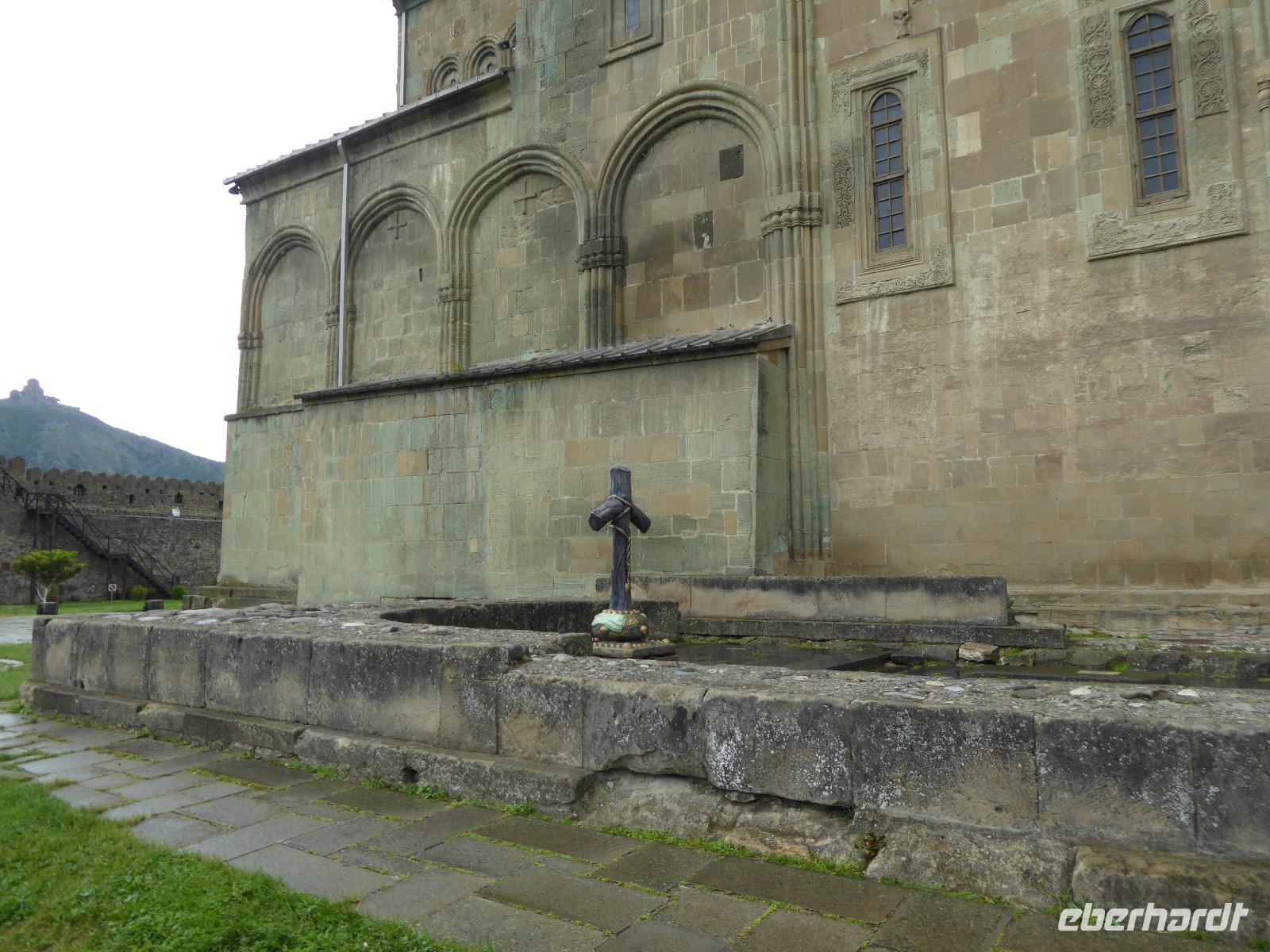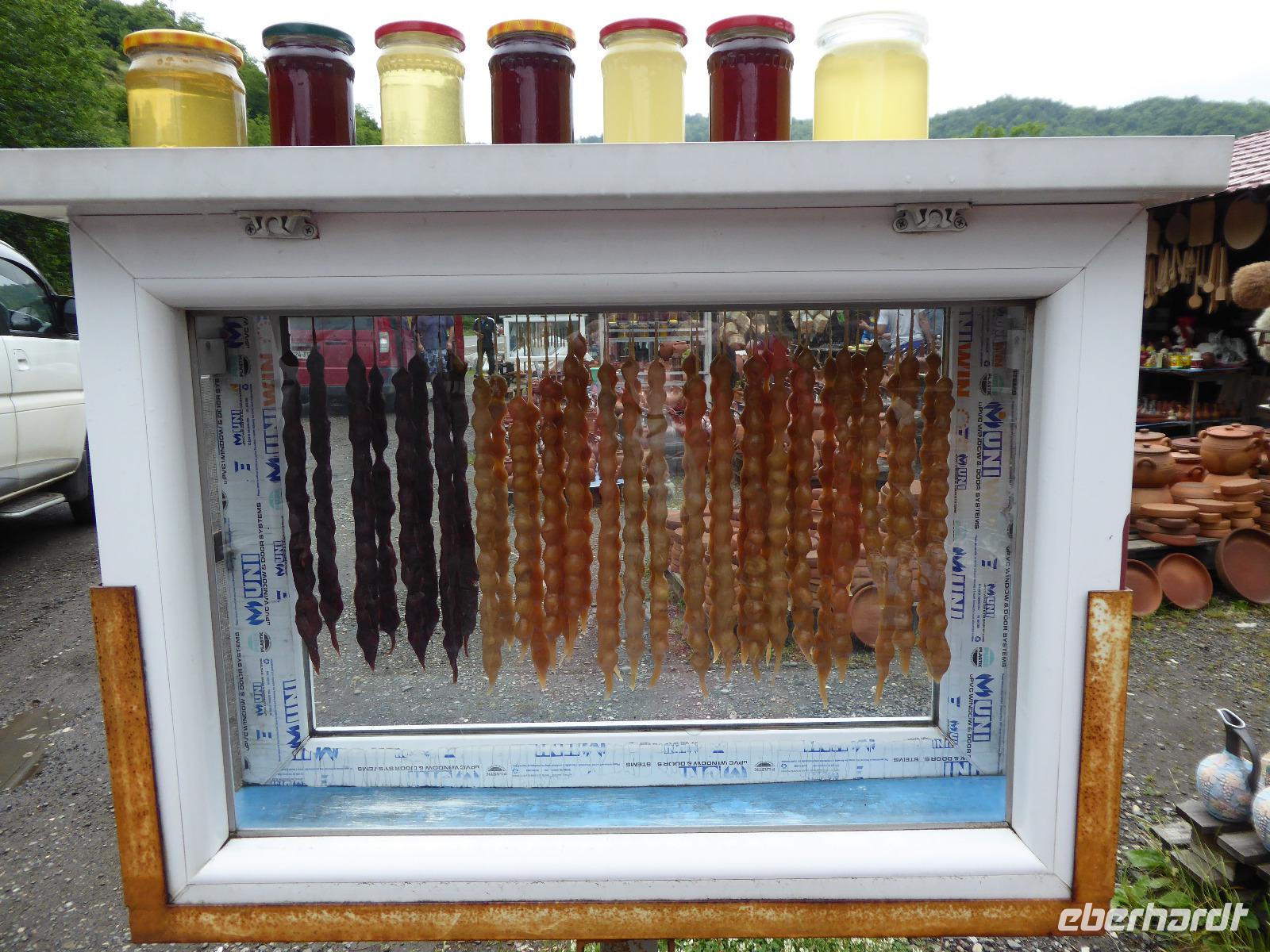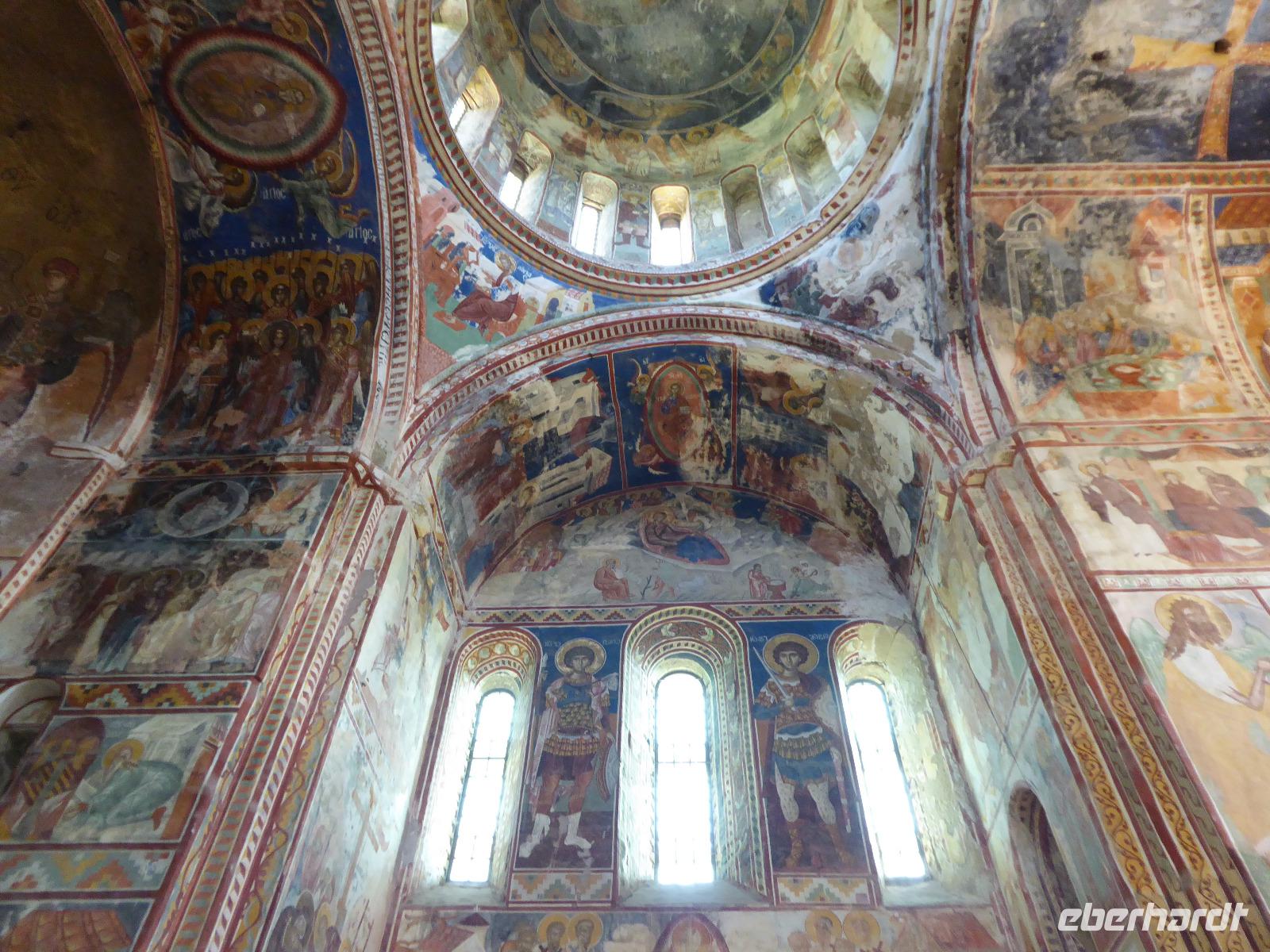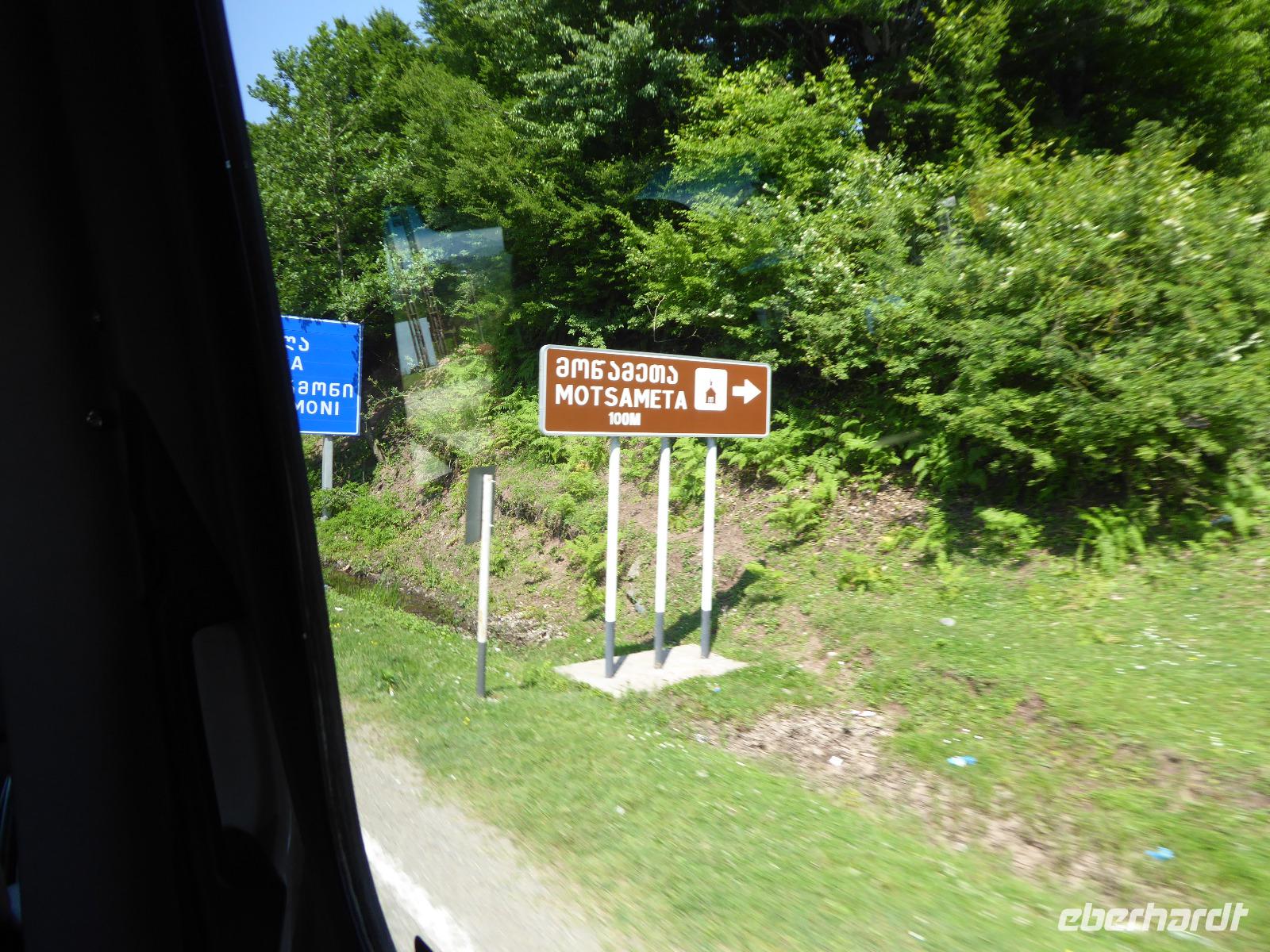 Der Tag sollte mit einem Lied beginnen. Und so bekommen unsere Geburtstagskinder ihr Ständchen. Heute verlassen wir Mestia, den Kaukasus und Svanetien. Fünf lange Fahrstunden liegen vor uns. Die fantastischen Aussichten lassen die Zeit jedoch (fast) wie im Flug vergehen. Zum Mittagessen kehren wir im Restaurant Host ein, wo uns unsere Geburtstagskinder auf ein Glas Rotwein und eine Khinkali-Verkostung einladen. Gar nicht so einfach, die Dinger auszuzutscheln, was? Aber es schmeckt! Dankeschön :-)! Noch knapp hundert Kilometer bis Zugdidi. Die Stadt ist in einem erbarmungswürdigen Zustand. Wir fahren nach Motsmeta, der Märtyrerstätte. Hier liegen die sterblichen Überreste zweier Fürstensöhne, die im 11. Jahrhundert gegen die Araber gekämpft und verloren haben. Sie wurden gefoltert, getötet und ihre Leichen in den Fluss geworfen. Dorfbewohner holten die Körper der Geschundenen aus dem Fluss und versteckten diese. Später wurde die Kirche gebaut, in der ein gläserner Sarg steht, in dem sich die Gebeine befinden. Heute tragen sie dazu bei, Wünsche zu erfüllen. Nicht nur Kinder glauben daran. Auch Erwachsene kriechen unter dem gläsernen Sarg hindurch, um ihre Wünsche wahr werden zu lassen. Unser nächstes Ziel ist das Gelati-Kloster. Hier sind David der Erbauer und andere Könige sowie Königinnen Georgiens begraben. Gelati war bekannt für Gold- und Silberschmiedekunst. Außerdem gab es hier eine Akademie, an der berühmte Professoren lehrten. Alles ist lange her. Heute treten sich hier die Touristen gegenseitig auf die Füße und rastlose Restauratoren versuchen, die Anlage instand zu halten. Unser letztes Ziel heute ist die Bagrati-Kathedrale. Anfang des 11. Jahrhunderts erbaut, wurde sie fünfhundert Jahre später von osmanischen Feinden in die Luft gesprengt. Erst 1952 begannen die ersten Wiederaufbauarbeiten. Seit 2012 sind diese weitestgehend fertig gestellt. Uns zieht es jetzt ins Hotel. Endlich ein bisschen frisch machen. Dann fahren wir zum Restaurant Palata. Heute werden sich die Tische unter den Speisen biegen. Was für ein Mahl. Wir haben gemeinsam protokolliert, was es alles zu essen gab: Gurken- Tomatensalat, Geflügel in Walnuss-Soße mit Safran, Spinatbällchen (mit Koriander), Salat mit gebratenem Hähnchen, Weißbrot; Chachapuri, Schaschlik, Pommes Frites, Bohnensalat, Peperonisalat, Mirabellensoße, eingelegte Pilze; Kaffee und Tee, große Obstteller. Dick und rund gefuttert, spazieren wir zum Hotel zurück. Ein weiterer schöner Tag in Georgien geht zu Ende. Gute Nacht, Ihr Lieben.