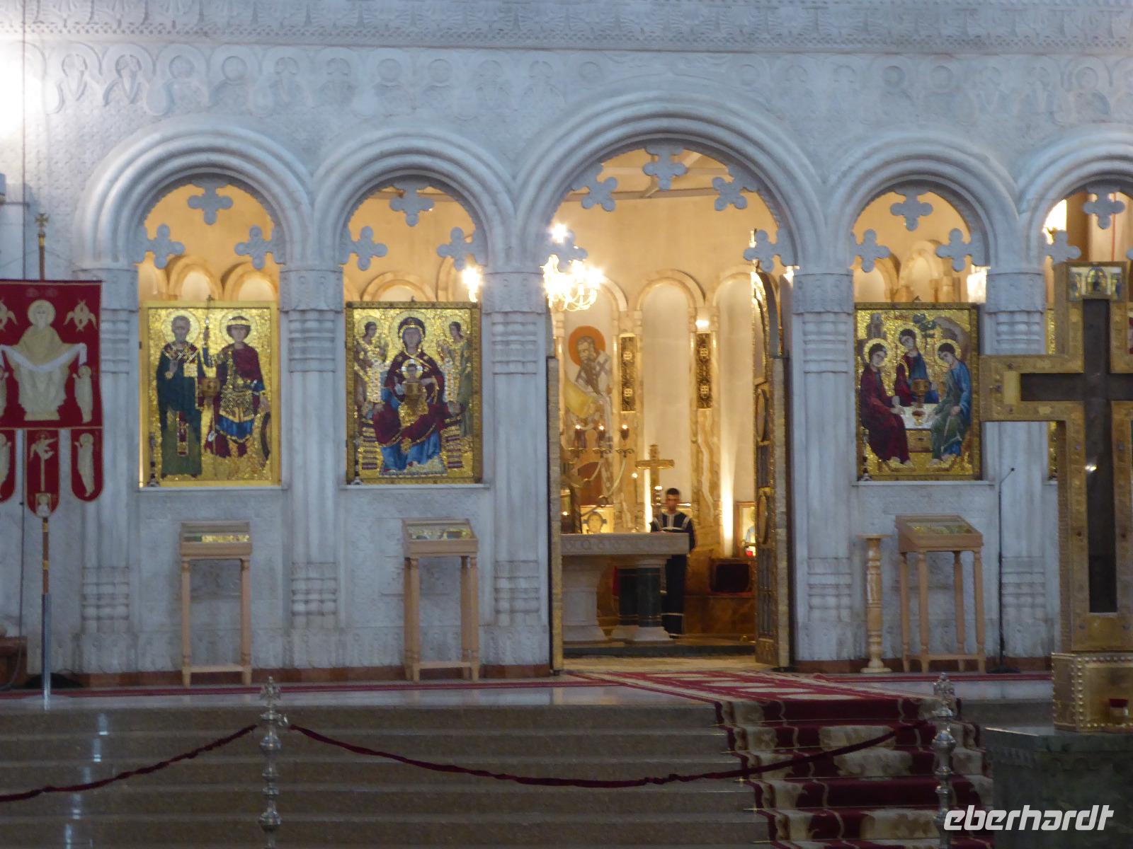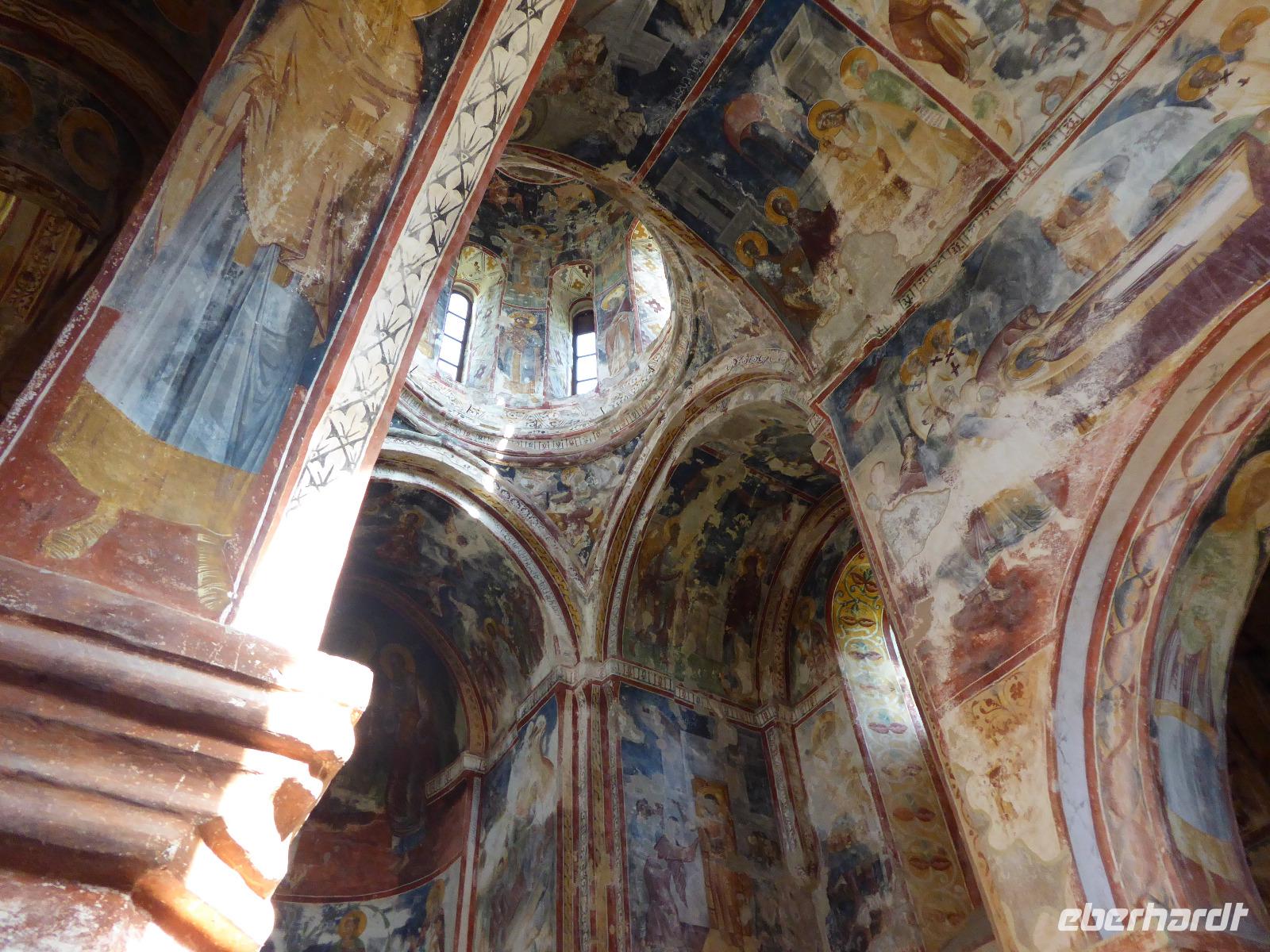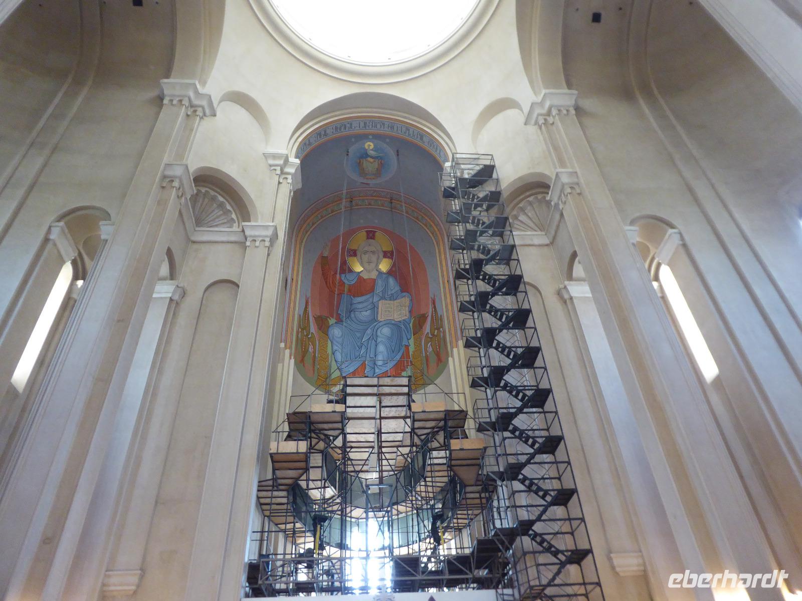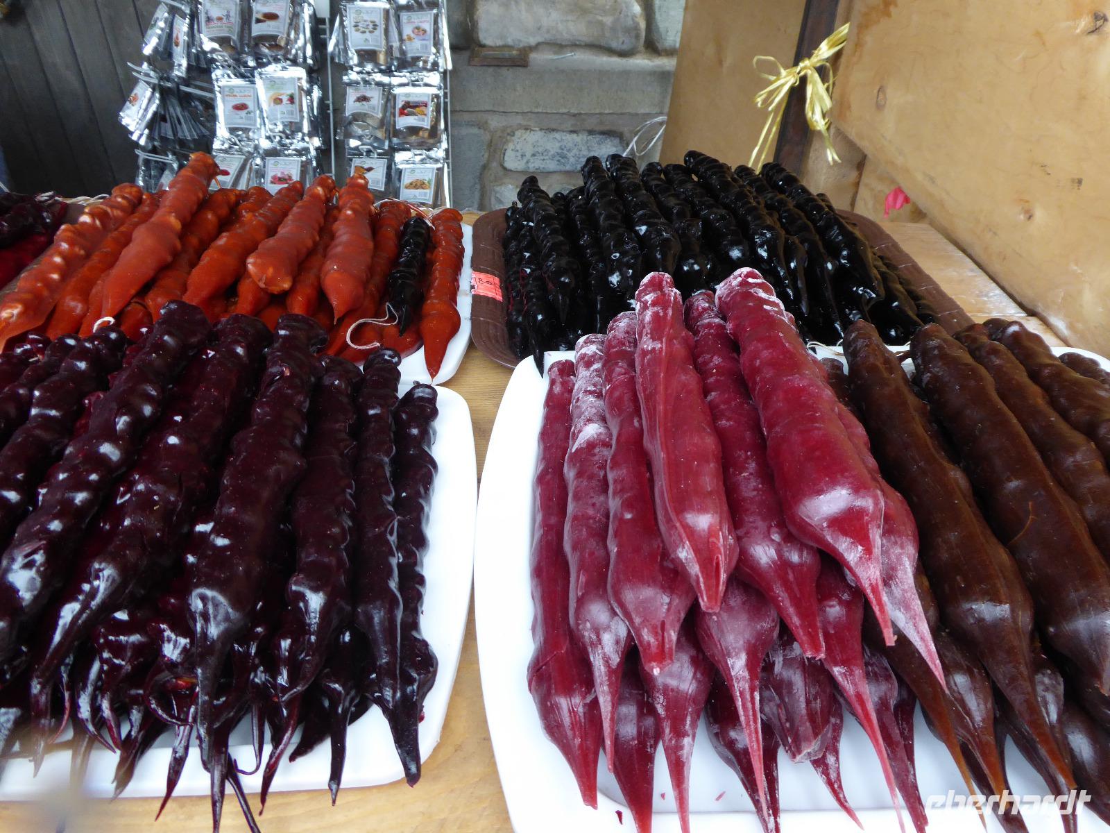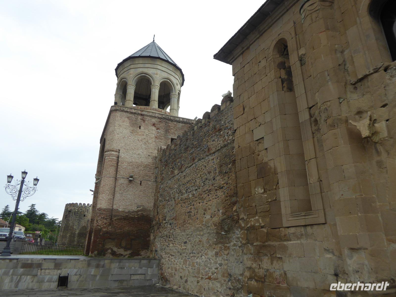 Der Tag sollte mit einem Lied beginnen. Und so bekommen unsere Geburtstagskinder ihr Ständchen. Heute verlassen wir Mestia, den Kaukasus und Svanetien. Fünf lange Fahrstunden liegen vor uns. Die fantastischen Aussichten lassen die Zeit jedoch (fast) wie im Flug vergehen. Zum Mittagessen kehren wir im Restaurant Host ein, wo uns unsere Geburtstagskinder auf ein Glas Rotwein und eine Khinkali-Verkostung einladen. Gar nicht so einfach, die Dinger auszuzutscheln, was? Aber es schmeckt! Dankeschön :-)! Noch knapp hundert Kilometer bis Zugdidi. Die Stadt ist in einem erbarmungswürdigen Zustand. Wir fahren nach Motsmeta, der Märtyrerstätte. Hier liegen die sterblichen Überreste zweier Fürstensöhne, die im 11. Jahrhundert gegen die Araber gekämpft und verloren haben. Sie wurden gefoltert, getötet und ihre Leichen in den Fluss geworfen. Dorfbewohner holten die Körper der Geschundenen aus dem Fluss und versteckten diese. Später wurde die Kirche gebaut, in der ein gläserner Sarg steht, in dem sich die Gebeine befinden. Heute tragen sie dazu bei, Wünsche zu erfüllen. Nicht nur Kinder glauben daran. Auch Erwachsene kriechen unter dem gläsernen Sarg hindurch, um ihre Wünsche wahr werden zu lassen. Unser nächstes Ziel ist das Gelati-Kloster. Hier sind David der Erbauer und andere Könige sowie Königinnen Georgiens begraben. Gelati war bekannt für Gold- und Silberschmiedekunst. Außerdem gab es hier eine Akademie, an der berühmte Professoren lehrten. Alles ist lange her. Heute treten sich hier die Touristen gegenseitig auf die Füße und rastlose Restauratoren versuchen, die Anlage instand zu halten. Unser letztes Ziel heute ist die Bagrati-Kathedrale. Anfang des 11. Jahrhunderts erbaut, wurde sie fünfhundert Jahre später von osmanischen Feinden in die Luft gesprengt. Erst 1952 begannen die ersten Wiederaufbauarbeiten. Seit 2012 sind diese weitestgehend fertig gestellt. Uns zieht es jetzt ins Hotel. Endlich ein bisschen frisch machen. Dann fahren wir zum Restaurant Palata. Heute werden sich die Tische unter den Speisen biegen. Was für ein Mahl. Wir haben gemeinsam protokolliert, was es alles zu essen gab: Gurken- Tomatensalat, Geflügel in Walnuss-Soße mit Safran, Spinatbällchen (mit Koriander), Salat mit gebratenem Hähnchen, Weißbrot; Chachapuri, Schaschlik, Pommes Frites, Bohnensalat, Peperonisalat, Mirabellensoße, eingelegte Pilze; Kaffee und Tee, große Obstteller. Dick und rund gefuttert, spazieren wir zum Hotel zurück. Ein weiterer schöner Tag in Georgien geht zu Ende. Gute Nacht, Ihr Lieben.