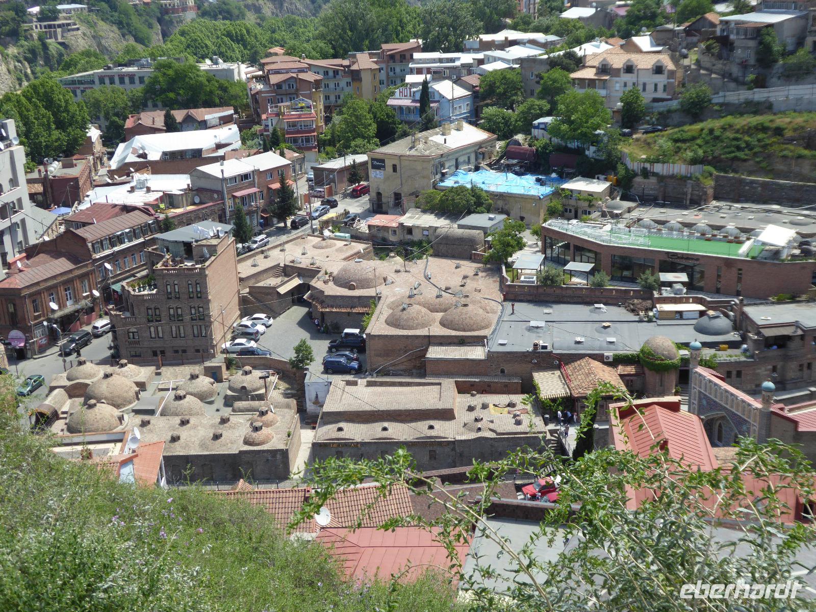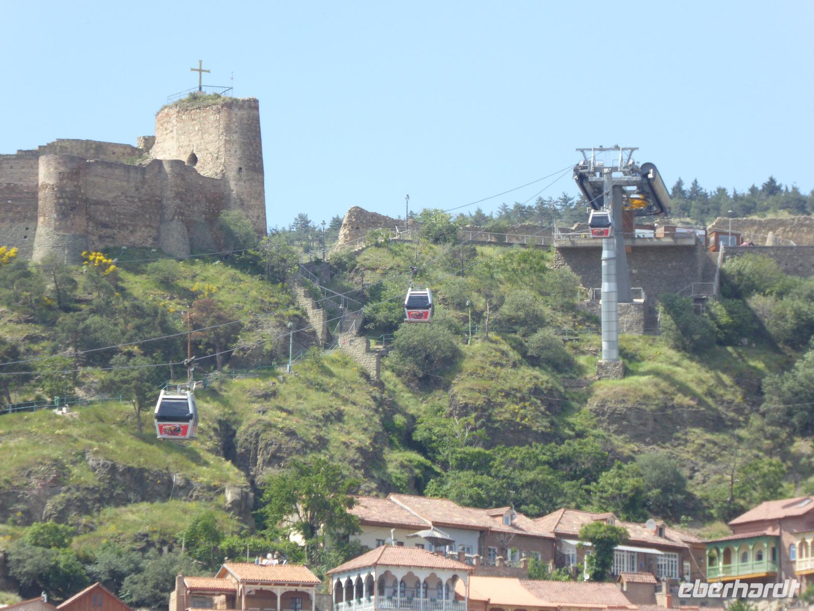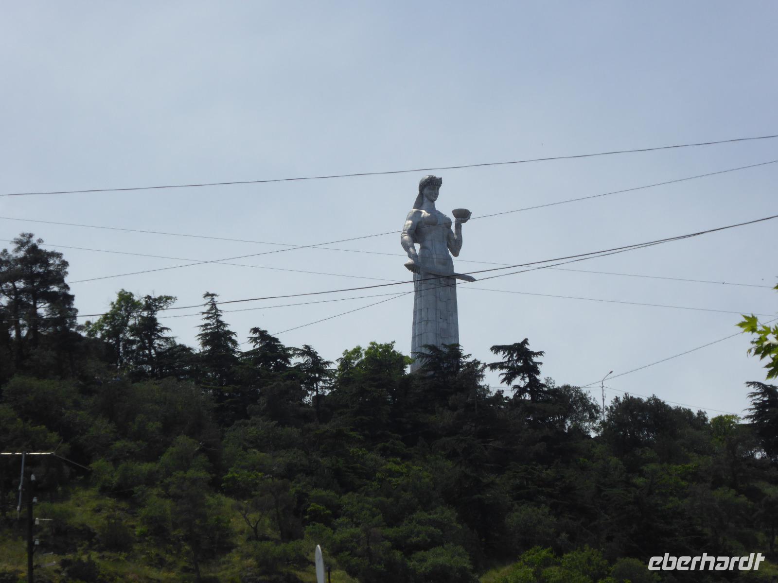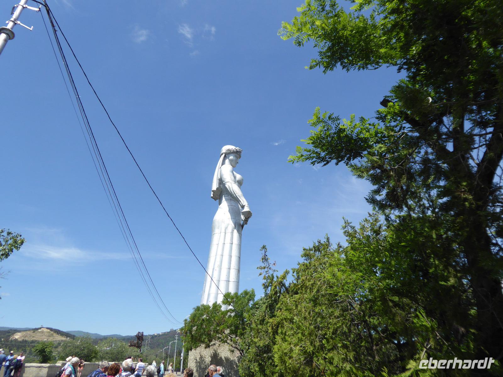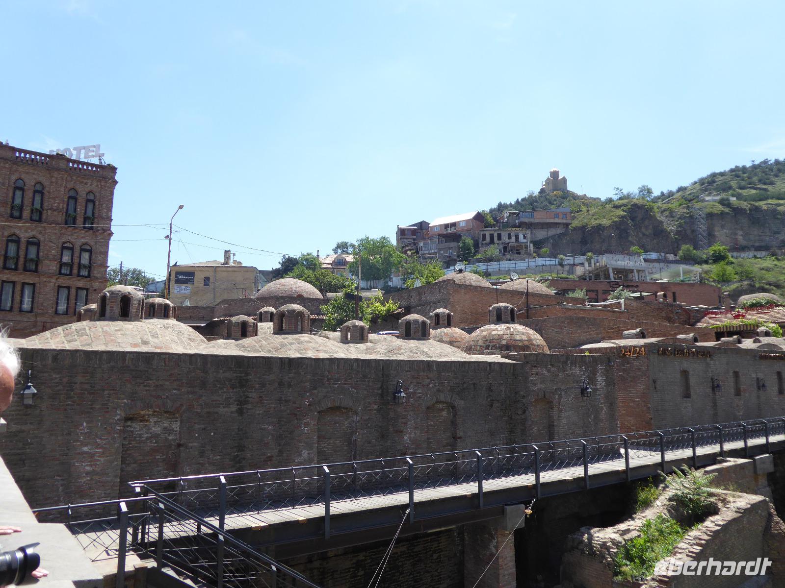 Am Vormittag spazieren wir durch die schöne Hauptstadt Georgiens - Tbilissi. Wir sehen erhaltene Teile der Stadtmauer, fassen dem Lampenanzünder an den Po :-) und bewundern das Gabriadze Marionettentheater. Nach dem Spaziergang durch die Altstadt, überqueren wir die Friedensbrücke und kommen zur Bodenstation der Seilbahn. Der Betrieb beginnt erst um Elf und wir spazieren weiter zur Metechi-Kirche, die einst, zusammen mit dem Metechi-Schloss, auf Geheiß von König Wachtang, errichtet wurde. Nun fahren wir mit der Seilbahn zur Narikala Festung. Im 4. Jahrhundert wurde die Festung erbaut und in den folgenden Jahren immer wieder erweitert. Eines Tages jedoch flog das im Keller gelagerte Schießpulver in die Luft und zerstörte die ganze Festung. Was heute noch erhalten ist, stammt aus dem 16. Und 17. Jahrhundert. Wir spazieren zur Mutter Georgiens, einer zwanzig Meter hohen Skulptur aus Aluminium. Die Meinungen über die Schönheut der Skulptur gehen weit auseinander. Von hier oben haben wir einen schönen Blick auf Tbilissi. Treppab geht es zunächst zu einem Wasserfall und anschließend hinab bis ins Bäderviertel. Wir spazieren durch einen kleinen Park und gelangen an eine Bootsanlegestelle. Hier werden wir, während einer Fahrt auf dem Mtkvari-Fluss, wieder einmal kulinarisch verwöhnt. Der Nachmittag steht für eigene Unternehmungen zur Verfügung. Nach einer kurzen Verschnaufpause im Hotel fahren wir zu unserem letzten Abendessen. Das Restaurant Poliphonia ist so versteckt, dass es Natia und Koba kaum finden. Von außen ist dem Haus jedenfalls nicht anzusehen, dass sich hier im Keller so eine außergewöhnliche Lokalität versteckt. Unter steinernen Bögen kosten wir heute südgeorgische Küche, deren Gerichte sich von denen, die wir bisher kennenlernten, unterscheiden. Es gibt, neben dem üblichen Gurken-Tomatensalat, zum Auftakt eine Käseplatte, köstlich gewürzte grüne Bohnen, dann Graupensalat (?), gebratenes Hühnchen, Nudeln in Sahnesoße und was noch? Ich weiß es nicht mehr, aber es waren wieder eine Fülle von Speisen mit einer ganz neuen Geschmacksnote. Nun heißt es aber: schnell ins Bett, denn die Nacht wird kurz.