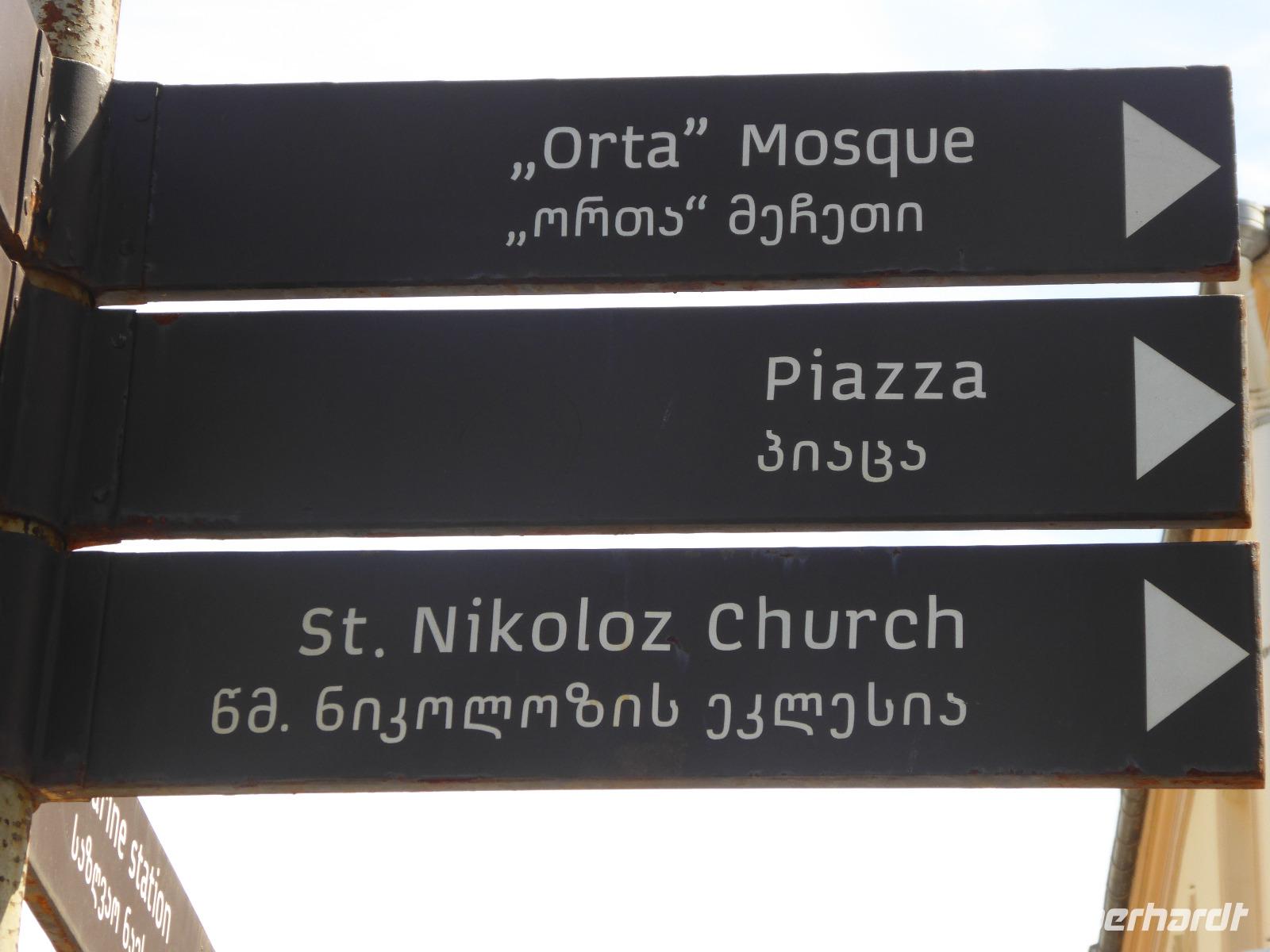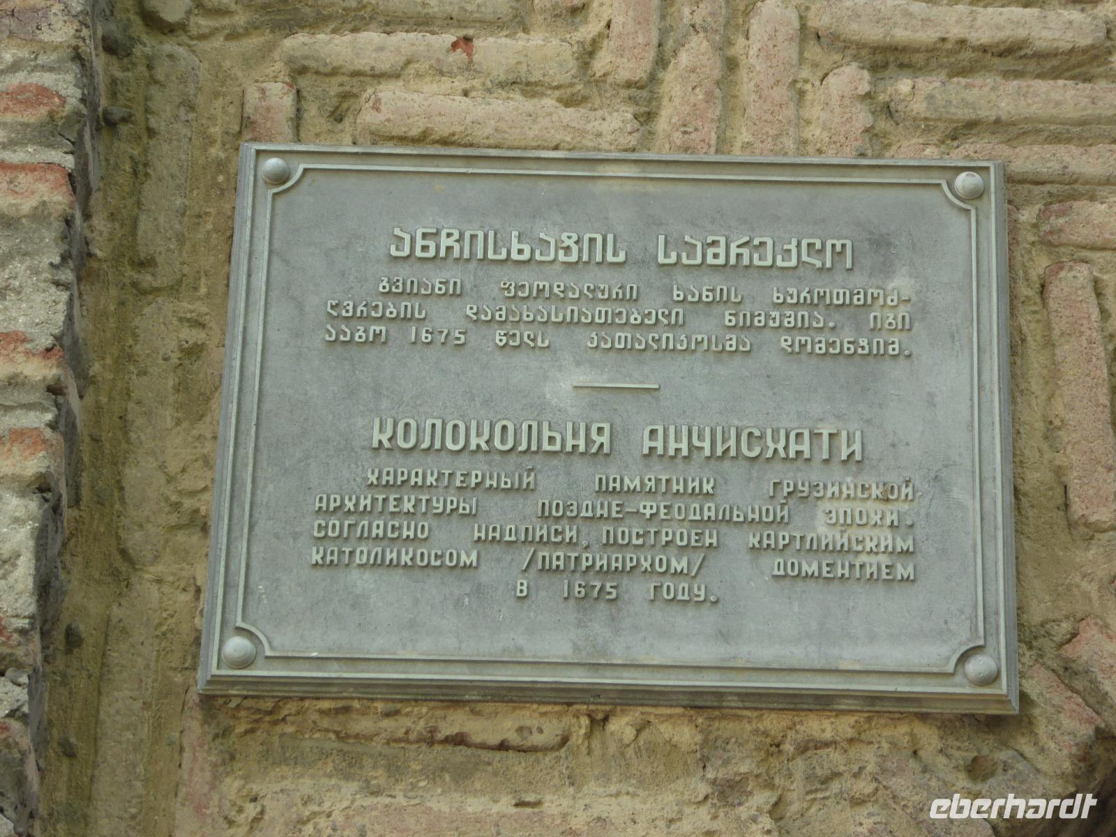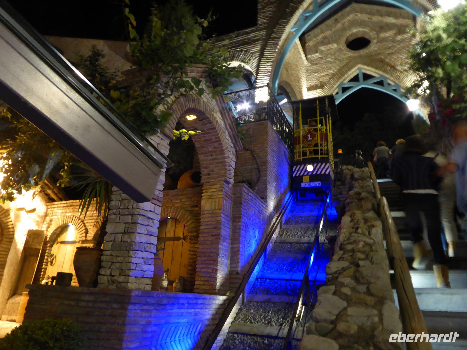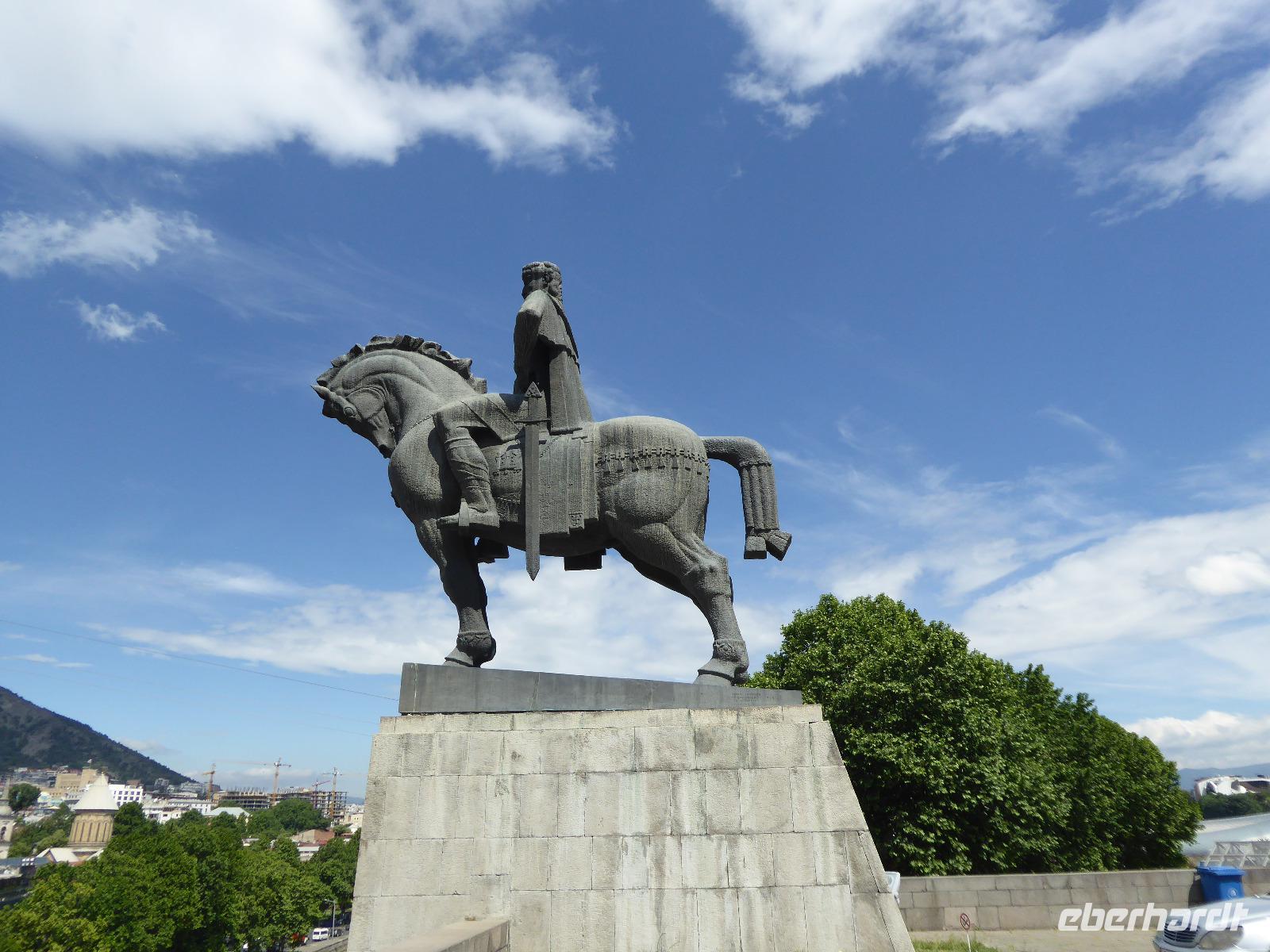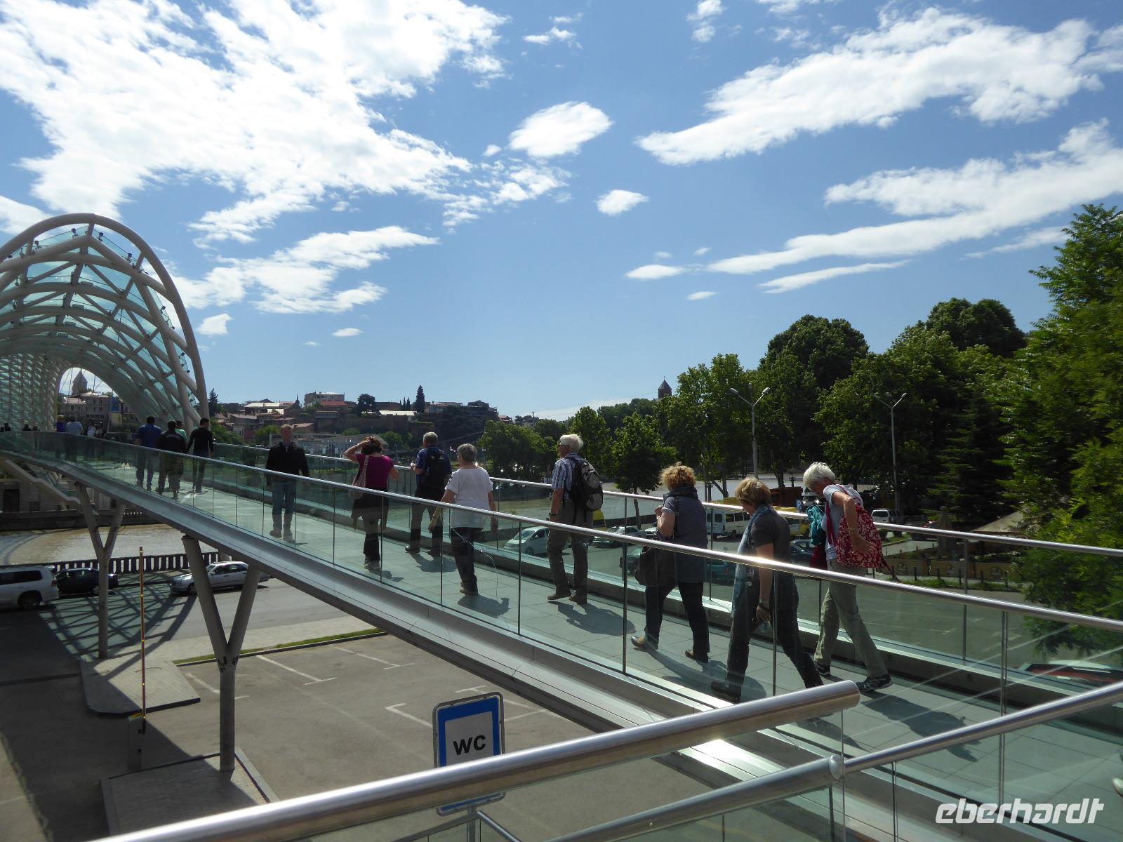 Am Vormittag spazieren wir durch die schöne Hauptstadt Georgiens - Tbilissi. Wir sehen erhaltene Teile der Stadtmauer, fassen dem Lampenanzünder an den Po :-) und bewundern das Gabriadze Marionettentheater. Nach dem Spaziergang durch die Altstadt, überqueren wir die Friedensbrücke und kommen zur Bodenstation der Seilbahn. Der Betrieb beginnt erst um Elf und wir spazieren weiter zur Metechi-Kirche, die einst, zusammen mit dem Metechi-Schloss, auf Geheiß von König Wachtang, errichtet wurde. Nun fahren wir mit der Seilbahn zur Narikala Festung. Im 4. Jahrhundert wurde die Festung erbaut und in den folgenden Jahren immer wieder erweitert. Eines Tages jedoch flog das im Keller gelagerte Schießpulver in die Luft und zerstörte die ganze Festung. Was heute noch erhalten ist, stammt aus dem 16. Und 17. Jahrhundert. Wir spazieren zur Mutter Georgiens, einer zwanzig Meter hohen Skulptur aus Aluminium. Die Meinungen über die Schönheut der Skulptur gehen weit auseinander. Von hier oben haben wir einen schönen Blick auf Tbilissi. Treppab geht es zunächst zu einem Wasserfall und anschließend hinab bis ins Bäderviertel. Wir spazieren durch einen kleinen Park und gelangen an eine Bootsanlegestelle. Hier werden wir, während einer Fahrt auf dem Mtkvari-Fluss, wieder einmal kulinarisch verwöhnt. Der Nachmittag steht für eigene Unternehmungen zur Verfügung. Nach einer kurzen Verschnaufpause im Hotel fahren wir zu unserem letzten Abendessen. Das Restaurant Poliphonia ist so versteckt, dass es Natia und Koba kaum finden. Von außen ist dem Haus jedenfalls nicht anzusehen, dass sich hier im Keller so eine außergewöhnliche Lokalität versteckt. Unter steinernen Bögen kosten wir heute südgeorgische Küche, deren Gerichte sich von denen, die wir bisher kennenlernten, unterscheiden. Es gibt, neben dem üblichen Gurken-Tomatensalat, zum Auftakt eine Käseplatte, köstlich gewürzte grüne Bohnen, dann Graupensalat (?), gebratenes Hühnchen, Nudeln in Sahnesoße und was noch? Ich weiß es nicht mehr, aber es waren wieder eine Fülle von Speisen mit einer ganz neuen Geschmacksnote. Nun heißt es aber: schnell ins Bett, denn die Nacht wird kurz.