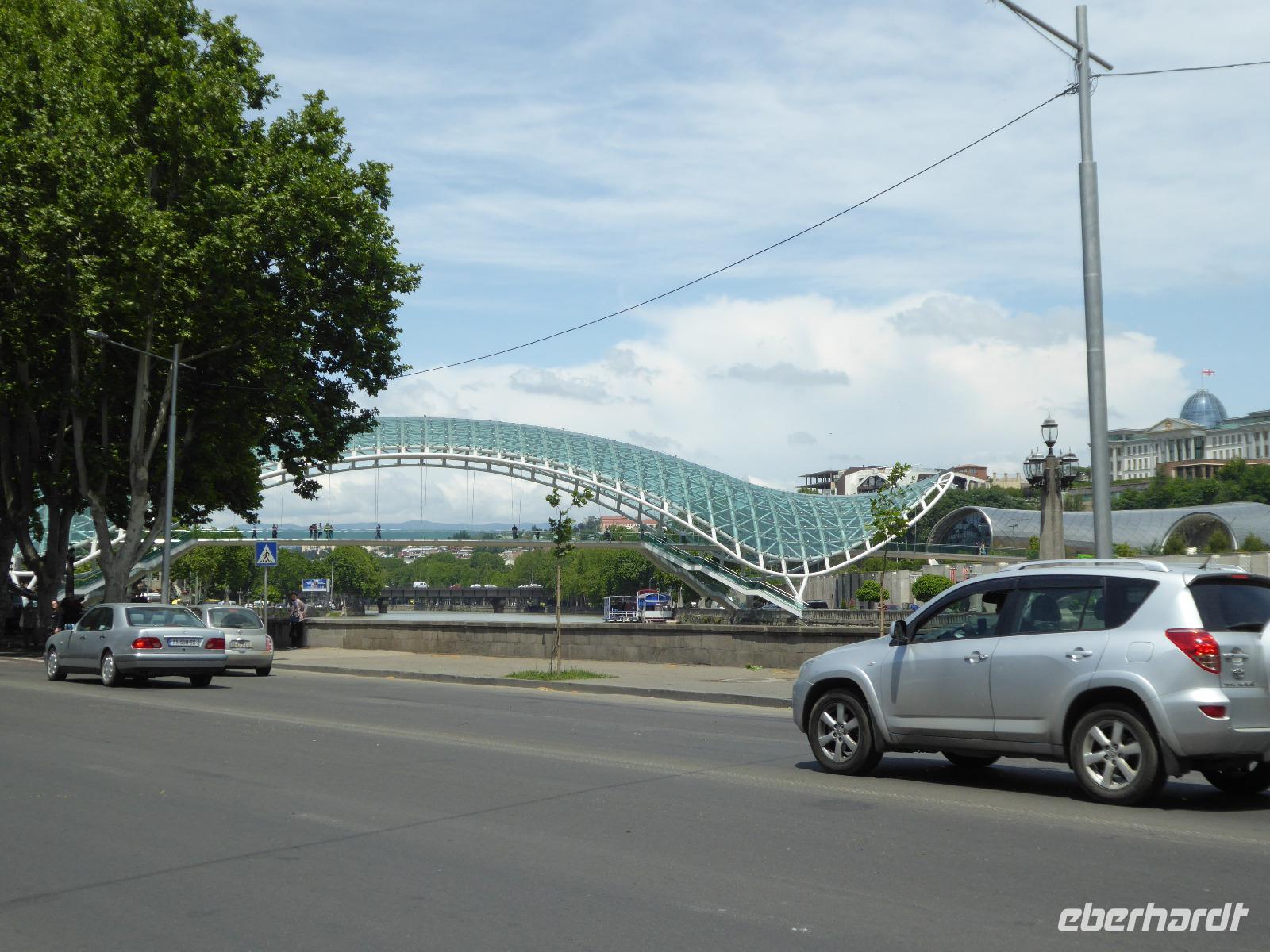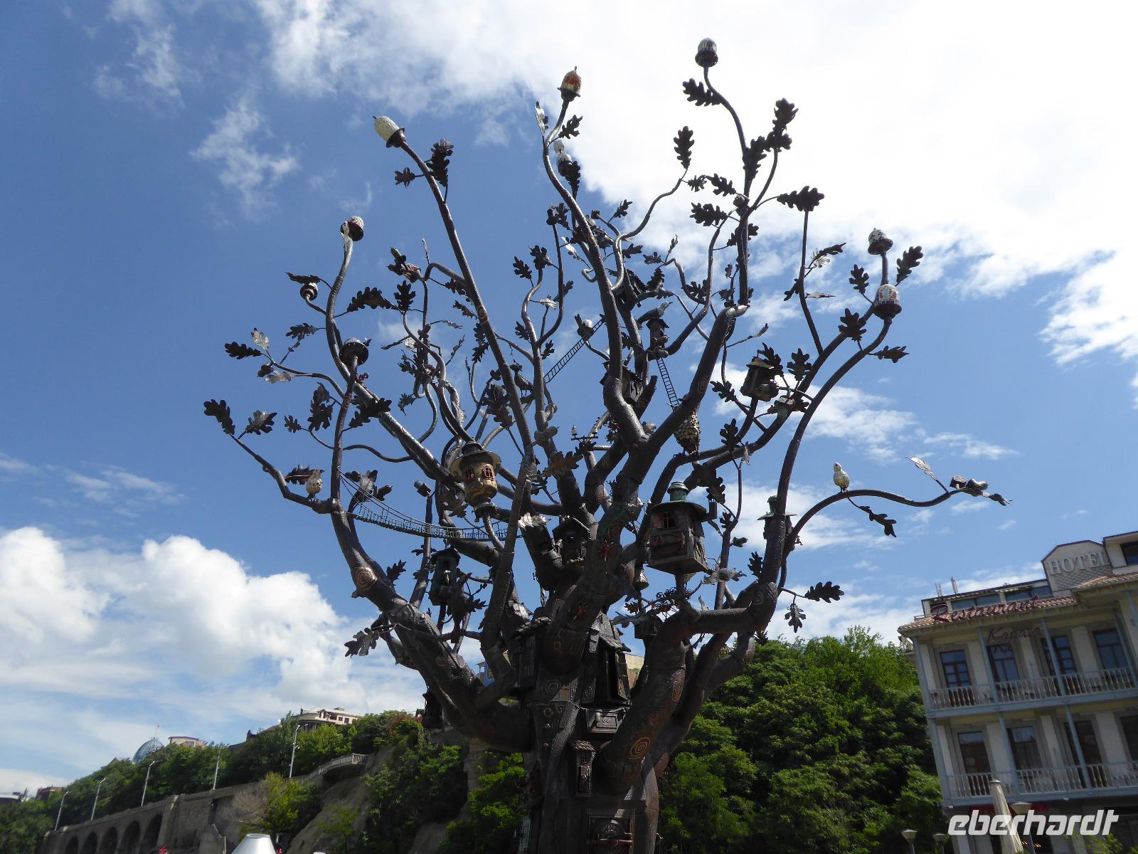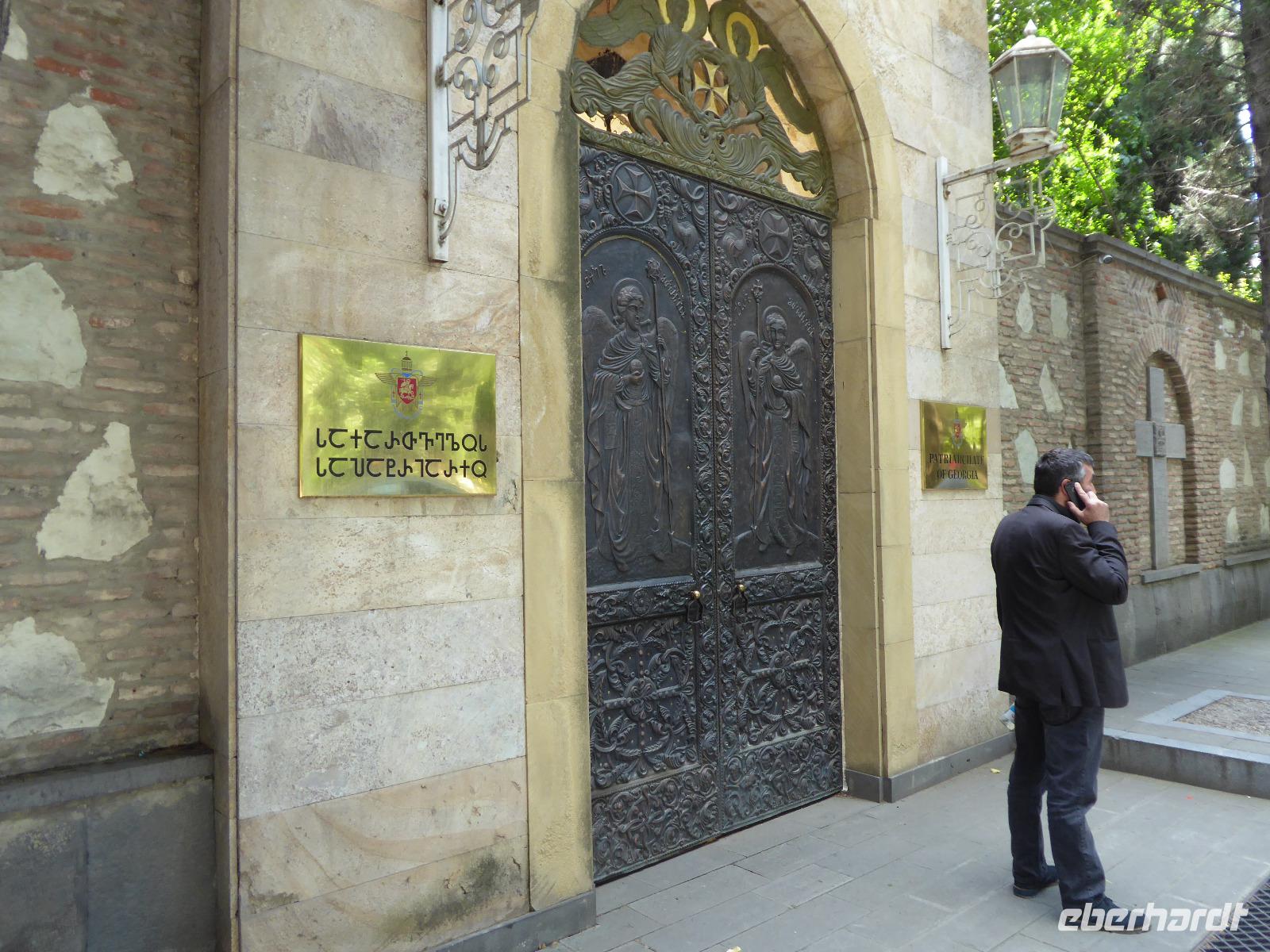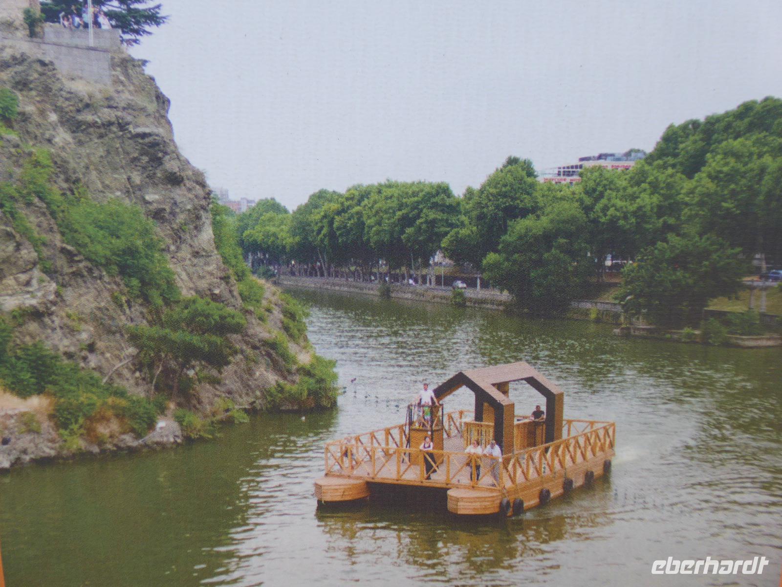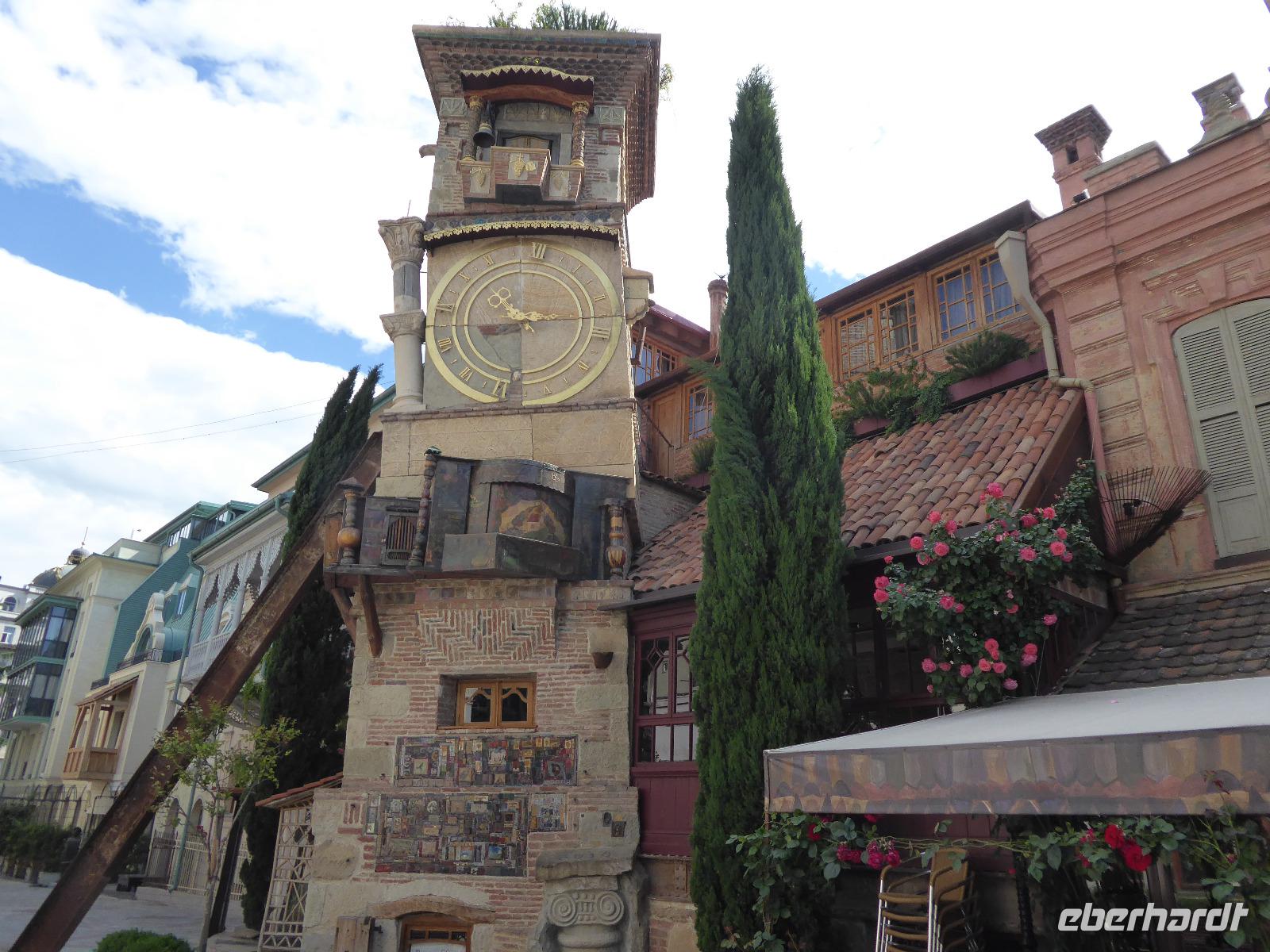 Am Vormittag spazieren wir durch die schöne Hauptstadt Georgiens - Tbilissi. Wir sehen erhaltene Teile der Stadtmauer, fassen dem Lampenanzünder an den Po :-) und bewundern das Gabriadze Marionettentheater. Nach dem Spaziergang durch die Altstadt, überqueren wir die Friedensbrücke und kommen zur Bodenstation der Seilbahn. Der Betrieb beginnt erst um Elf und wir spazieren weiter zur Metechi-Kirche, die einst, zusammen mit dem Metechi-Schloss, auf Geheiß von König Wachtang, errichtet wurde. Nun fahren wir mit der Seilbahn zur Narikala Festung. Im 4. Jahrhundert wurde die Festung erbaut und in den folgenden Jahren immer wieder erweitert. Eines Tages jedoch flog das im Keller gelagerte Schießpulver in die Luft und zerstörte die ganze Festung. Was heute noch erhalten ist, stammt aus dem 16. Und 17. Jahrhundert. Wir spazieren zur Mutter Georgiens, einer zwanzig Meter hohen Skulptur aus Aluminium. Die Meinungen über die Schönheut der Skulptur gehen weit auseinander. Von hier oben haben wir einen schönen Blick auf Tbilissi. Treppab geht es zunächst zu einem Wasserfall und anschließend hinab bis ins Bäderviertel. Wir spazieren durch einen kleinen Park und gelangen an eine Bootsanlegestelle. Hier werden wir, während einer Fahrt auf dem Mtkvari-Fluss, wieder einmal kulinarisch verwöhnt. Der Nachmittag steht für eigene Unternehmungen zur Verfügung. Nach einer kurzen Verschnaufpause im Hotel fahren wir zu unserem letzten Abendessen. Das Restaurant Poliphonia ist so versteckt, dass es Natia und Koba kaum finden. Von außen ist dem Haus jedenfalls nicht anzusehen, dass sich hier im Keller so eine außergewöhnliche Lokalität versteckt. Unter steinernen Bögen kosten wir heute südgeorgische Küche, deren Gerichte sich von denen, die wir bisher kennenlernten, unterscheiden. Es gibt, neben dem üblichen Gurken-Tomatensalat, zum Auftakt eine Käseplatte, köstlich gewürzte grüne Bohnen, dann Graupensalat (?), gebratenes Hühnchen, Nudeln in Sahnesoße und was noch? Ich weiß es nicht mehr, aber es waren wieder eine Fülle von Speisen mit einer ganz neuen Geschmacksnote. Nun heißt es aber: schnell ins Bett, denn die Nacht wird kurz.