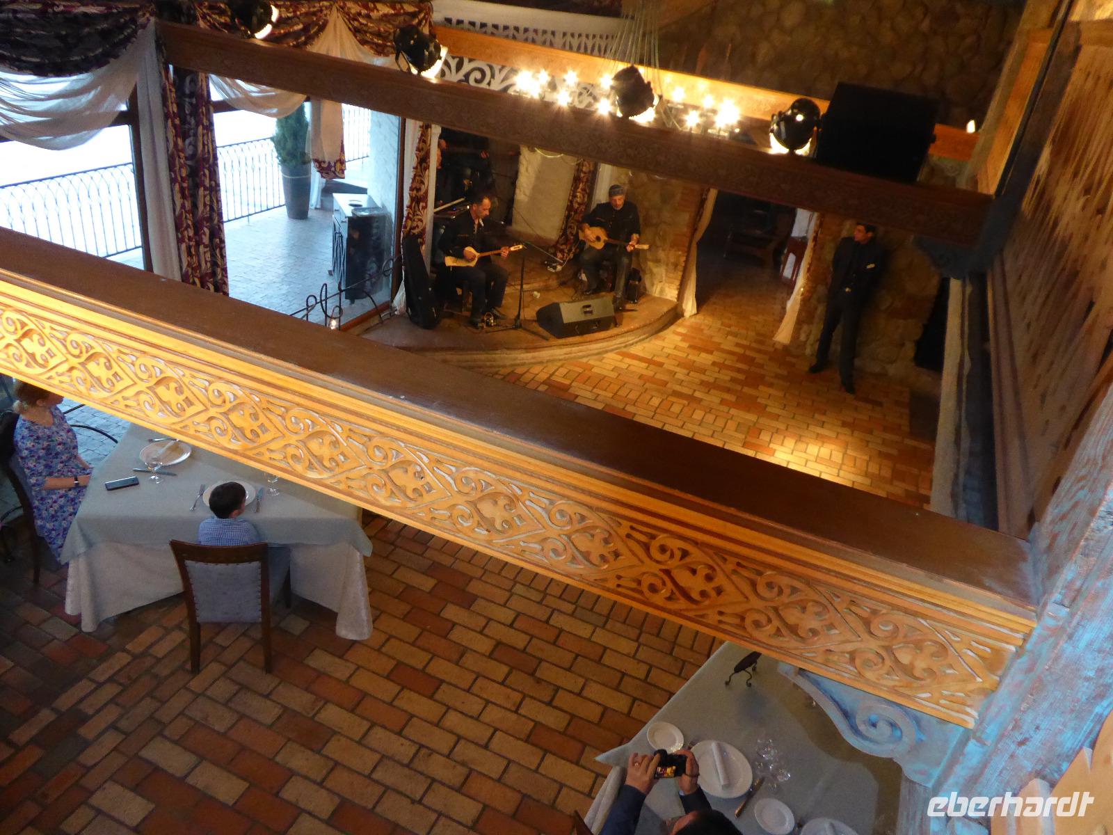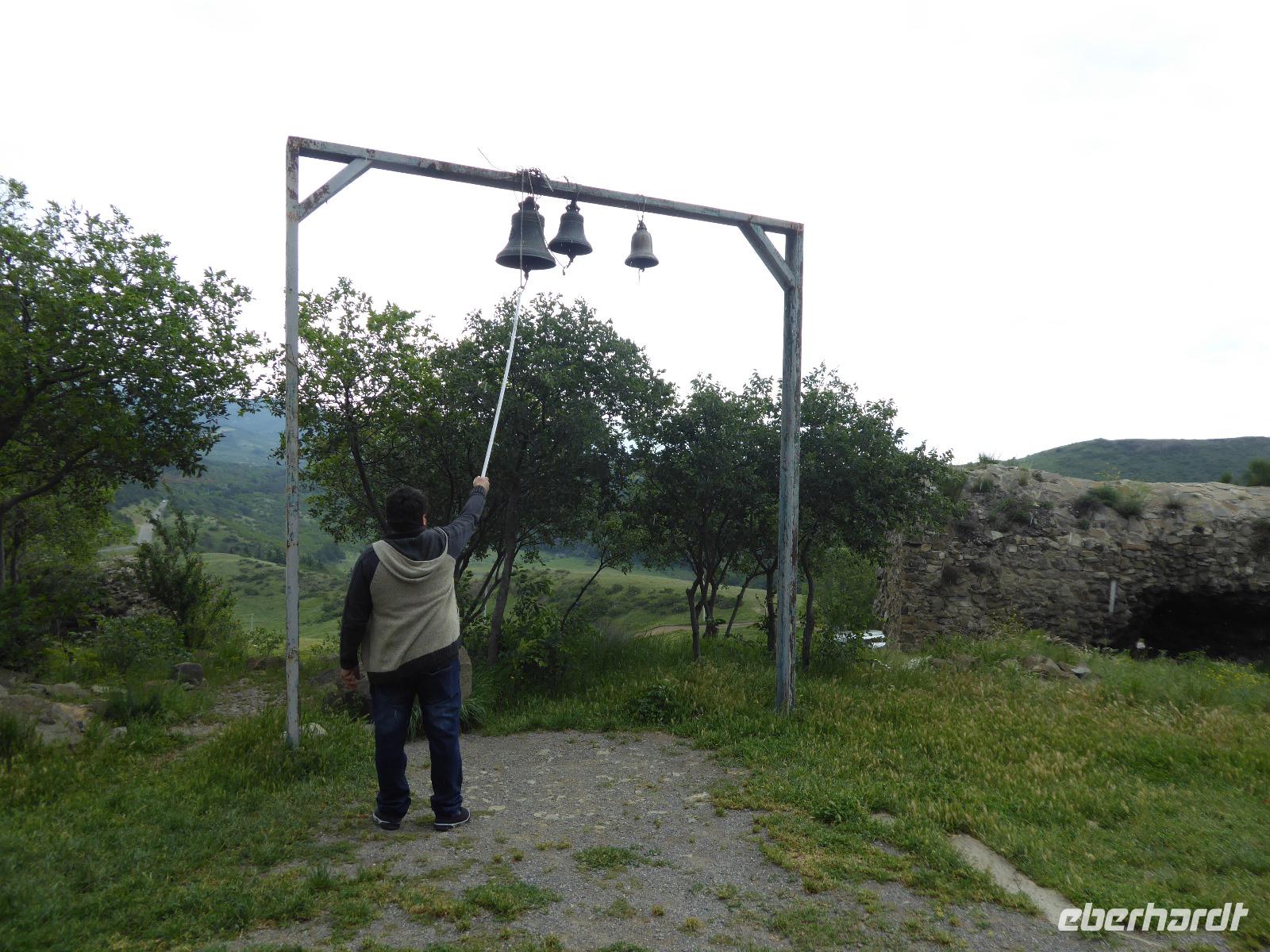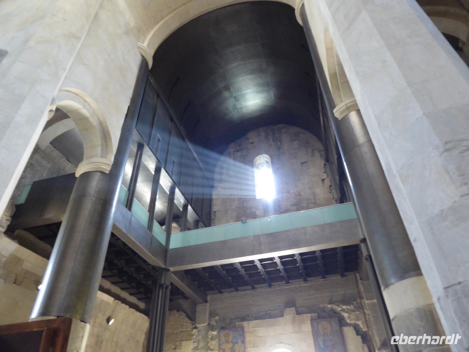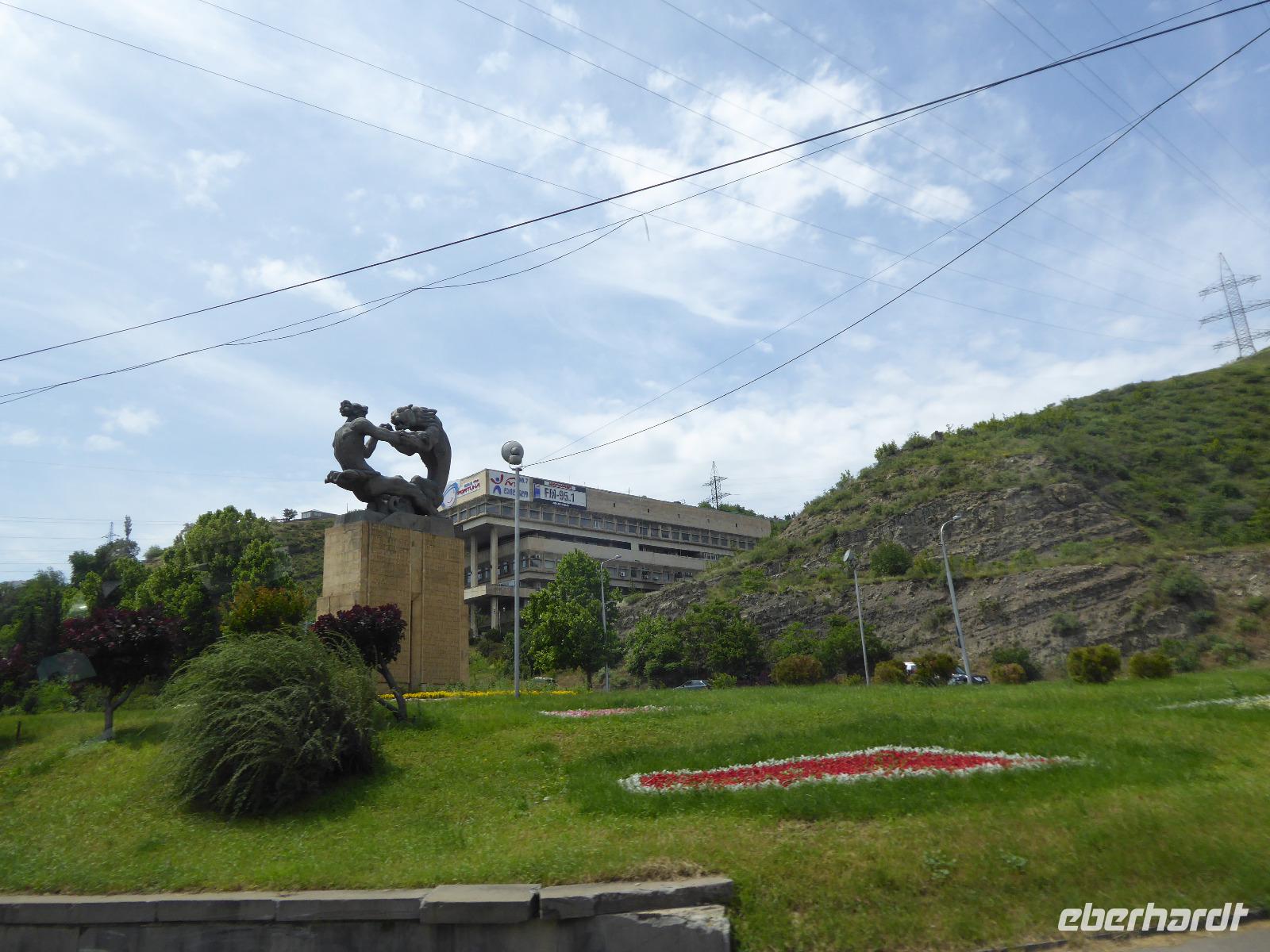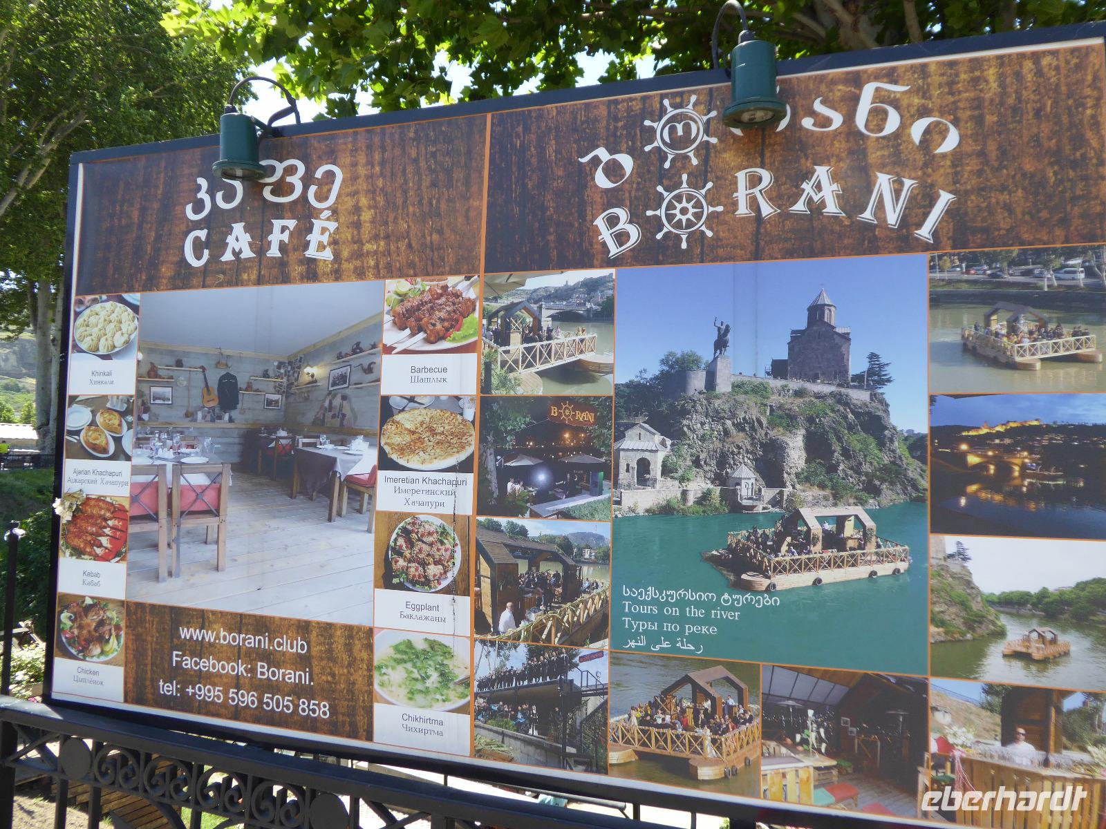 Am Vormittag spazieren wir durch die schöne Hauptstadt Georgiens - Tbilissi. Wir sehen erhaltene Teile der Stadtmauer, fassen dem Lampenanzünder an den Po :-) und bewundern das Gabriadze Marionettentheater. Nach dem Spaziergang durch die Altstadt, überqueren wir die Friedensbrücke und kommen zur Bodenstation der Seilbahn. Der Betrieb beginnt erst um Elf und wir spazieren weiter zur Metechi-Kirche, die einst, zusammen mit dem Metechi-Schloss, auf Geheiß von König Wachtang, errichtet wurde. Nun fahren wir mit der Seilbahn zur Narikala Festung. Im 4. Jahrhundert wurde die Festung erbaut und in den folgenden Jahren immer wieder erweitert. Eines Tages jedoch flog das im Keller gelagerte Schießpulver in die Luft und zerstörte die ganze Festung. Was heute noch erhalten ist, stammt aus dem 16. Und 17. Jahrhundert. Wir spazieren zur Mutter Georgiens, einer zwanzig Meter hohen Skulptur aus Aluminium. Die Meinungen über die Schönheut der Skulptur gehen weit auseinander. Von hier oben haben wir einen schönen Blick auf Tbilissi. Treppab geht es zunächst zu einem Wasserfall und anschließend hinab bis ins Bäderviertel. Wir spazieren durch einen kleinen Park und gelangen an eine Bootsanlegestelle. Hier werden wir, während einer Fahrt auf dem Mtkvari-Fluss, wieder einmal kulinarisch verwöhnt. Der Nachmittag steht für eigene Unternehmungen zur Verfügung. Nach einer kurzen Verschnaufpause im Hotel fahren wir zu unserem letzten Abendessen. Das Restaurant Poliphonia ist so versteckt, dass es Natia und Koba kaum finden. Von außen ist dem Haus jedenfalls nicht anzusehen, dass sich hier im Keller so eine außergewöhnliche Lokalität versteckt. Unter steinernen Bögen kosten wir heute südgeorgische Küche, deren Gerichte sich von denen, die wir bisher kennenlernten, unterscheiden. Es gibt, neben dem üblichen Gurken-Tomatensalat, zum Auftakt eine Käseplatte, köstlich gewürzte grüne Bohnen, dann Graupensalat (?), gebratenes Hühnchen, Nudeln in Sahnesoße und was noch? Ich weiß es nicht mehr, aber es waren wieder eine Fülle von Speisen mit einer ganz neuen Geschmacksnote. Nun heißt es aber: schnell ins Bett, denn die Nacht wird kurz.