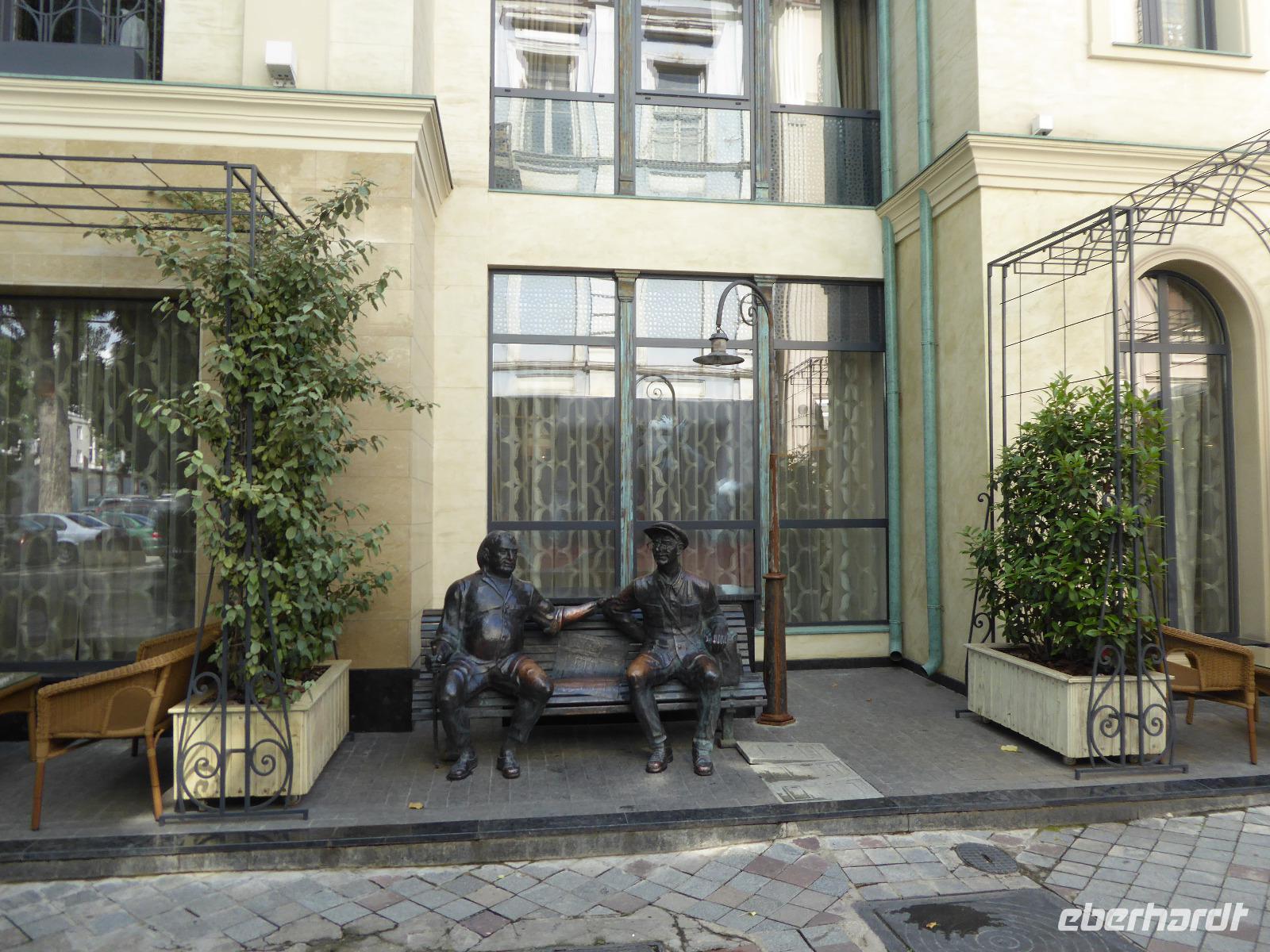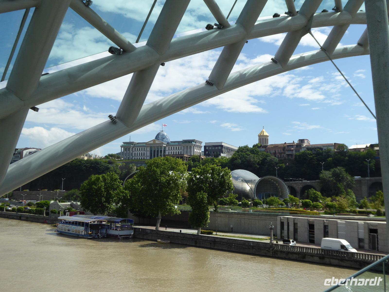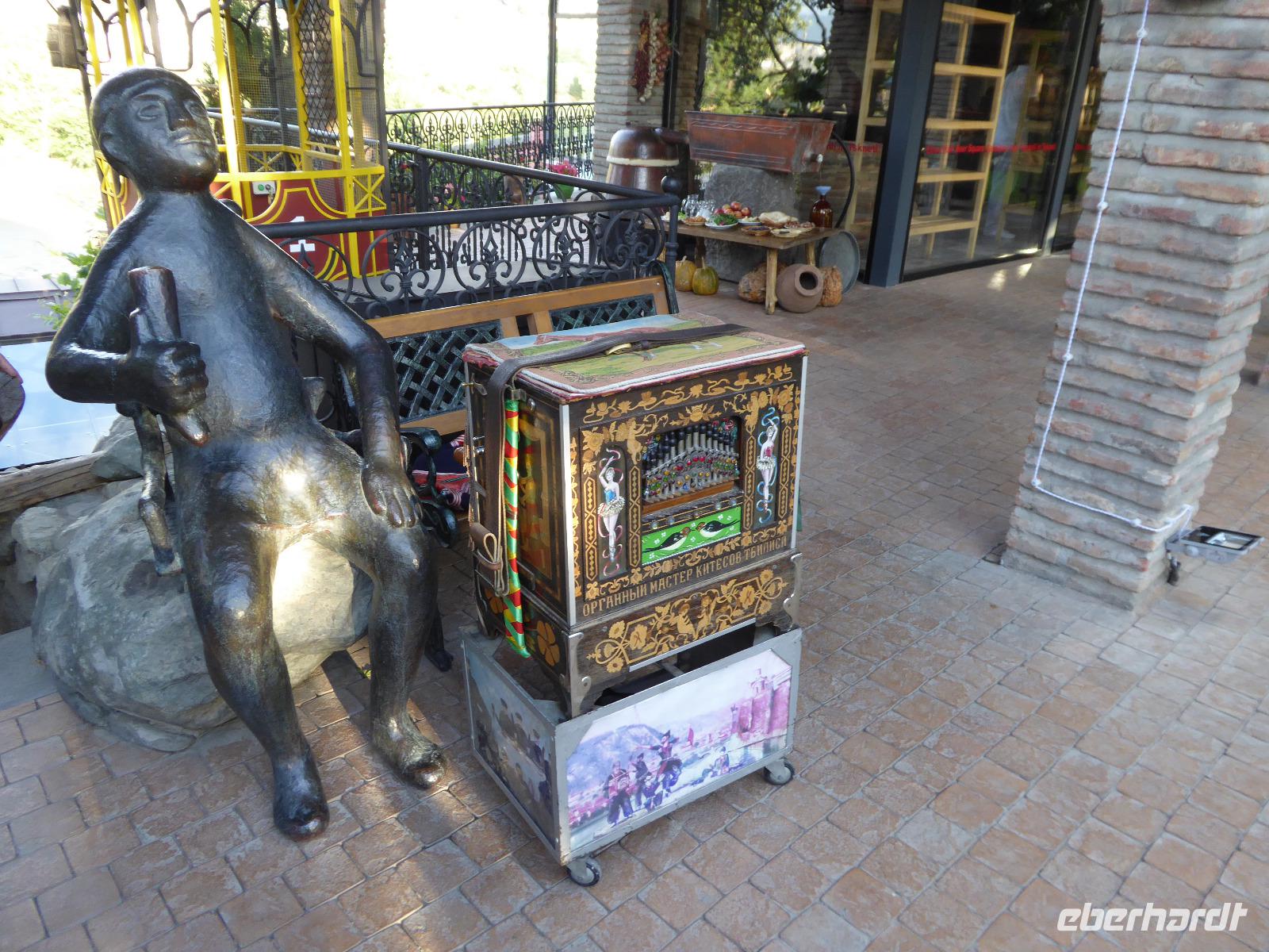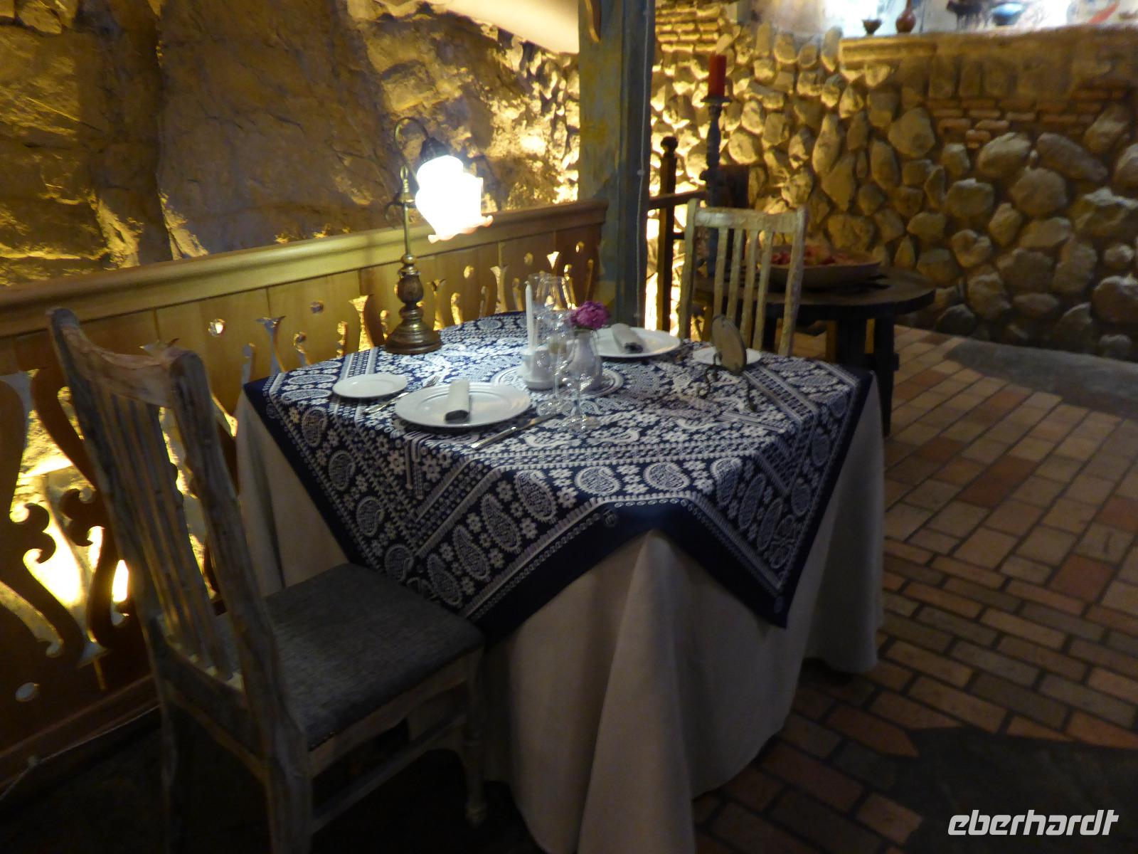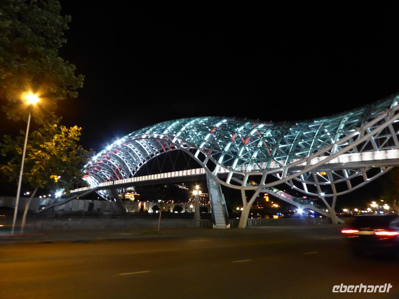 Am Vormittag spazieren wir durch die schöne Hauptstadt Georgiens - Tbilissi. Wir sehen erhaltene Teile der Stadtmauer, fassen dem Lampenanzünder an den Po :-) und bewundern das Gabriadze Marionettentheater. Nach dem Spaziergang durch die Altstadt, überqueren wir die Friedensbrücke und kommen zur Bodenstation der Seilbahn. Der Betrieb beginnt erst um Elf und wir spazieren weiter zur Metechi-Kirche, die einst, zusammen mit dem Metechi-Schloss, auf Geheiß von König Wachtang, errichtet wurde. Nun fahren wir mit der Seilbahn zur Narikala Festung. Im 4. Jahrhundert wurde die Festung erbaut und in den folgenden Jahren immer wieder erweitert. Eines Tages jedoch flog das im Keller gelagerte Schießpulver in die Luft und zerstörte die ganze Festung. Was heute noch erhalten ist, stammt aus dem 16. Und 17. Jahrhundert. Wir spazieren zur Mutter Georgiens, einer zwanzig Meter hohen Skulptur aus Aluminium. Die Meinungen über die Schönheut der Skulptur gehen weit auseinander. Von hier oben haben wir einen schönen Blick auf Tbilissi. Treppab geht es zunächst zu einem Wasserfall und anschließend hinab bis ins Bäderviertel. Wir spazieren durch einen kleinen Park und gelangen an eine Bootsanlegestelle. Hier werden wir, während einer Fahrt auf dem Mtkvari-Fluss, wieder einmal kulinarisch verwöhnt. Der Nachmittag steht für eigene Unternehmungen zur Verfügung. Nach einer kurzen Verschnaufpause im Hotel fahren wir zu unserem letzten Abendessen. Das Restaurant Poliphonia ist so versteckt, dass es Natia und Koba kaum finden. Von außen ist dem Haus jedenfalls nicht anzusehen, dass sich hier im Keller so eine außergewöhnliche Lokalität versteckt. Unter steinernen Bögen kosten wir heute südgeorgische Küche, deren Gerichte sich von denen, die wir bisher kennenlernten, unterscheiden. Es gibt, neben dem üblichen Gurken-Tomatensalat, zum Auftakt eine Käseplatte, köstlich gewürzte grüne Bohnen, dann Graupensalat (?), gebratenes Hühnchen, Nudeln in Sahnesoße und was noch? Ich weiß es nicht mehr, aber es waren wieder eine Fülle von Speisen mit einer ganz neuen Geschmacksnote. Nun heißt es aber: schnell ins Bett, denn die Nacht wird kurz.