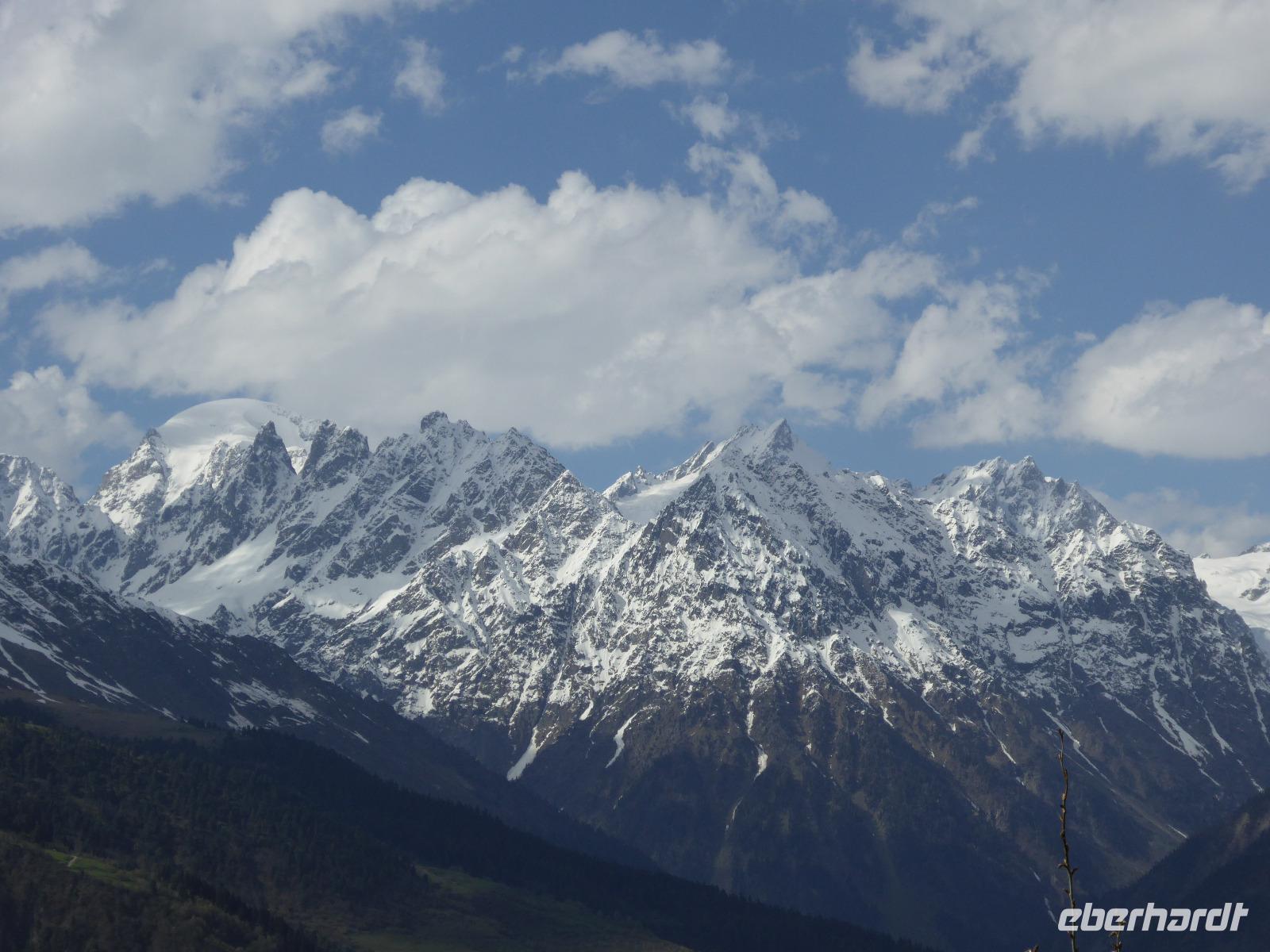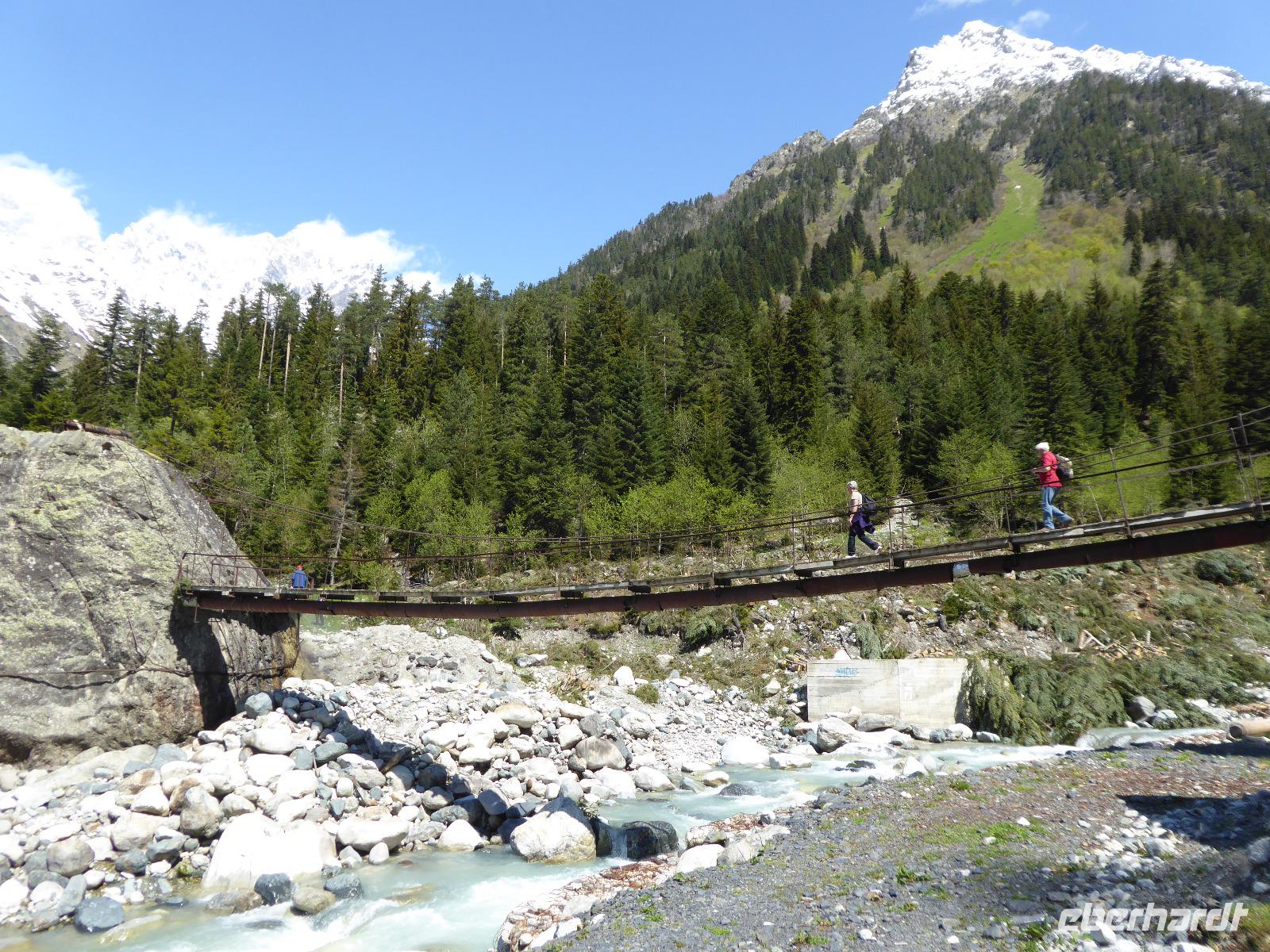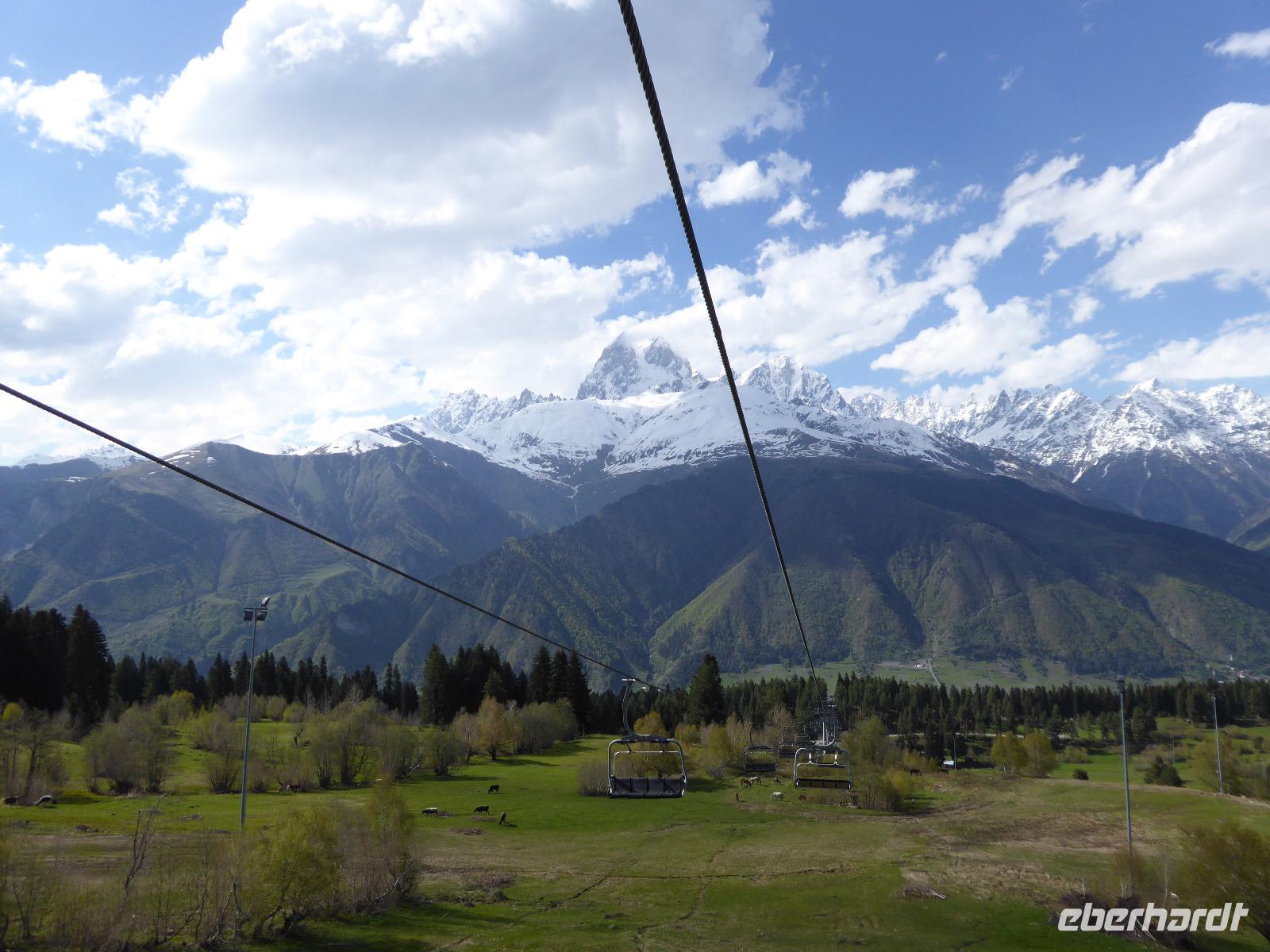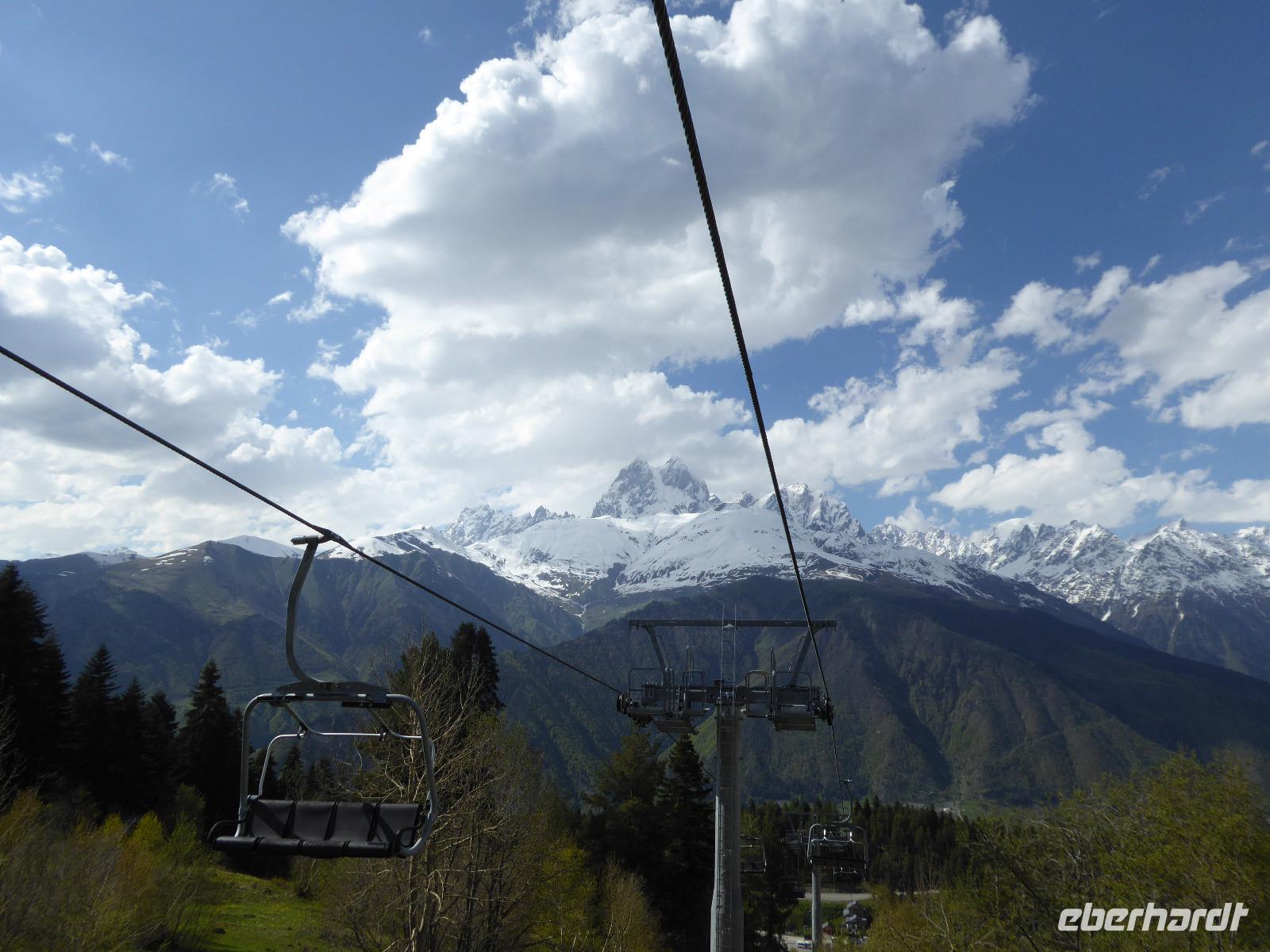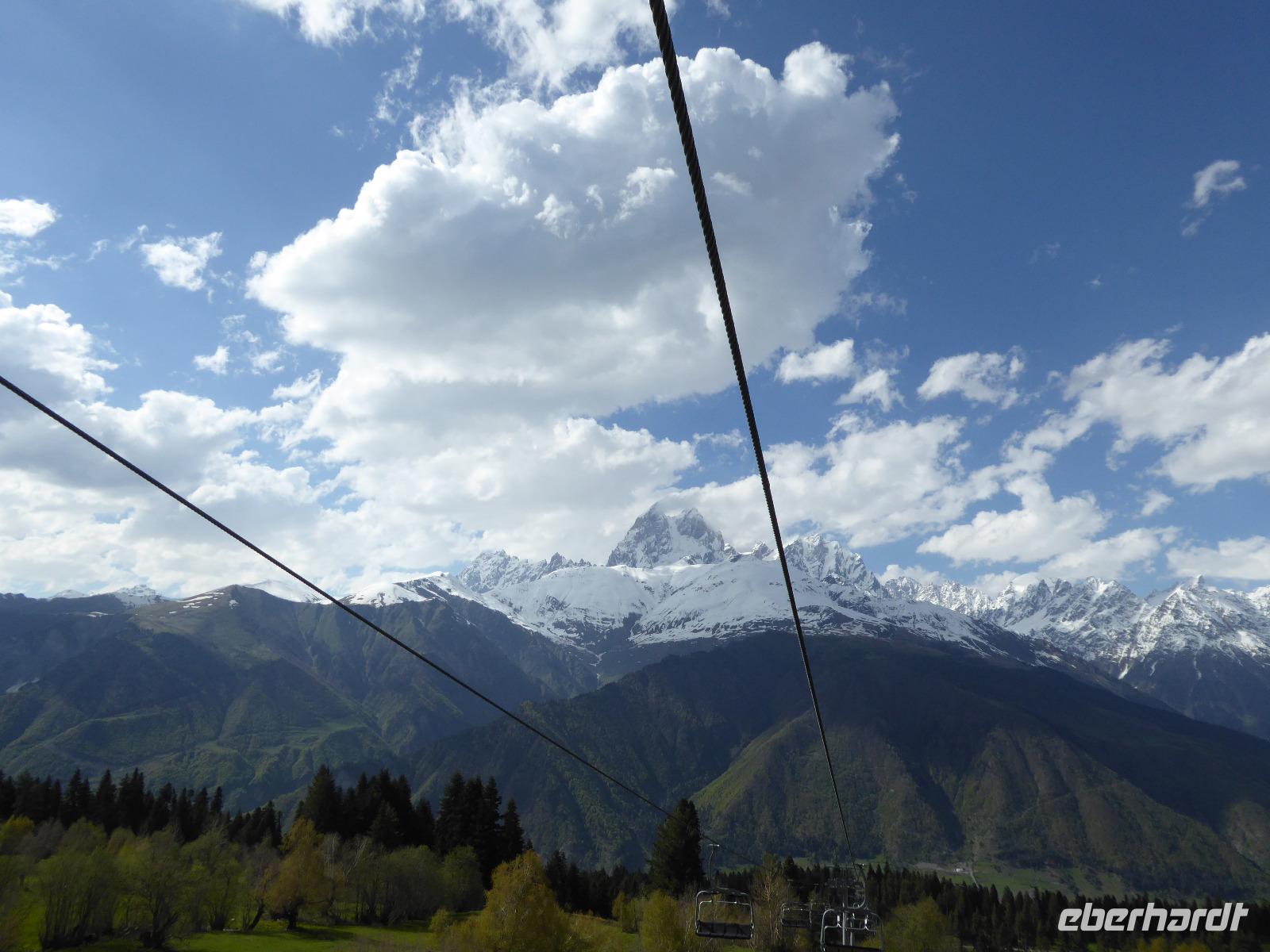 Nach dem Frühstück werden wir wieder von drei Jeeps abgeholt. Wir fahren Richtung Flughafen und dann noch ca. zehn Kilometer über die holprige Piste. An einer abenteuerlich wirkenden Brücke steigen wir aus. Ab hier geht es zu Fuß weiter. Über die Brücke dürfen immer nur zwei Personen gehen. Es wackelt ein bisschen - nur nicht die Nerven verlieren. Danach geht es anderthalb Kilometer steil bergauf. Der Himmel ist blau, die Sonne lacht und die Bergspitzen sind mit Schnee bedeckt. Es geht weiter steil bergauf. Manchmal auch ein wenig bergab. Neben uns rauscht ein mächtiger Fluss. Wir klettern über Steine - große und kleine. Immer weiter. Manchmal kommen uns Wanderer entgegen, ein schwarzer Hund überholt uns. Wir kommen ganz schön ins Schwitzen. Irgendwann, nach einer weiteren Klettertour ist es geschafft. Wir erblicken, nachdem wir 420 Höhenmeter überwunden haben, den Chalaadi-Gletscher. Jetzt heißt es erst einmal durchatmen. Bald danach machen wir uns auf den Rückweg. Unterwegs gönnen wir uns eine Pause und ein leckeres Picknick. An der frischen Luft schmecken Brot, Käse, Wurst und Tomaten doch nochmal so gut. Zum Nachtisch gibt es, außer Äpfeln und Keksen, Tschurtschela - eine georgische Süßigkeit aus Walnüssen und eingedicktem Weintraubensaft. Nun bleibt uns nichts weiter übrig, als den anstrengenden Weg zurück einzuschlagen. Müde, erschöpft aber glücklich, kommen wir an der Brücke an. Wieder Step by Step, immer schön in Zweiergruppen, kehren wir zu unseren Jeeps zurück. Auf dem Weg zum Hotel Banguriani kommen wir am Flughafen vorbei. Schau an - da steht ein Flugzeug :-). Vanilla Sky heißt die Fluggesellschaft, die Mestia anfliegt. Eine halbe Stunde Pause ist uns im Hotel vergönnt. Schnell die verschwitzten Sachen wechseln, einen Kaffee trinken oder ein zehn Minuten Schläfchen, dann geht das Programm schon weiter. Wir fahren noch einmal nach Hatsvali. Von hier aus bringt uns der Sessellift auf 2300 Meter Höhe. Das Restaurant Zuruldi liegt sogar noch vierzig Meter höher. Es ist das höchstgelegene Restaurant Georgiens. Dort erwartet uns eine gewaltige Aussicht. 360 Grad rund um nur Berge, Berge, Berge. Und dazu strahlend blauer Himmel und Sonne satt. Schöner geht's nicht. Der Große Kaukasus verabschiedet sich würdig von uns. Diese Erinnerung bleibt für immer.