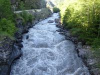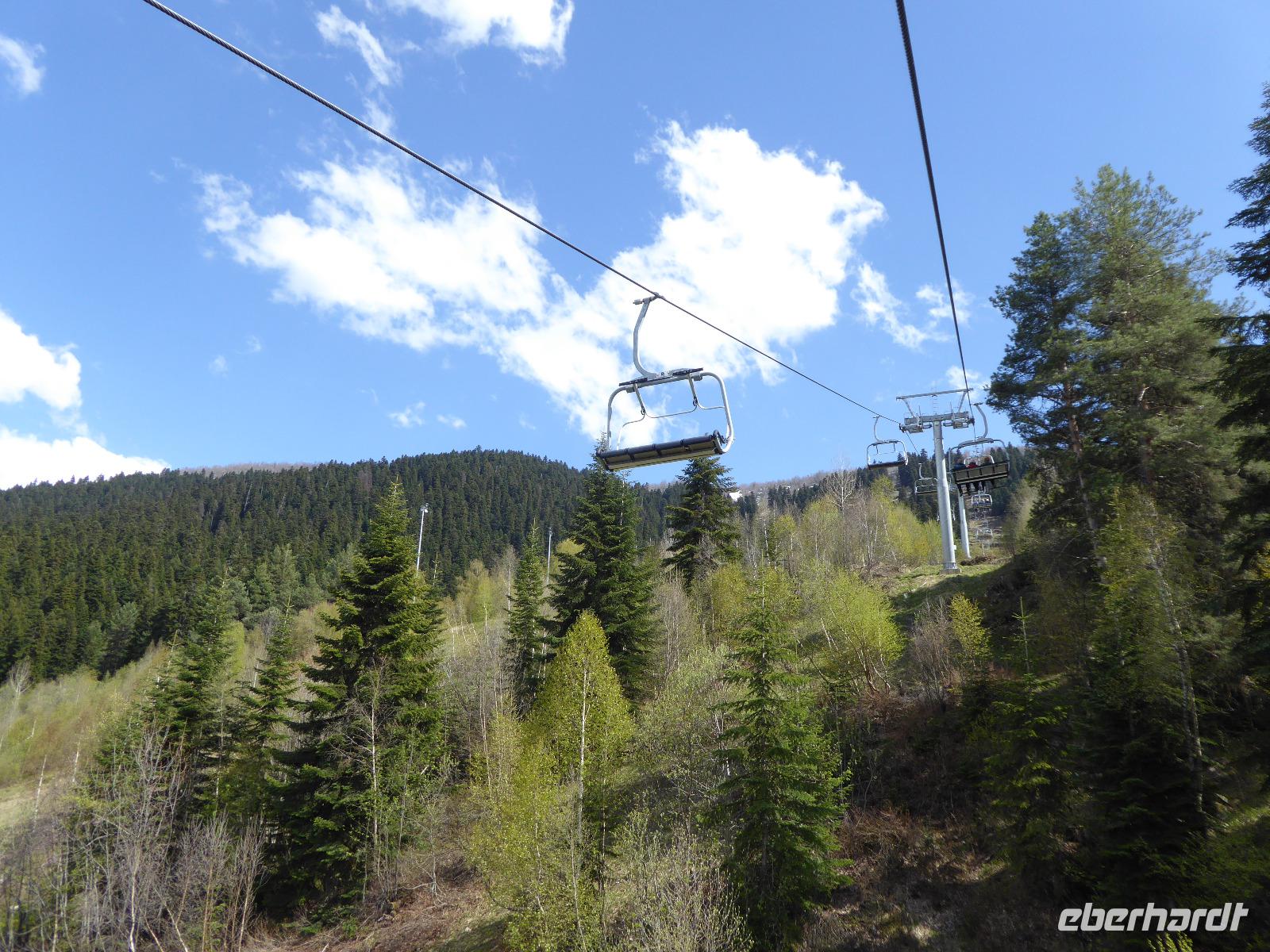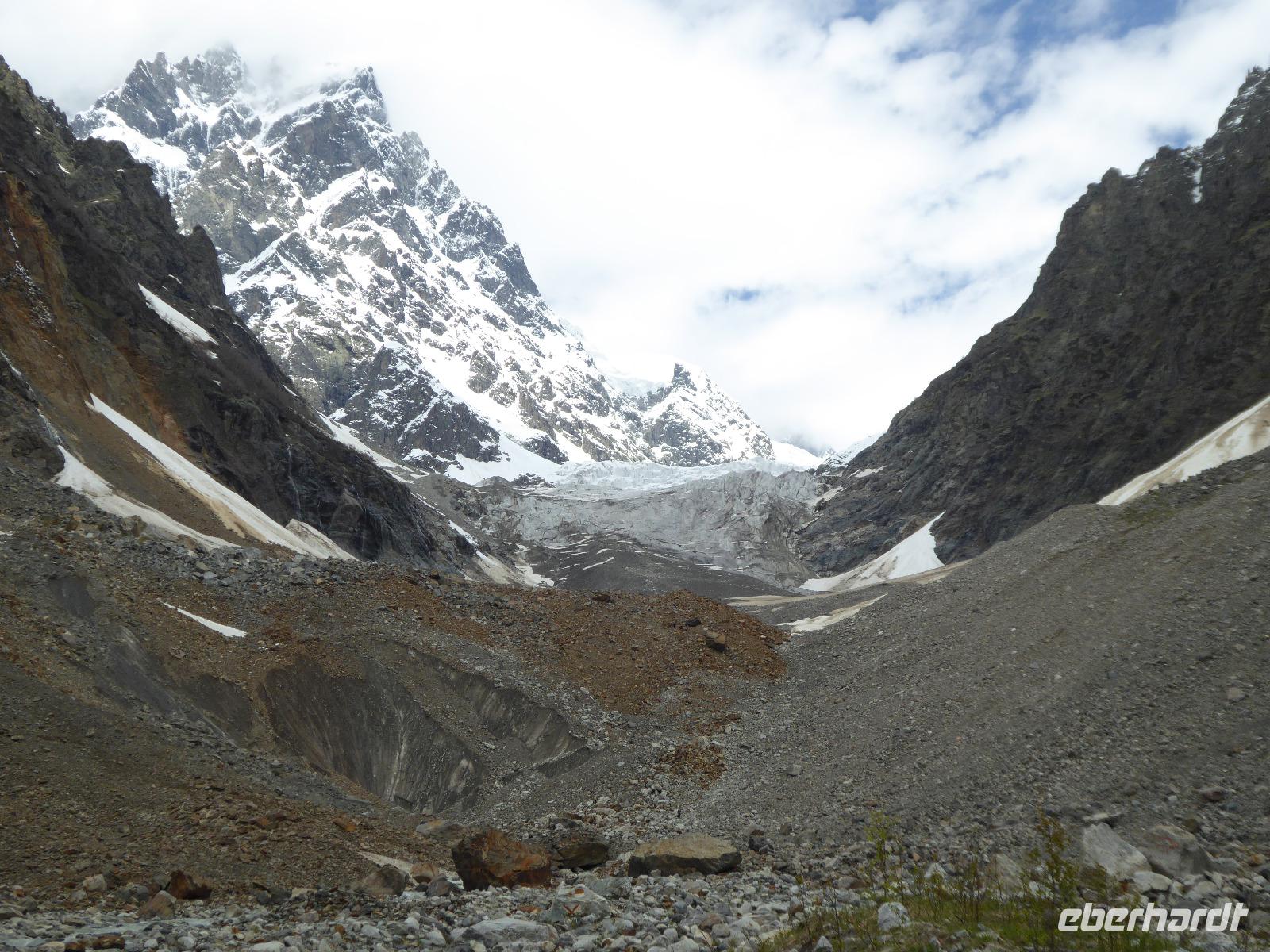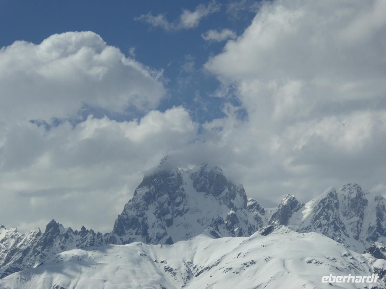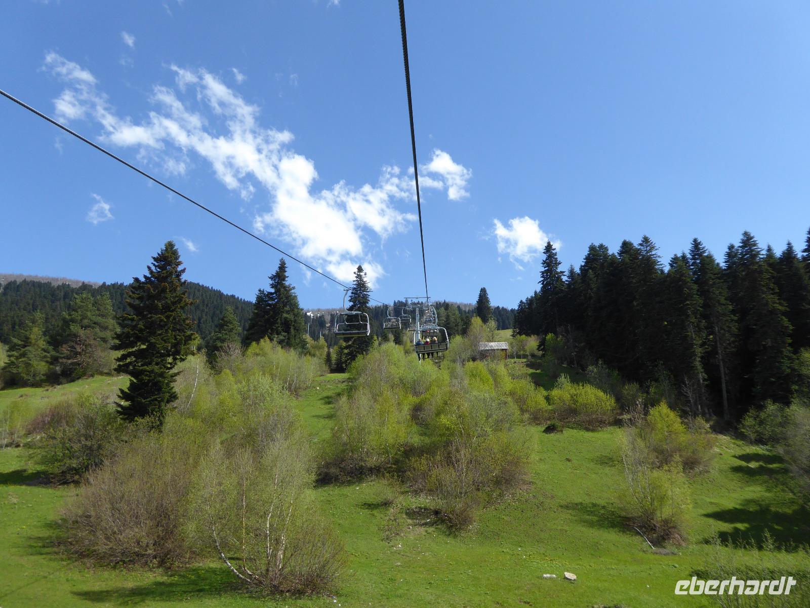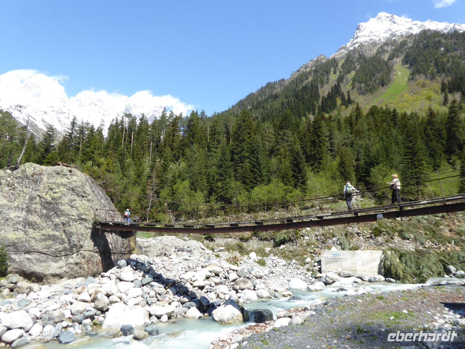 Nach dem Frühstück werden wir wieder von drei Jeeps abgeholt. Wir fahren Richtung Flughafen und dann noch ca. zehn Kilometer über die holprige Piste. An einer abenteuerlich wirkenden Brücke steigen wir aus. Ab hier geht es zu Fuß weiter. Über die Brücke dürfen immer nur zwei Personen gehen. Es wackelt ein bisschen - nur nicht die Nerven verlieren. Danach geht es anderthalb Kilometer steil bergauf. Der Himmel ist blau, die Sonne lacht und die Bergspitzen sind mit Schnee bedeckt. Es geht weiter steil bergauf. Manchmal auch ein wenig bergab. Neben uns rauscht ein mächtiger Fluss. Wir klettern über Steine - große und kleine. Immer weiter. Manchmal kommen uns Wanderer entgegen, ein schwarzer Hund überholt uns. Wir kommen ganz schön ins Schwitzen. Irgendwann, nach einer weiteren Klettertour ist es geschafft. Wir erblicken, nachdem wir 420 Höhenmeter überwunden haben, den Chalaadi-Gletscher. Jetzt heißt es erst einmal durchatmen. Bald danach machen wir uns auf den Rückweg. Unterwegs gönnen wir uns eine Pause und ein leckeres Picknick. An der frischen Luft schmecken Brot, Käse, Wurst und Tomaten doch nochmal so gut. Zum Nachtisch gibt es, außer Äpfeln und Keksen, Tschurtschela - eine georgische Süßigkeit aus Walnüssen und eingedicktem Weintraubensaft. Nun bleibt uns nichts weiter übrig, als den anstrengenden Weg zurück einzuschlagen. Müde, erschöpft aber glücklich, kommen wir an der Brücke an. Wieder Step by Step, immer schön in Zweiergruppen, kehren wir zu unseren Jeeps zurück. Auf dem Weg zum Hotel Banguriani kommen wir am Flughafen vorbei. Schau an - da steht ein Flugzeug :-). Vanilla Sky heißt die Fluggesellschaft, die Mestia anfliegt. Eine halbe Stunde Pause ist uns im Hotel vergönnt. Schnell die verschwitzten Sachen wechseln, einen Kaffee trinken oder ein zehn Minuten Schläfchen, dann geht das Programm schon weiter. Wir fahren noch einmal nach Hatsvali. Von hier aus bringt uns der Sessellift auf 2300 Meter Höhe. Das Restaurant Zuruldi liegt sogar noch vierzig Meter höher. Es ist das höchstgelegene Restaurant Georgiens. Dort erwartet uns eine gewaltige Aussicht. 360 Grad rund um nur Berge, Berge, Berge. Und dazu strahlend blauer Himmel und Sonne satt. Schöner geht's nicht. Der Große Kaukasus verabschiedet sich würdig von uns. Diese Erinnerung bleibt für immer.
