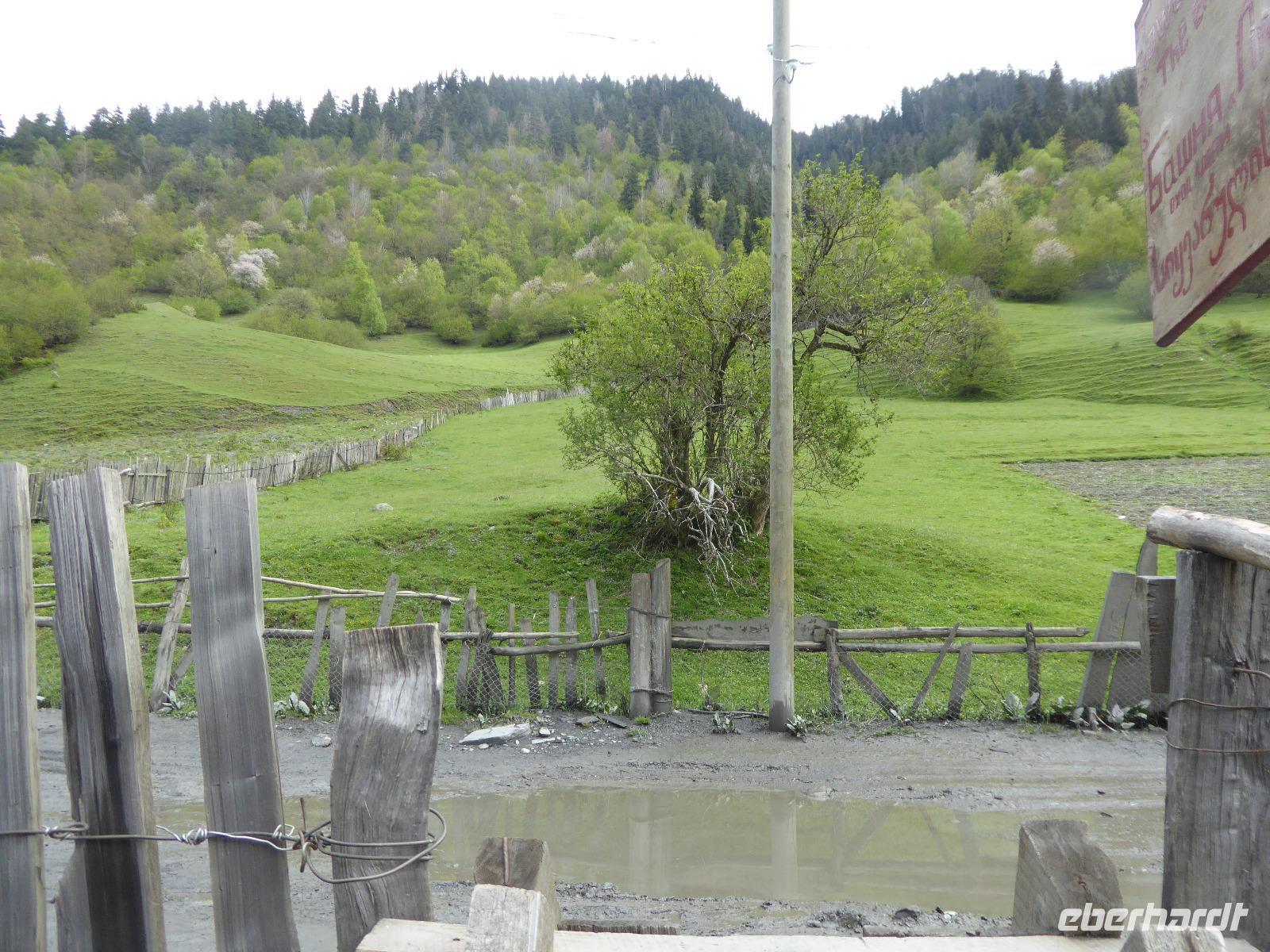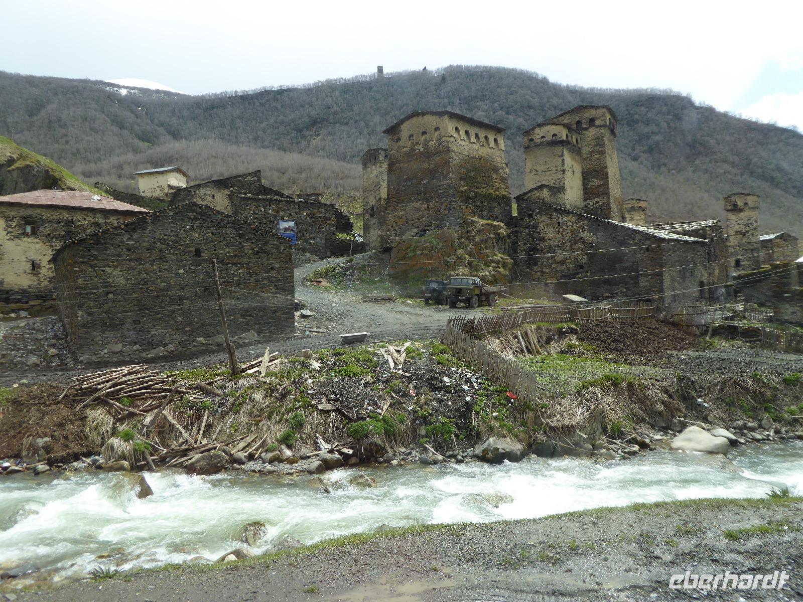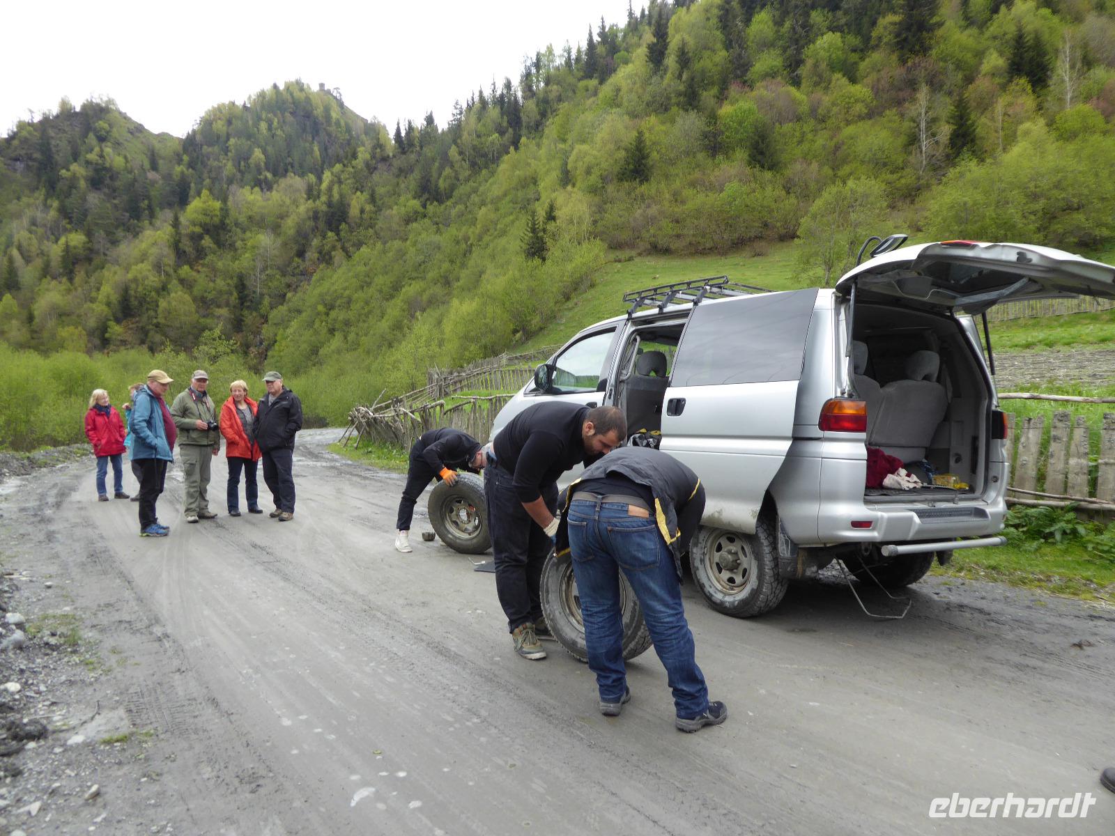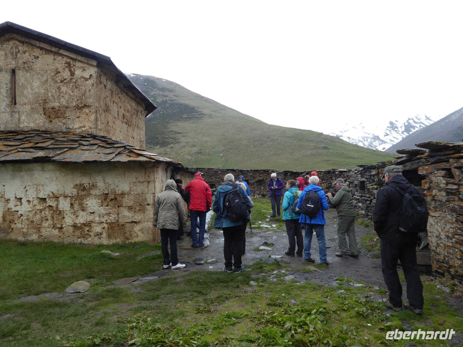 Mit einem gemütlichen Frühstück und viel Sonne starten wir in den Tag. Halb Zehn kommen drei Allrad-Jeeps angefahren und holen uns ab. Wir fahren heute in das höchste ganzjährig bewohnte Dorf Europas - nach Ushguli. Zunächst einmal geht es eine ganze Zeit lang über eine asphaltierte Straße. Und was soll hier dran nun abenteuerlich sein? Na wartet mal, gleich geht es los. Denn plötzlich ist die Straße zu Ende und es beginnt ein Ruckel und Gezuckel durch Schlamm und aufgewühlte Erde. Wir werden ordentlich durchgerüttelt. Mehrmals müssen wir Wasserläufe überqueren, die als rauschende Bäche von oben herabgestürzt kommen, sich über die Straße ergießen, um sich dann weiter den Weg durch die Berge zu suchen. Das ist nichts für schwache Nerven. Fast zwei Stunden dauert es, bis wir unseren ersten Fotostopp am Turm der Liebe einlegen. Warum wird der Turm so genannt? Weil zwei junge Menschen in einander verliebt waren, jedoch verfeindeten Familien angehörten. Sie verabredeten sich an dem Turm, um gemeinsam zu fliehen. Die Familie des (reichen) Mädchens aber bekam Wind davon. Sie ermordeten den Jüngling, der einer ärmeren Familie angehörte, um zu verhindern, dass sich die Beiden heimlich vermählen. Und so kam der junge Mann niemals zum Turm. Das Mädchen aber wartete und wartete. Bis zu ihrem Tod. :-( Heute gehört der Turm einem einheimischen Bauer, der einen Lari Eintritt pro Person haben will. Auch einen seiner wunderschönen Bergkristalle kann er noch verkaufen. Wir fahren weiter Richtung Ushguli bis wir von einer Reifenpanne aufgehalten werden. Wir staunen nicht schlecht, ruck zuck ist der Reifen gewechselt. Auf dem Weg nach Ushguli besuchen wir die Santa Barbara Kirche. Diese ist auch eher ein Kirchlein, jedoch sind die wertvollen Fresken hier besser erhalten als in der Kirche, die wir gestern besuchten. Nadja zündet eine Kerze an, bevor wir unseren Weg fortsetzen. Inzwischen regnet es und der sowieso schon unbefestigte Weg verwandelt sich in eine riesige Eierpampe. Gegen 14 Uhr kommen wir in Ushguli an. Zuerst besuchen wir die Lamaria Kirche. Auch diese muss für uns extra aufgeschlossen werden. Die meisten Kirchen in Svanetien sind verschlossen, weil sie wertvolle Ikonen aus dem 5. und 6. Jahrhundert und andere Kostbarkeiten bewahren. Nur unter strenger Aufsicht darf man hinein. Eigentlich dürfen Frauen in Hosen die Kirchen nicht betreten. Jedoch hat man sich hier den Touristen angepasst und akzeptiert ein um die Hüfte gebundenes Tuch. Ebenfalls ist es erwünscht, dass Damen sich den Kopf bedecken. Meistens haben wir unsere eigenen Tücher dabei. Und wenn nicht, gibt es vor den Kirche Körbe, aus denen man sich ein Tuch leihweise entnehmen kann. Nach der Besichtigung regnet es immer noch und wir fahren ins Café Koshka. Hier ist es, wie immer, rappelvoll. Doch wir haben Glück, denn eine Gruppe ist gerade fertig und wir können deren Tisch übernehmen. Es gibt Kaffee, Tee, Chachapuri und Gemüsesuppe, je nach Wahl. Als wir uns gestärkt haben, scheint endlich die Sonne und wir können ein Stück zu Fuß gehen. Auf dem Rückweg legen wir nochmals einen Fotostopp an den faszinierenden mittelalterlichen Türmen ein. Auf der Rückfahrt regnet es abermals und der Weg führt wieder durch Matsch und Pampe. Aber wir sitzen trocken im Auto und uns macht das nichts. Den letzten Stopp legen wir kurz vor Mestia ein. Hier gibt es eine natürliche Quelle mit saurem Mineralwasser. Nur ein Tapferer von uns getraut sich, das Wasser zu probieren. Halb sechs sind wir zurück am Hotel. Heute essen wir am Abend bei einer Familie. Da sich das Heim unserer Gastgeber in der Nähe befindet, gehen wir zu Fuß. Drei fröhliche Kinder toben im Hof. Auf einem Feuerchen brutzeln Schaschliks. Der Tisch ist gedeckt. Wir fühlen uns willkommen. Zunächst probieren wir die köstlichen Vorspeisen. Neben Tomaten und Gurken, gibt es georgischen Salat, mit Walnusspaste gefüllte Auberginen und ein Töpfchen Bohnen für jeden. Dazu georgischen Hauswein, Erdbeersaft und Wasser. Es folgen unglaublich leckere Hähnchen, Chachapuri und die Schaschlikspieße. Zum Nachtisch gibt es Kuchen. Vielen Dank an unsere georgischen Gastgeber.