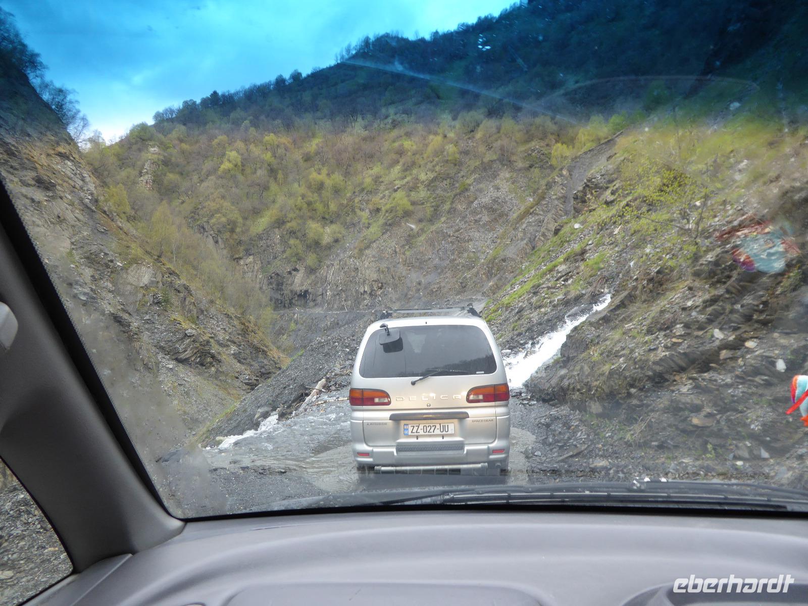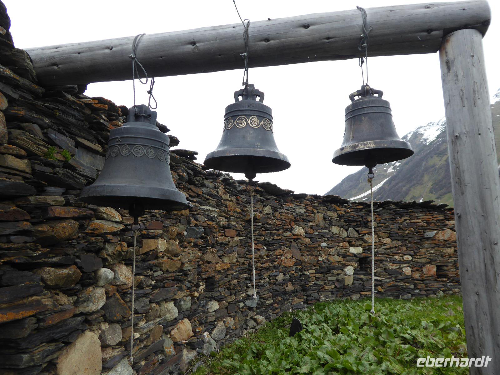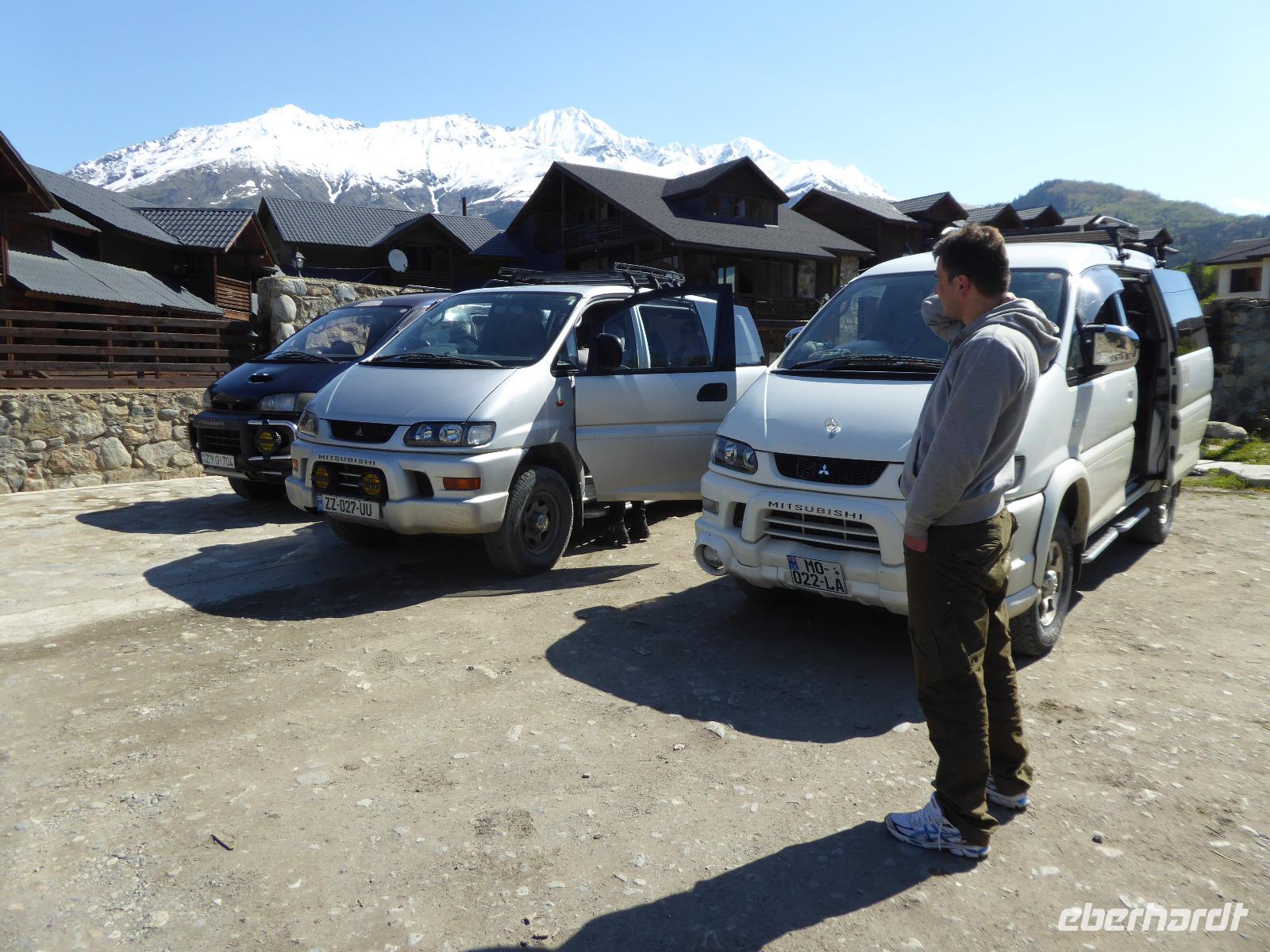 Mit einem gemütlichen Frühstück und viel Sonne starten wir in den Tag. Halb Zehn kommen drei Allrad-Jeeps angefahren und holen uns ab. Wir fahren heute in das höchste ganzjährig bewohnte Dorf Europas - nach Ushguli. Zunächst einmal geht es eine ganze Zeit lang über eine asphaltierte Straße. Und was soll hier dran nun abenteuerlich sein? Na wartet mal, gleich geht es los. Denn plötzlich ist die Straße zu Ende und es beginnt ein Ruckel und Gezuckel durch Schlamm und aufgewühlte Erde. Wir werden ordentlich durchgerüttelt. Mehrmals müssen wir Wasserläufe überqueren, die als rauschende Bäche von oben herabgestürzt kommen, sich über die Straße ergießen, um sich dann weiter den Weg durch die Berge zu suchen. Das ist nichts für schwache Nerven. Fast zwei Stunden dauert es, bis wir unseren ersten Fotostopp am Turm der Liebe einlegen. Warum wird der Turm so genannt? Weil zwei junge Menschen in einander verliebt waren, jedoch verfeindeten Familien angehörten. Sie verabredeten sich an dem Turm, um gemeinsam zu fliehen. Die Familie des (reichen) Mädchens aber bekam Wind davon. Sie ermordeten den Jüngling, der einer ärmeren Familie angehörte, um zu verhindern, dass sich die Beiden heimlich vermählen. Und so kam der junge Mann niemals zum Turm. Das Mädchen aber wartete und wartete. Bis zu ihrem Tod. :-( Heute gehört der Turm einem einheimischen Bauer, der einen Lari Eintritt pro Person haben will. Auch einen seiner wunderschönen Bergkristalle kann er noch verkaufen. Wir fahren weiter Richtung Ushguli bis wir von einer Reifenpanne aufgehalten werden. Wir staunen nicht schlecht, ruck zuck ist der Reifen gewechselt. Auf dem Weg nach Ushguli besuchen wir die Santa Barbara Kirche. Diese ist auch eher ein Kirchlein, jedoch sind die wertvollen Fresken hier besser erhalten als in der Kirche, die wir gestern besuchten. Nadja zündet eine Kerze an, bevor wir unseren Weg fortsetzen. Inzwischen regnet es und der sowieso schon unbefestigte Weg verwandelt sich in eine riesige Eierpampe. Gegen 14 Uhr kommen wir in Ushguli an. Zuerst besuchen wir die Lamaria Kirche. Auch diese muss für uns extra aufgeschlossen werden. Die meisten Kirchen in Svanetien sind verschlossen, weil sie wertvolle Ikonen aus dem 5. und 6. Jahrhundert und andere Kostbarkeiten bewahren. Nur unter strenger Aufsicht darf man hinein. Eigentlich dürfen Frauen in Hosen die Kirchen nicht betreten. Jedoch hat man sich hier den Touristen angepasst und akzeptiert ein um die Hüfte gebundenes Tuch. Ebenfalls ist es erwünscht, dass Damen sich den Kopf bedecken. Meistens haben wir unsere eigenen Tücher dabei. Und wenn nicht, gibt es vor den Kirche Körbe, aus denen man sich ein Tuch leihweise entnehmen kann. Nach der Besichtigung regnet es immer noch und wir fahren ins Café Koshka. Hier ist es, wie immer, rappelvoll. Doch wir haben Glück, denn eine Gruppe ist gerade fertig und wir können deren Tisch übernehmen. Es gibt Kaffee, Tee, Chachapuri und Gemüsesuppe, je nach Wahl. Als wir uns gestärkt haben, scheint endlich die Sonne und wir können ein Stück zu Fuß gehen. Auf dem Rückweg legen wir nochmals einen Fotostopp an den faszinierenden mittelalterlichen Türmen ein. Auf der Rückfahrt regnet es abermals und der Weg führt wieder durch Matsch und Pampe. Aber wir sitzen trocken im Auto und uns macht das nichts. Den letzten Stopp legen wir kurz vor Mestia ein. Hier gibt es eine natürliche Quelle mit saurem Mineralwasser. Nur ein Tapferer von uns getraut sich, das Wasser zu probieren. Halb sechs sind wir zurück am Hotel. Heute essen wir am Abend bei einer Familie. Da sich das Heim unserer Gastgeber in der Nähe befindet, gehen wir zu Fuß. Drei fröhliche Kinder toben im Hof. Auf einem Feuerchen brutzeln Schaschliks. Der Tisch ist gedeckt. Wir fühlen uns willkommen. Zunächst probieren wir die köstlichen Vorspeisen. Neben Tomaten und Gurken, gibt es georgischen Salat, mit Walnusspaste gefüllte Auberginen und ein Töpfchen Bohnen für jeden. Dazu georgischen Hauswein, Erdbeersaft und Wasser. Es folgen unglaublich leckere Hähnchen, Chachapuri und die Schaschlikspieße. Zum Nachtisch gibt es Kuchen. Vielen Dank an unsere georgischen Gastgeber.