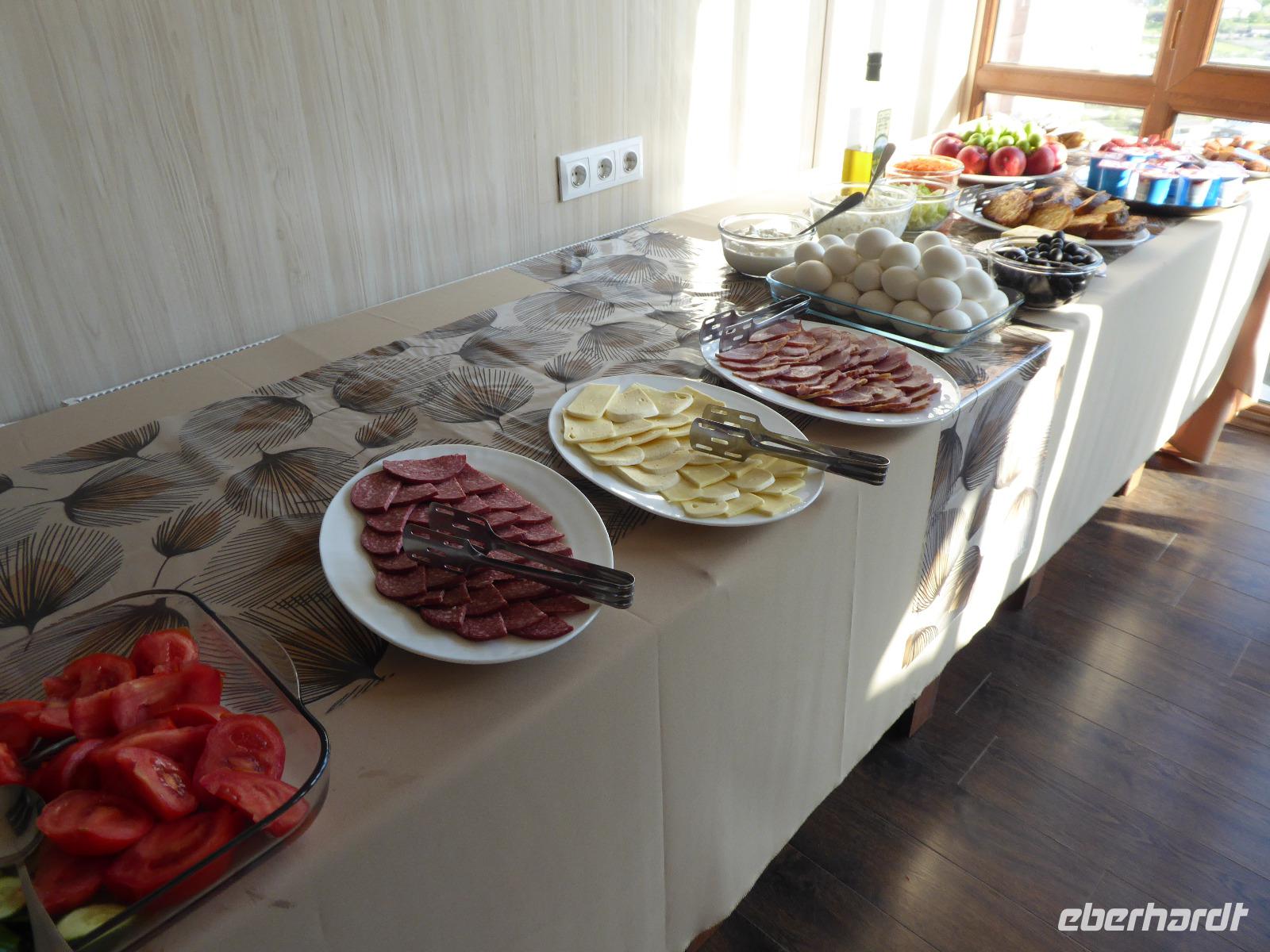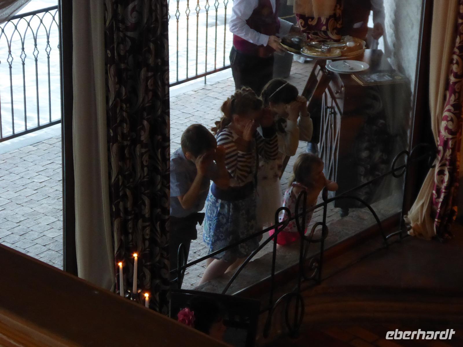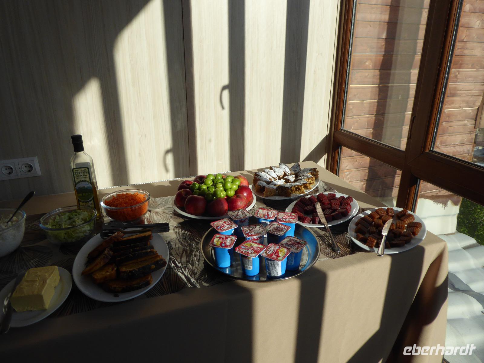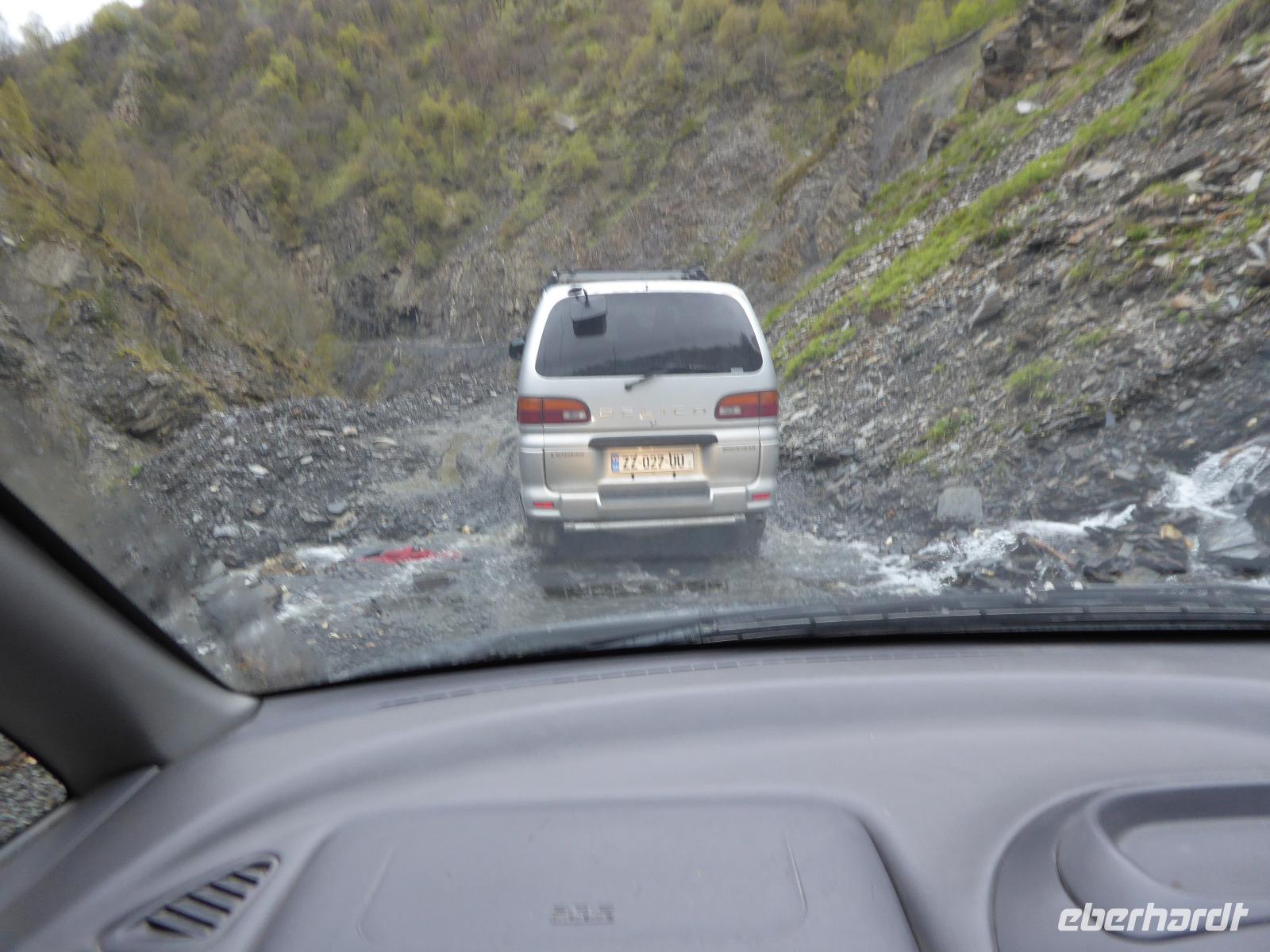 Mit einem gemütlichen Frühstück und viel Sonne starten wir in den Tag. Halb Zehn kommen drei Allrad-Jeeps angefahren und holen uns ab. Wir fahren heute in das höchste ganzjährig bewohnte Dorf Europas - nach Ushguli. Zunächst einmal geht es eine ganze Zeit lang über eine asphaltierte Straße. Und was soll hier dran nun abenteuerlich sein? Na wartet mal, gleich geht es los. Denn plötzlich ist die Straße zu Ende und es beginnt ein Ruckel und Gezuckel durch Schlamm und aufgewühlte Erde. Wir werden ordentlich durchgerüttelt. Mehrmals müssen wir Wasserläufe überqueren, die als rauschende Bäche von oben herabgestürzt kommen, sich über die Straße ergießen, um sich dann weiter den Weg durch die Berge zu suchen. Das ist nichts für schwache Nerven. Fast zwei Stunden dauert es, bis wir unseren ersten Fotostopp am Turm der Liebe einlegen. Warum wird der Turm so genannt? Weil zwei junge Menschen in einander verliebt waren, jedoch verfeindeten Familien angehörten. Sie verabredeten sich an dem Turm, um gemeinsam zu fliehen. Die Familie des (reichen) Mädchens aber bekam Wind davon. Sie ermordeten den Jüngling, der einer ärmeren Familie angehörte, um zu verhindern, dass sich die Beiden heimlich vermählen. Und so kam der junge Mann niemals zum Turm. Das Mädchen aber wartete und wartete. Bis zu ihrem Tod. :-( Heute gehört der Turm einem einheimischen Bauer, der einen Lari Eintritt pro Person haben will. Auch einen seiner wunderschönen Bergkristalle kann er noch verkaufen. Wir fahren weiter Richtung Ushguli bis wir von einer Reifenpanne aufgehalten werden. Wir staunen nicht schlecht, ruck zuck ist der Reifen gewechselt. Auf dem Weg nach Ushguli besuchen wir die Santa Barbara Kirche. Diese ist auch eher ein Kirchlein, jedoch sind die wertvollen Fresken hier besser erhalten als in der Kirche, die wir gestern besuchten. Nadja zündet eine Kerze an, bevor wir unseren Weg fortsetzen. Inzwischen regnet es und der sowieso schon unbefestigte Weg verwandelt sich in eine riesige Eierpampe. Gegen 14 Uhr kommen wir in Ushguli an. Zuerst besuchen wir die Lamaria Kirche. Auch diese muss für uns extra aufgeschlossen werden. Die meisten Kirchen in Svanetien sind verschlossen, weil sie wertvolle Ikonen aus dem 5. und 6. Jahrhundert und andere Kostbarkeiten bewahren. Nur unter strenger Aufsicht darf man hinein. Eigentlich dürfen Frauen in Hosen die Kirchen nicht betreten. Jedoch hat man sich hier den Touristen angepasst und akzeptiert ein um die Hüfte gebundenes Tuch. Ebenfalls ist es erwünscht, dass Damen sich den Kopf bedecken. Meistens haben wir unsere eigenen Tücher dabei. Und wenn nicht, gibt es vor den Kirche Körbe, aus denen man sich ein Tuch leihweise entnehmen kann. Nach der Besichtigung regnet es immer noch und wir fahren ins Café Koshka. Hier ist es, wie immer, rappelvoll. Doch wir haben Glück, denn eine Gruppe ist gerade fertig und wir können deren Tisch übernehmen. Es gibt Kaffee, Tee, Chachapuri und Gemüsesuppe, je nach Wahl. Als wir uns gestärkt haben, scheint endlich die Sonne und wir können ein Stück zu Fuß gehen. Auf dem Rückweg legen wir nochmals einen Fotostopp an den faszinierenden mittelalterlichen Türmen ein. Auf der Rückfahrt regnet es abermals und der Weg führt wieder durch Matsch und Pampe. Aber wir sitzen trocken im Auto und uns macht das nichts. Den letzten Stopp legen wir kurz vor Mestia ein. Hier gibt es eine natürliche Quelle mit saurem Mineralwasser. Nur ein Tapferer von uns getraut sich, das Wasser zu probieren. Halb sechs sind wir zurück am Hotel. Heute essen wir am Abend bei einer Familie. Da sich das Heim unserer Gastgeber in der Nähe befindet, gehen wir zu Fuß. Drei fröhliche Kinder toben im Hof. Auf einem Feuerchen brutzeln Schaschliks. Der Tisch ist gedeckt. Wir fühlen uns willkommen. Zunächst probieren wir die köstlichen Vorspeisen. Neben Tomaten und Gurken, gibt es georgischen Salat, mit Walnusspaste gefüllte Auberginen und ein Töpfchen Bohnen für jeden. Dazu georgischen Hauswein, Erdbeersaft und Wasser. Es folgen unglaublich leckere Hähnchen, Chachapuri und die Schaschlikspieße. Zum Nachtisch gibt es Kuchen. Vielen Dank an unsere georgischen Gastgeber.