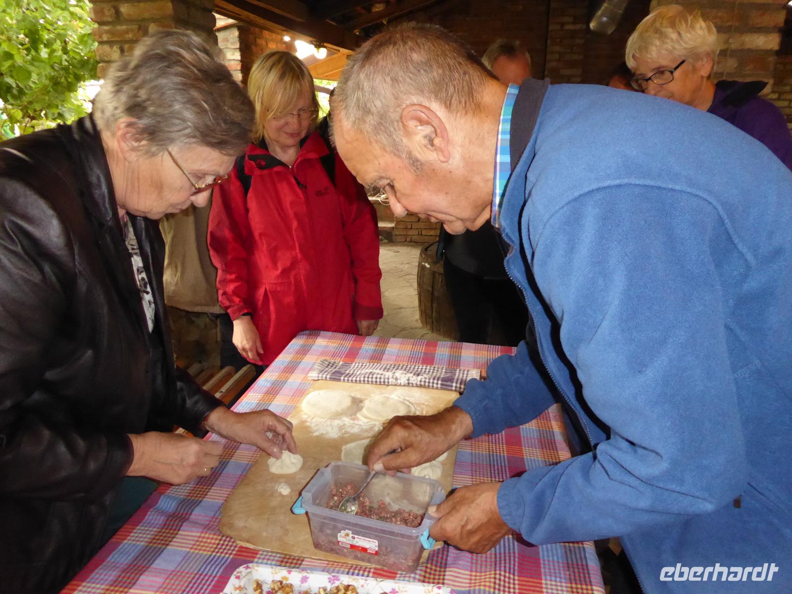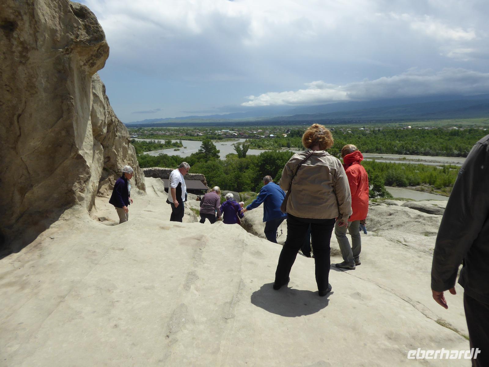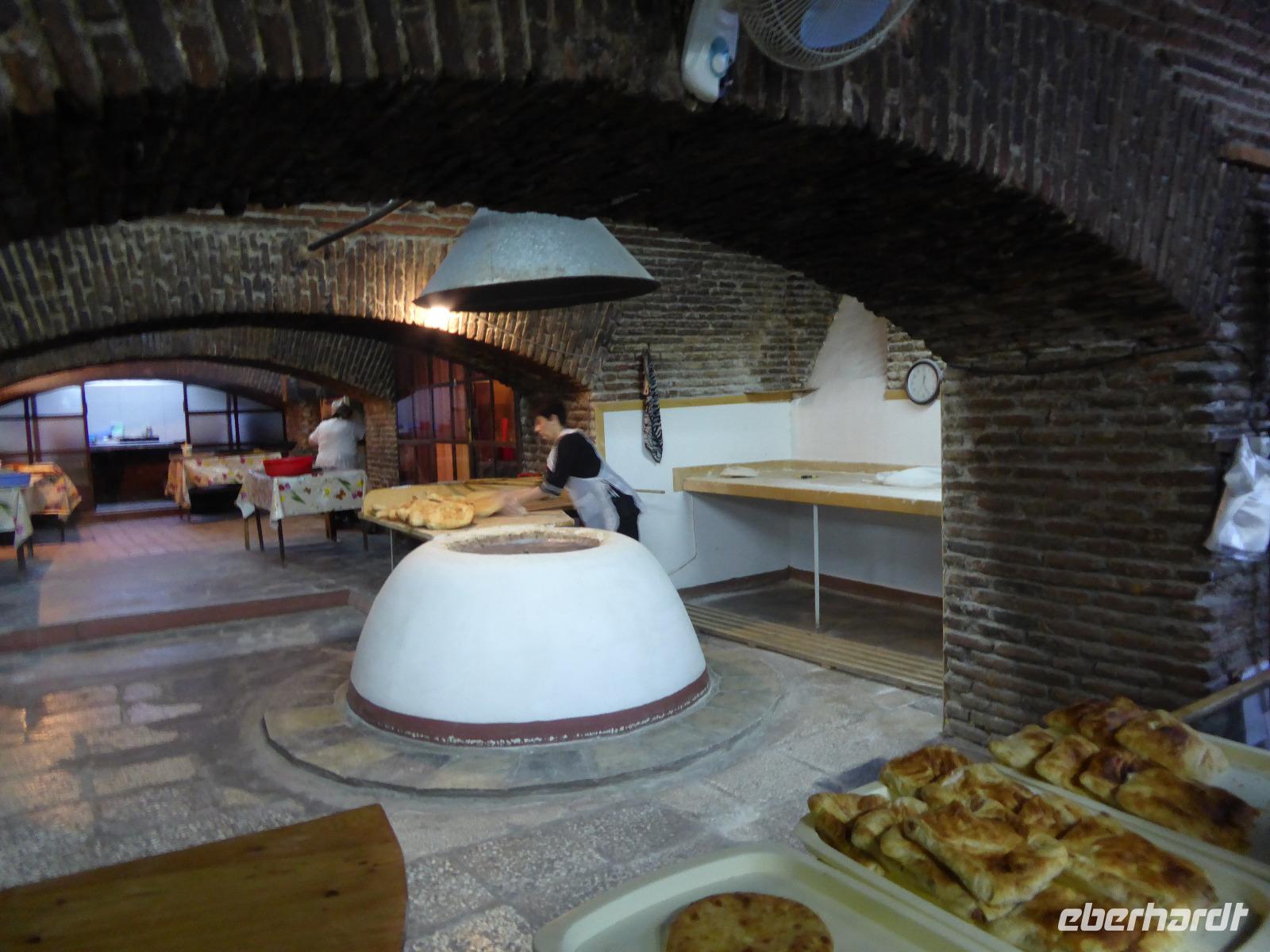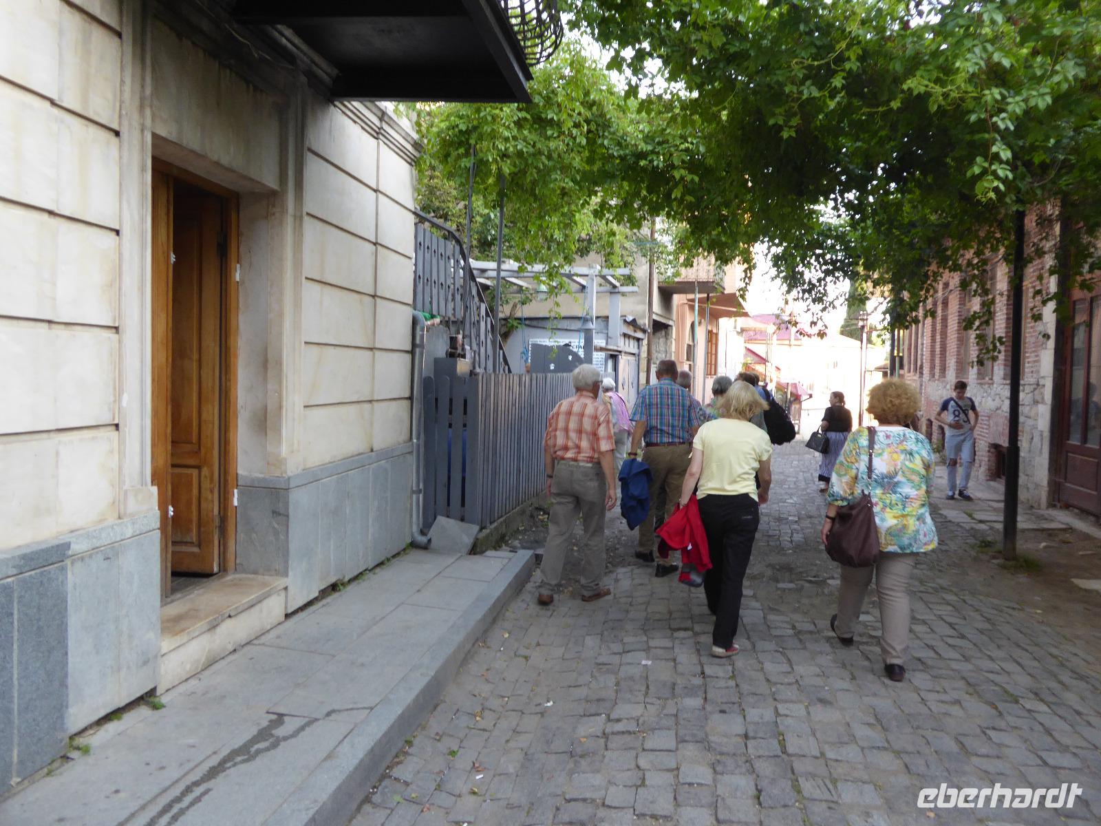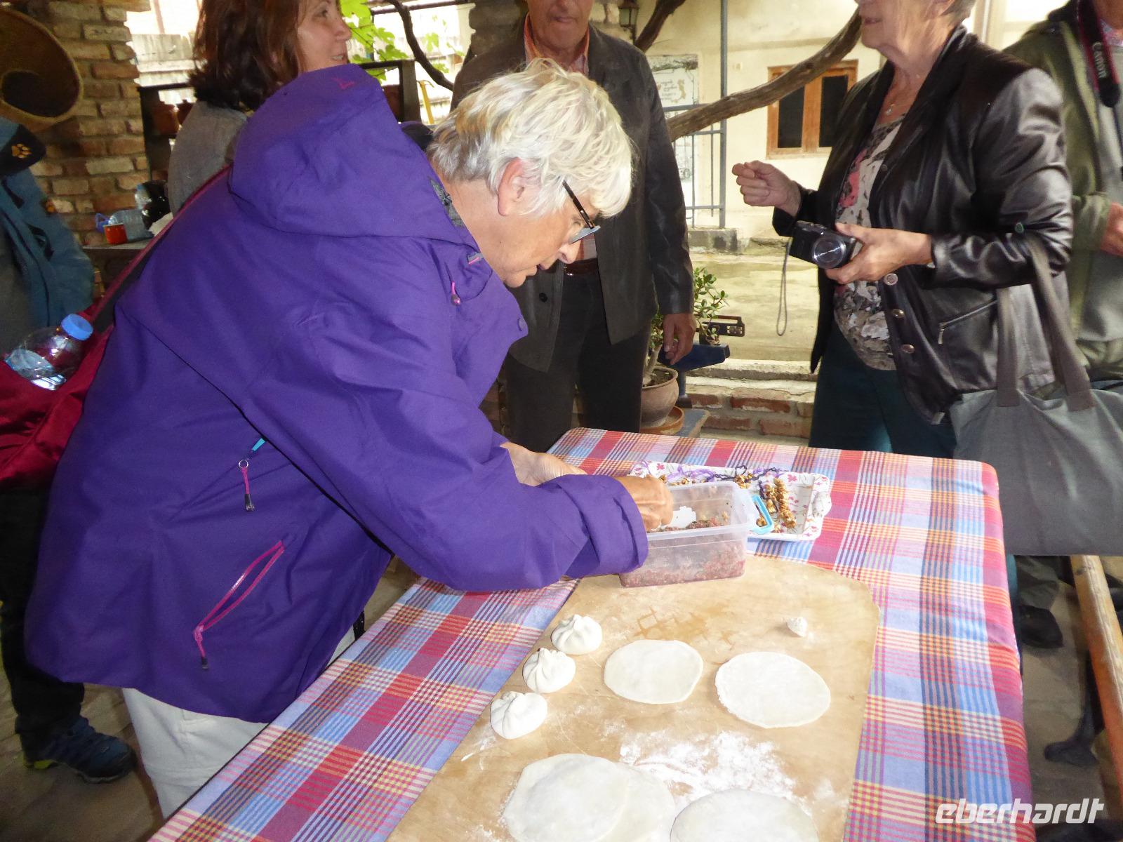 Mit gepackten Koffern treten wir unseren Weg nach Tbilissi an. Heute haben wir viel vor. Zunächst einmal stoppen wir am Georgischen Parlamentsgebäude, dass von außen wie eine Schildkröte aussieht. Man kann nur hoffen, dass die Parlamentarier nicht den Übereifer einer Schildkröte an den Tag legen. Unser nächstes Ziel ist Gori. Hier fahren wir jedoch erst einmal vorbei und besuchen Uplisziche, eine alte Höhlenstadt. Im 15. Und 16. Jahrhundert tobte hier das Leben. Es gibt einen roten Saal, einen einfachen Saal, eine Apotheke und andere geschichtsträchtige Höhlenzimmer. Mit ein bisschen Phantasie kann man sich das Leben damals hier vorstellen. Es ist sehr windig und wir (Frauen) wünschten, wir hätten unser Drei-Wetter-Taft dabei :-). Nach vielen Klettertouren erreichen wir den Ausgang, der über eine steile Treppe nach unten führt. Im Restaurant gönnen wir uns Kaffee und Kuchen - so viel Zeit muss sein. Nun geht es doch noch nach Gori, wo wir das Geburtshaus von Stalin besuchen. Auch in das Stalinmuseum werfen wir einen Blick. Will wirklich jemand Tassen, Flaschen oder andere, mit Stalins Konterfei verzierten Dinge, kaufen? Wir sind irritiert. Schnell weg hier. Wir fahren zu Iago und tauchen wir tief in den georgischen Alltag ein. Geschickt stellen wir uns beim Brot backen an. Auch das Falten der Khinkalitaschen klappt. Und aufgefädelte Walnüsse in eingedickten Traubensaft tauchen? Geschenkt! Das Abendessen haben wir uns verdient. Wie schön, dass uns georgische Sänger durch den Abend begleiten. Dato ist unser Tamar. Seine Trinksprüche sind ziemlich ernst. Wir trinken auf den Frieden und auf die Freundschaft. Auch wir tragen unser Lied zur Abendgestaltung bei. Wenn alle Brünnlein fließen, klingt doch gar nicht so schlecht, was? :-).