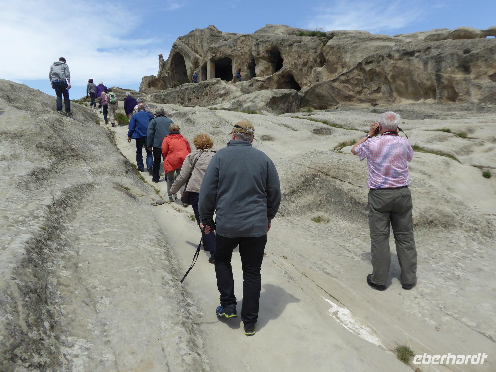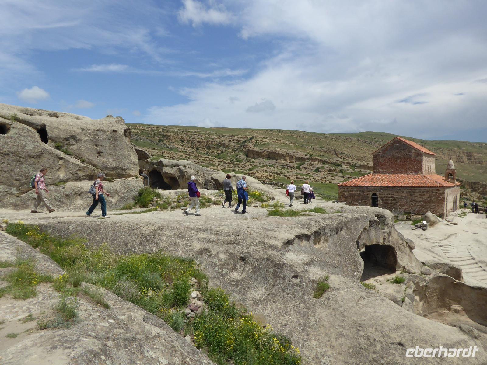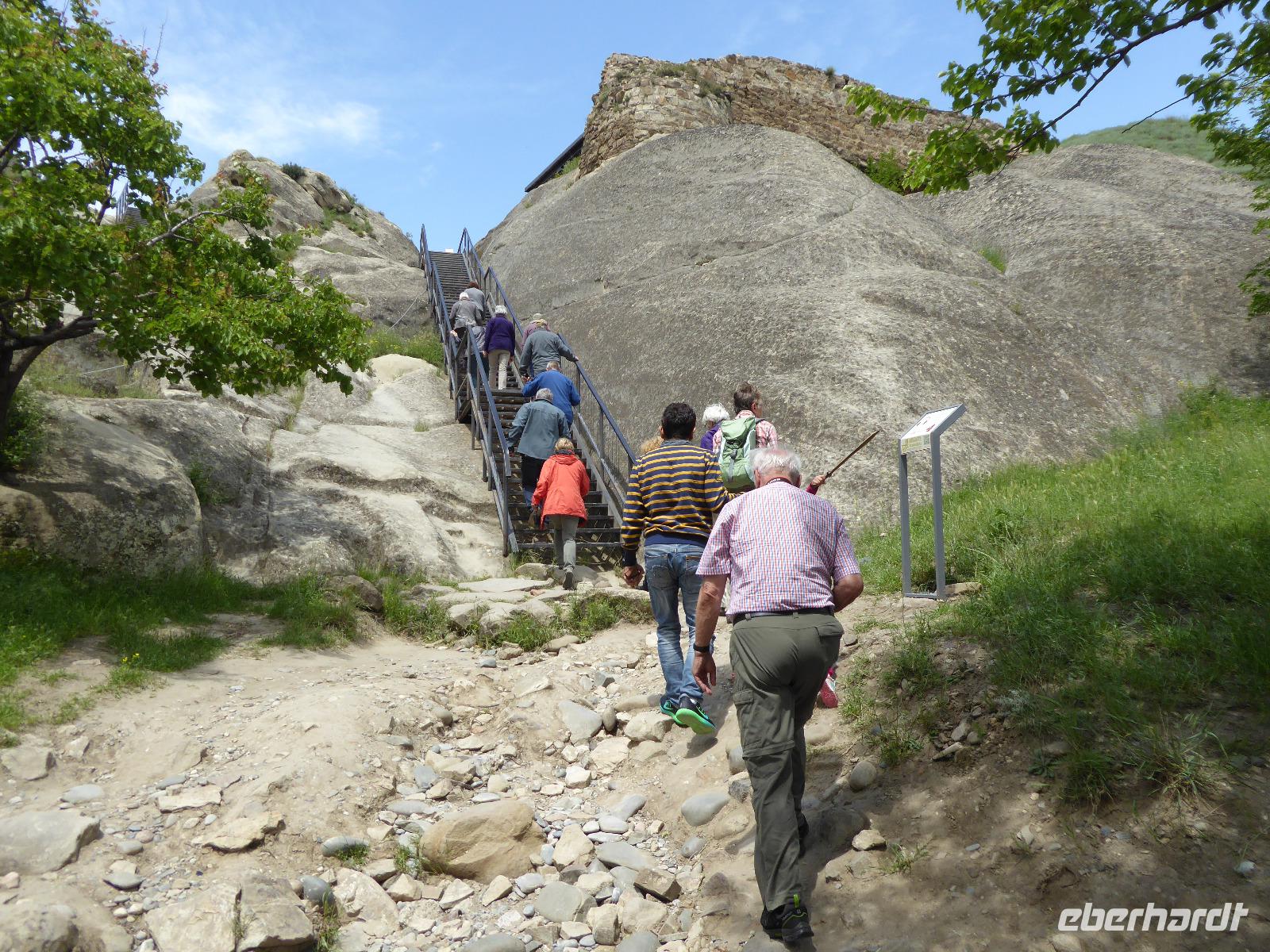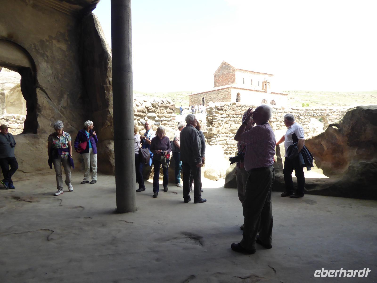 Mit gepackten Koffern treten wir unseren Weg nach Tbilissi an. Heute haben wir viel vor. Zunächst einmal stoppen wir am Georgischen Parlamentsgebäude, dass von außen wie eine Schildkröte aussieht. Man kann nur hoffen, dass die Parlamentarier nicht den Übereifer einer Schildkröte an den Tag legen. Unser nächstes Ziel ist Gori. Hier fahren wir jedoch erst einmal vorbei und besuchen Uplisziche, eine alte Höhlenstadt. Im 15. Und 16. Jahrhundert tobte hier das Leben. Es gibt einen roten Saal, einen einfachen Saal, eine Apotheke und andere geschichtsträchtige Höhlenzimmer. Mit ein bisschen Phantasie kann man sich das Leben damals hier vorstellen. Es ist sehr windig und wir (Frauen) wünschten, wir hätten unser Drei-Wetter-Taft dabei :-). Nach vielen Klettertouren erreichen wir den Ausgang, der über eine steile Treppe nach unten führt. Im Restaurant gönnen wir uns Kaffee und Kuchen - so viel Zeit muss sein. Nun geht es doch noch nach Gori, wo wir das Geburtshaus von Stalin besuchen. Auch in das Stalinmuseum werfen wir einen Blick. Will wirklich jemand Tassen, Flaschen oder andere, mit Stalins Konterfei verzierten Dinge, kaufen? Wir sind irritiert. Schnell weg hier. Wir fahren zu Iago und tauchen wir tief in den georgischen Alltag ein. Geschickt stellen wir uns beim Brot backen an. Auch das Falten der Khinkalitaschen klappt. Und aufgefädelte Walnüsse in eingedickten Traubensaft tauchen? Geschenkt! Das Abendessen haben wir uns verdient. Wie schön, dass uns georgische Sänger durch den Abend begleiten. Dato ist unser Tamar. Seine Trinksprüche sind ziemlich ernst. Wir trinken auf den Frieden und auf die Freundschaft. Auch wir tragen unser Lied zur Abendgestaltung bei. Wenn alle Brünnlein fließen, klingt doch gar nicht so schlecht, was? :-).