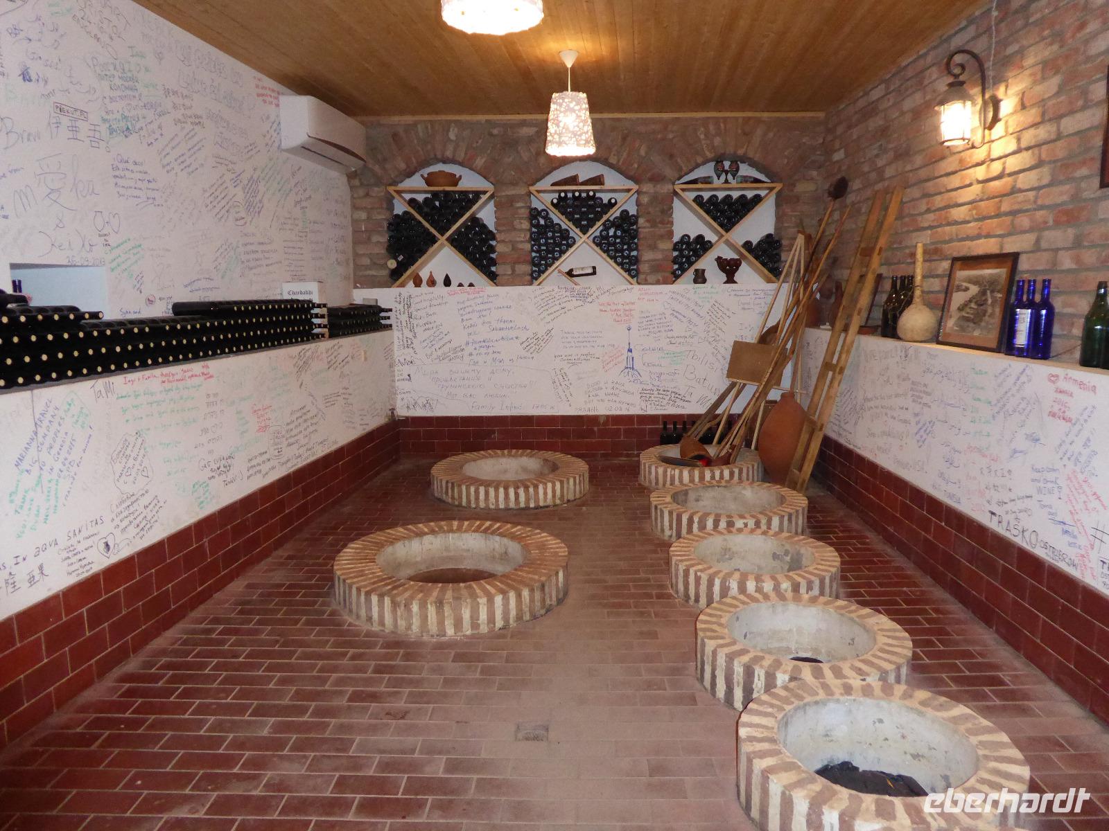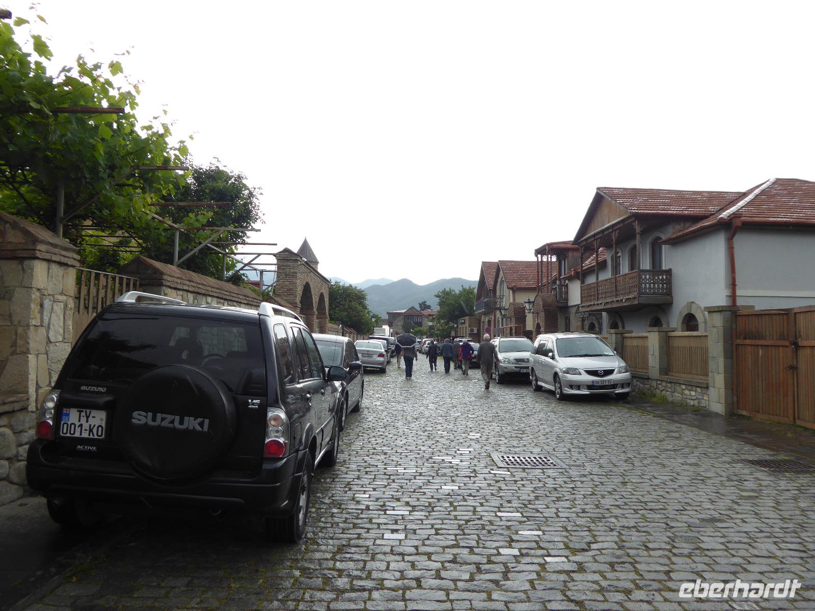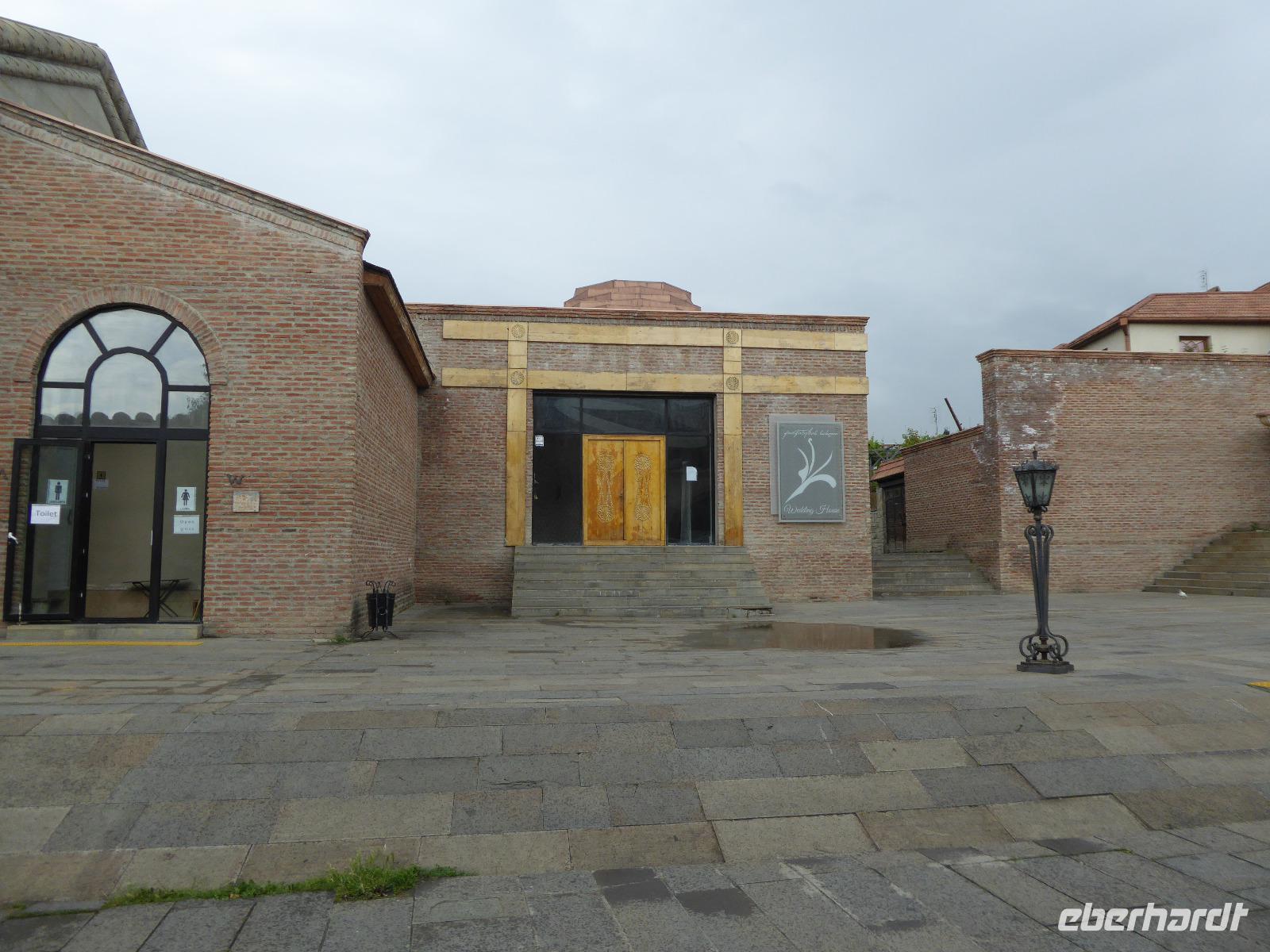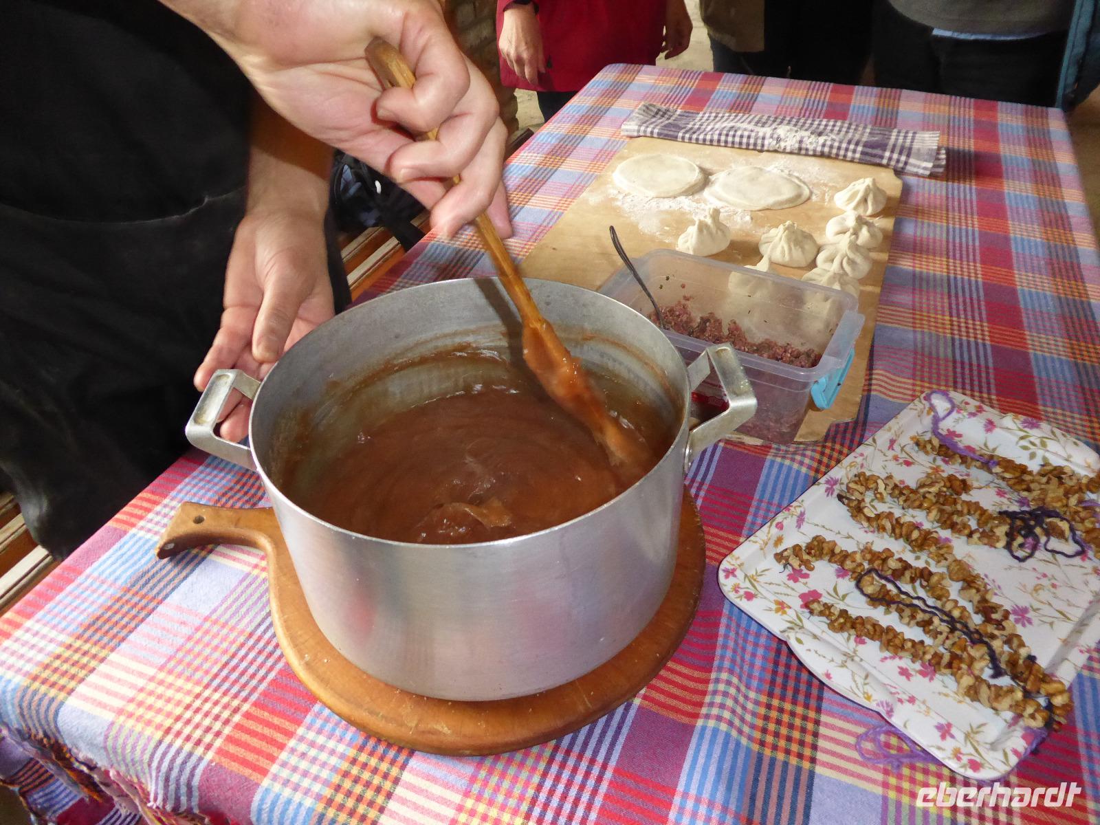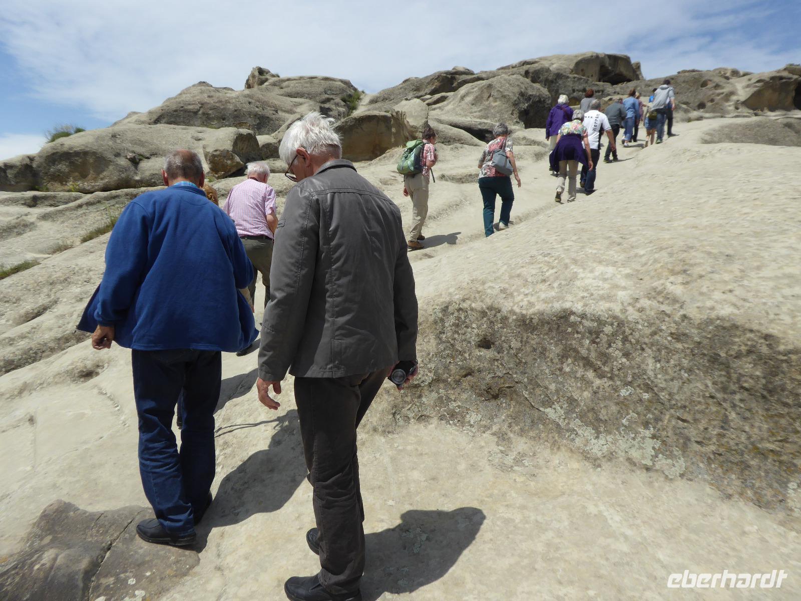 Mit gepackten Koffern treten wir unseren Weg nach Tbilissi an. Heute haben wir viel vor. Zunächst einmal stoppen wir am Georgischen Parlamentsgebäude, dass von außen wie eine Schildkröte aussieht. Man kann nur hoffen, dass die Parlamentarier nicht den Übereifer einer Schildkröte an den Tag legen. Unser nächstes Ziel ist Gori. Hier fahren wir jedoch erst einmal vorbei und besuchen Uplisziche, eine alte Höhlenstadt. Im 15. Und 16. Jahrhundert tobte hier das Leben. Es gibt einen roten Saal, einen einfachen Saal, eine Apotheke und andere geschichtsträchtige Höhlenzimmer. Mit ein bisschen Phantasie kann man sich das Leben damals hier vorstellen. Es ist sehr windig und wir (Frauen) wünschten, wir hätten unser Drei-Wetter-Taft dabei :-). Nach vielen Klettertouren erreichen wir den Ausgang, der über eine steile Treppe nach unten führt. Im Restaurant gönnen wir uns Kaffee und Kuchen - so viel Zeit muss sein. Nun geht es doch noch nach Gori, wo wir das Geburtshaus von Stalin besuchen. Auch in das Stalinmuseum werfen wir einen Blick. Will wirklich jemand Tassen, Flaschen oder andere, mit Stalins Konterfei verzierten Dinge, kaufen? Wir sind irritiert. Schnell weg hier. Wir fahren zu Iago und tauchen wir tief in den georgischen Alltag ein. Geschickt stellen wir uns beim Brot backen an. Auch das Falten der Khinkalitaschen klappt. Und aufgefädelte Walnüsse in eingedickten Traubensaft tauchen? Geschenkt! Das Abendessen haben wir uns verdient. Wie schön, dass uns georgische Sänger durch den Abend begleiten. Dato ist unser Tamar. Seine Trinksprüche sind ziemlich ernst. Wir trinken auf den Frieden und auf die Freundschaft. Auch wir tragen unser Lied zur Abendgestaltung bei. Wenn alle Brünnlein fließen, klingt doch gar nicht so schlecht, was? :-).